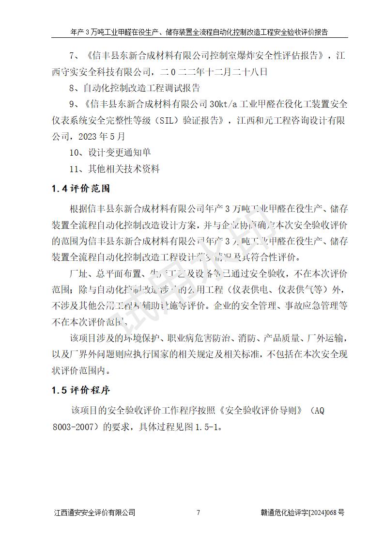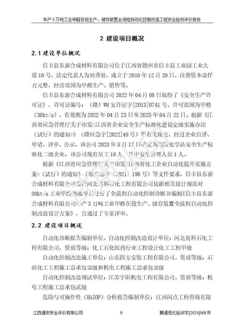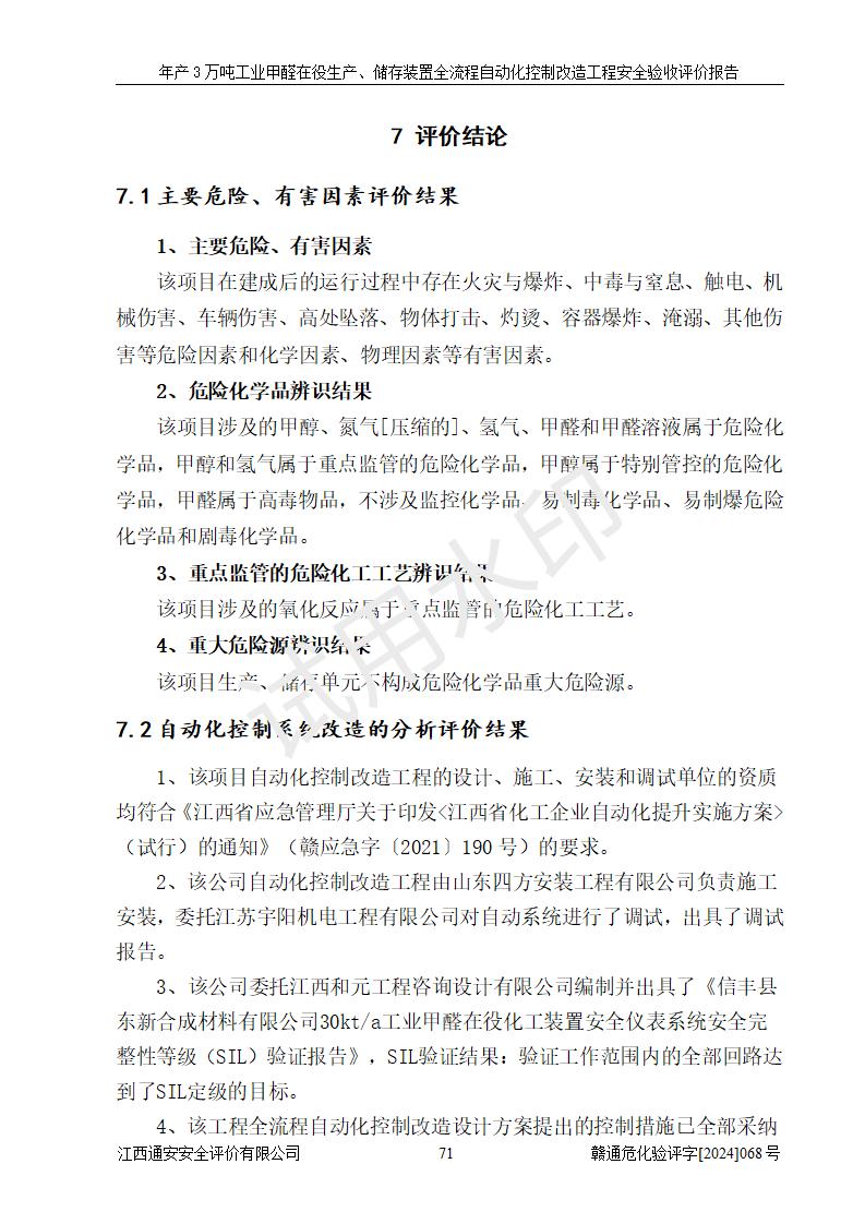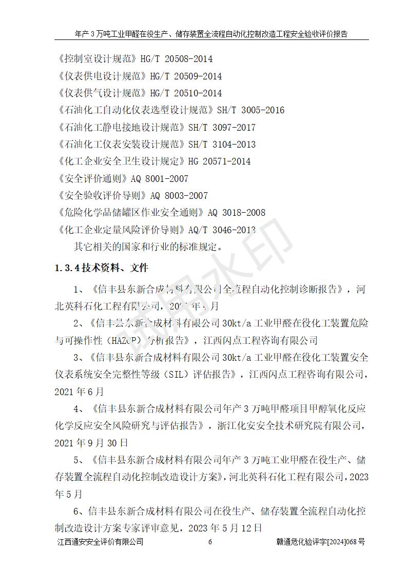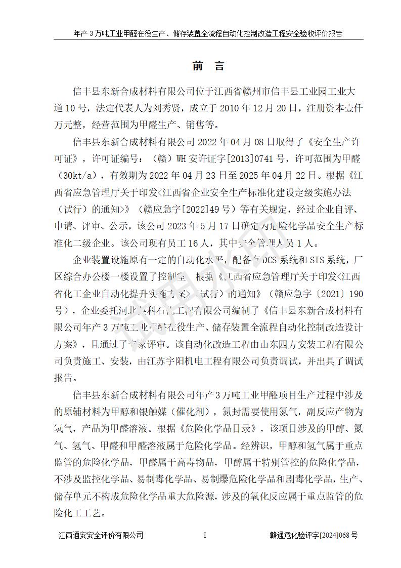 評(píng)價(jià)報(bào)告名稱 | 信豐縣東新合成材料有限公司年產(chǎn)3萬噸工業(yè)甲醛在役生產(chǎn)、儲(chǔ)存裝置全流程自動(dòng)化控制改造工程安全驗(yàn)收評(píng)價(jià)報(bào)告 | ||||||