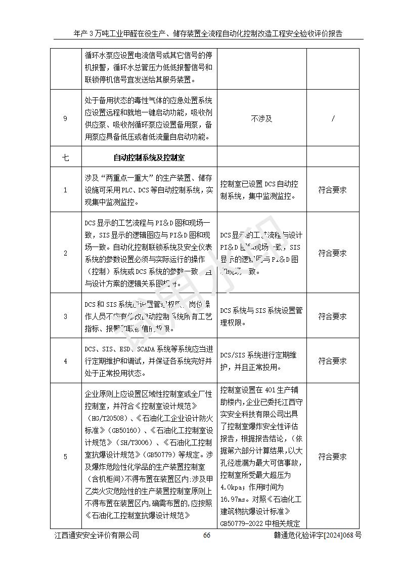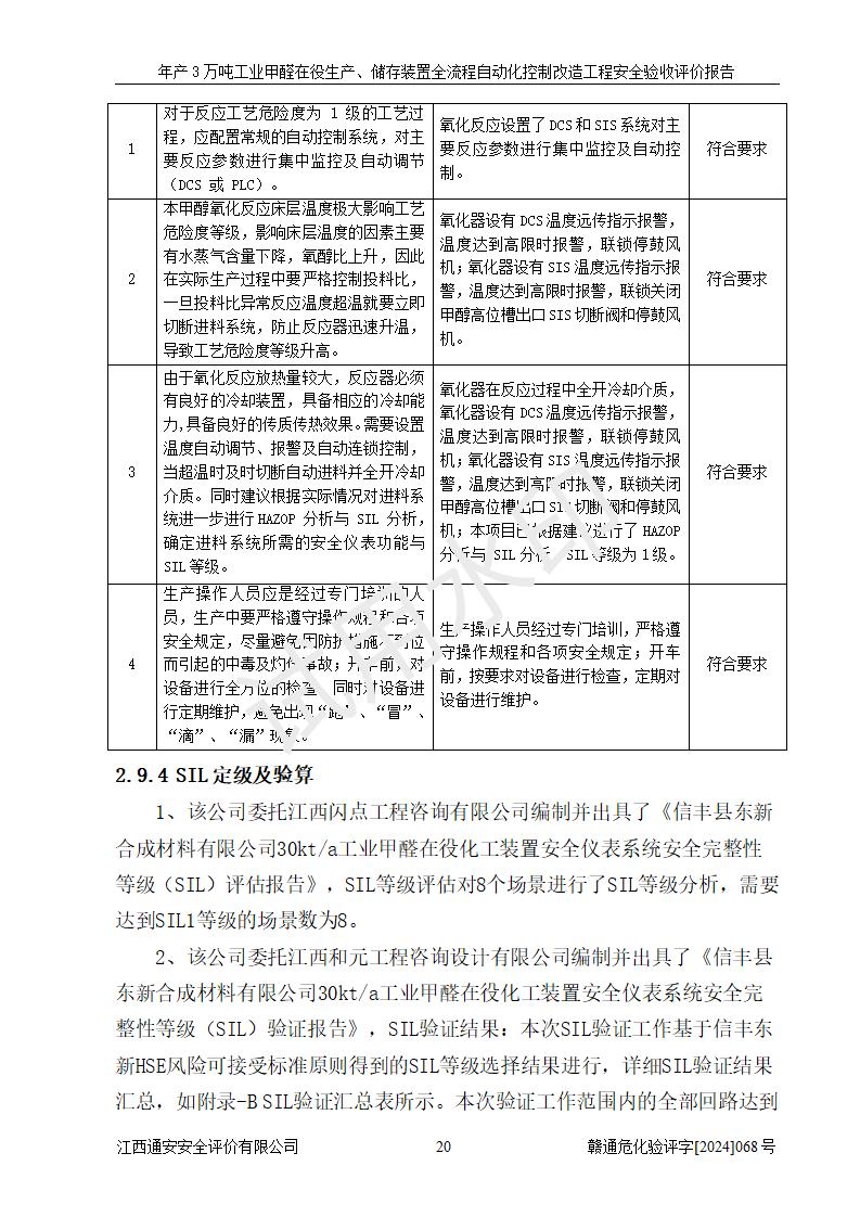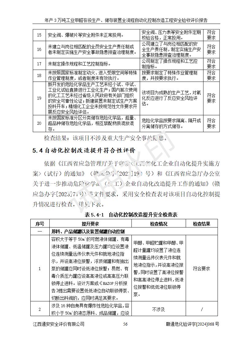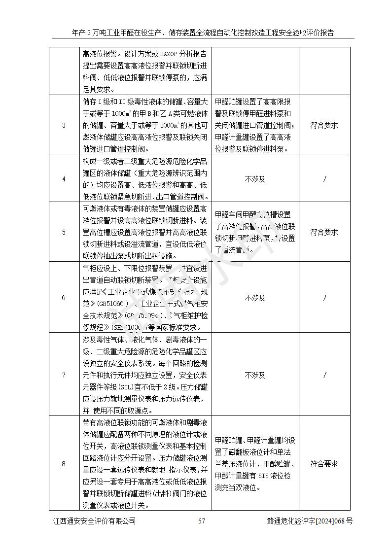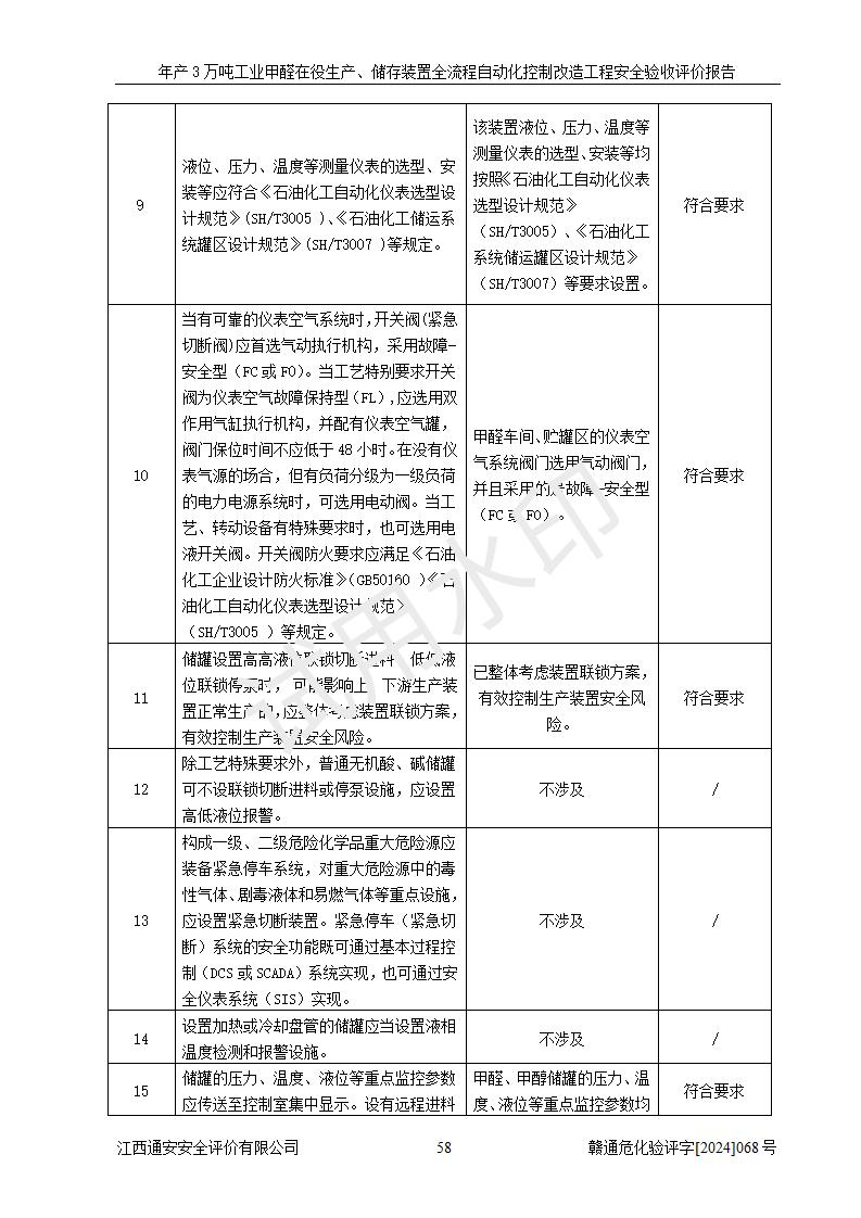 評(píng)價(jià)結(jié)論 | 信豐縣東新合成材料有限公司年產(chǎn)3萬噸工業(yè)甲醛在役生產(chǎn)、儲(chǔ)存裝置全流程自動(dòng)化控制改造設(shè)計(jì)方案中提出的控制措施已得到落實(shí),自動(dòng)化控制系統(tǒng)設(shè)置情況與設(shè)計(jì)方案一致,滿足《江西省應(yīng)急管理廳關(guān)于印發(fā)<江西省化工企業(yè)自動(dòng)化提升實(shí)施方案>(試行)的通知》(贛應(yīng)急字〔2021〕190號(hào))的要求,具備自動(dòng)化控制改造工程竣工驗(yàn)收條件。 | ||||||