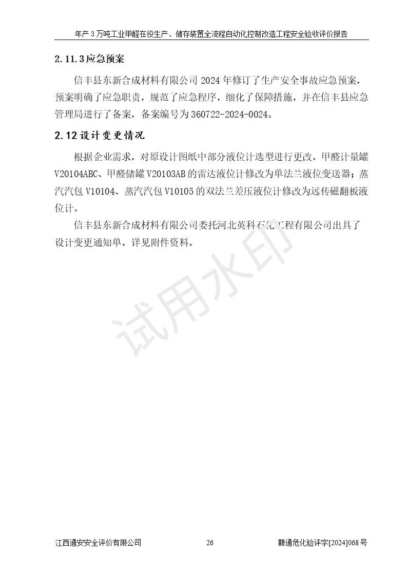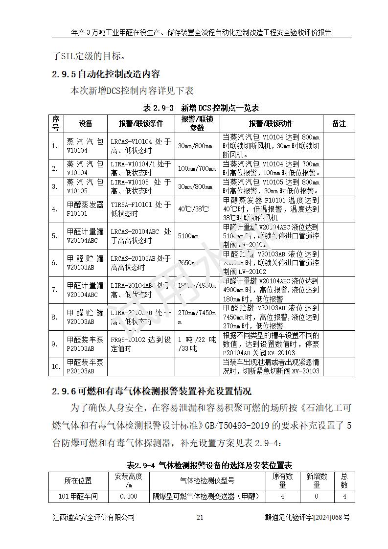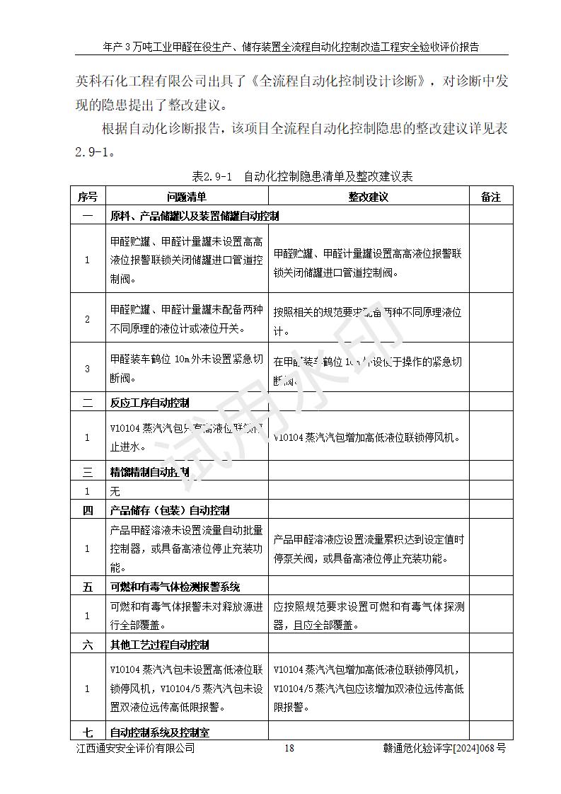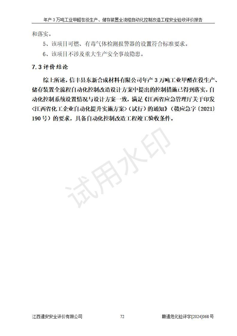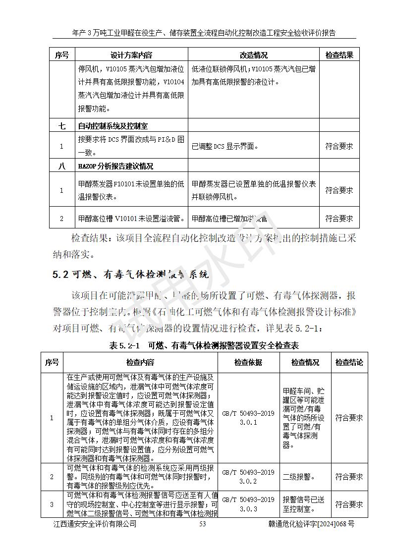 評(píng)價(jià)結(jié)論 | 信豐縣東新合成材料有限公司年產(chǎn)3萬噸工業(yè)甲醛在役生產(chǎn)、儲(chǔ)存裝置全流程自動(dòng)化控制改造設(shè)計(jì)方案中提出的控制措施已得到落實(shí),自動(dòng)化控制系統(tǒng)設(shè)置情況與設(shè)計(jì)方案一致,滿足《江西省應(yīng)急管理廳關(guān)于印發(fā)<江西省化工企業(yè)自動(dòng)化提升實(shí)施方案>(試行)的通知》(贛應(yīng)急字〔2021〕190號(hào))的要求,具備自動(dòng)化控制改造工程竣工驗(yàn)收條件。 | ||||||