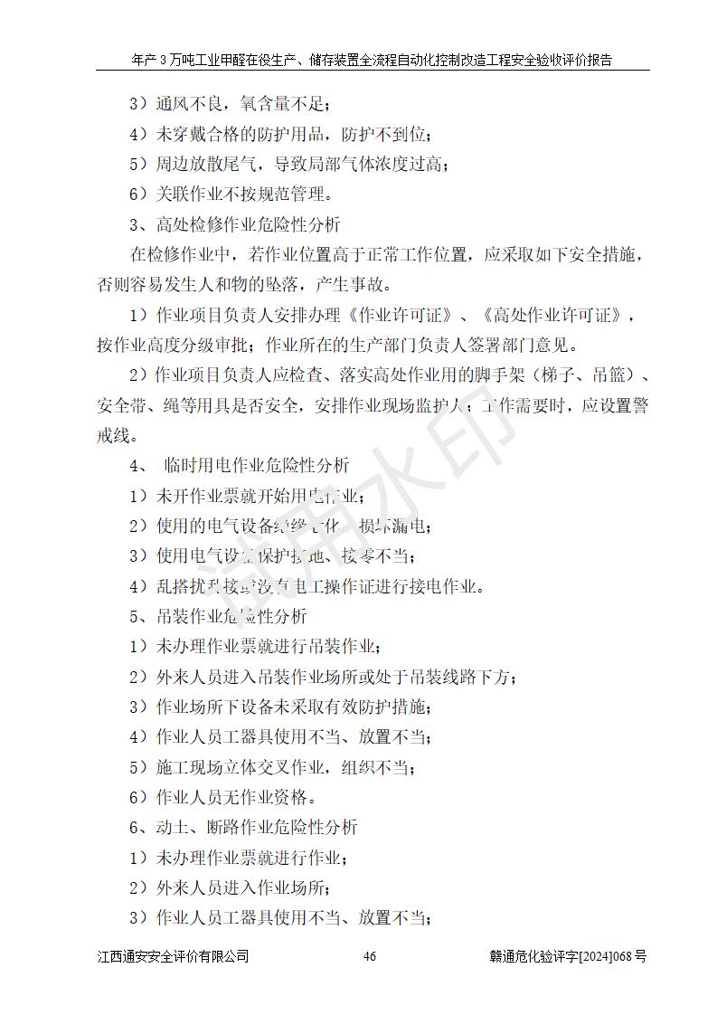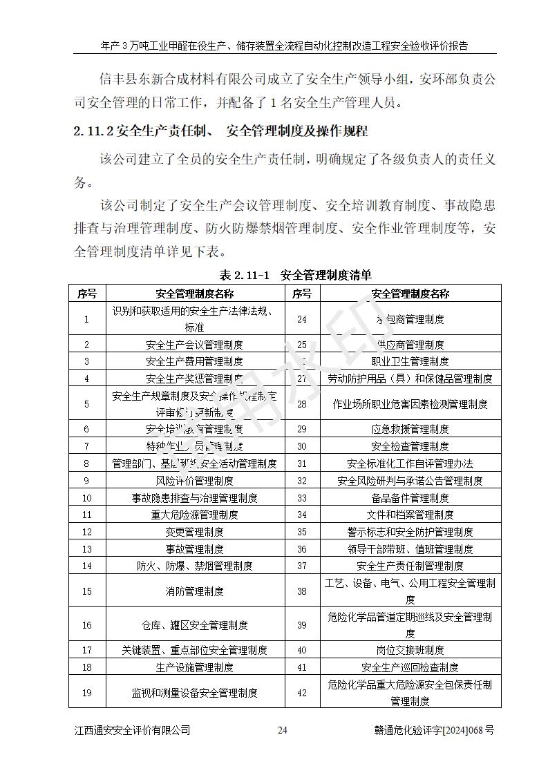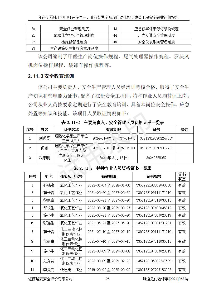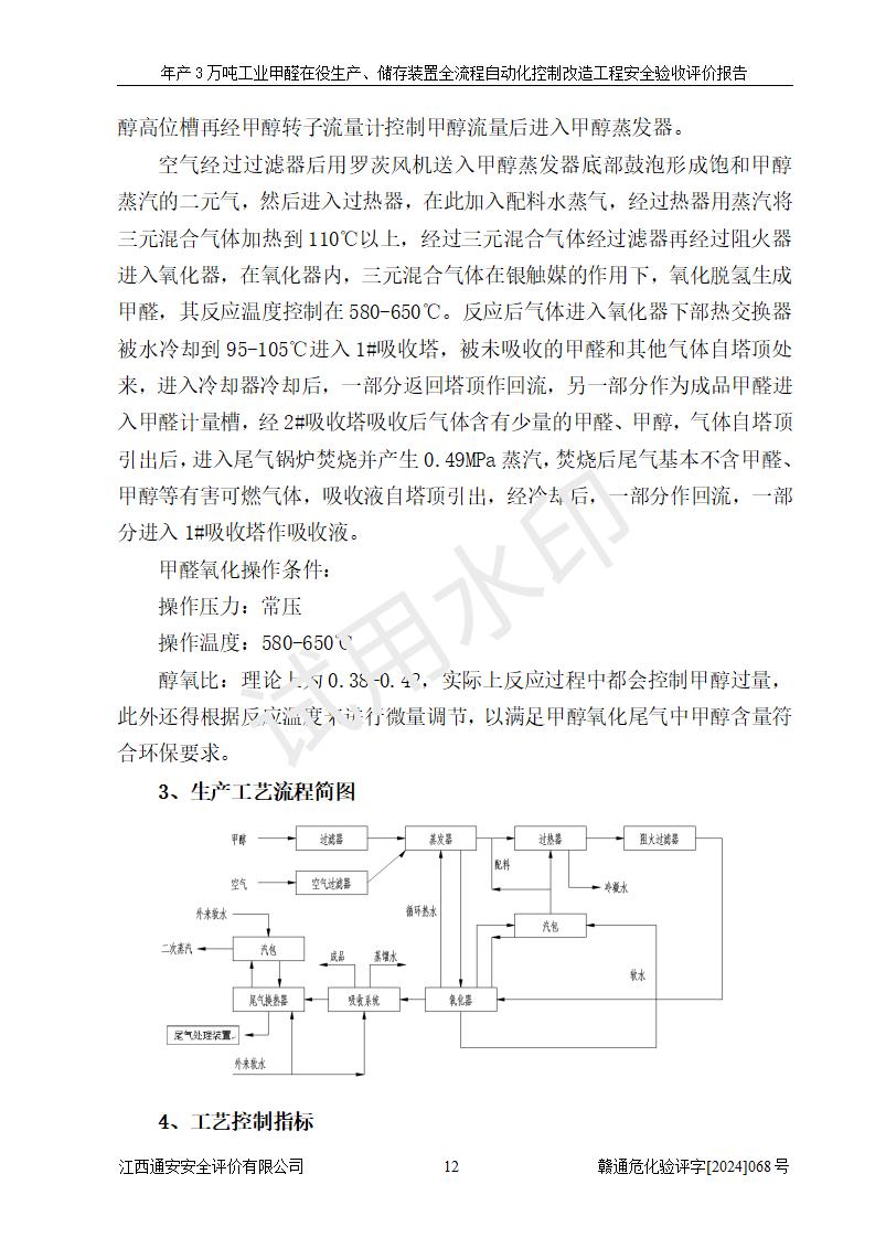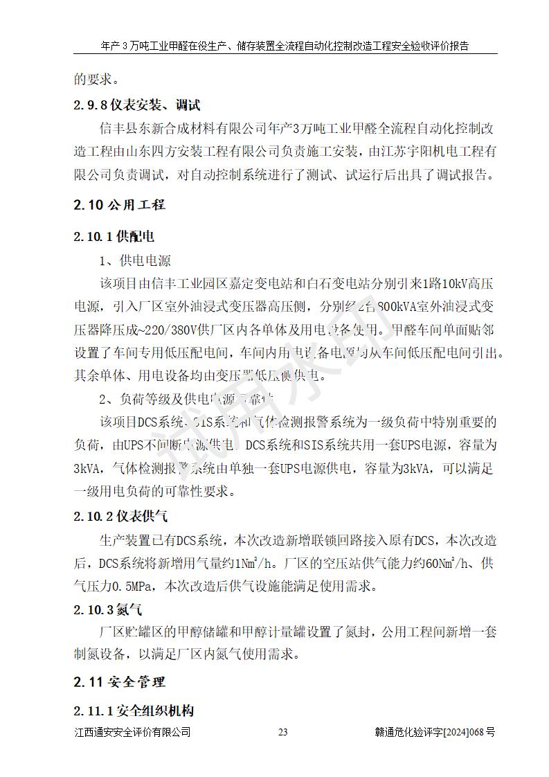 評(píng)價(jià)結(jié)論 | 信豐縣東新合成材料有限公司年產(chǎn)3萬噸工業(yè)甲醛在役生產(chǎn)、儲(chǔ)存裝置全流程自動(dòng)化控制改造設(shè)計(jì)方案中提出的控制措施已得到落實(shí),自動(dòng)化控制系統(tǒng)設(shè)置情況與設(shè)計(jì)方案一致,滿足《江西省應(yīng)急管理廳關(guān)于印發(fā)<江西省化工企業(yè)自動(dòng)化提升實(shí)施方案>(試行)的通知》(贛應(yīng)急字〔2021〕190號(hào))的要求,具備自動(dòng)化控制改造工程竣工驗(yàn)收條件。 | ||||||