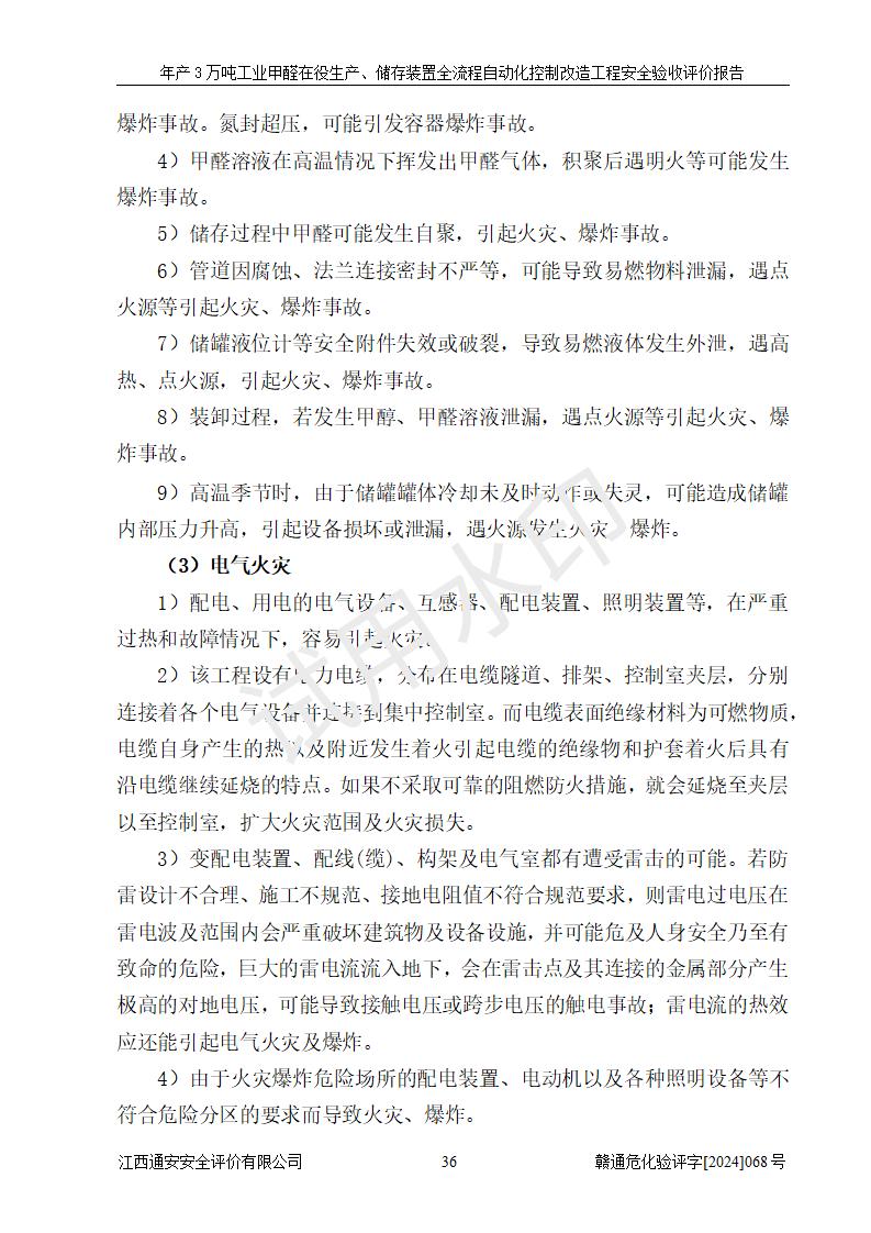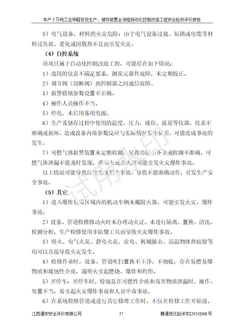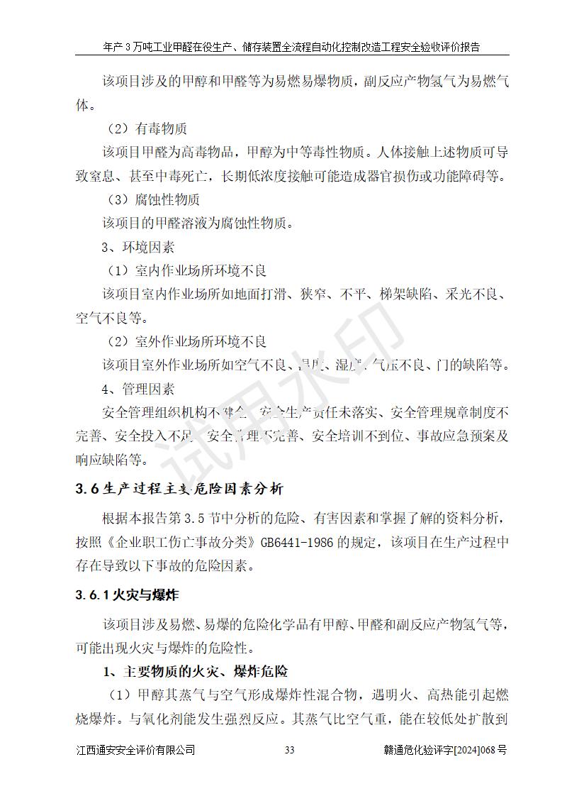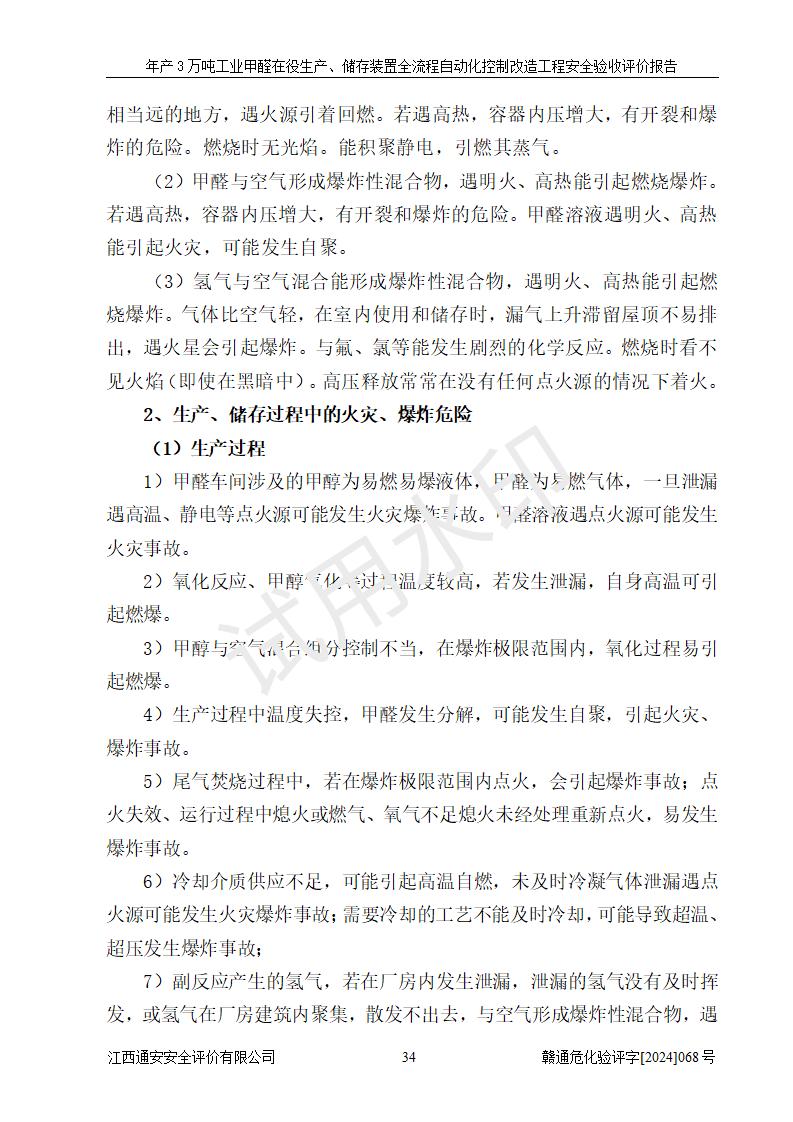 項(xiàng)目簡(jiǎn)介 | 信豐縣東新合成材料有限公司位于江西省贛州市信豐縣工業(yè)園工業(yè)大道10號(hào),法定**人為劉秀賢,成立于2010年12月20日,注冊(cè)資本壹仟萬元整,經(jīng)營范圍為甲醛生產(chǎn)、銷售等。 信豐縣東新合成材料有限公司2022年04月08日取得了《安全生產(chǎn)許可證》,許可證編號(hào):(贛)WH安許證字[2013]0741號(hào),許可范圍為甲醛(30kt/a),**期為2022年04月23日至2025年04月22日。根據(jù)《江西省應(yīng)急管理廳關(guān)于印發(fā)<江西省企業(yè)安全生產(chǎn)標(biāo)準(zhǔn)化建設(shè)定級(jí)實(shí)施辦法(試行)的通知>》(贛應(yīng)急字[2022]49號(hào))等有關(guān)規(guī)定,經(jīng)過企業(yè)自評(píng)、申請(qǐng)、評(píng)審、公示,該公司2023年5月17日確定為危險(xiǎn)化學(xué)品安全生產(chǎn)標(biāo)準(zhǔn)化二級(jí)企業(yè)。該公司現(xiàn)有員工16人,其中安全管理人員1人。 企業(yè)裝置設(shè)施原有**的自動(dòng)化水平,配備有DCS系統(tǒng)和SIS系統(tǒng),廠區(qū)綜合辦公樓一樓設(shè)置了控制室。根據(jù)《江西省應(yīng)急管理廳關(guān)于印發(fā)<江西省化工企業(yè)自動(dòng)化提升實(shí)施方案>(試行)的通知》(贛應(yīng)急字〔2021〕190號(hào)),企業(yè)委托河北英科石化工程有限公司編制了《信豐縣東新合成材料有限公司年產(chǎn)3萬噸工業(yè)甲醛在役生產(chǎn)、儲(chǔ)存裝置全流程自動(dòng)化控制改造設(shè)計(jì)方案》,且通過了專家評(píng)審。該自動(dòng)化改造工程由山東四方安裝工程有限公司負(fù)責(zé)施工、安裝,由江蘇宇陽機(jī)電工程有限公司負(fù)責(zé)調(diào)試,并出具了調(diào)試報(bào)告。 信豐縣東新合成材料有限公司年產(chǎn)3萬噸工業(yè)甲醛項(xiàng)目生產(chǎn)過程中涉及的原輔材料為甲醇和銀觸媒(催化劑),氮封需要使用氮?dú)?,副反?yīng)產(chǎn)物為氫氣,產(chǎn)品為甲醛溶液。根據(jù)《危險(xiǎn)化學(xué)品目錄》,該項(xiàng)目涉及的甲醇、氮?dú)?、氫氣、甲醛和甲醛溶液屬?/span>危險(xiǎn)化學(xué)品。經(jīng)辨識(shí),甲醇和氫氣屬于重點(diǎn)監(jiān)管的危險(xiǎn)化學(xué)品,甲醛屬于高毒物品,甲醇屬于特別管控的危險(xiǎn)化學(xué)品,不涉及監(jiān)控化學(xué)品、易制毒化學(xué)品、易制爆危險(xiǎn)化學(xué)品和劇毒化學(xué)品,生產(chǎn)、儲(chǔ)存單元不構(gòu)成危險(xiǎn)化學(xué)品重大危險(xiǎn)源,涉及的氧化反應(yīng)屬于重點(diǎn)監(jiān)管的危險(xiǎn)化工工藝。 | ||||||