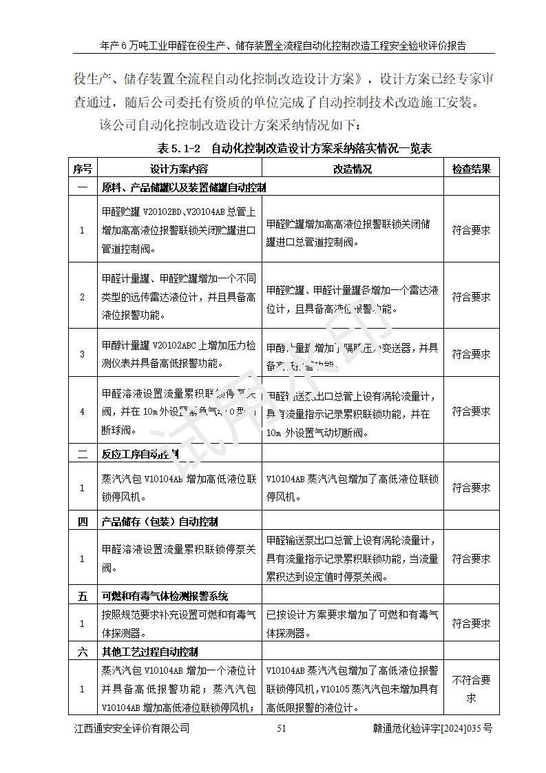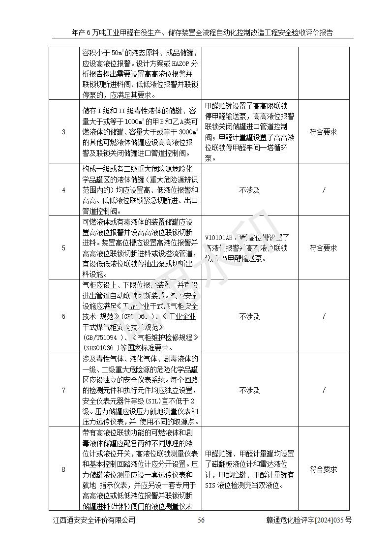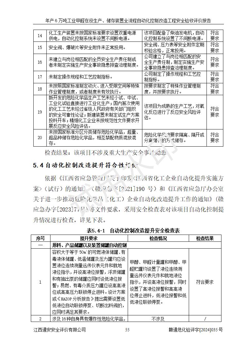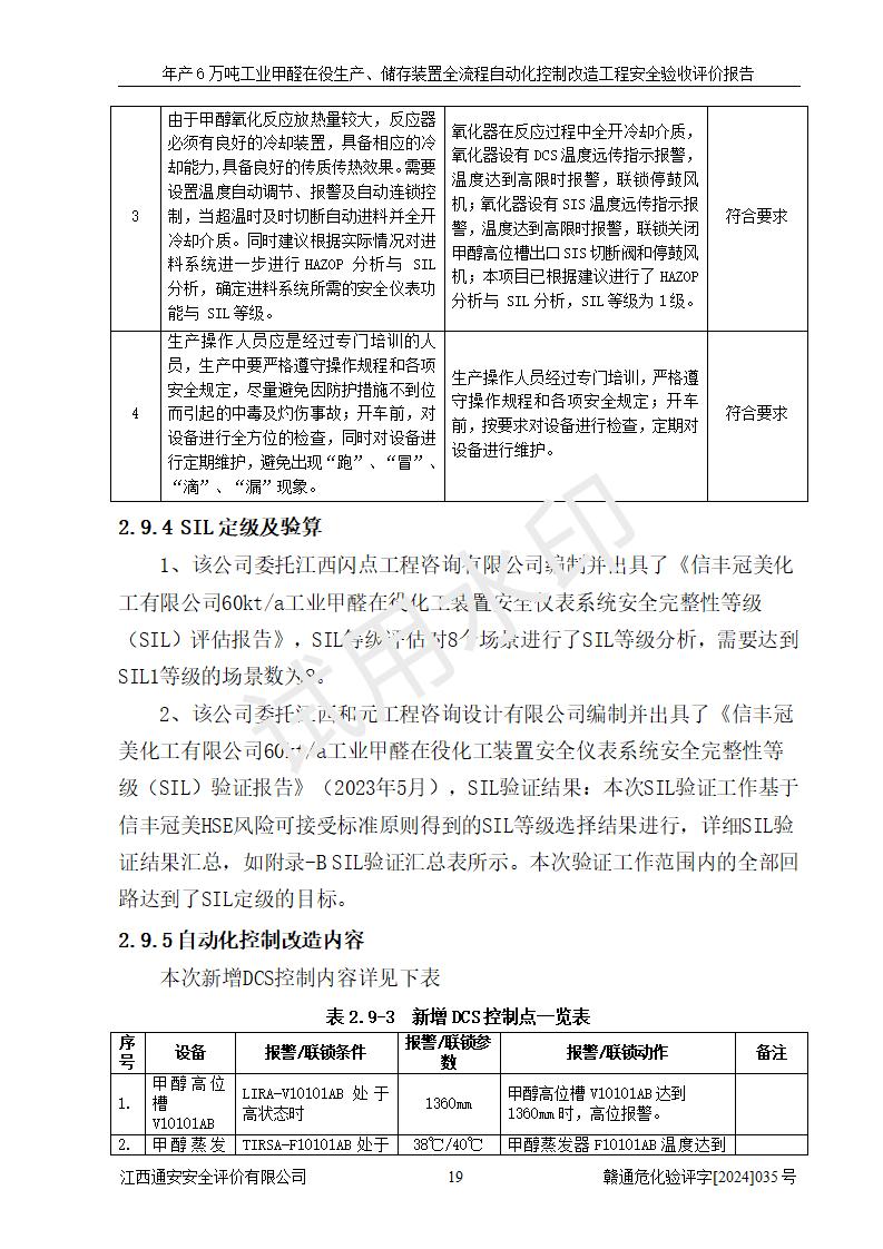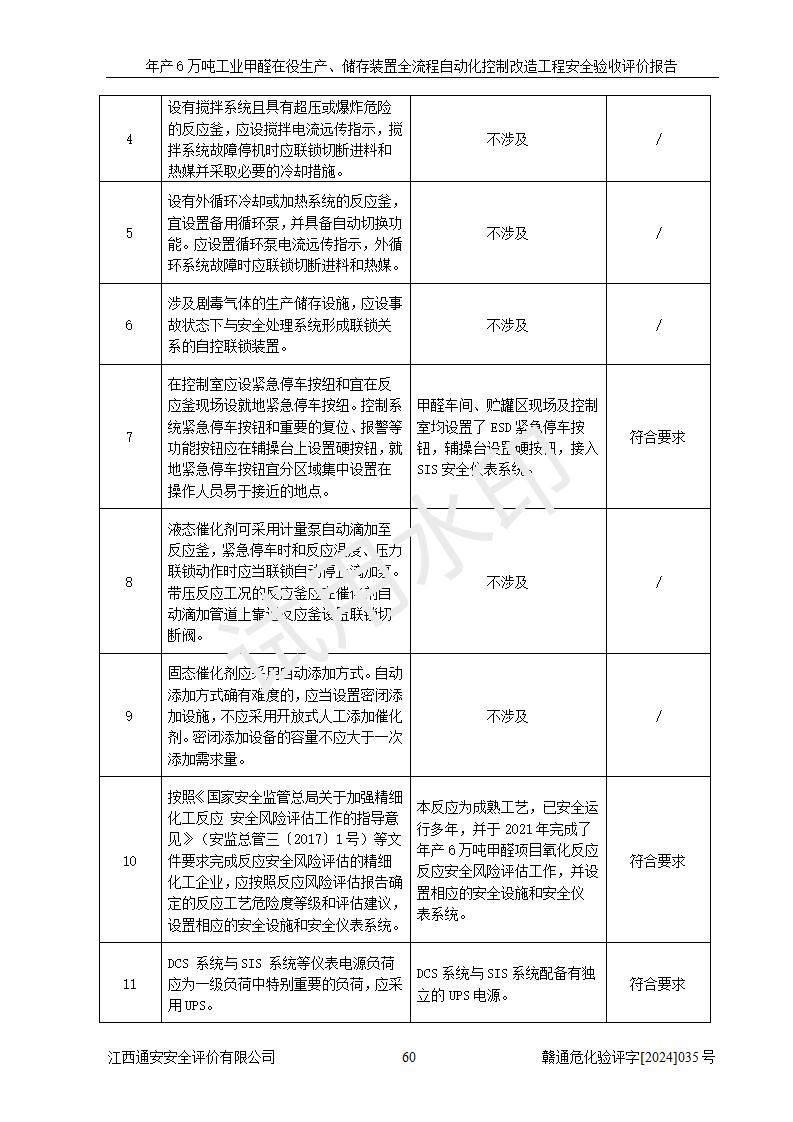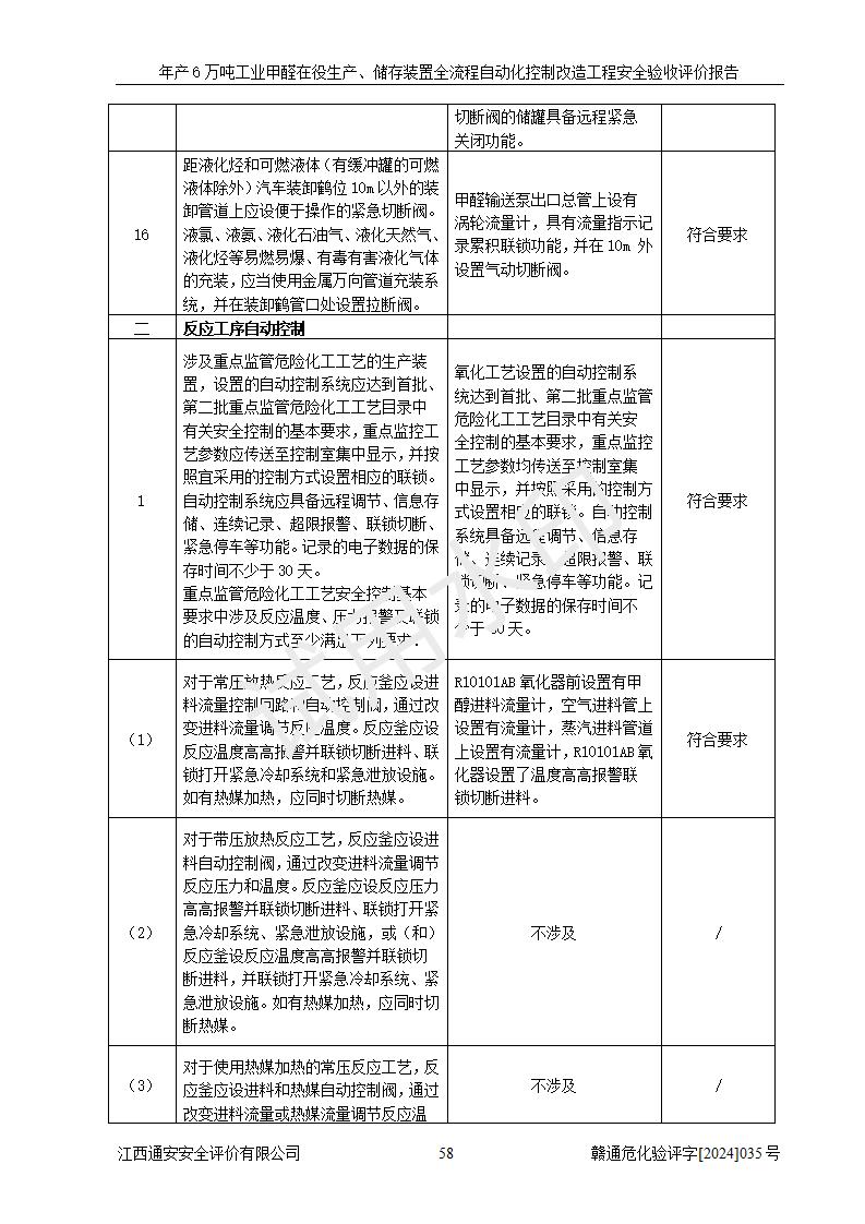 評(píng)價(jià)結(jié)論 | 信豐冠美化工有限公司年產(chǎn)6萬(wàn)噸工業(yè)甲醛在役生產(chǎn)、儲(chǔ)存裝置全流程自動(dòng)化控制改造設(shè)計(jì)方案中提出的控制措施已得到落實(shí),自動(dòng)化控制系統(tǒng)設(shè)置情況與設(shè)計(jì)方案一致,滿足《江西省應(yīng)急管理廳關(guān)于印發(fā)<江西省化工企業(yè)自動(dòng)化提升實(shí)施方案>(試行)的通知》(贛應(yīng)急字〔2021〕190號(hào))的要求,具備自動(dòng)化控制改造工程竣工驗(yàn)收條件。 | ||||||