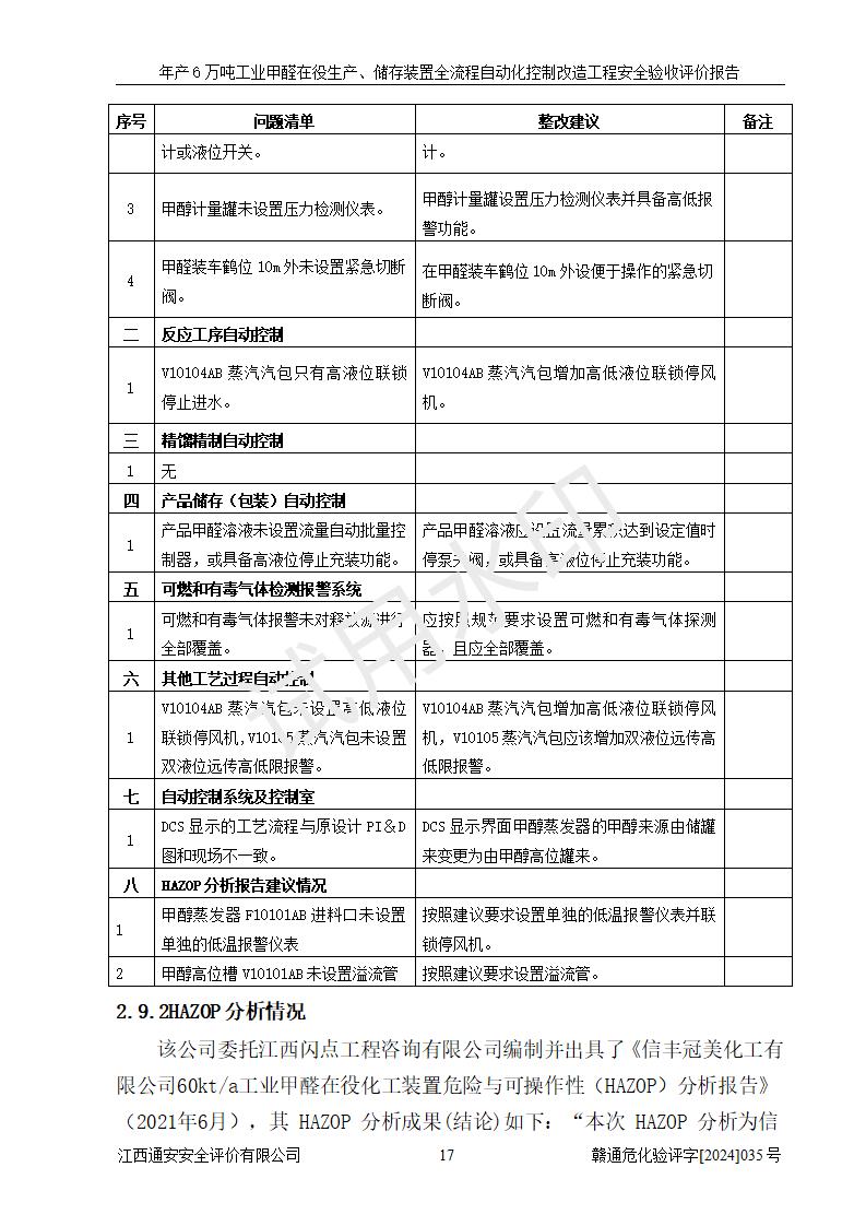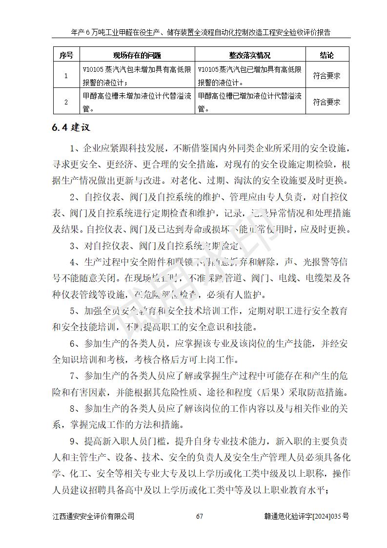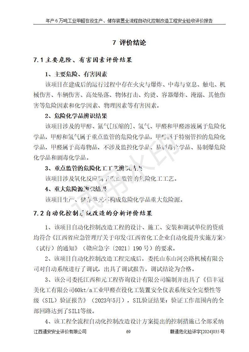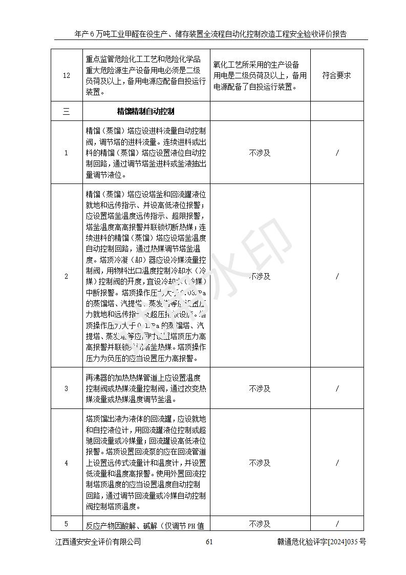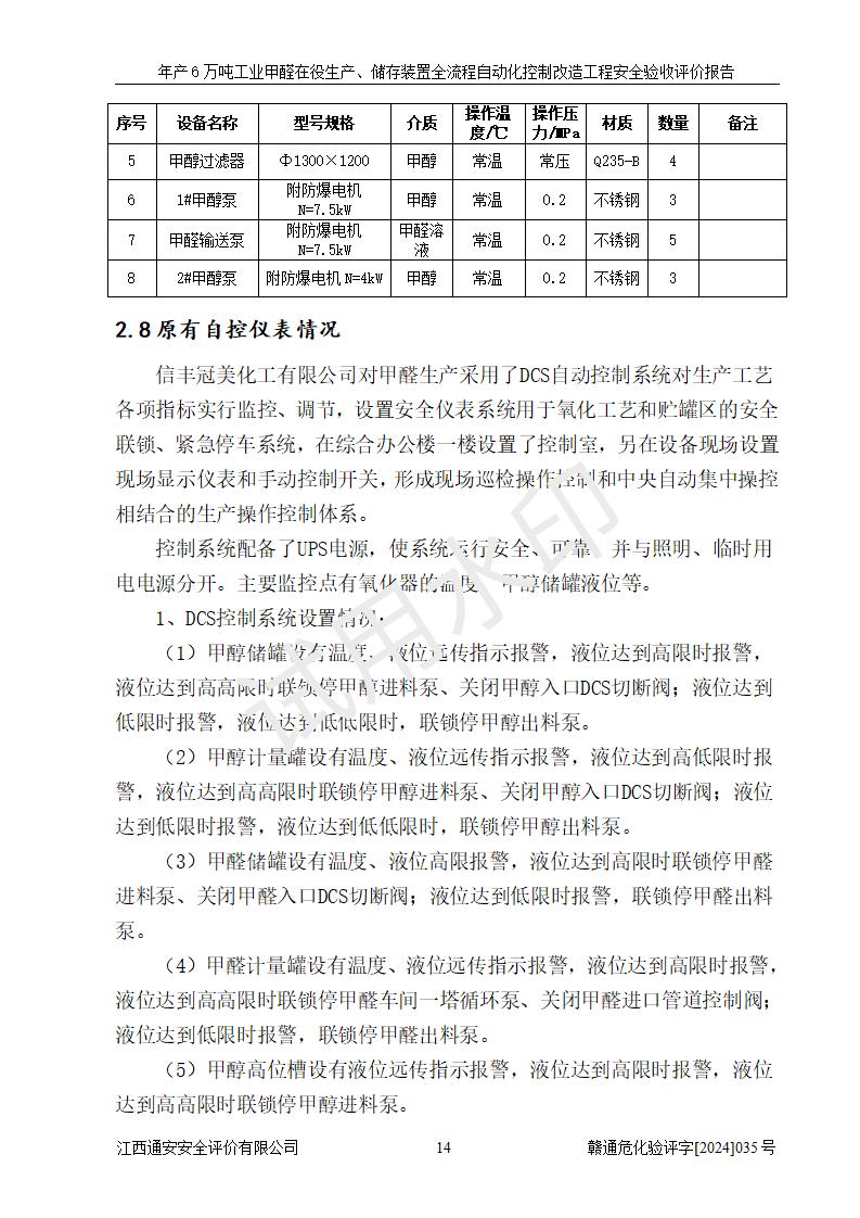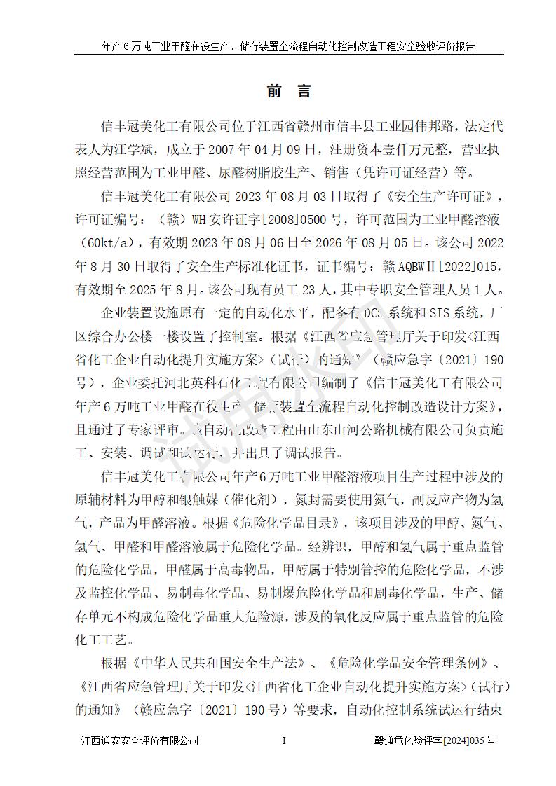 評(píng)價(jià)結(jié)論 | 信豐冠美化工有限公司年產(chǎn)6萬(wàn)噸工業(yè)甲醛在役生產(chǎn)、儲(chǔ)存裝置全流程自動(dòng)化控制改造設(shè)計(jì)方案中提出的控制措施已得到落實(shí),自動(dòng)化控制系統(tǒng)設(shè)置情況與設(shè)計(jì)方案一致,滿足《江西省應(yīng)急管理廳關(guān)于印發(fā)<江西省化工企業(yè)自動(dòng)化提升實(shí)施方案>(試行)的通知》(贛應(yīng)急字〔2021〕190號(hào))的要求,具備自動(dòng)化控制改造工程竣工驗(yàn)收條件。 | ||||||