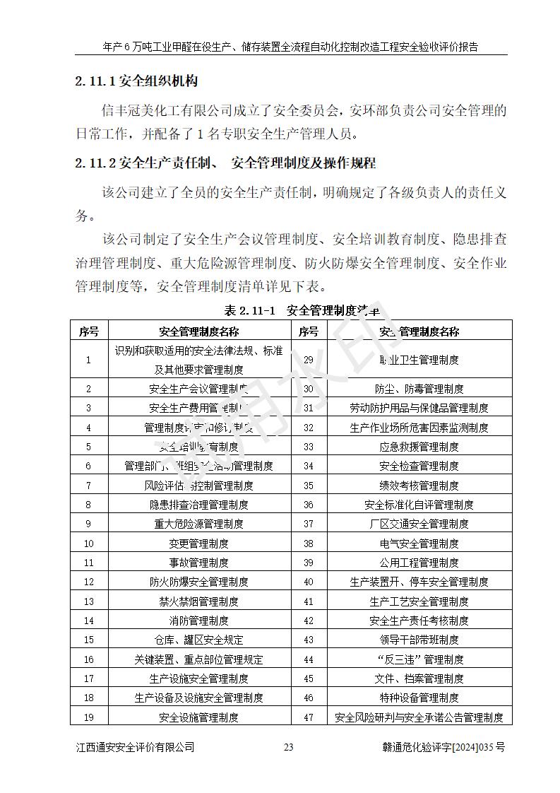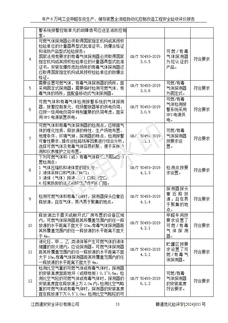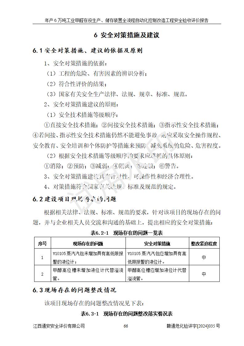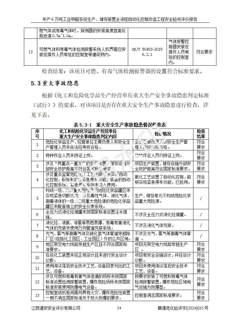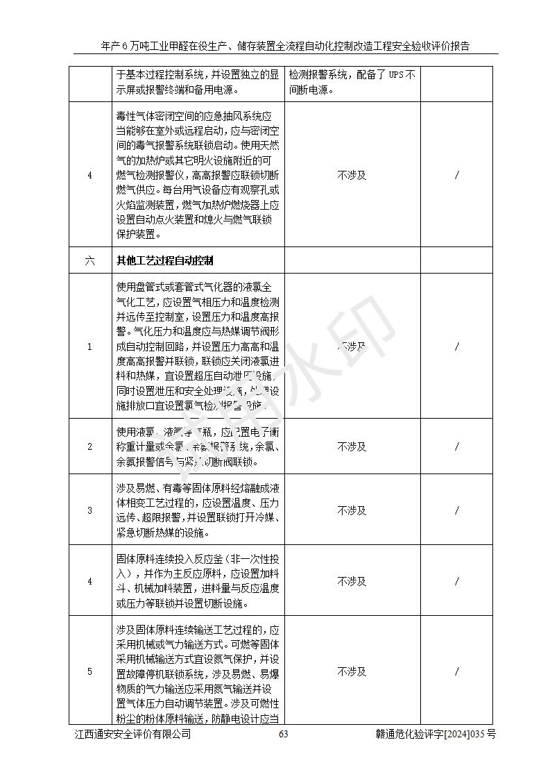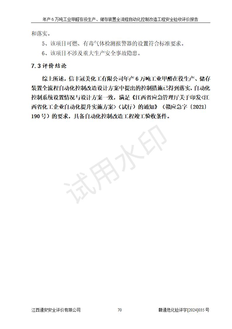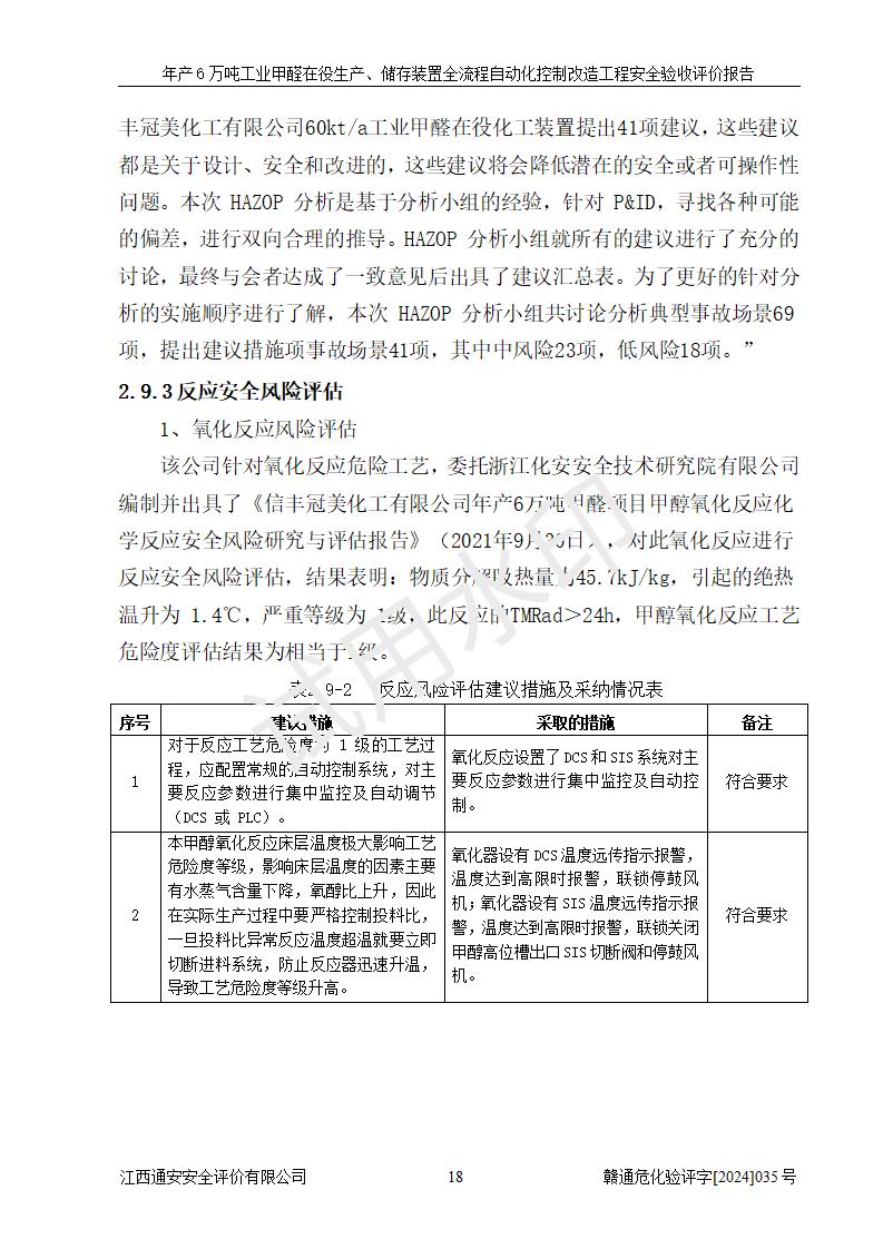 評(píng)價(jià)結(jié)論 | 信豐冠美化工有限公司年產(chǎn)6萬(wàn)噸工業(yè)甲醛在役生產(chǎn)、儲(chǔ)存裝置全流程自動(dòng)化控制改造設(shè)計(jì)方案中提出的控制措施已得到落實(shí),自動(dòng)化控制系統(tǒng)設(shè)置情況與設(shè)計(jì)方案一致,滿足《江西省應(yīng)急管理廳關(guān)于印發(fā)<江西省化工企業(yè)自動(dòng)化提升實(shí)施方案>(試行)的通知》(贛應(yīng)急字〔2021〕190號(hào))的要求,具備自動(dòng)化控制改造工程竣工驗(yàn)收條件。 | ||||||