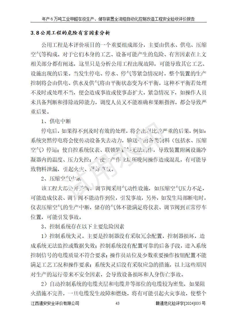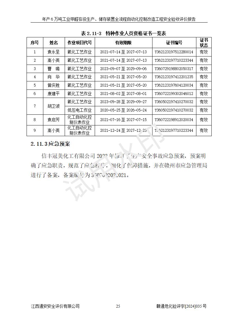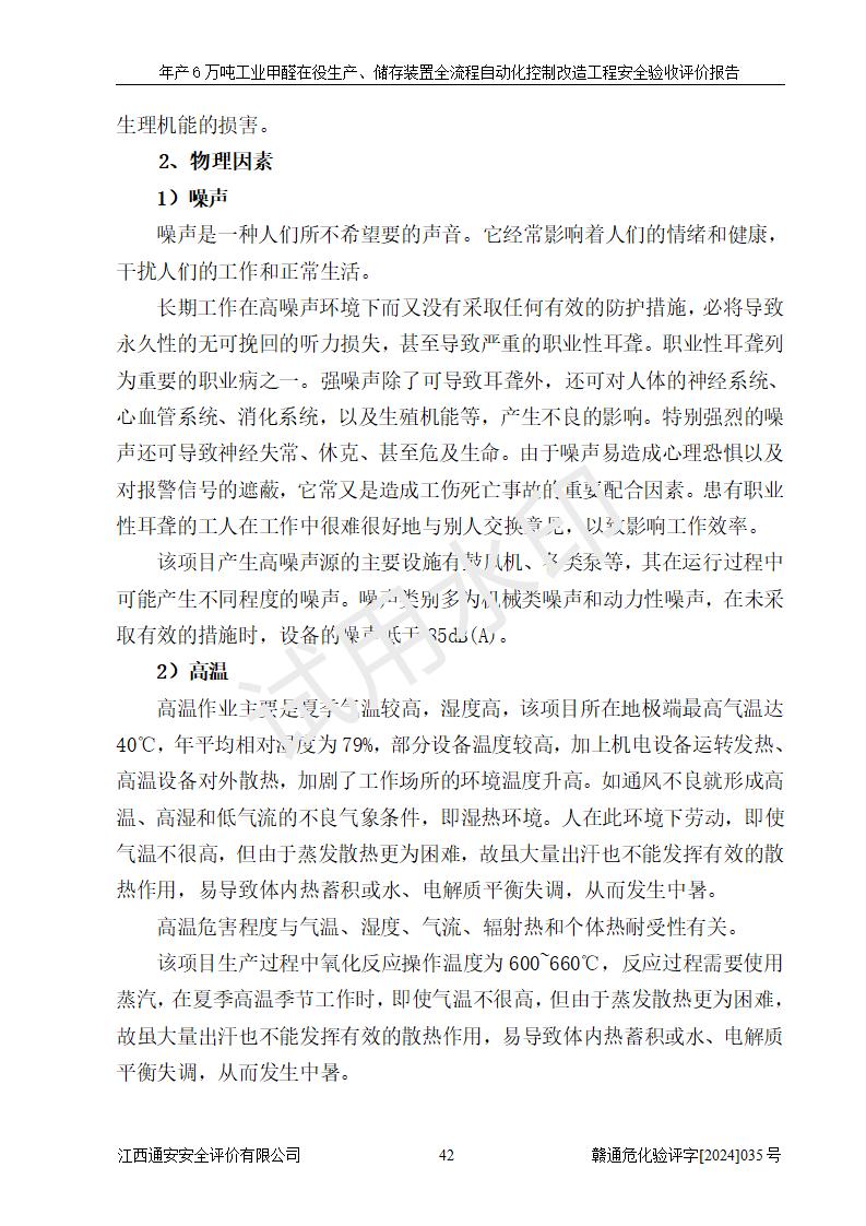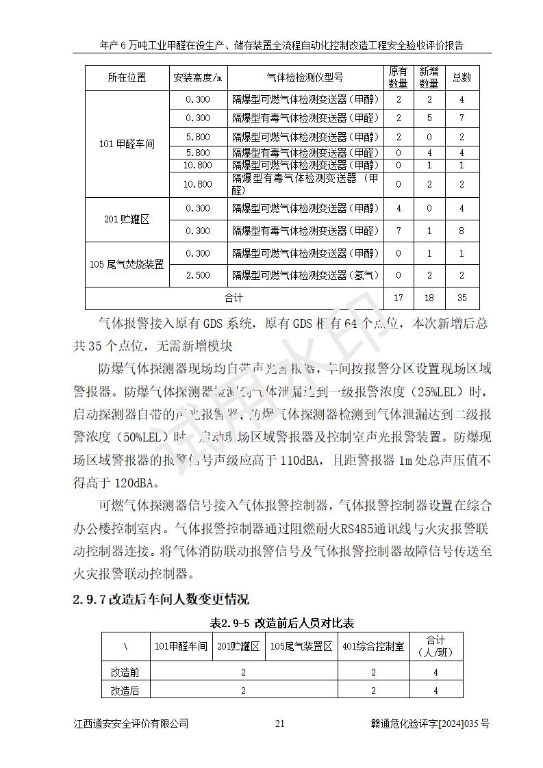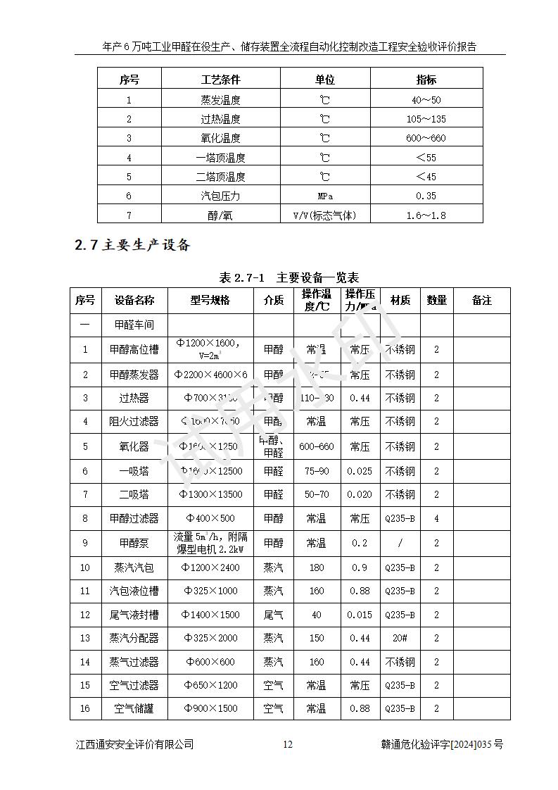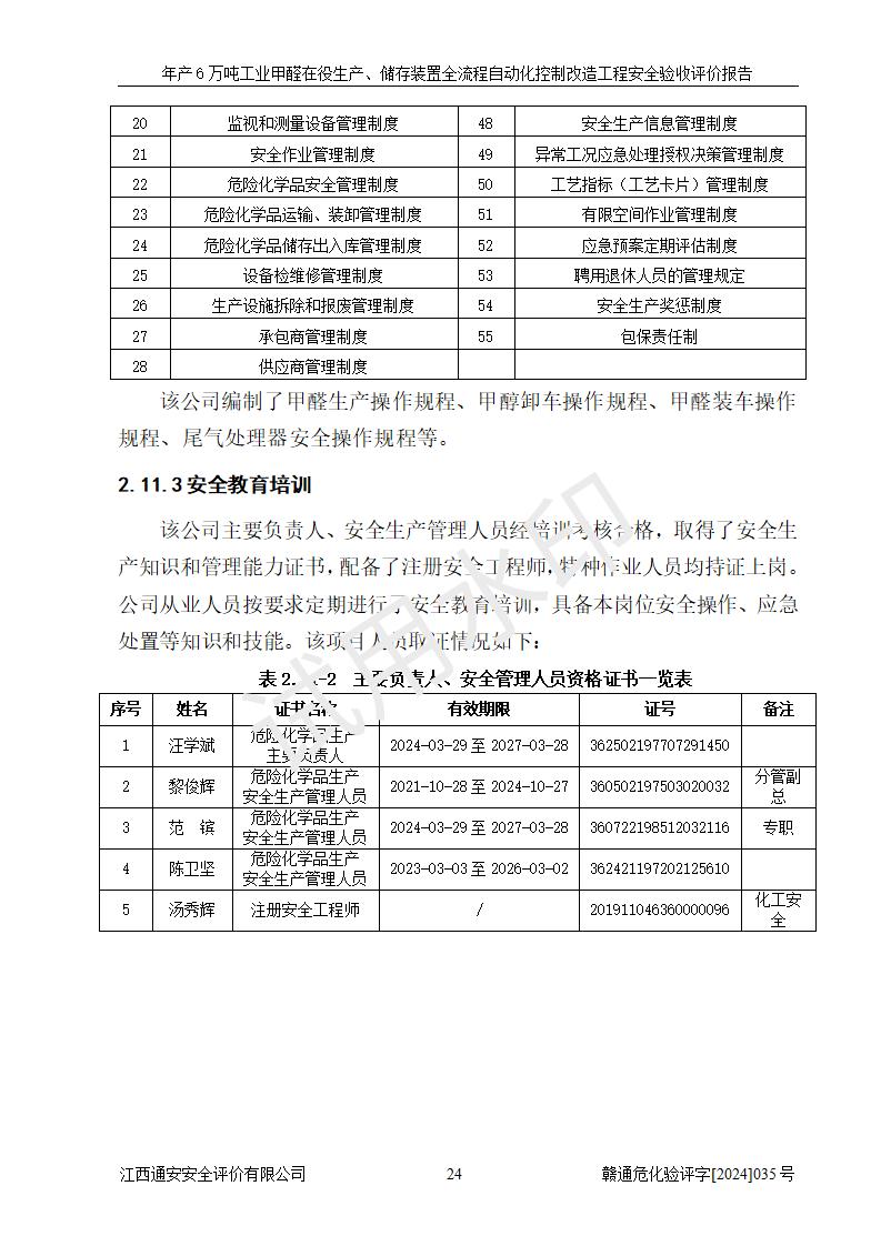 評(píng)價(jià)結(jié)論 | 信豐冠美化工有限公司年產(chǎn)6萬(wàn)噸工業(yè)甲醛在役生產(chǎn)、儲(chǔ)存裝置全流程自動(dòng)化控制改造設(shè)計(jì)方案中提出的控制措施已得到落實(shí),自動(dòng)化控制系統(tǒng)設(shè)置情況與設(shè)計(jì)方案一致,滿足《江西省應(yīng)急管理廳關(guān)于印發(fā)<江西省化工企業(yè)自動(dòng)化提升實(shí)施方案>(試行)的通知》(贛應(yīng)急字〔2021〕190號(hào))的要求,具備自動(dòng)化控制改造工程竣工驗(yàn)收條件。 | ||||||