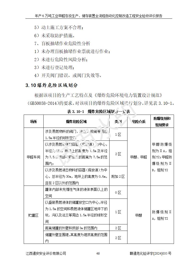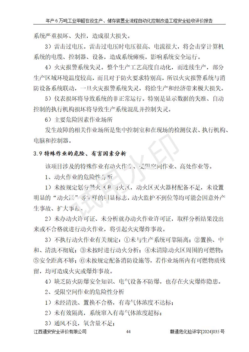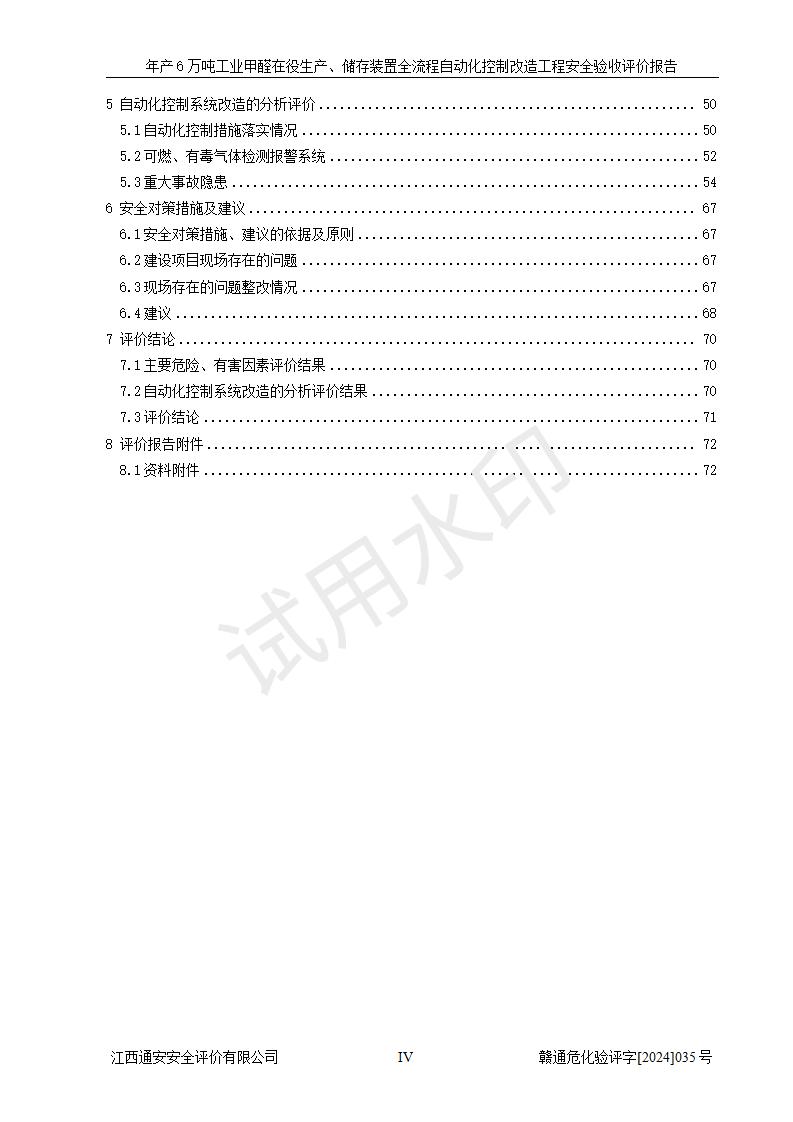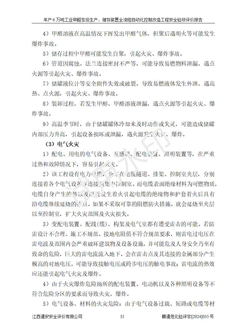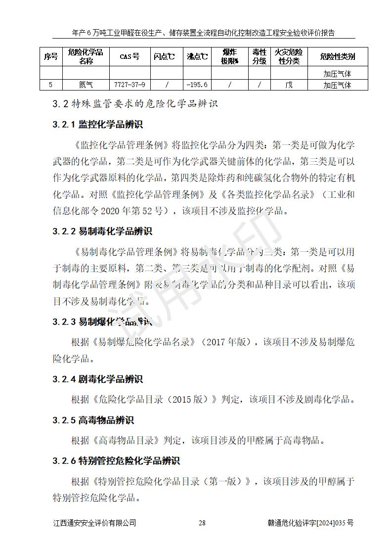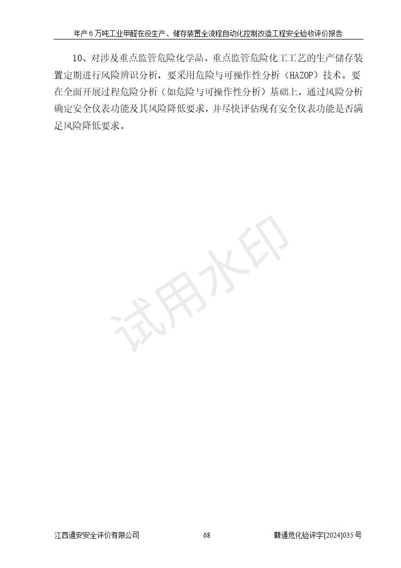 評(píng)價(jià)結(jié)論 | 信豐冠美化工有限公司年產(chǎn)6萬(wàn)噸工業(yè)甲醛在役生產(chǎn)、儲(chǔ)存裝置全流程自動(dòng)化控制改造設(shè)計(jì)方案中提出的控制措施已得到落實(shí),自動(dòng)化控制系統(tǒng)設(shè)置情況與設(shè)計(jì)方案一致,滿足《江西省應(yīng)急管理廳關(guān)于印發(fā)<江西省化工企業(yè)自動(dòng)化提升實(shí)施方案>(試行)的通知》(贛應(yīng)急字〔2021〕190號(hào))的要求,具備自動(dòng)化控制改造工程竣工驗(yàn)收條件。 | ||||||