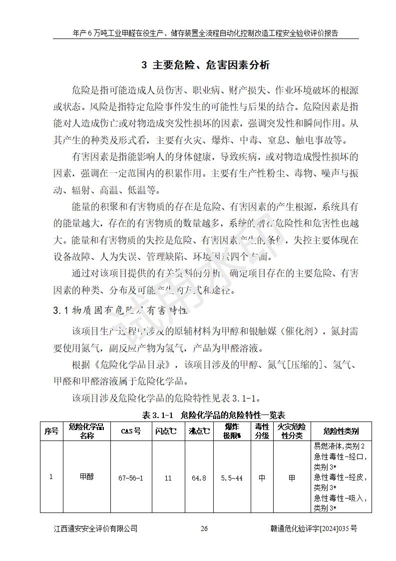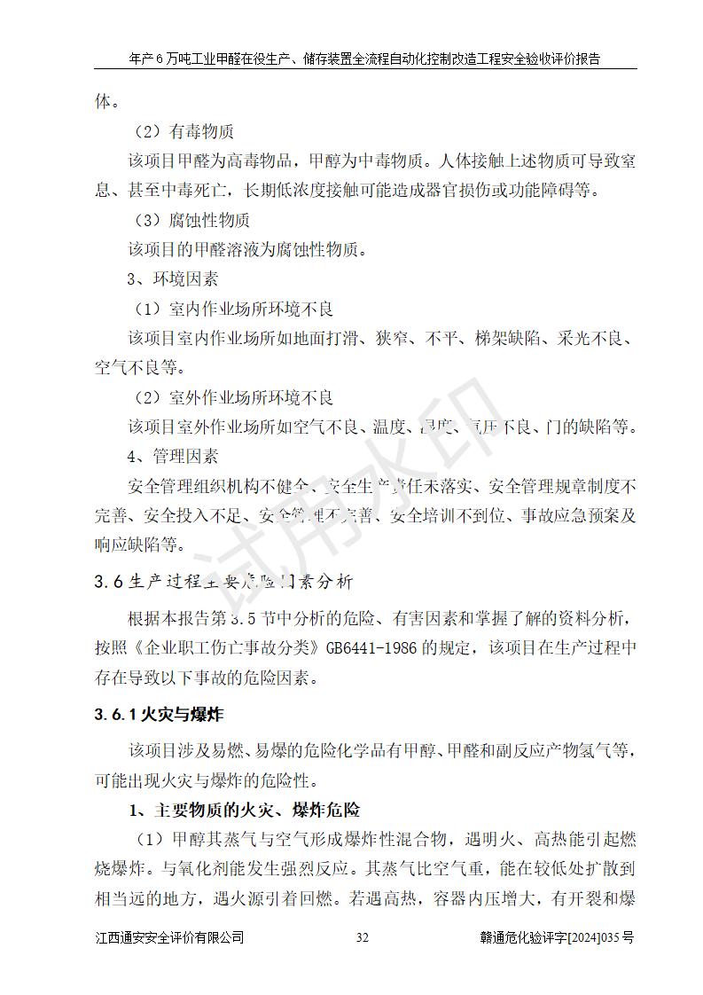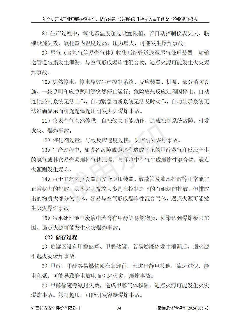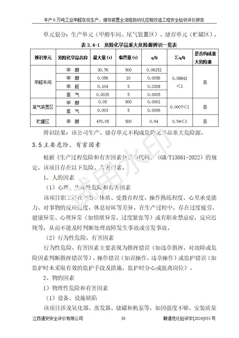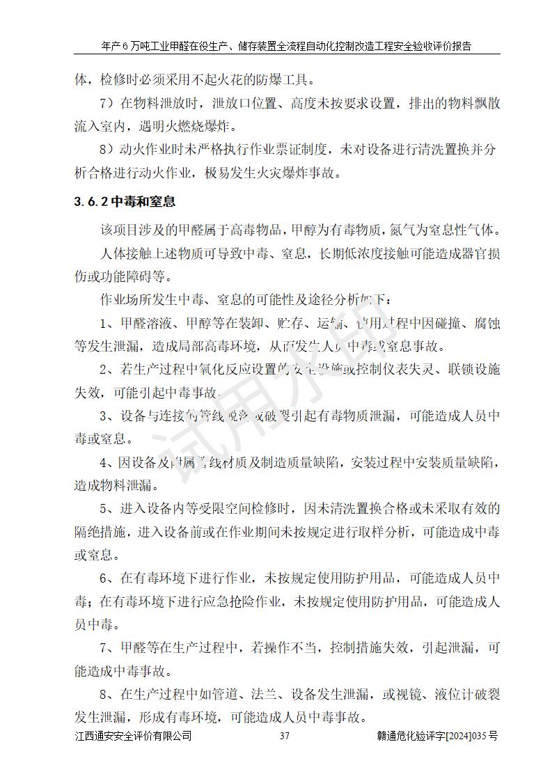 項(xiàng)目簡(jiǎn)介 | 信豐冠美化工有限公司位于江西省贛州市信豐縣工業(yè)園偉邦路,法定**人為汪學(xué)斌,成立于2007年04月09日,注冊(cè)資本壹仟萬(wàn)元整,營(yíng)業(yè)執(zhí)照經(jīng)營(yíng)范圍為工業(yè)甲醛、尿醛樹(shù)脂膠生產(chǎn)、銷售(憑許可證經(jīng)營(yíng))等。 信豐冠美化工有限公司2023年08月03日取得了《安全生產(chǎn)許可證》,許可證編號(hào):(贛)WH安許證字[2008]0500號(hào),許可范圍為工業(yè)甲醛溶液(60kt/a),**期2023年08月06日至2026年08月05日。該公司2022年8月30日取得了安全生產(chǎn)標(biāo)準(zhǔn)化證書(shū),證書(shū)編號(hào):贛AQBWⅡ[2022]015,**期至2025年8月。該公司現(xiàn)有員工23人,其中專職安全管理人員1人。 企業(yè)裝置設(shè)施原有**的自動(dòng)化水平,配備有DCS系統(tǒng)和SIS系統(tǒng),廠區(qū)綜合辦公樓一樓設(shè)置了控制室。根據(jù)《江西省應(yīng)急管理廳關(guān)于印發(fā)<江西省化工企業(yè)自動(dòng)化提升實(shí)施方案>(試行)的通知》(贛應(yīng)急字〔2021〕190號(hào)),企業(yè)委托河北英科石化工程有限公司編制了《信豐冠美化工有限公司年產(chǎn)6萬(wàn)噸工業(yè)甲醛在役生產(chǎn)、儲(chǔ)存裝置全流程自動(dòng)化控制改造設(shè)計(jì)方案》,且通過(guò)了專家評(píng)審。該自動(dòng)化改造工程由山東山河公路機(jī)械有限公司負(fù)責(zé)施工、安裝、調(diào)試和試運(yùn)行,并出具了調(diào)試報(bào)告。 信豐冠美化工有限公司年產(chǎn)6萬(wàn)噸工業(yè)甲醛溶液項(xiàng)目生產(chǎn)過(guò)程中涉及的原輔材料為甲醇和銀觸媒(催化劑),氮封需要使用氮?dú)猓狈磻?yīng)產(chǎn)物為氫氣,產(chǎn)品為甲醛溶液。根據(jù)《危險(xiǎn)化學(xué)品目錄》,該項(xiàng)目涉及的甲醇、氮?dú)?、氫氣、甲醛和甲醛溶液屬?/span>危險(xiǎn)化學(xué)品。經(jīng)辨識(shí),甲醇和氫氣屬于重點(diǎn)監(jiān)管的危險(xiǎn)化學(xué)品,甲醛屬于高毒物品,甲醇屬于特別管控的危險(xiǎn)化學(xué)品,不涉及監(jiān)控化學(xué)品、易制毒化學(xué)品、易制爆危險(xiǎn)化學(xué)品和劇毒化學(xué)品,生產(chǎn)、儲(chǔ)存單元不構(gòu)成危險(xiǎn)化學(xué)品重大危險(xiǎn)源,涉及的氧化反應(yīng)屬于重點(diǎn)監(jiān)管的危險(xiǎn)化工工藝。 | ||||||