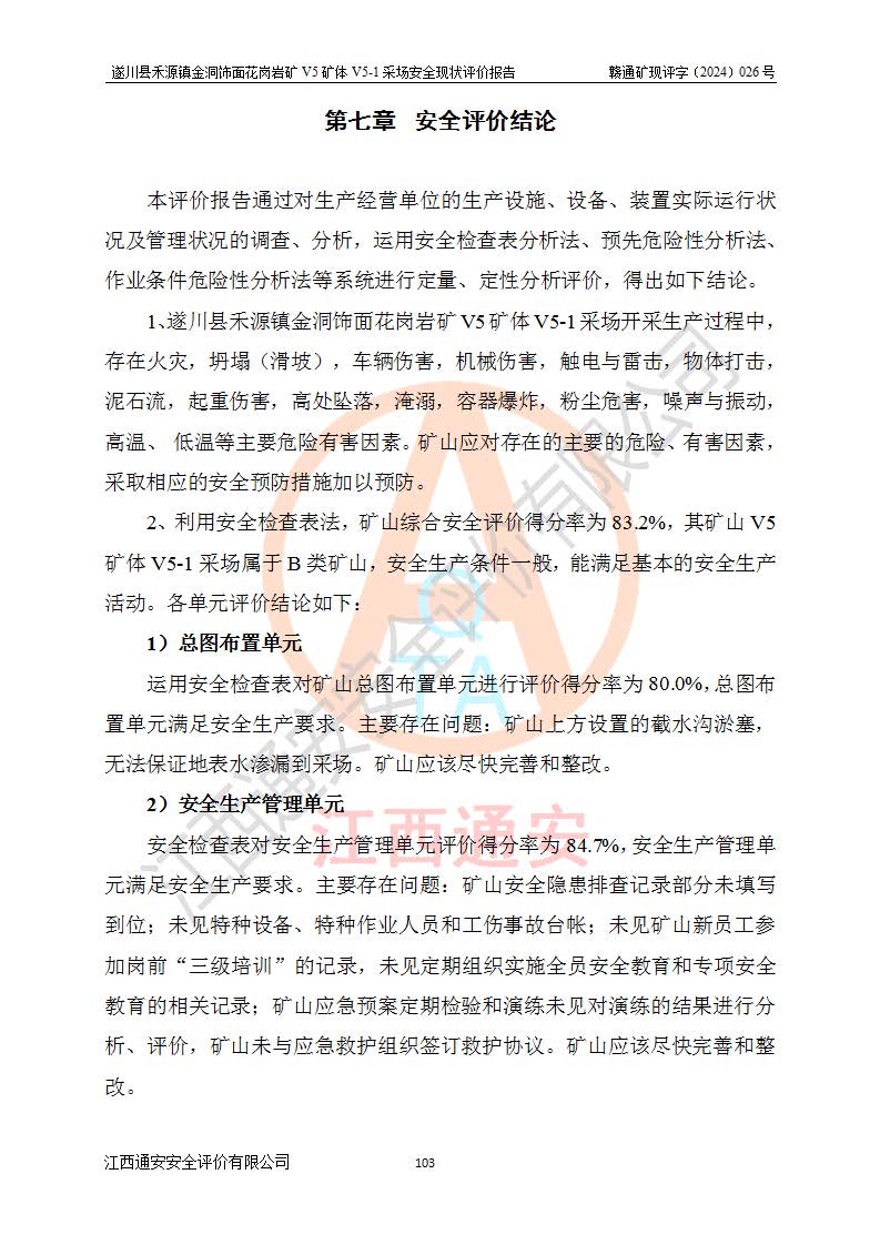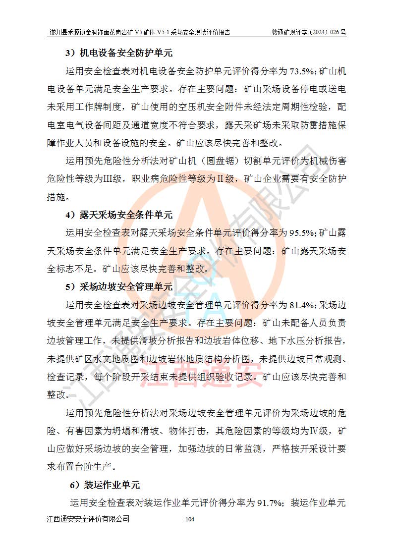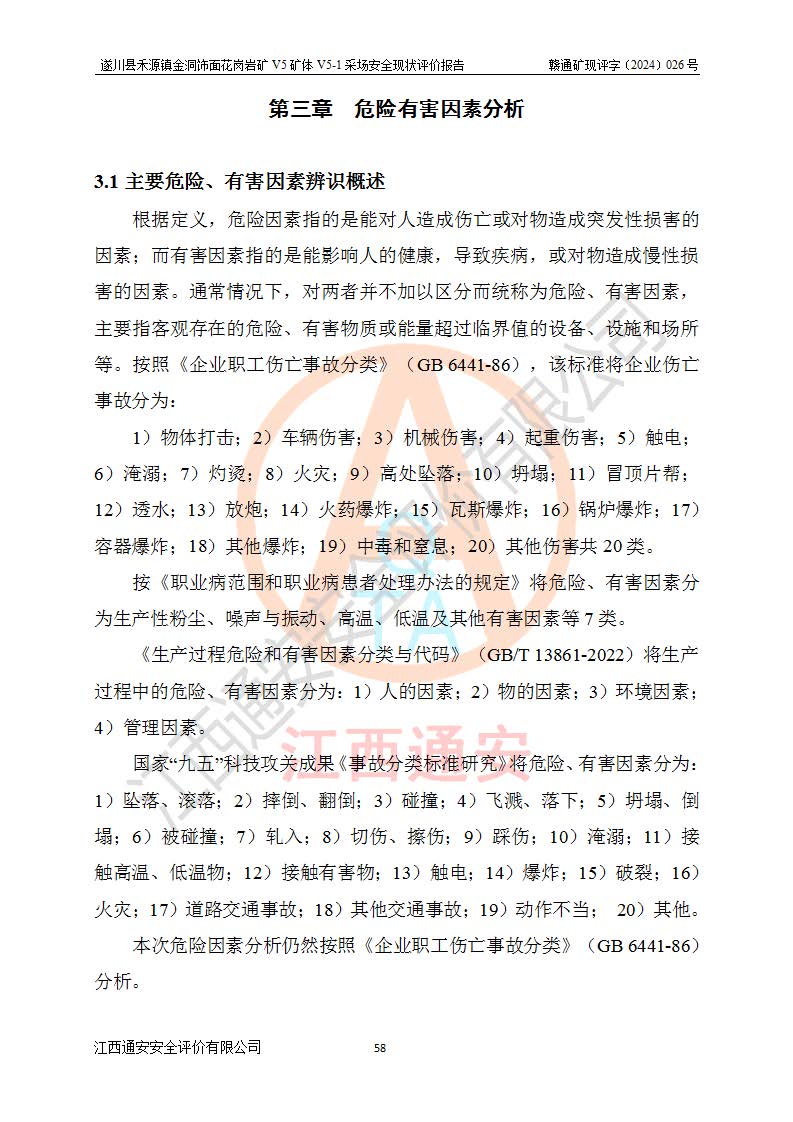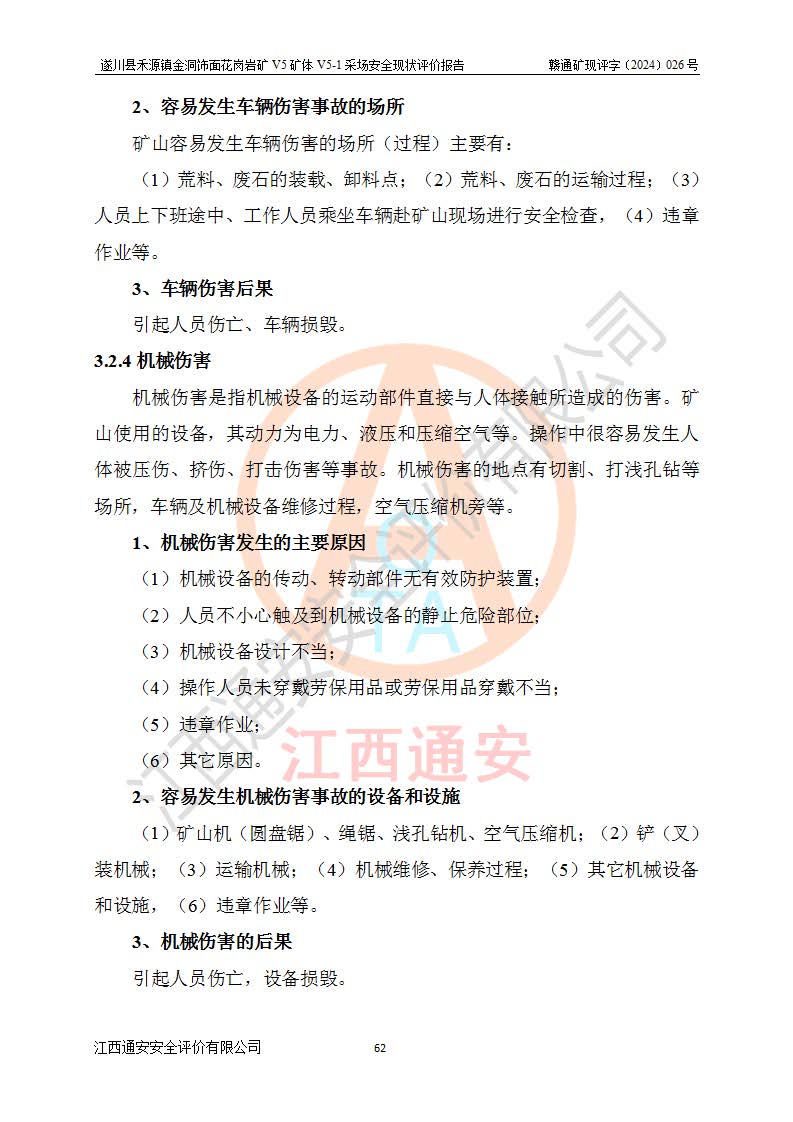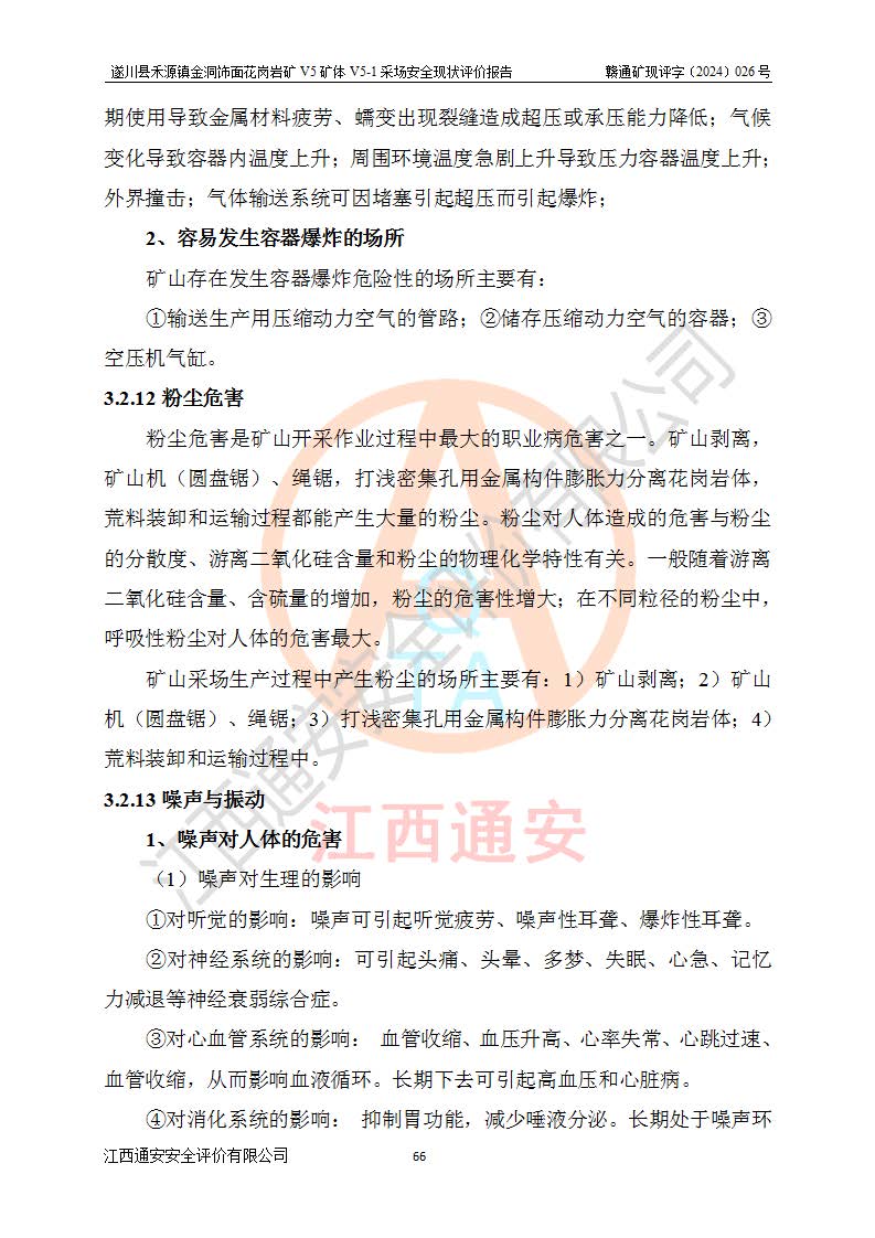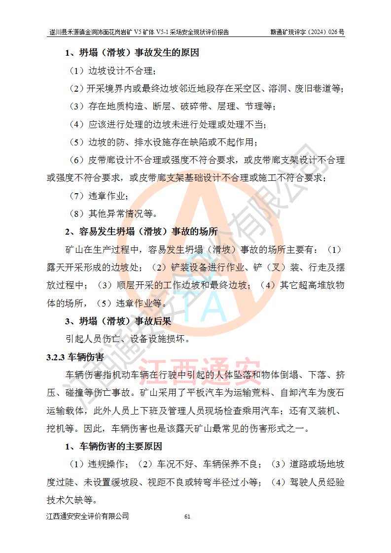 1、該評(píng)價(jià)項(xiàng)目中存在的主要危險(xiǎn)因素:火災(zāi),坍塌(滑坡),**傷害,機(jī)械傷害,觸電與雷擊,物體打擊,泥石流,起重傷害,高處墜落,淹溺,容器爆炸等危險(xiǎn)有害因素。 2、該評(píng)價(jià)項(xiàng)目中存在的有害因素包括:粉塵、噪聲與振動(dòng)、不良作業(yè)環(huán)境,如高溫、雷擊對(duì)礦山人員的傷害和其他不利的環(huán)境因素等。 3、該評(píng)價(jià)項(xiàng)目為非金屬露天礦山,無瓦斯和自燃發(fā)火危險(xiǎn),礦區(qū)范圍內(nèi)及周邊無較大水系,礦區(qū)水文地質(zhì)條件簡單。該礦山只是對(duì)飾面用石料進(jìn)行機(jī)械開采,不使用有毒有害危險(xiǎn)化學(xué)品藥劑。該評(píng)價(jià)項(xiàng)目使用的壓力容器為空壓機(jī)儲(chǔ)氣罐,其工作介質(zhì)為空氣,屬**性、非易燃介質(zhì)。綜合上述分析,本評(píng)價(jià)項(xiàng)目不存在重大危險(xiǎn)源。 上述主要危險(xiǎn)、有害因素在采取本報(bào)告第六章中提出的安全對(duì)策措施及建議后,能得到**控制。遂川縣禾源鎮(zhèn)金洞飾面花崗巖礦V5礦體V5-1采場(chǎng)設(shè)備、設(shè)施和場(chǎng)所符合**安全生產(chǎn)有關(guān)法律、法規(guī)、標(biāo)準(zhǔn)及規(guī)范的規(guī)定。礦山采用露天開采、公路開拓、汽車運(yùn)輸方式,安全生產(chǎn)條件一般,能滿足基本的安全生產(chǎn)活動(dòng);安全管理能滿足法規(guī)要求,礦山露天開采按照《安全設(shè)施設(shè)計(jì)》組織生產(chǎn)、具備安全生產(chǎn)條件。 |