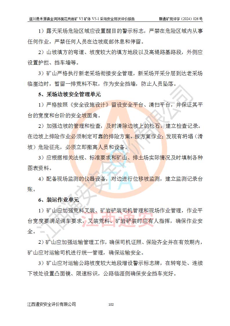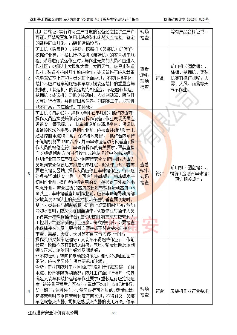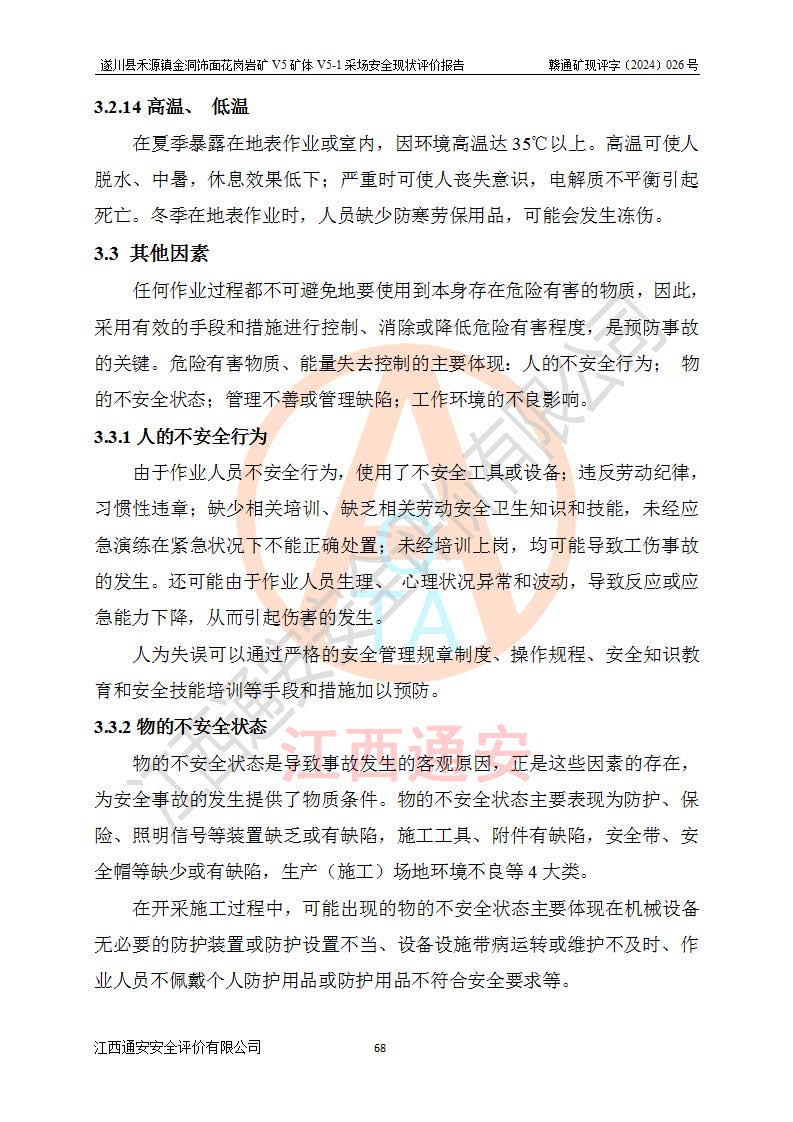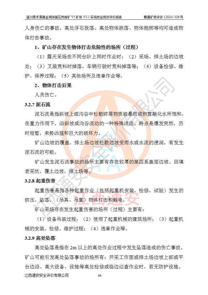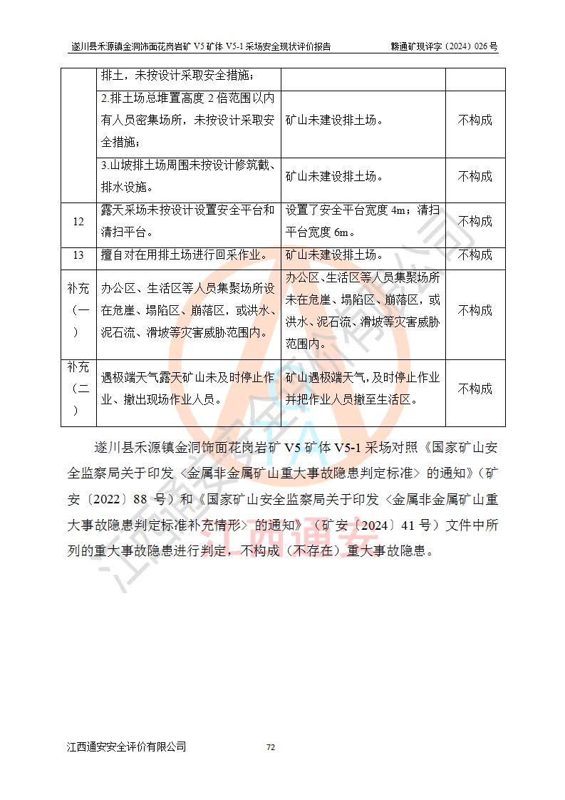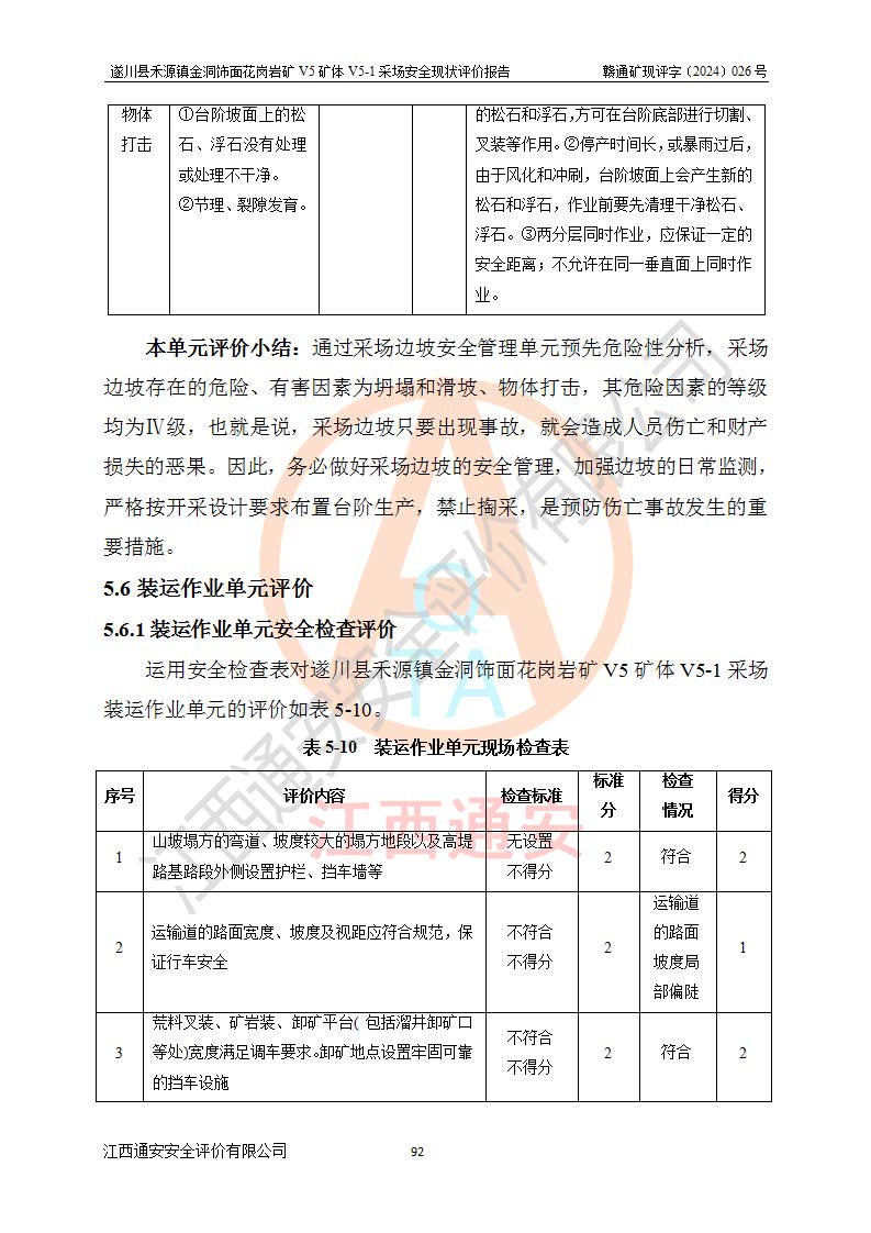 1、該評(píng)價(jià)項(xiàng)目中存在的主要危險(xiǎn)因素:火災(zāi),坍塌(滑坡),**傷害,機(jī)械傷害,觸電與雷擊,物體打擊,泥石流,起重傷害,高處墜落,淹溺,容器爆炸等危險(xiǎn)有害因素。 2、該評(píng)價(jià)項(xiàng)目中存在的有害因素包括:粉塵、噪聲與振動(dòng)、不良作業(yè)環(huán)境,如高溫、雷擊對(duì)礦山人員的傷害和其他不利的環(huán)境因素等。 3、該評(píng)價(jià)項(xiàng)目為非金屬露天礦山,無瓦斯和自燃發(fā)火危險(xiǎn),礦區(qū)范圍內(nèi)及周邊無較大水系,礦區(qū)水文地質(zhì)條件簡單。該礦山只是對(duì)飾面用石料進(jìn)行機(jī)械開采,不使用有毒有害危險(xiǎn)化學(xué)品藥劑。該評(píng)價(jià)項(xiàng)目使用的壓力容器為空壓機(jī)儲(chǔ)氣罐,其工作介質(zhì)為空氣,屬**性、非易燃介質(zhì)。綜合上述分析,本評(píng)價(jià)項(xiàng)目不存在重大危險(xiǎn)源。 上述主要危險(xiǎn)、有害因素在采取本報(bào)告第六章中提出的安全對(duì)策措施及建議后,能得到**控制。遂川縣禾源鎮(zhèn)金洞飾面花崗巖礦V5礦體V5-1采場(chǎng)設(shè)備、設(shè)施和場(chǎng)所符合**安全生產(chǎn)有關(guān)法律、法規(guī)、標(biāo)準(zhǔn)及規(guī)范的規(guī)定。礦山采用露天開采、公路開拓、汽車運(yùn)輸方式,安全生產(chǎn)條件一般,能滿足基本的安全生產(chǎn)活動(dòng);安全管理能滿足法規(guī)要求,礦山露天開采按照《安全設(shè)施設(shè)計(jì)》組織生產(chǎn)、具備安全生產(chǎn)條件。 |