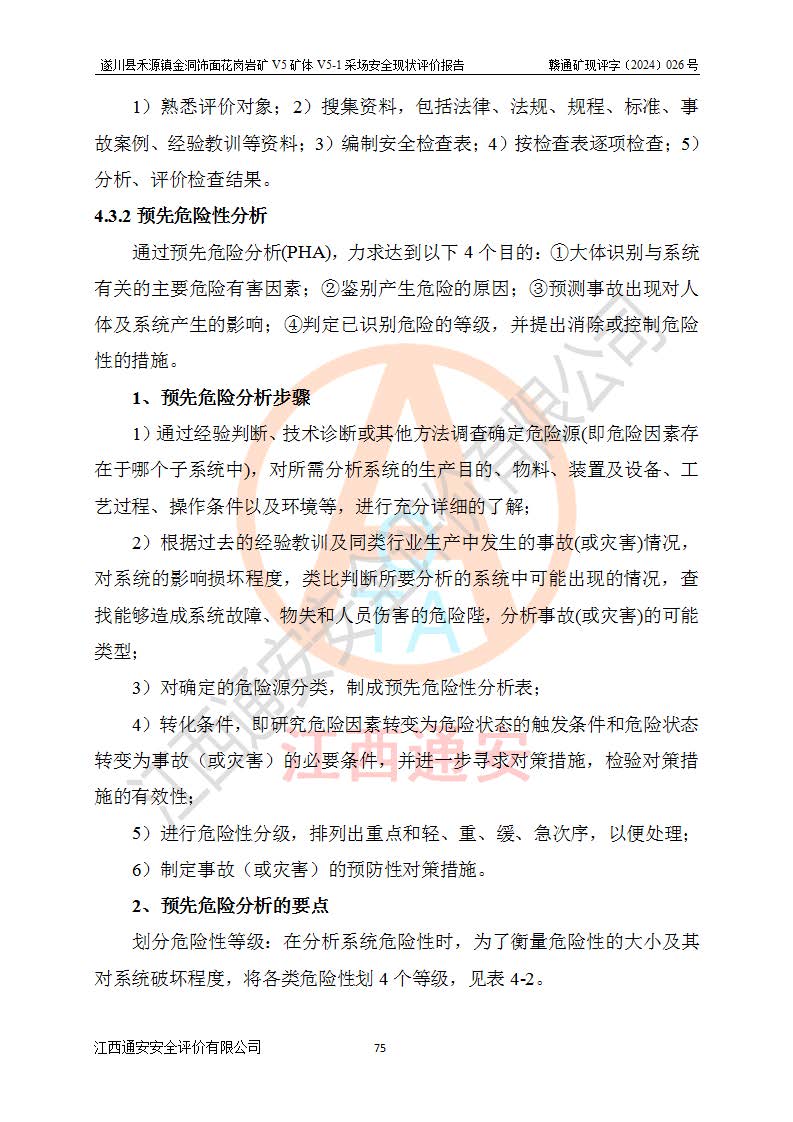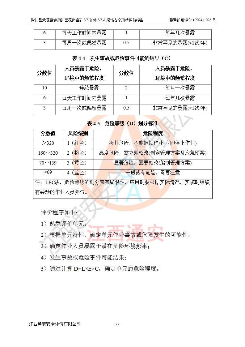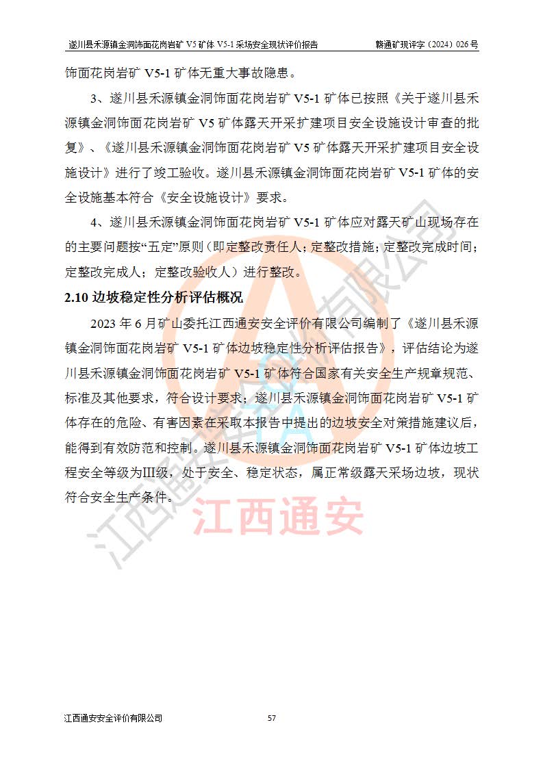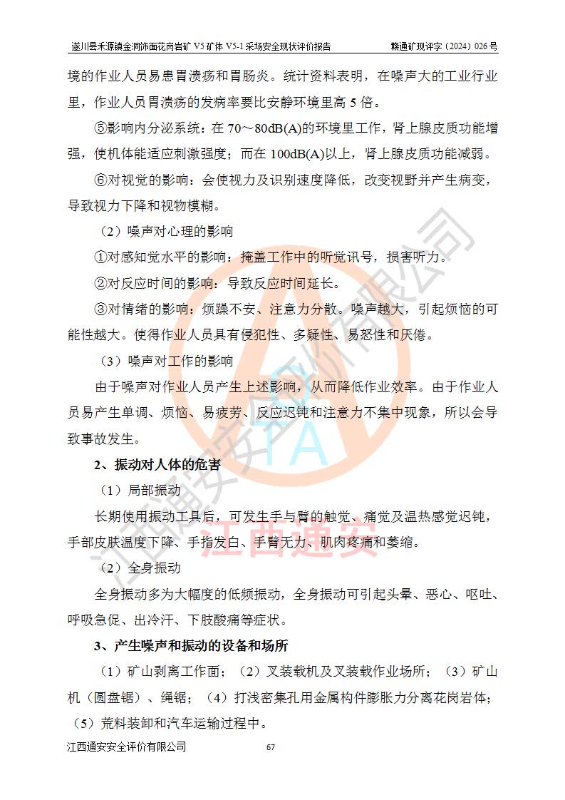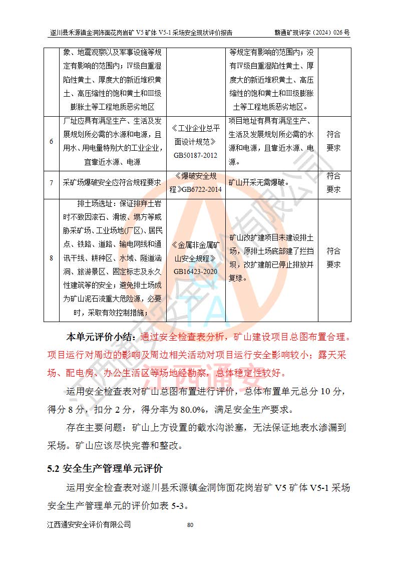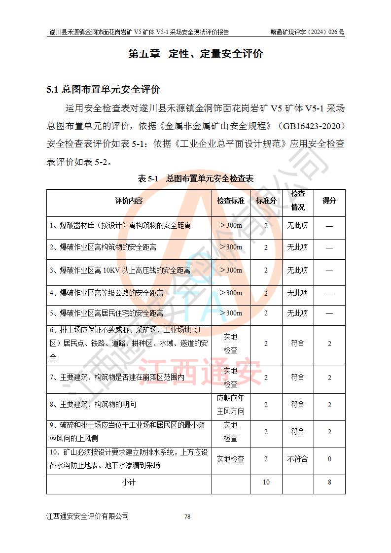 1、該評(píng)價(jià)項(xiàng)目中存在的主要危險(xiǎn)因素:火災(zāi),坍塌(滑坡),**傷害,機(jī)械傷害,觸電與雷擊,物體打擊,泥石流,起重傷害,高處墜落,淹溺,容器爆炸等危險(xiǎn)有害因素。 2、該評(píng)價(jià)項(xiàng)目中存在的有害因素包括:粉塵、噪聲與振動(dòng)、不良作業(yè)環(huán)境,如高溫、雷擊對(duì)礦山人員的傷害和其他不利的環(huán)境因素等。 3、該評(píng)價(jià)項(xiàng)目為非金屬露天礦山,無瓦斯和自燃發(fā)火危險(xiǎn),礦區(qū)范圍內(nèi)及周邊無較大水系,礦區(qū)水文地質(zhì)條件簡單。該礦山只是對(duì)飾面用石料進(jìn)行機(jī)械開采,不使用有毒有害危險(xiǎn)化學(xué)品藥劑。該評(píng)價(jià)項(xiàng)目使用的壓力容器為空壓機(jī)儲(chǔ)氣罐,其工作介質(zhì)為空氣,屬**性、非易燃介質(zhì)。綜合上述分析,本評(píng)價(jià)項(xiàng)目不存在重大危險(xiǎn)源。 上述主要危險(xiǎn)、有害因素在采取本報(bào)告第六章中提出的安全對(duì)策措施及建議后,能得到**控制。遂川縣禾源鎮(zhèn)金洞飾面花崗巖礦V5礦體V5-1采場(chǎng)設(shè)備、設(shè)施和場(chǎng)所符合**安全生產(chǎn)有關(guān)法律、法規(guī)、標(biāo)準(zhǔn)及規(guī)范的規(guī)定。礦山采用露天開采、公路開拓、汽車運(yùn)輸方式,安全生產(chǎn)條件一般,能滿足基本的安全生產(chǎn)活動(dòng);安全管理能滿足法規(guī)要求,礦山露天開采按照《安全設(shè)施設(shè)計(jì)》組織生產(chǎn)、具備安全生產(chǎn)條件。 |