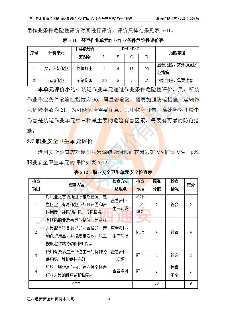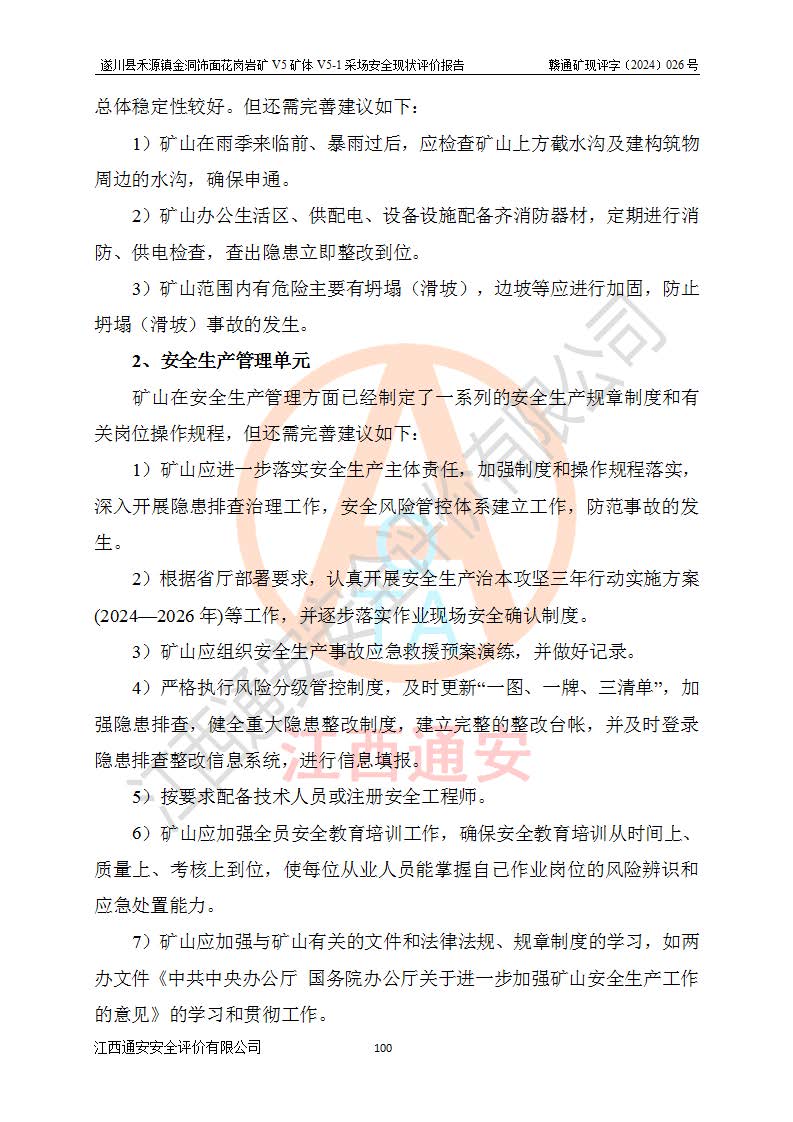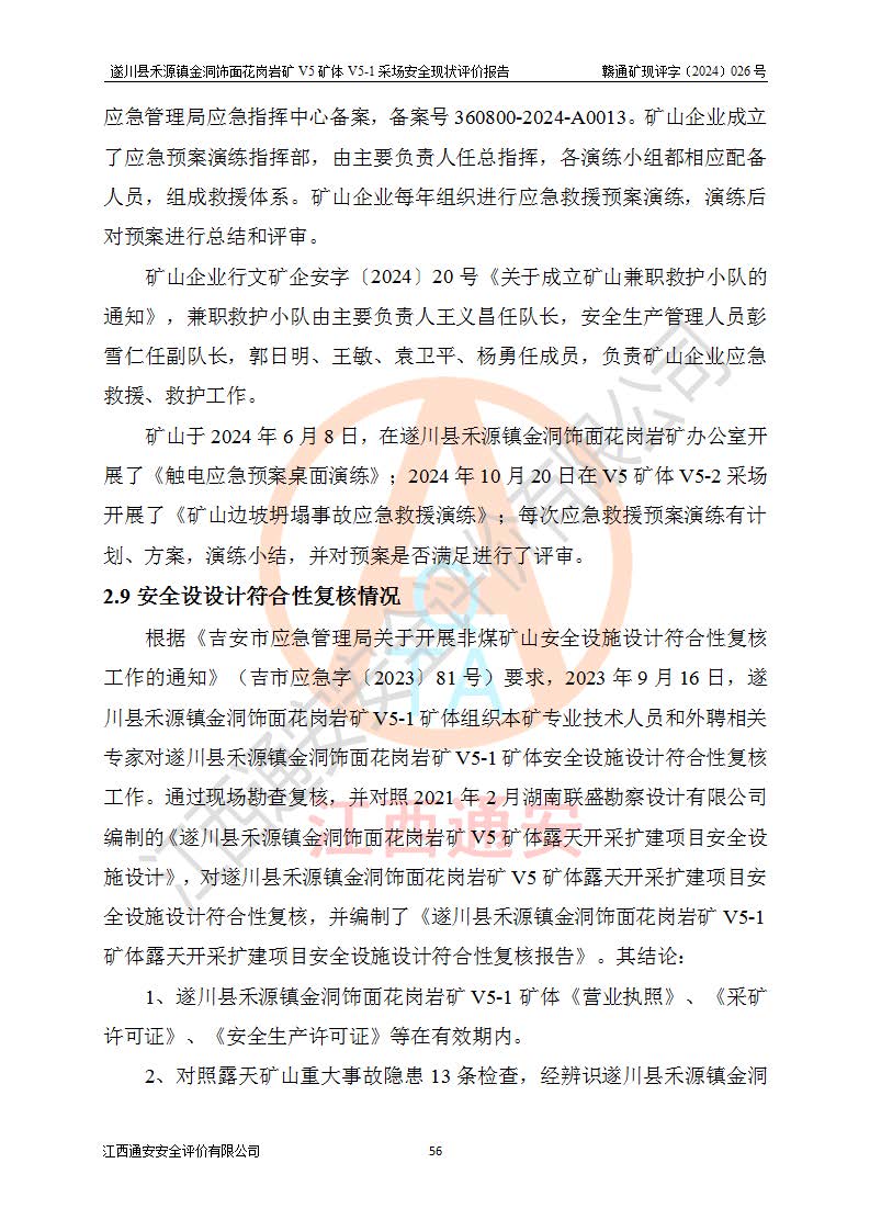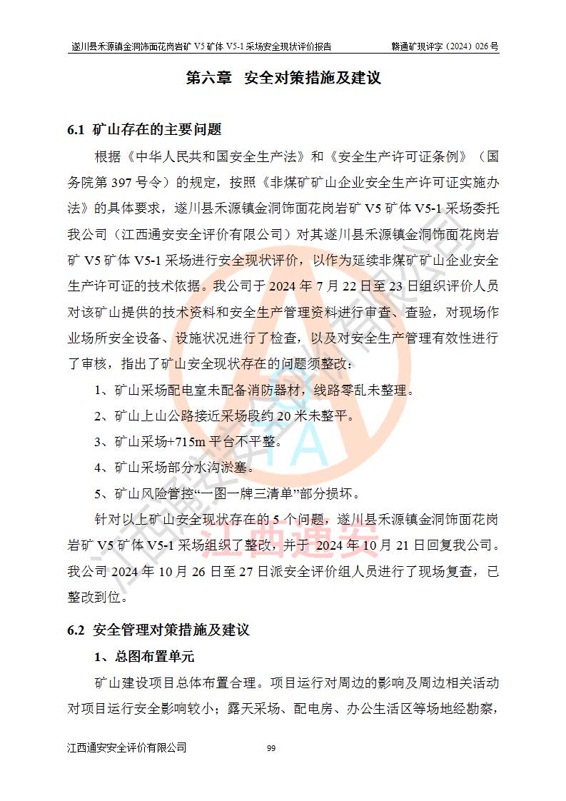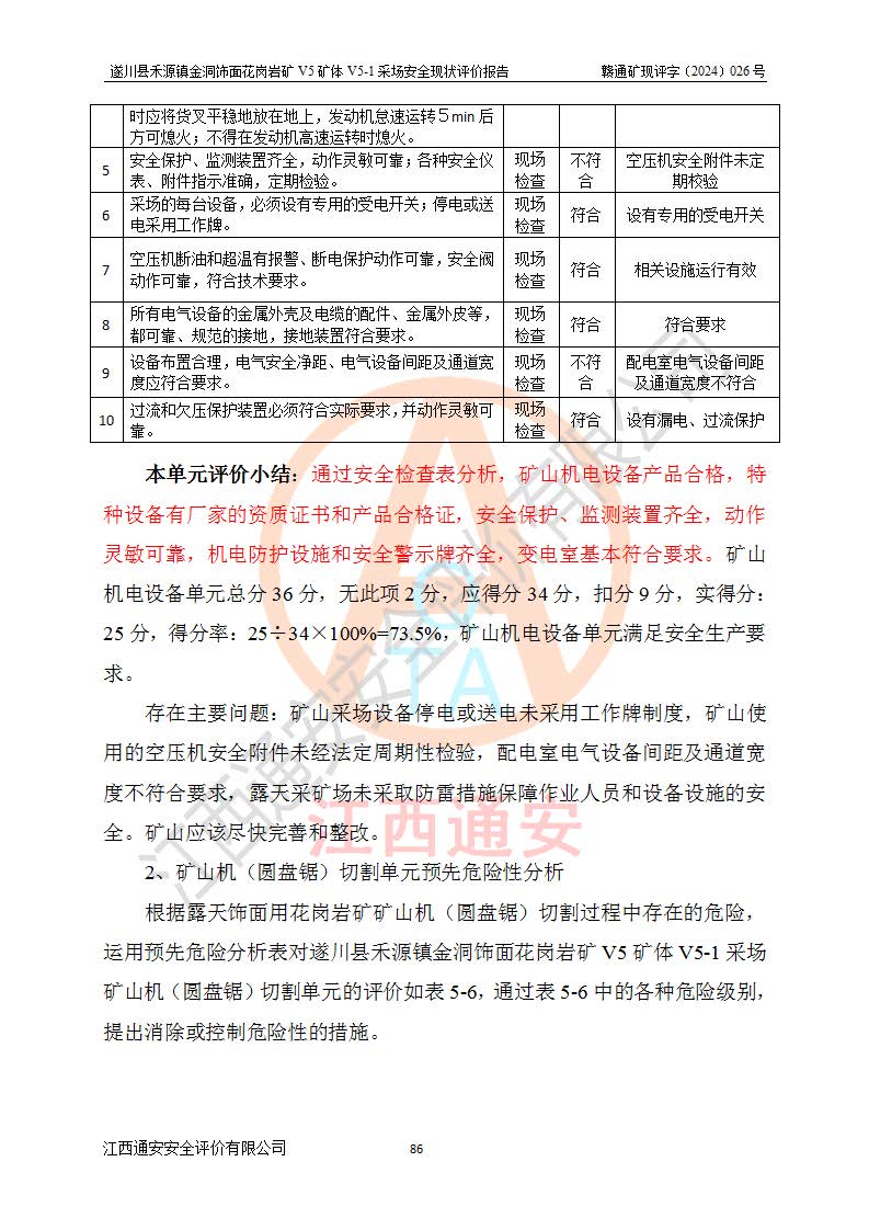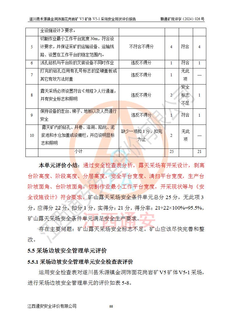 1、該評(píng)價(jià)項(xiàng)目中存在的主要危險(xiǎn)因素:火災(zāi),坍塌(滑坡),**傷害,機(jī)械傷害,觸電與雷擊,物體打擊,泥石流,起重傷害,高處墜落,淹溺,容器爆炸等危險(xiǎn)有害因素。 2、該評(píng)價(jià)項(xiàng)目中存在的有害因素包括:粉塵、噪聲與振動(dòng)、不良作業(yè)環(huán)境,如高溫、雷擊對(duì)礦山人員的傷害和其他不利的環(huán)境因素等。 3、該評(píng)價(jià)項(xiàng)目為非金屬露天礦山,無瓦斯和自燃發(fā)火危險(xiǎn),礦區(qū)范圍內(nèi)及周邊無較大水系,礦區(qū)水文地質(zhì)條件簡單。該礦山只是對(duì)飾面用石料進(jìn)行機(jī)械開采,不使用有毒有害危險(xiǎn)化學(xué)品藥劑。該評(píng)價(jià)項(xiàng)目使用的壓力容器為空壓機(jī)儲(chǔ)氣罐,其工作介質(zhì)為空氣,屬**性、非易燃介質(zhì)。綜合上述分析,本評(píng)價(jià)項(xiàng)目不存在重大危險(xiǎn)源。 上述主要危險(xiǎn)、有害因素在采取本報(bào)告第六章中提出的安全對(duì)策措施及建議后,能得到**控制。遂川縣禾源鎮(zhèn)金洞飾面花崗巖礦V5礦體V5-1采場(chǎng)設(shè)備、設(shè)施和場(chǎng)所符合**安全生產(chǎn)有關(guān)法律、法規(guī)、標(biāo)準(zhǔn)及規(guī)范的規(guī)定。礦山采用露天開采、公路開拓、汽車運(yùn)輸方式,安全生產(chǎn)條件一般,能滿足基本的安全生產(chǎn)活動(dòng);安全管理能滿足法規(guī)要求,礦山露天開采按照《安全設(shè)施設(shè)計(jì)》組織生產(chǎn)、具備安全生產(chǎn)條件。 |