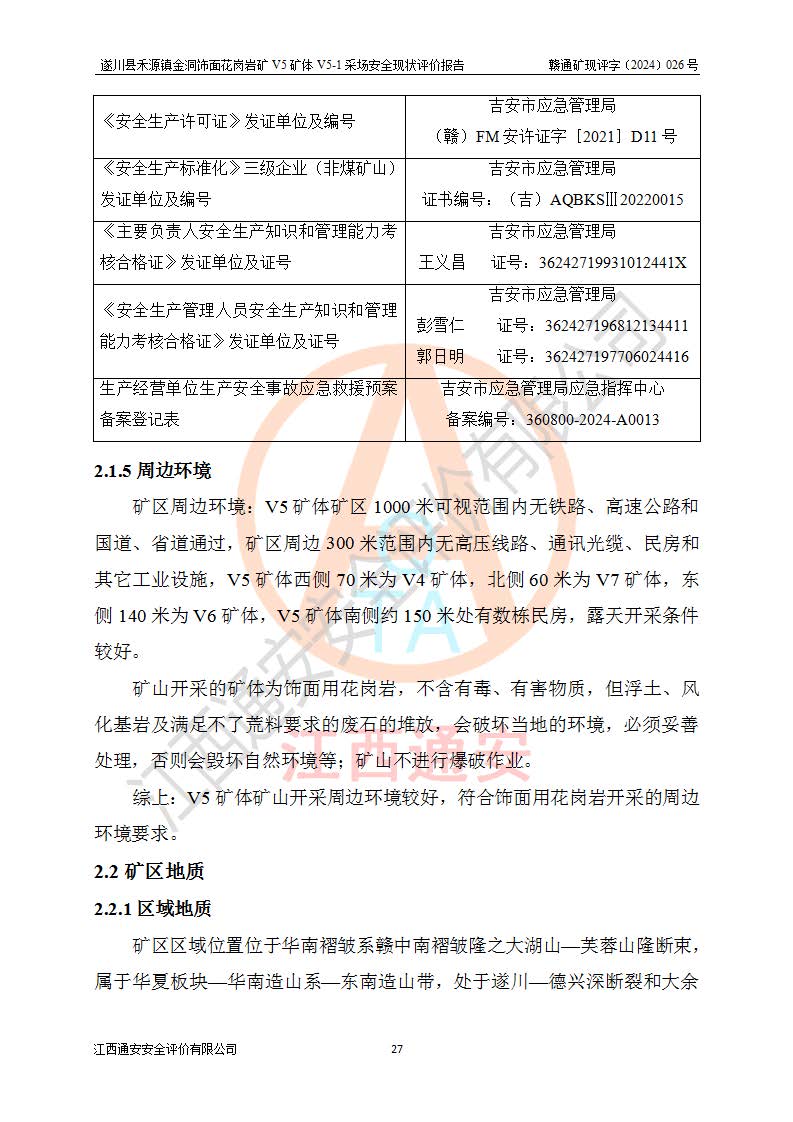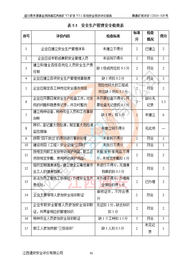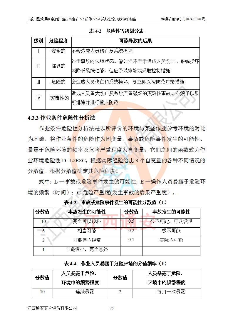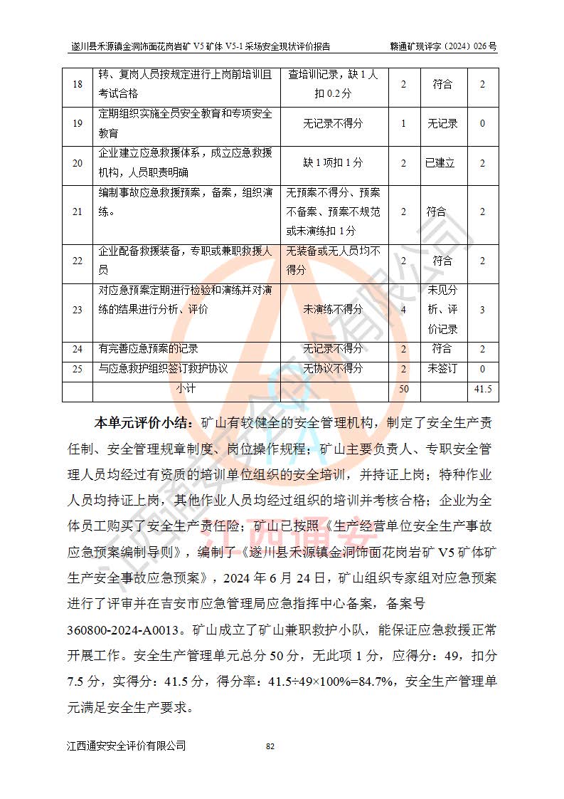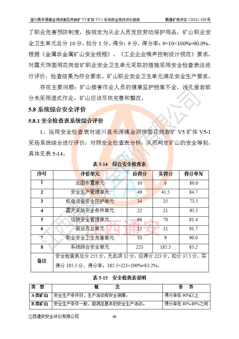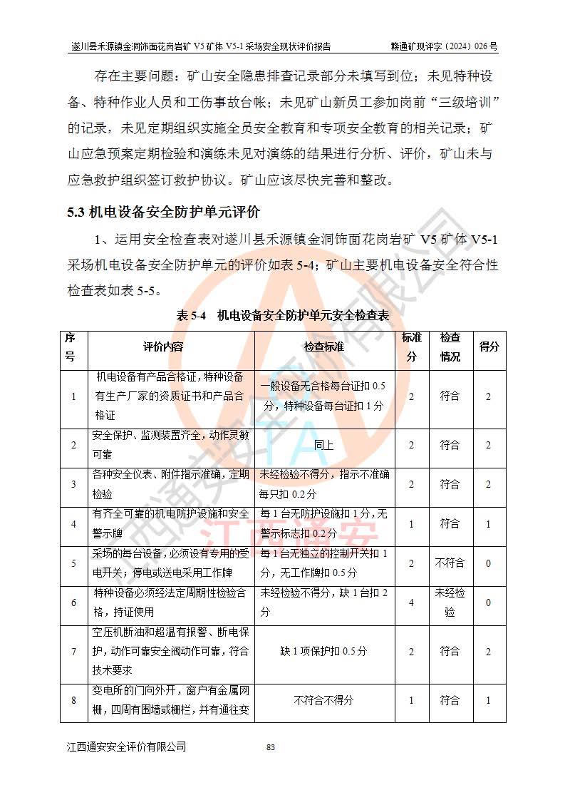 1、該評(píng)價(jià)項(xiàng)目中存在的主要危險(xiǎn)因素:火災(zāi),坍塌(滑坡),**傷害,機(jī)械傷害,觸電與雷擊,物體打擊,泥石流,起重傷害,高處墜落,淹溺,容器爆炸等危險(xiǎn)有害因素。 2、該評(píng)價(jià)項(xiàng)目中存在的有害因素包括:粉塵、噪聲與振動(dòng)、不良作業(yè)環(huán)境,如高溫、雷擊對(duì)礦山人員的傷害和其他不利的環(huán)境因素等。 3、該評(píng)價(jià)項(xiàng)目為非金屬露天礦山,無瓦斯和自燃發(fā)火危險(xiǎn),礦區(qū)范圍內(nèi)及周邊無較大水系,礦區(qū)水文地質(zhì)條件簡單。該礦山只是對(duì)飾面用石料進(jìn)行機(jī)械開采,不使用有毒有害危險(xiǎn)化學(xué)品藥劑。該評(píng)價(jià)項(xiàng)目使用的壓力容器為空壓機(jī)儲(chǔ)氣罐,其工作介質(zhì)為空氣,屬**性、非易燃介質(zhì)。綜合上述分析,本評(píng)價(jià)項(xiàng)目不存在重大危險(xiǎn)源。 上述主要危險(xiǎn)、有害因素在采取本報(bào)告第六章中提出的安全對(duì)策措施及建議后,能得到**控制。遂川縣禾源鎮(zhèn)金洞飾面花崗巖礦V5礦體V5-1采場(chǎng)設(shè)備、設(shè)施和場(chǎng)所符合**安全生產(chǎn)有關(guān)法律、法規(guī)、標(biāo)準(zhǔn)及規(guī)范的規(guī)定。礦山采用露天開采、公路開拓、汽車運(yùn)輸方式,安全生產(chǎn)條件一般,能滿足基本的安全生產(chǎn)活動(dòng);安全管理能滿足法規(guī)要求,礦山露天開采按照《安全設(shè)施設(shè)計(jì)》組織生產(chǎn)、具備安全生產(chǎn)條件。 |
