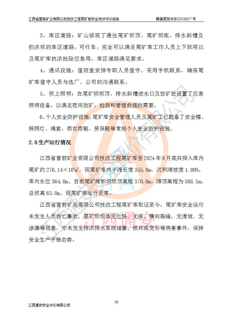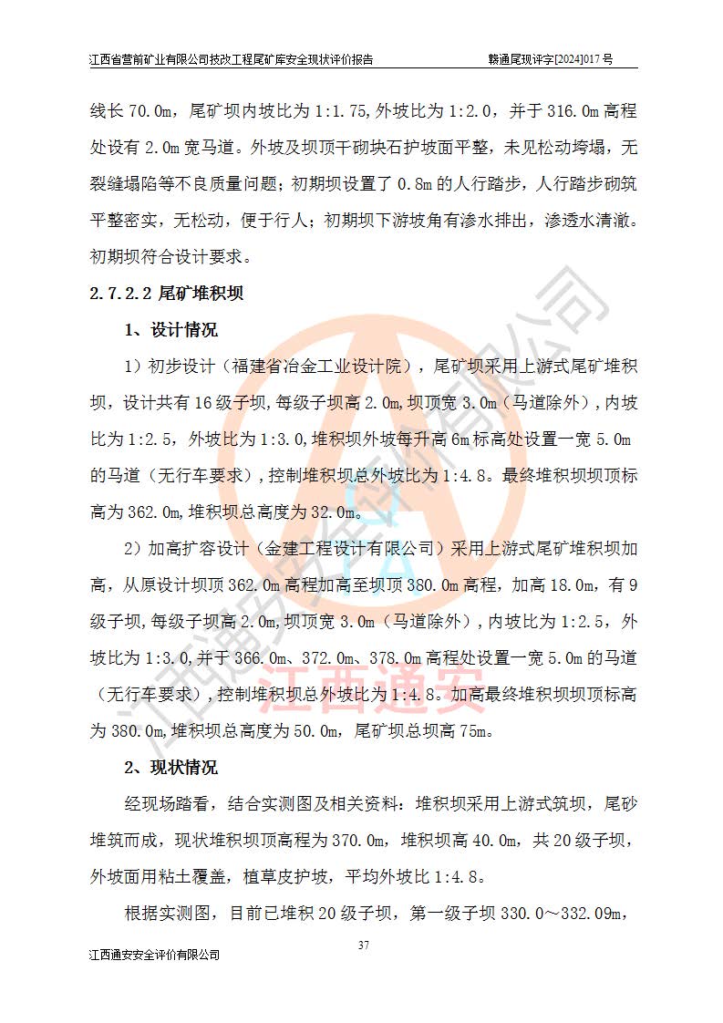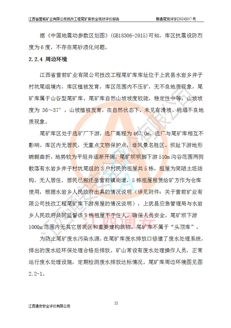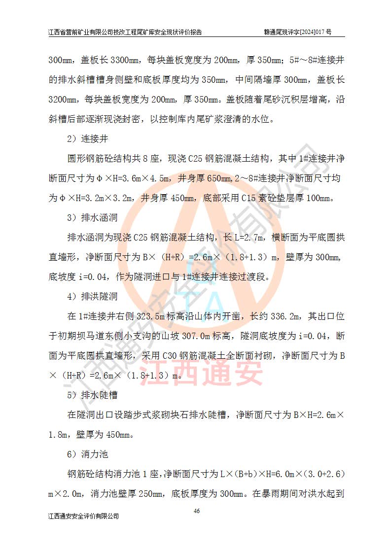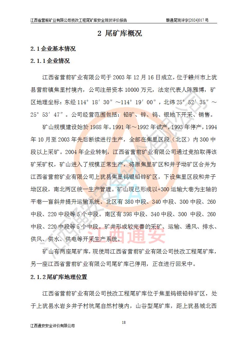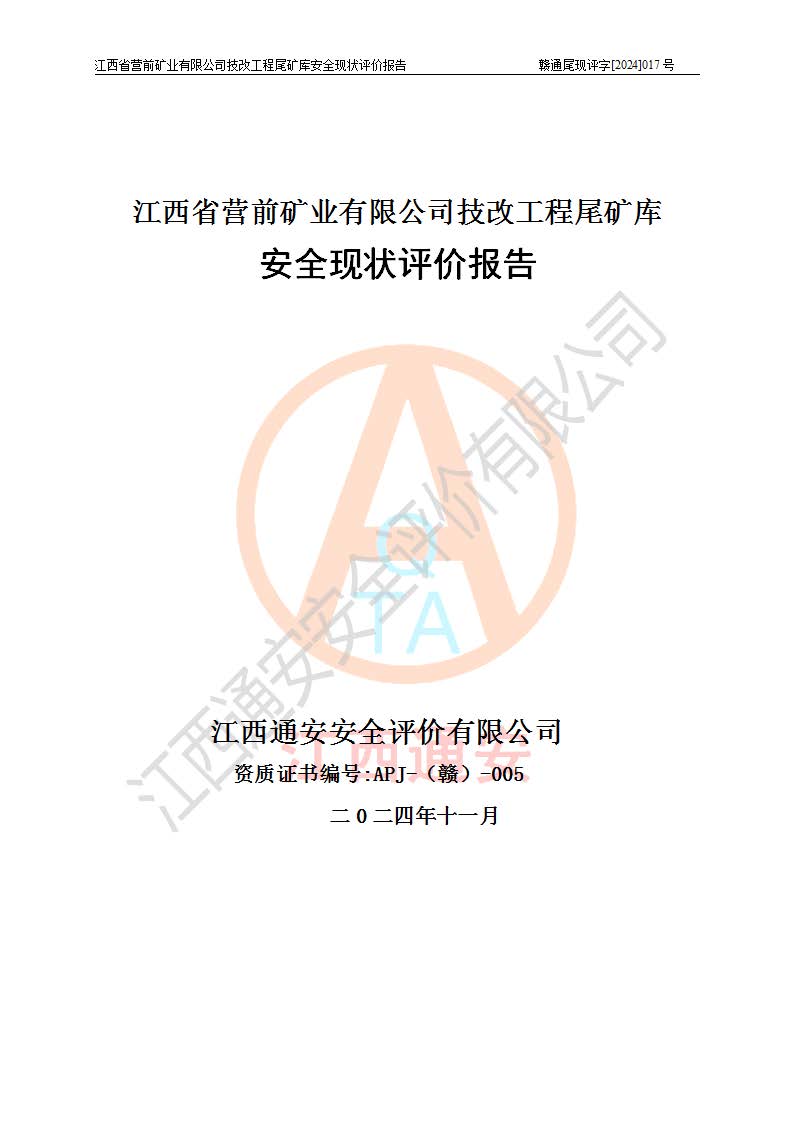 江西省營(yíng)前礦業(yè)有限公司于2003年12月16日成立,位于贛州市上猶縣營(yíng)前鎮(zhèn)焦里村境內(nèi),公司注冊(cè)資本10000萬(wàn)元,法定**人陳雅博,礦區(qū)地理坐標(biāo):東經(jīng)114°18′30″~114°19′00″,北緯25°52′35″~25°53′47″。公司經(jīng)營(yíng)范圍包括:鉛礦、鋅、鎢、銀地下開(kāi)采、銷(xiāo)售。 江西省營(yíng)前礦業(yè)有限公司技改工程尾礦庫(kù)位于焦里鎢銀鉛鋅礦區(qū),處于上猶縣水巖鄉(xiāng)井子村坑尾自然村境內(nèi),山谷型尾礦庫(kù),溝谷呈“V”字形展布,技改工程尾礦庫(kù)原由福建省冶金工業(yè)設(shè)計(jì)院設(shè)計(jì),后由金建工程設(shè)計(jì)有限公司對(duì)該尾礦庫(kù)進(jìn)行了加高擴(kuò)容設(shè)計(jì),加高擴(kuò)容后總庫(kù)容503.14萬(wàn)m3,壩高75.0m,為三等庫(kù)。尾礦庫(kù)主要由尾礦壩、庫(kù)外分洪系統(tǒng)(1#攔洪壩--1#分洪隧洞和2#攔洪壩--2#分洪隧洞--排水陡槽--消力池),庫(kù)內(nèi)排洪排水系統(tǒng)(排水斜槽—連接井—排水涵洞—排水隧洞—排水陡槽—消力池)等組成,尾礦壩壩型為初期壩+上游式堆積壩。 江西省營(yíng)前礦業(yè)有限公司技改工程尾礦庫(kù)于2021年12月30日取得江西省應(yīng)急管理廳版發(fā)的安全生產(chǎn)許可證,證書(shū)編號(hào)(贛)FM安許證字(2016)M1692號(hào),有限期從2022年1月18日到2025年1月17日,為三年期。依照《非煤礦礦山企業(yè)安全生產(chǎn)許可證延期換證工作》的通知,根據(jù)***《安全生產(chǎn)許可證條例》、《江西省安全生產(chǎn)條例》、《非煤礦山安全生產(chǎn)許可證實(shí)施辦法》、《江西省非煤礦礦山企業(yè)安全生產(chǎn)許可證辦法》規(guī)定的要求,受江西省營(yíng)前礦業(yè)有限公司委托,我公司承擔(dān)了技改工程尾礦庫(kù)延期換證安全現(xiàn)狀評(píng)價(jià)工作。 |