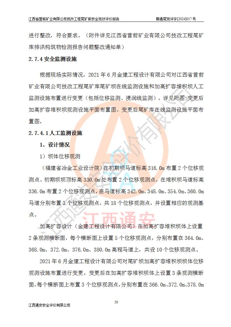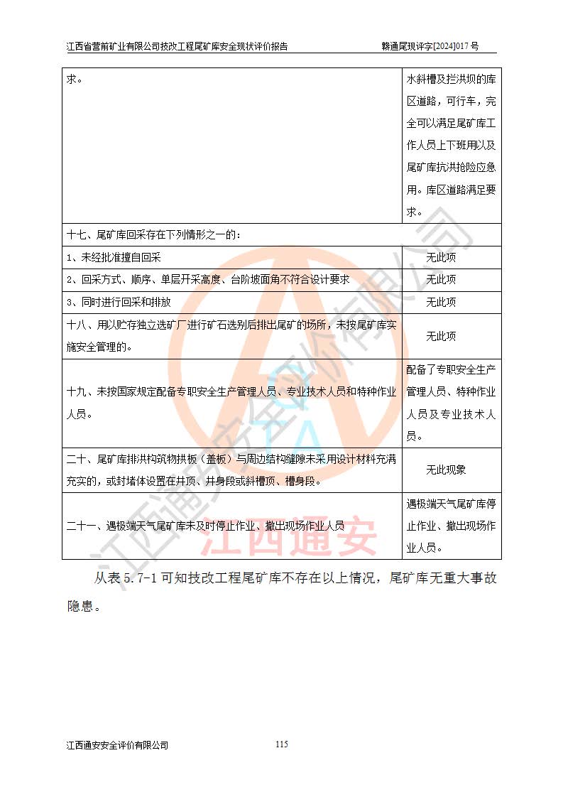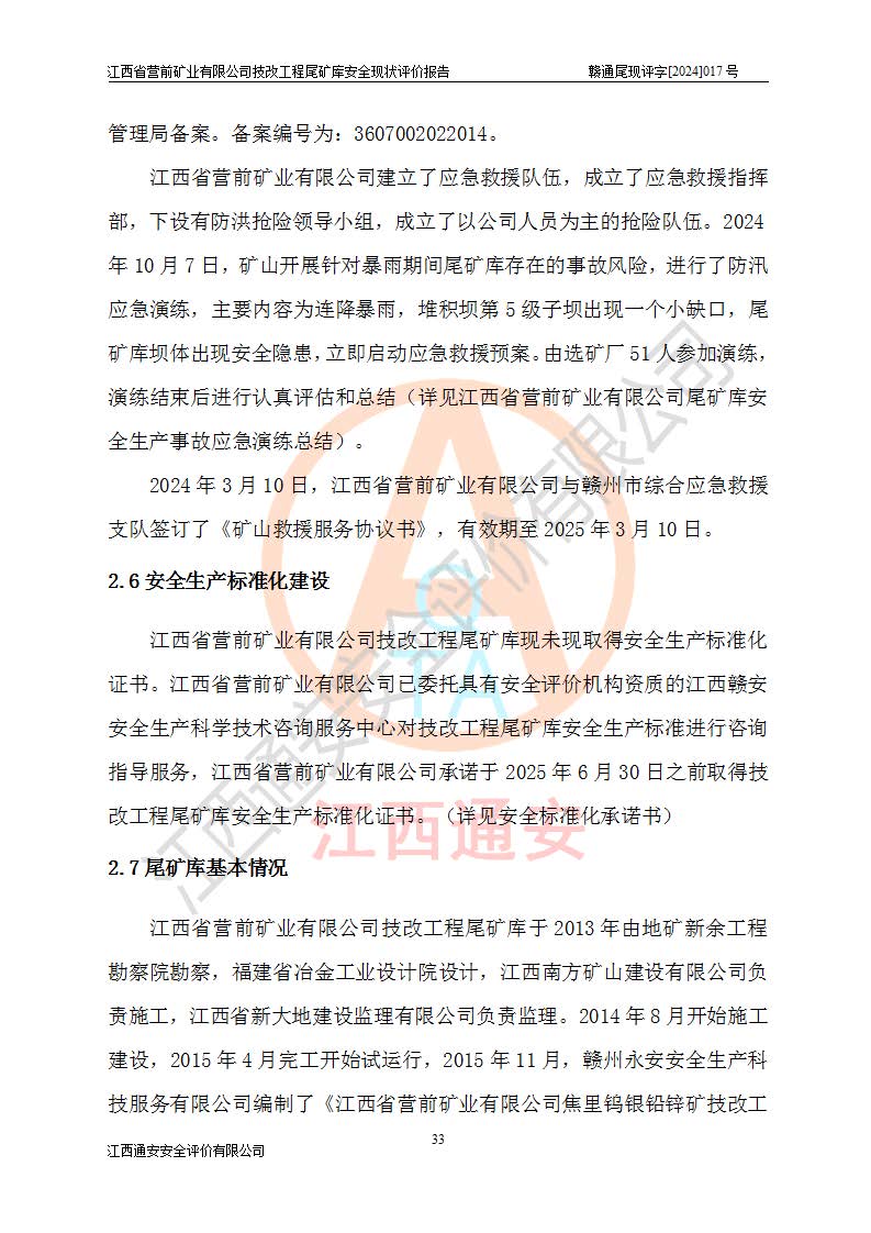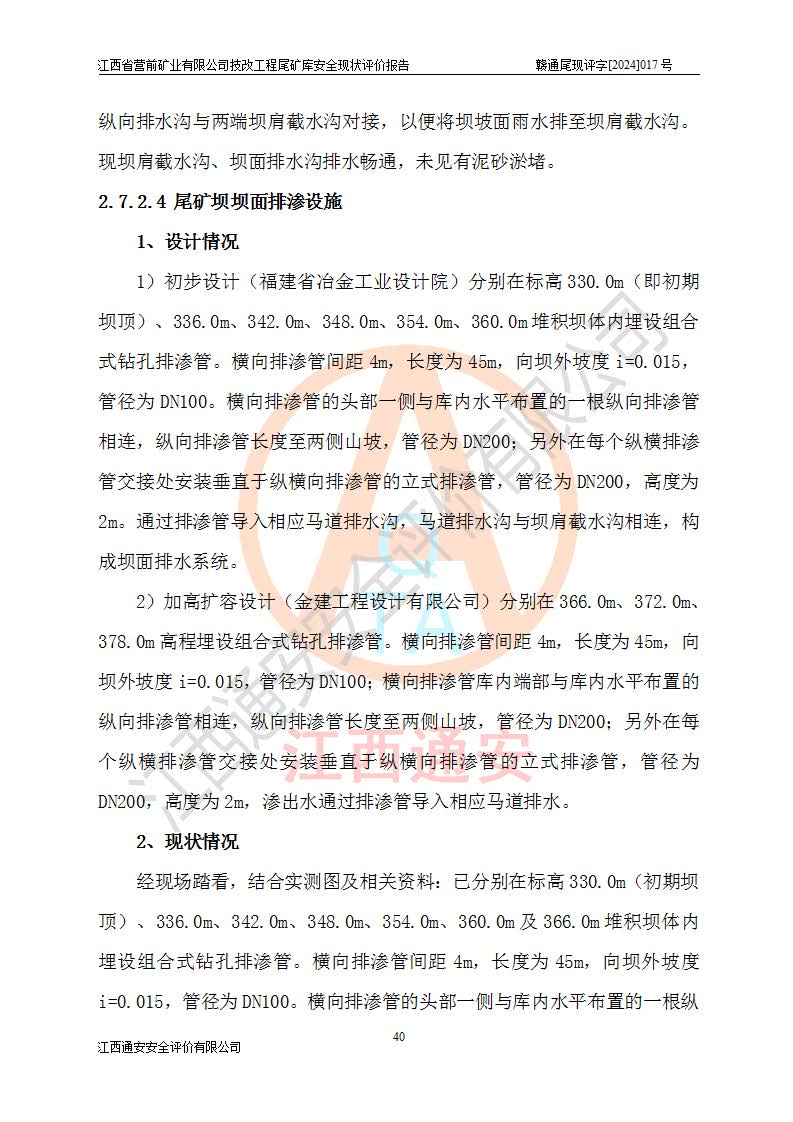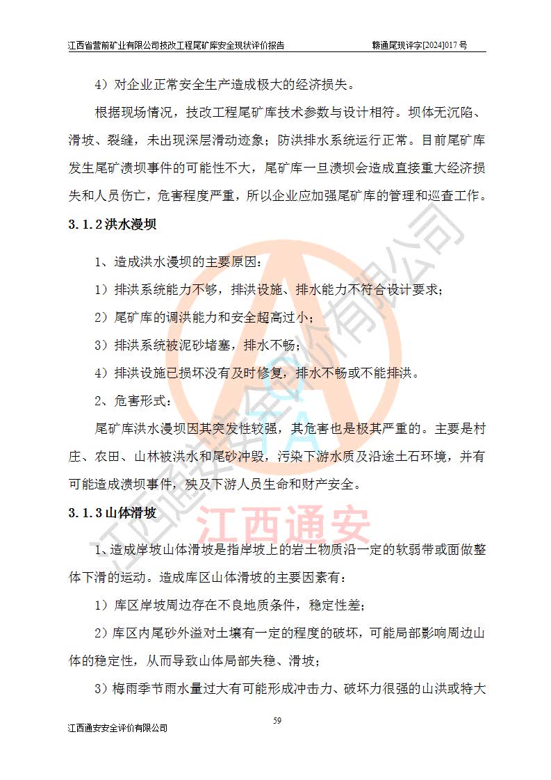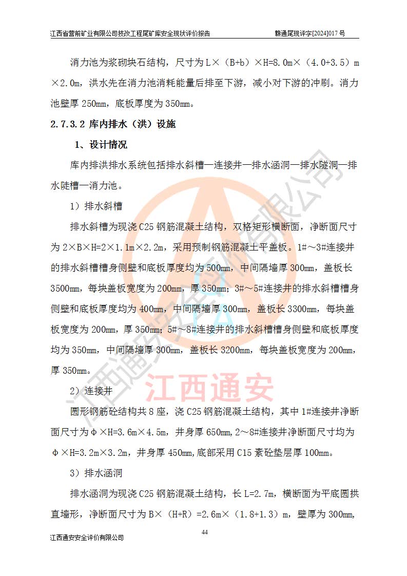 江西省營(yíng)前礦業(yè)有限公司于2003年12月16日成立,位于贛州市上猶縣營(yíng)前鎮(zhèn)焦里村境內(nèi),公司注冊(cè)資本10000萬(wàn)元,法定**人陳雅博,礦區(qū)地理坐標(biāo):東經(jīng)114°18′30″~114°19′00″,北緯25°52′35″~25°53′47″。公司經(jīng)營(yíng)范圍包括:鉛礦、鋅、鎢、銀地下開(kāi)采、銷(xiāo)售。 江西省營(yíng)前礦業(yè)有限公司技改工程尾礦庫(kù)位于焦里鎢銀鉛鋅礦區(qū),處于上猶縣水巖鄉(xiāng)井子村坑尾自然村境內(nèi),山谷型尾礦庫(kù),溝谷呈“V”字形展布,技改工程尾礦庫(kù)原由福建省冶金工業(yè)設(shè)計(jì)院設(shè)計(jì),后由金建工程設(shè)計(jì)有限公司對(duì)該尾礦庫(kù)進(jìn)行了加高擴(kuò)容設(shè)計(jì),加高擴(kuò)容后總庫(kù)容503.14萬(wàn)m3,壩高75.0m,為三等庫(kù)。尾礦庫(kù)主要由尾礦壩、庫(kù)外分洪系統(tǒng)(1#攔洪壩--1#分洪隧洞和2#攔洪壩--2#分洪隧洞--排水陡槽--消力池),庫(kù)內(nèi)排洪排水系統(tǒng)(排水斜槽—連接井—排水涵洞—排水隧洞—排水陡槽—消力池)等組成,尾礦壩壩型為初期壩+上游式堆積壩。 江西省營(yíng)前礦業(yè)有限公司技改工程尾礦庫(kù)于2021年12月30日取得江西省應(yīng)急管理廳版發(fā)的安全生產(chǎn)許可證,證書(shū)編號(hào)(贛)FM安許證字(2016)M1692號(hào),有限期從2022年1月18日到2025年1月17日,為三年期。依照《非煤礦礦山企業(yè)安全生產(chǎn)許可證延期換證工作》的通知,根據(jù)***《安全生產(chǎn)許可證條例》、《江西省安全生產(chǎn)條例》、《非煤礦山安全生產(chǎn)許可證實(shí)施辦法》、《江西省非煤礦礦山企業(yè)安全生產(chǎn)許可證辦法》規(guī)定的要求,受江西省營(yíng)前礦業(yè)有限公司委托,我公司承擔(dān)了技改工程尾礦庫(kù)延期換證安全現(xiàn)狀評(píng)價(jià)工作。 |
