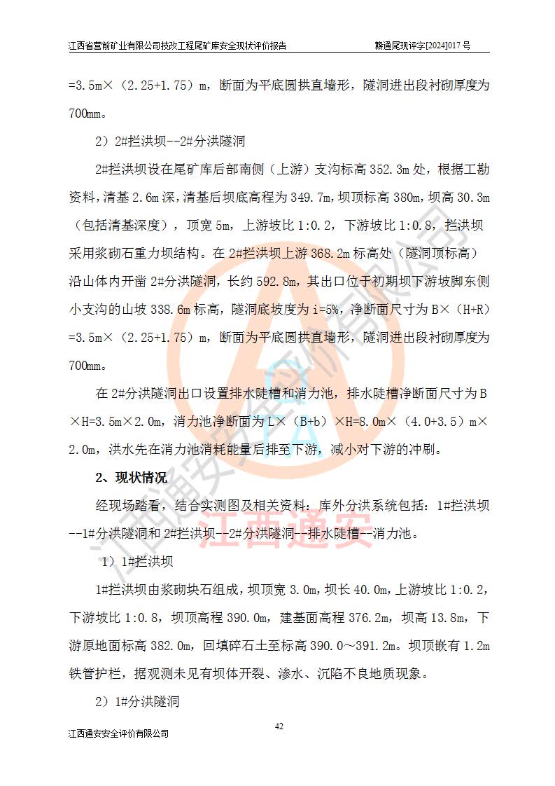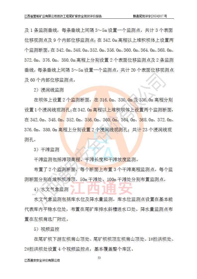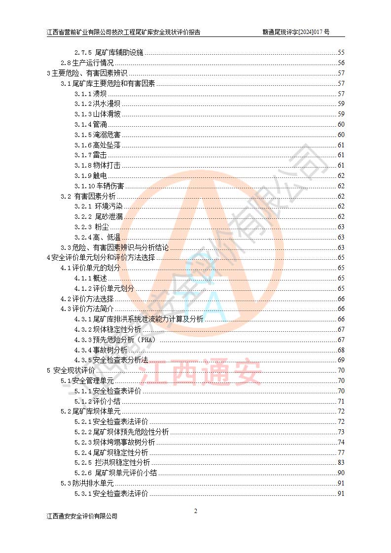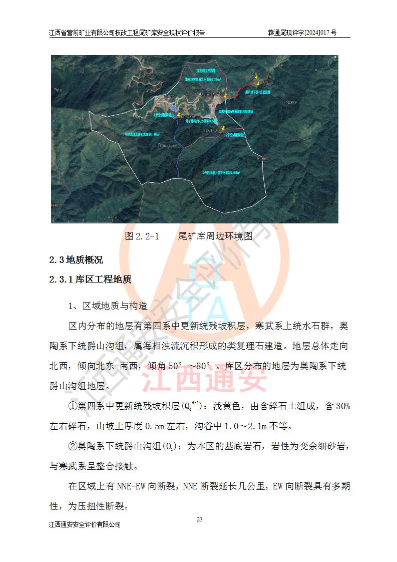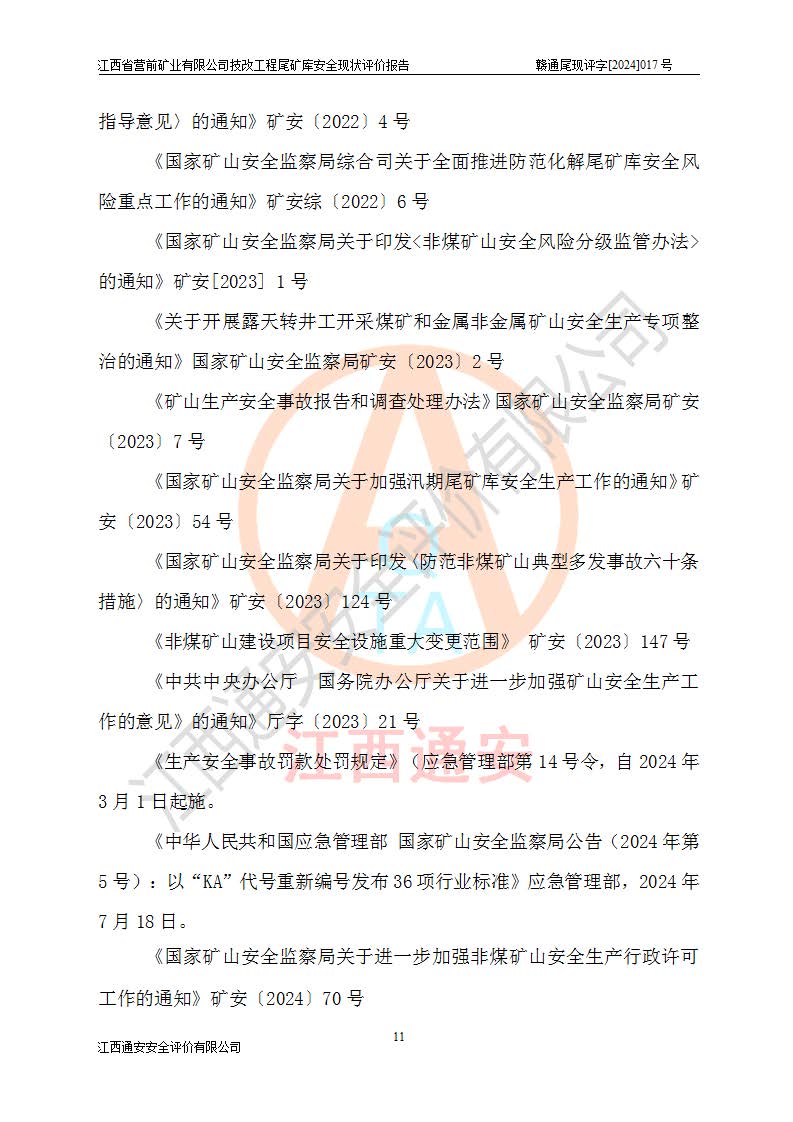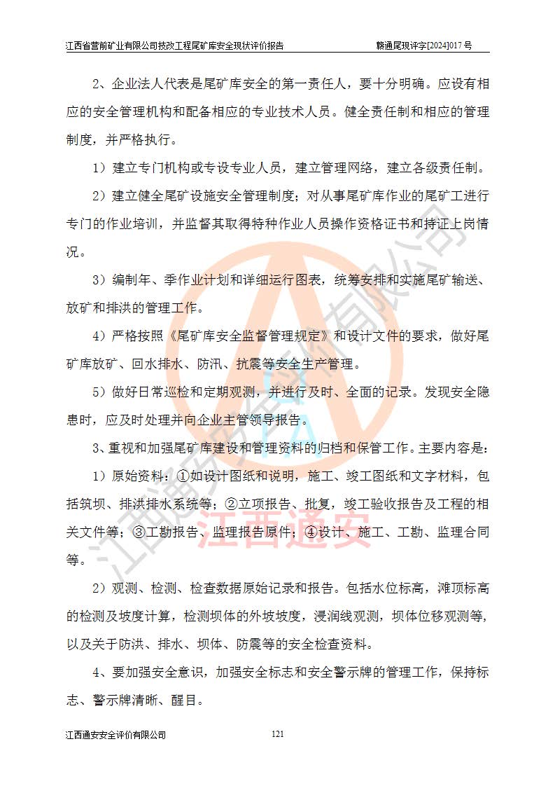 江西省營(yíng)前礦業(yè)有限公司于2003年12月16日成立,位于贛州市上猶縣營(yíng)前鎮(zhèn)焦里村境內(nèi),公司注冊(cè)資本10000萬(wàn)元,法定**人陳雅博,礦區(qū)地理坐標(biāo):東經(jīng)114°18′30″~114°19′00″,北緯25°52′35″~25°53′47″。公司經(jīng)營(yíng)范圍包括:鉛礦、鋅、鎢、銀地下開(kāi)采、銷(xiāo)售。 江西省營(yíng)前礦業(yè)有限公司技改工程尾礦庫(kù)位于焦里鎢銀鉛鋅礦區(qū),處于上猶縣水巖鄉(xiāng)井子村坑尾自然村境內(nèi),山谷型尾礦庫(kù),溝谷呈“V”字形展布,技改工程尾礦庫(kù)原由福建省冶金工業(yè)設(shè)計(jì)院設(shè)計(jì),后由金建工程設(shè)計(jì)有限公司對(duì)該尾礦庫(kù)進(jìn)行了加高擴(kuò)容設(shè)計(jì),加高擴(kuò)容后總庫(kù)容503.14萬(wàn)m3,壩高75.0m,為三等庫(kù)。尾礦庫(kù)主要由尾礦壩、庫(kù)外分洪系統(tǒng)(1#攔洪壩--1#分洪隧洞和2#攔洪壩--2#分洪隧洞--排水陡槽--消力池),庫(kù)內(nèi)排洪排水系統(tǒng)(排水斜槽—連接井—排水涵洞—排水隧洞—排水陡槽—消力池)等組成,尾礦壩壩型為初期壩+上游式堆積壩。 江西省營(yíng)前礦業(yè)有限公司技改工程尾礦庫(kù)于2021年12月30日取得江西省應(yīng)急管理廳版發(fā)的安全生產(chǎn)許可證,證書(shū)編號(hào)(贛)FM安許證字(2016)M1692號(hào),有限期從2022年1月18日到2025年1月17日,為三年期。依照《非煤礦礦山企業(yè)安全生產(chǎn)許可證延期換證工作》的通知,根據(jù)***《安全生產(chǎn)許可證條例》、《江西省安全生產(chǎn)條例》、《非煤礦山安全生產(chǎn)許可證實(shí)施辦法》、《江西省非煤礦礦山企業(yè)安全生產(chǎn)許可證辦法》規(guī)定的要求,受江西省營(yíng)前礦業(yè)有限公司委托,我公司承擔(dān)了技改工程尾礦庫(kù)延期換證安全現(xiàn)狀評(píng)價(jià)工作。 |