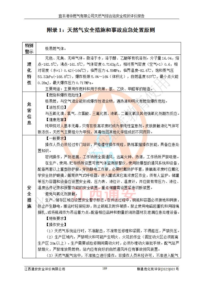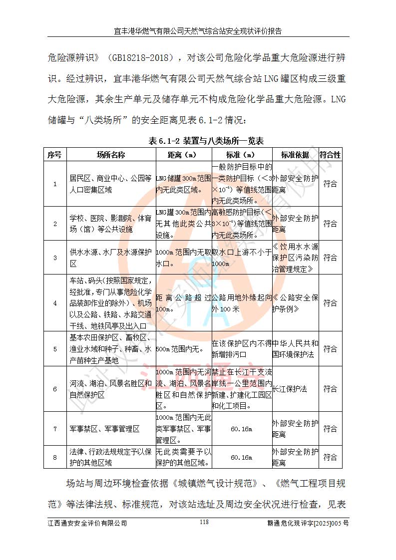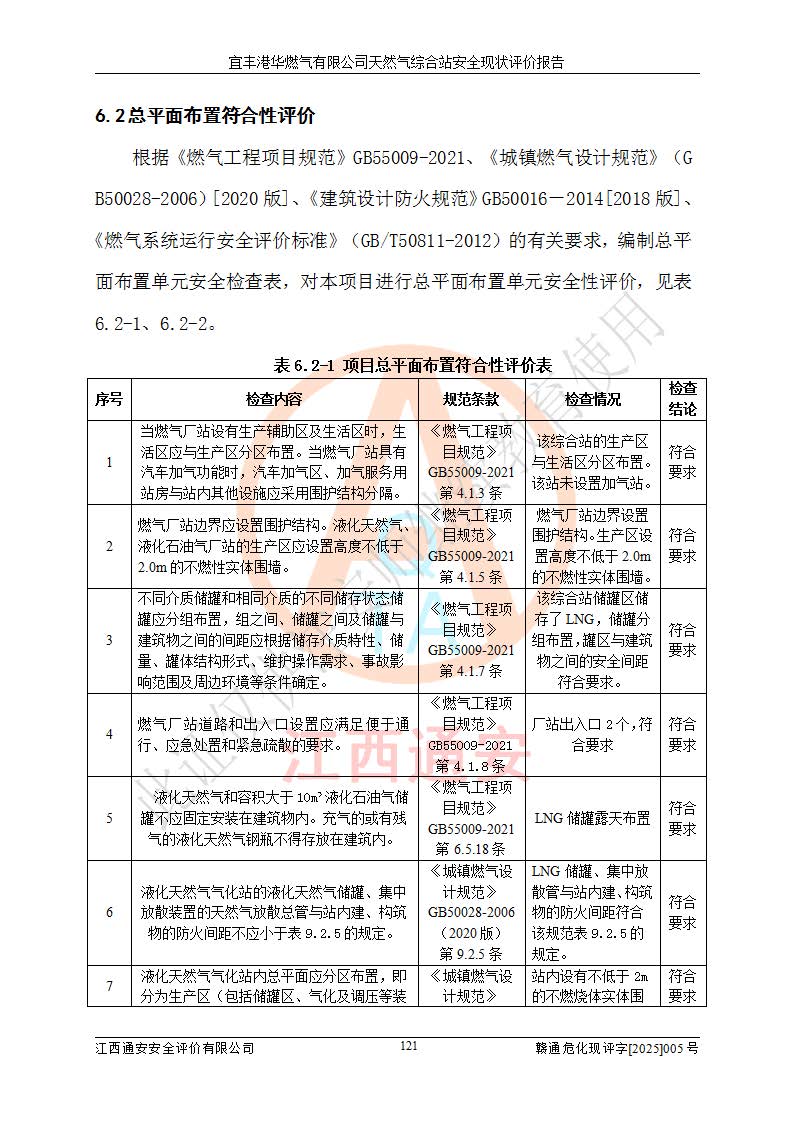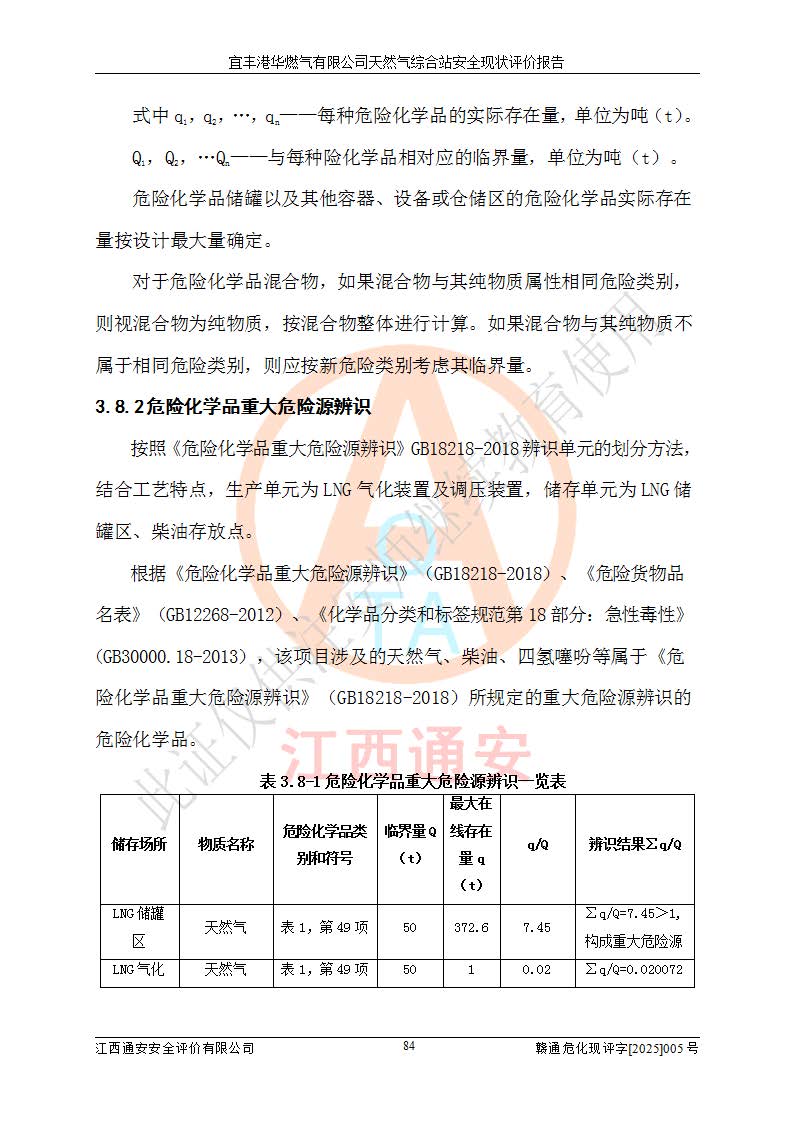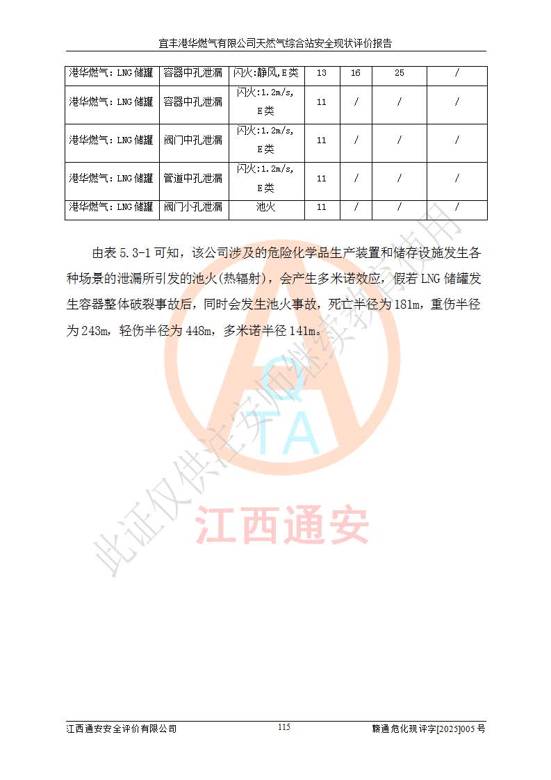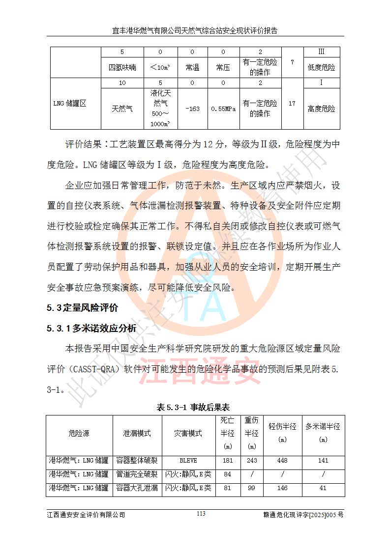 1、主要危險、危害因素辨識結(jié)果 宜豐港華燃氣有限公司天然氣綜合站在生產(chǎn)經(jīng)營過程中存在的主要危險有:火災(zāi)與爆炸、中毒窒息、觸電、機械傷害、物體打擊、**傷害、高處墜落、灼燙、低溫凍傷、容器爆炸、淹溺等,存在的主要危害因素有:化學(xué)因素、物理因素(噪聲、高溫等)等,同時存在人為失誤和管理缺陷。應(yīng)重點防范的主要危險為火災(zāi)與爆炸、容器爆炸。 2、危險化學(xué)品辨識結(jié)果 經(jīng)辨識,該儲配站涉及的天然氣、四氫噻吩及柴油屬于危險化學(xué)品,天然氣屬于重點監(jiān)管的危險化學(xué)品和特別管控危險化學(xué)品,不涉及監(jiān)控化學(xué)品、易制毒化學(xué)品、易制爆危險化學(xué)品、劇毒化學(xué)品和高毒物品等危險化學(xué)品。 3、危險化學(xué)品重大危險源辨識結(jié)果 根據(jù)《危險化學(xué)品重大危險源辨識》(GB18218-2018)和《危險化學(xué)品重大危險源監(jiān)督管理暫行規(guī)定》(2011)(40號令)(2015年 **安監(jiān)總局令第79號修訂)得出結(jié)論如下:該公司LNG儲罐區(qū)構(gòu)成三級重大危險源,其余生產(chǎn)單元及儲存單元不構(gòu)成危險化學(xué)品重大危險源。 4、重點監(jiān)管危險化工工藝辨識結(jié)果 根據(jù)《**安全監(jiān)管總局關(guān)于公布首批重點監(jiān)管的危險化學(xué)品名錄的通知》安監(jiān)總管三[2011]95號、《**安全監(jiān)管總局關(guān)于公布第二批重點監(jiān)管危險化學(xué)品名錄的通知》安監(jiān)總管三[2013]12號進行辨識,該天然氣儲配站不涉及重點監(jiān)管的危險化工工藝。 5、作業(yè)條件危險性分析結(jié)果: 液化天然氣的儲罐區(qū)、調(diào)壓計量氣化加臭區(qū)、卸車區(qū)、變配電、廠內(nèi)運輸、消防水池作業(yè)等單元。等單元危險程度均為“一般危險,需要注意”或“稍有危險,可以接受”級別。作業(yè)條件相對安全。 6、危險度評價結(jié)果:工藝裝置區(qū)等級為Ⅱ級,危險程度為中度危險。LNG儲罐區(qū)等級為Ⅰ級,危險程度為**危險。 7、事故后果預(yù)測結(jié)果:本報告采用中國安全生產(chǎn)科學(xué)研究院研發(fā)的重大危險源區(qū)域定量風(fēng)險評價(CASST-QRA)軟件對可能發(fā)生的危險化學(xué)品事故進行預(yù)測,宜豐港華燃氣有限公司天然氣綜合站LNG儲罐容器整體破裂,發(fā)生BLEVE災(zāi)害模式后果*大,*大死亡半徑為181m,重傷半徑為243m,輕傷半徑為448m。 8、多米諾效應(yīng)分析結(jié)果:該公司LNG儲罐發(fā)生容器整體破裂引發(fā)的BLEVE事故的多米諾半徑*大,為141m。 9、采用安全檢查表評價法對該儲配站周邊環(huán)境、總平面布置、站內(nèi)建構(gòu)筑物防火間距、站內(nèi)交通、LNG卸車、儲罐、氣化裝置、加臭裝置、調(diào)壓裝置、安全附件、工藝設(shè)備、管道、自動化控制等供配電、給排水、消防設(shè)施、供熱裝置、安全管理、“兩重點一重大”安全措施及安全管理進行定性評價,不符合項共2項,其他均符合**法律、法規(guī)、標準、規(guī)范的要求。 (1)企業(yè)對不符合項整改完成后,安全條件符合燃氣儲存經(jīng)營的安全要求。 (2)該儲配站涉及“兩重點一重大”,采取了首批重點監(jiān)管的危險化學(xué)品安全措施和應(yīng)急處置措施,站內(nèi)LNG罐區(qū)構(gòu)成三級重大危險源,采取的重大危險源安全技術(shù)和監(jiān)控措施符合相關(guān)要求。 (3)根據(jù)《燃氣經(jīng)營許可管理辦法》(建城〔2014〕167號發(fā)布,建城規(guī)〔2019〕2號修改)制成安全檢查表對該單位的經(jīng)營條件逐一檢查,檢查結(jié)果符合要求。 (4)根據(jù)《住房城鄉(xiāng)建設(shè)部關(guān)于印發(fā)《城鎮(zhèn)燃氣經(jīng)營安全重大隱患判定標準》的通知》(建城規(guī)[2023]4號)要求,對該項目重大隱患情況進行檢查,該站LNG罐完成整改后不涉及重大隱患。 評價結(jié)論 綜上所述,宜豐港華燃氣有限公司天然氣綜合站選址和總平面布置合理,建構(gòu)筑物間的防火間距、耐火等級等符合標準規(guī)范的要求,LNG卸車、儲存、加臭、氣化調(diào)壓計量等裝置采用成熟的工藝和設(shè)備,本質(zhì)安全程度較高;公司制定了安全管理制度和操作規(guī)程,人員經(jīng)培訓(xùn)合格后上崗,主要負責(zé)人、安全管理人員及特種作業(yè)人員均取得了相應(yīng)的考核合格資格證書,能按照法律法規(guī)要求開展安全生產(chǎn)管理工作。公司對現(xiàn)場存在事故危險的設(shè)施和場所采取了合理可行的防護措施和科學(xué)的管理,使生產(chǎn)過程中的危險有害因素能得到**控制。該項目安全設(shè)施符合**現(xiàn)行有關(guān)法律、法規(guī)、標準的要求。企業(yè)對現(xiàn)場存在的安全問題進行了整改,主要的安全缺陷消除。 綜合結(jié)論:宜豐港華燃氣有限公司天然氣綜合站的安全條件符合燃氣安全運行要求。 |