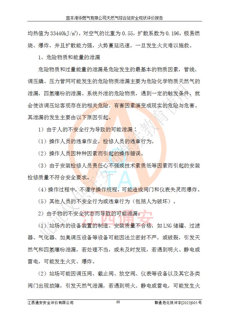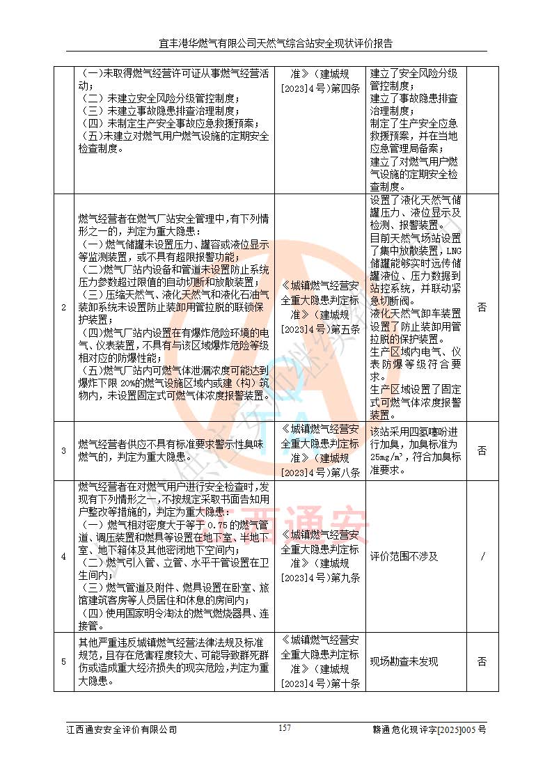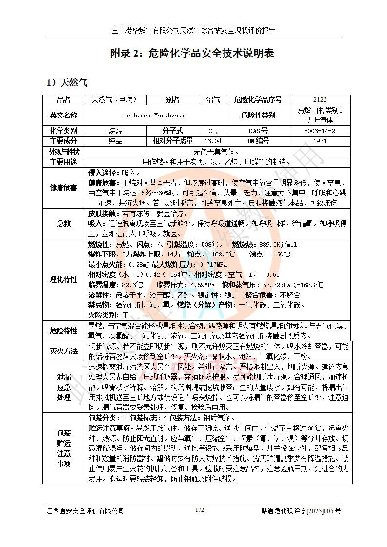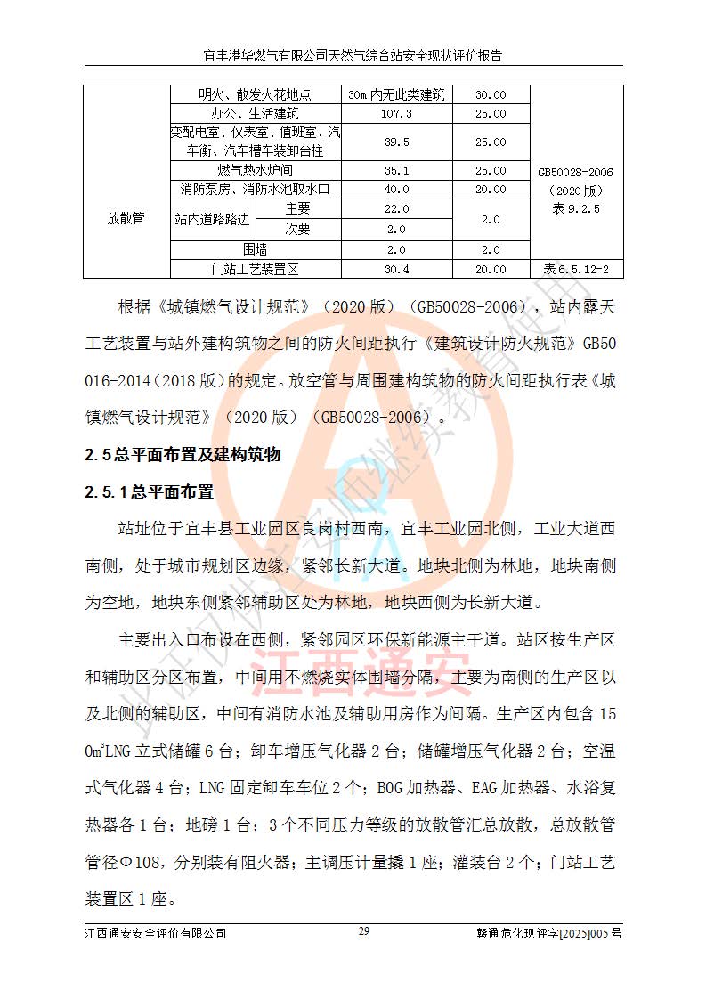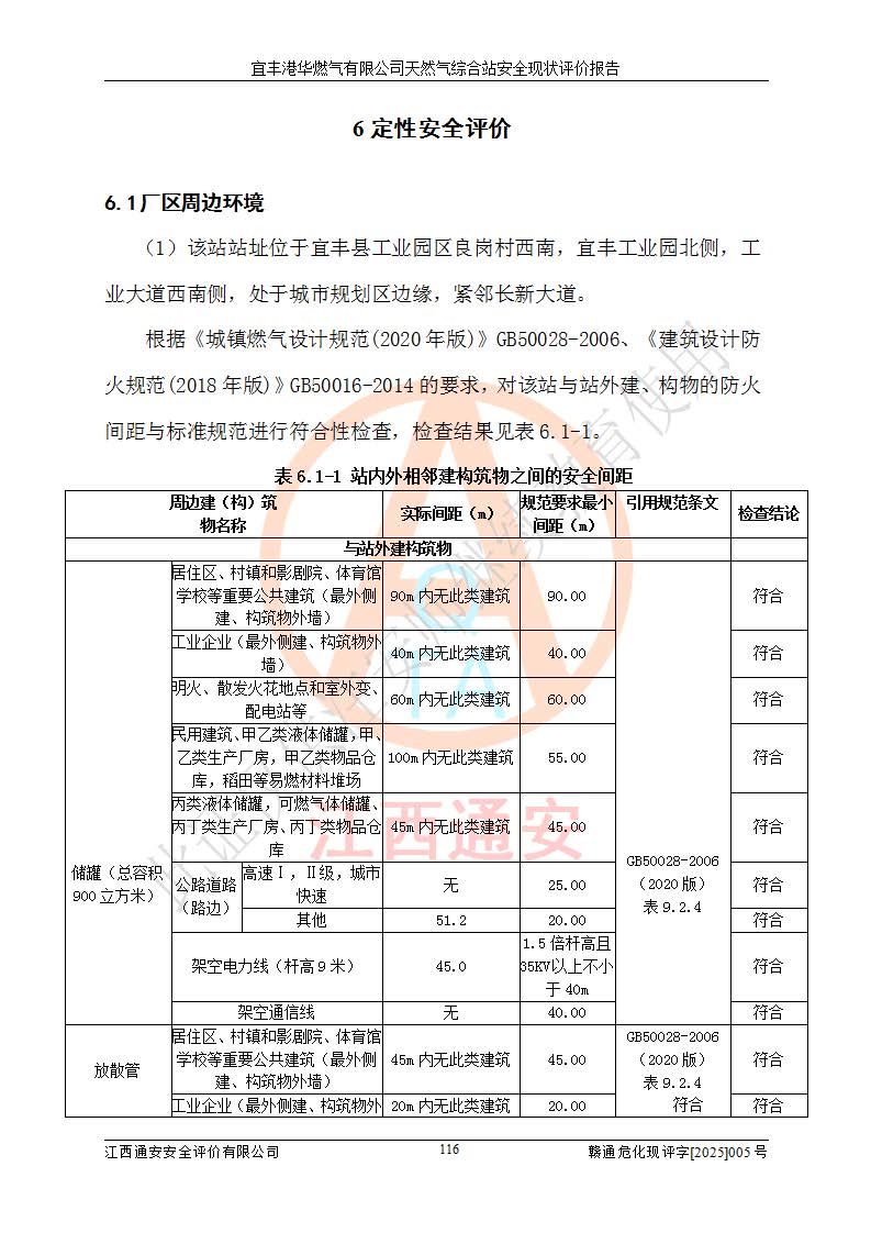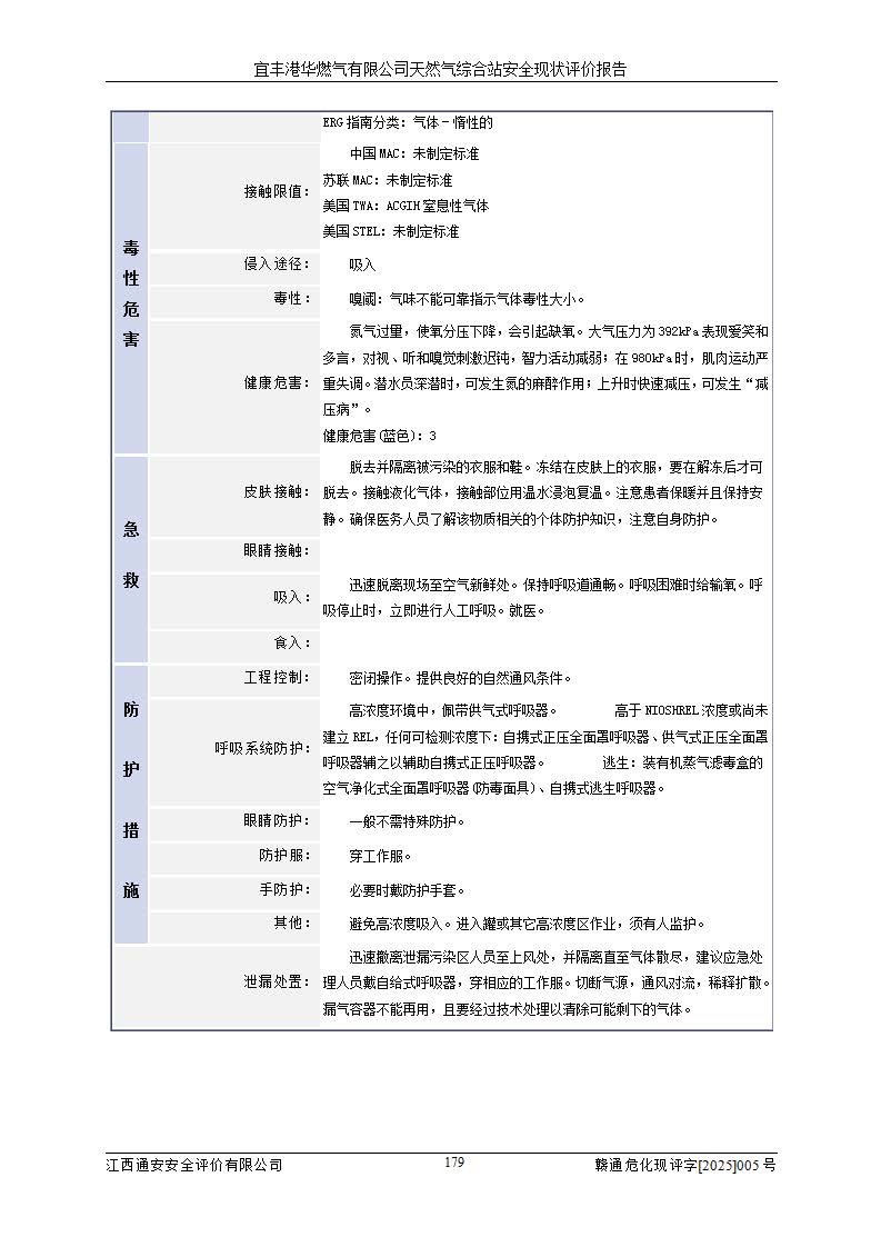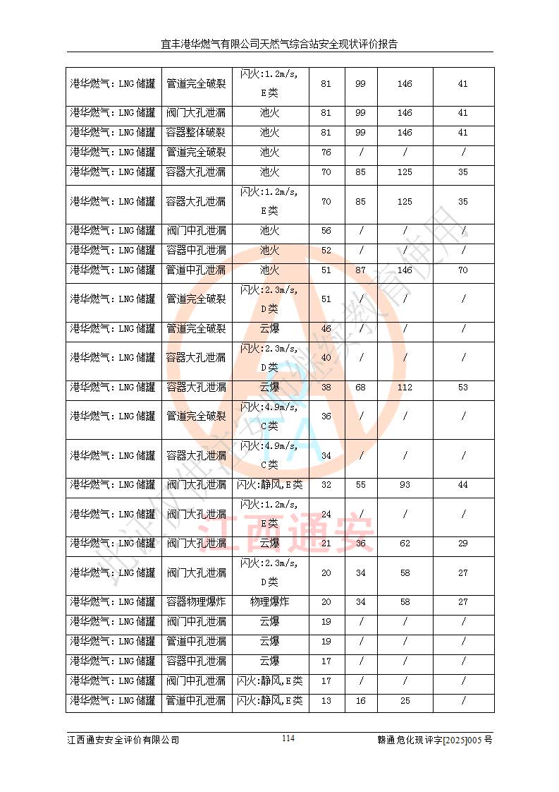 1、主要危險、危害因素辨識結(jié)果 宜豐港華燃氣有限公司天然氣綜合站在生產(chǎn)經(jīng)營過程中存在的主要危險有:火災(zāi)與爆炸、中毒窒息、觸電、機械傷害、物體打擊、**傷害、高處墜落、灼燙、低溫凍傷、容器爆炸、淹溺等,存在的主要危害因素有:化學(xué)因素、物理因素(噪聲、高溫等)等,同時存在人為失誤和管理缺陷。應(yīng)重點防范的主要危險為火災(zāi)與爆炸、容器爆炸。 2、危險化學(xué)品辨識結(jié)果 經(jīng)辨識,該儲配站涉及的天然氣、四氫噻吩及柴油屬于危險化學(xué)品,天然氣屬于重點監(jiān)管的危險化學(xué)品和特別管控危險化學(xué)品,不涉及監(jiān)控化學(xué)品、易制毒化學(xué)品、易制爆危險化學(xué)品、劇毒化學(xué)品和高毒物品等危險化學(xué)品。 3、危險化學(xué)品重大危險源辨識結(jié)果 根據(jù)《危險化學(xué)品重大危險源辨識》(GB18218-2018)和《危險化學(xué)品重大危險源監(jiān)督管理暫行規(guī)定》(2011)(40號令)(2015年 **安監(jiān)總局令第79號修訂)得出結(jié)論如下:該公司LNG儲罐區(qū)構(gòu)成三級重大危險源,其余生產(chǎn)單元及儲存單元不構(gòu)成危險化學(xué)品重大危險源。 4、重點監(jiān)管危險化工工藝辨識結(jié)果 根據(jù)《**安全監(jiān)管總局關(guān)于公布首批重點監(jiān)管的危險化學(xué)品名錄的通知》安監(jiān)總管三[2011]95號、《**安全監(jiān)管總局關(guān)于公布第二批重點監(jiān)管危險化學(xué)品名錄的通知》安監(jiān)總管三[2013]12號進行辨識,該天然氣儲配站不涉及重點監(jiān)管的危險化工工藝。 5、作業(yè)條件危險性分析結(jié)果: 液化天然氣的儲罐區(qū)、調(diào)壓計量氣化加臭區(qū)、卸車區(qū)、變配電、廠內(nèi)運輸、消防水池作業(yè)等單元。等單元危險程度均為“一般危險,需要注意”或“稍有危險,可以接受”級別。作業(yè)條件相對安全。 6、危險度評價結(jié)果:工藝裝置區(qū)等級為Ⅱ級,危險程度為中度危險。LNG儲罐區(qū)等級為Ⅰ級,危險程度為**危險。 7、事故后果預(yù)測結(jié)果:本報告采用中國安全生產(chǎn)科學(xué)研究院研發(fā)的重大危險源區(qū)域定量風(fēng)險評價(CASST-QRA)軟件對可能發(fā)生的危險化學(xué)品事故進行預(yù)測,宜豐港華燃氣有限公司天然氣綜合站LNG儲罐容器整體破裂,發(fā)生BLEVE災(zāi)害模式后果*大,*大死亡半徑為181m,重傷半徑為243m,輕傷半徑為448m。 8、多米諾效應(yīng)分析結(jié)果:該公司LNG儲罐發(fā)生容器整體破裂引發(fā)的BLEVE事故的多米諾半徑*大,為141m。 9、采用安全檢查表評價法對該儲配站周邊環(huán)境、總平面布置、站內(nèi)建構(gòu)筑物防火間距、站內(nèi)交通、LNG卸車、儲罐、氣化裝置、加臭裝置、調(diào)壓裝置、安全附件、工藝設(shè)備、管道、自動化控制等供配電、給排水、消防設(shè)施、供熱裝置、安全管理、“兩重點一重大”安全措施及安全管理進行定性評價,不符合項共2項,其他均符合**法律、法規(guī)、標準、規(guī)范的要求。 (1)企業(yè)對不符合項整改完成后,安全條件符合燃氣儲存經(jīng)營的安全要求。 (2)該儲配站涉及“兩重點一重大”,采取了首批重點監(jiān)管的危險化學(xué)品安全措施和應(yīng)急處置措施,站內(nèi)LNG罐區(qū)構(gòu)成三級重大危險源,采取的重大危險源安全技術(shù)和監(jiān)控措施符合相關(guān)要求。 (3)根據(jù)《燃氣經(jīng)營許可管理辦法》(建城〔2014〕167號發(fā)布,建城規(guī)〔2019〕2號修改)制成安全檢查表對該單位的經(jīng)營條件逐一檢查,檢查結(jié)果符合要求。 (4)根據(jù)《住房城鄉(xiāng)建設(shè)部關(guān)于印發(fā)《城鎮(zhèn)燃氣經(jīng)營安全重大隱患判定標準》的通知》(建城規(guī)[2023]4號)要求,對該項目重大隱患情況進行檢查,該站LNG罐完成整改后不涉及重大隱患。 評價結(jié)論 綜上所述,宜豐港華燃氣有限公司天然氣綜合站選址和總平面布置合理,建構(gòu)筑物間的防火間距、耐火等級等符合標準規(guī)范的要求,LNG卸車、儲存、加臭、氣化調(diào)壓計量等裝置采用成熟的工藝和設(shè)備,本質(zhì)安全程度較高;公司制定了安全管理制度和操作規(guī)程,人員經(jīng)培訓(xùn)合格后上崗,主要負責(zé)人、安全管理人員及特種作業(yè)人員均取得了相應(yīng)的考核合格資格證書,能按照法律法規(guī)要求開展安全生產(chǎn)管理工作。公司對現(xiàn)場存在事故危險的設(shè)施和場所采取了合理可行的防護措施和科學(xué)的管理,使生產(chǎn)過程中的危險有害因素能得到**控制。該項目安全設(shè)施符合**現(xiàn)行有關(guān)法律、法規(guī)、標準的要求。企業(yè)對現(xiàn)場存在的安全問題進行了整改,主要的安全缺陷消除。 綜合結(jié)論:宜豐港華燃氣有限公司天然氣綜合站的安全條件符合燃氣安全運行要求。 |