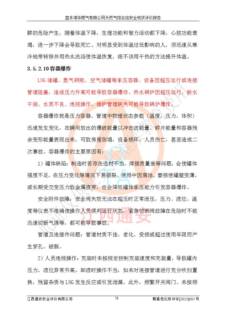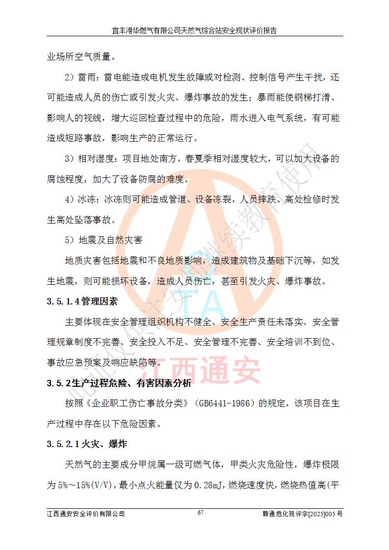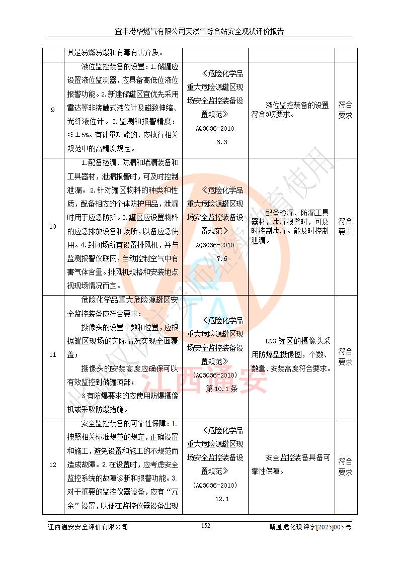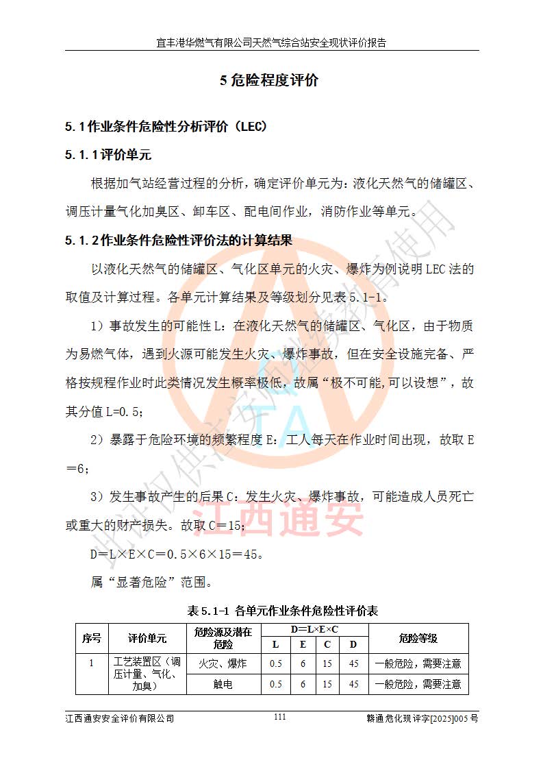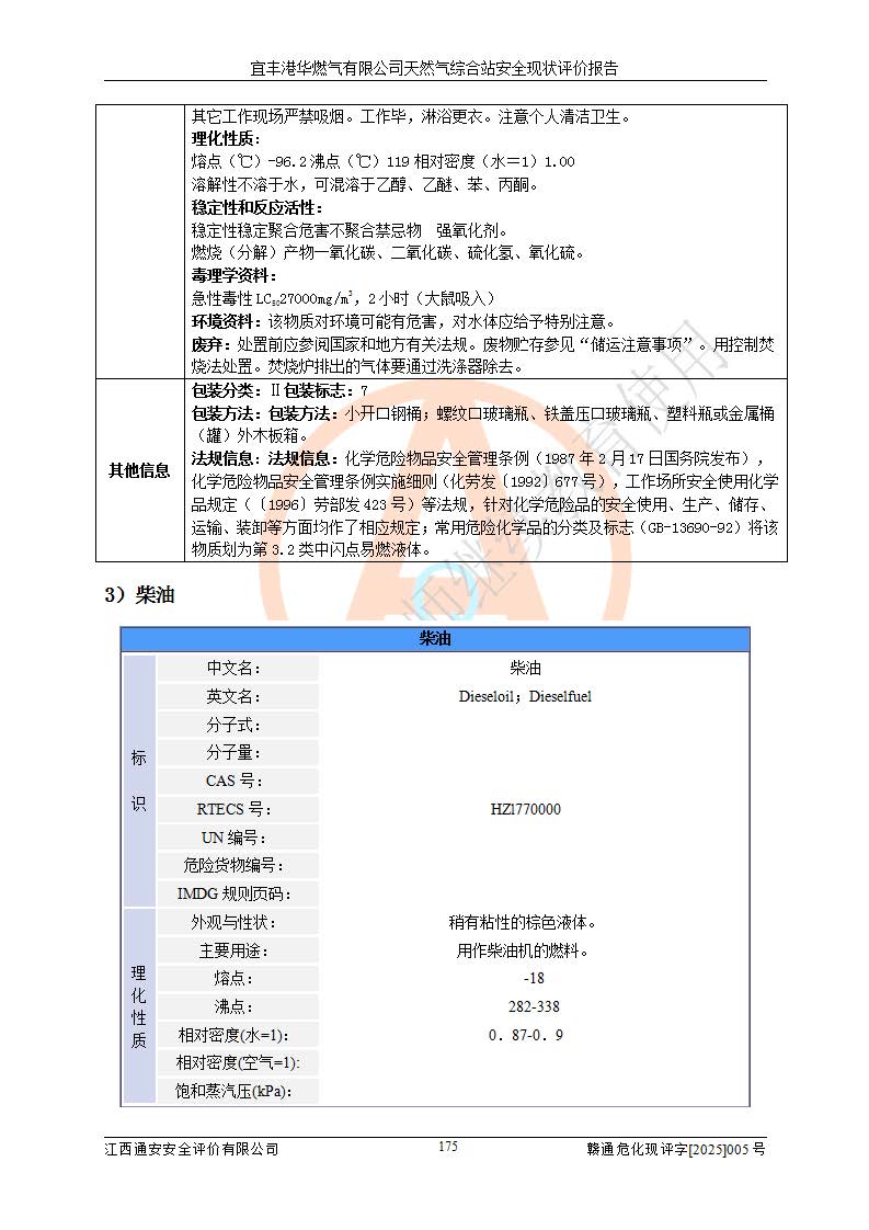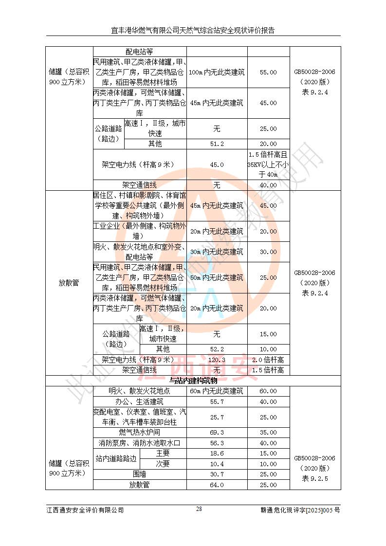 1、主要危險、危害因素辨識結(jié)果 宜豐港華燃氣有限公司天然氣綜合站在生產(chǎn)經(jīng)營過程中存在的主要危險有:火災(zāi)與爆炸、中毒窒息、觸電、機械傷害、物體打擊、**傷害、高處墜落、灼燙、低溫凍傷、容器爆炸、淹溺等,存在的主要危害因素有:化學(xué)因素、物理因素(噪聲、高溫等)等,同時存在人為失誤和管理缺陷。應(yīng)重點防范的主要危險為火災(zāi)與爆炸、容器爆炸。 2、危險化學(xué)品辨識結(jié)果 經(jīng)辨識,該儲配站涉及的天然氣、四氫噻吩及柴油屬于危險化學(xué)品,天然氣屬于重點監(jiān)管的危險化學(xué)品和特別管控危險化學(xué)品,不涉及監(jiān)控化學(xué)品、易制毒化學(xué)品、易制爆危險化學(xué)品、劇毒化學(xué)品和高毒物品等危險化學(xué)品。 3、危險化學(xué)品重大危險源辨識結(jié)果 根據(jù)《危險化學(xué)品重大危險源辨識》(GB18218-2018)和《危險化學(xué)品重大危險源監(jiān)督管理暫行規(guī)定》(2011)(40號令)(2015年 **安監(jiān)總局令第79號修訂)得出結(jié)論如下:該公司LNG儲罐區(qū)構(gòu)成三級重大危險源,其余生產(chǎn)單元及儲存單元不構(gòu)成危險化學(xué)品重大危險源。 4、重點監(jiān)管危險化工工藝辨識結(jié)果 根據(jù)《**安全監(jiān)管總局關(guān)于公布首批重點監(jiān)管的危險化學(xué)品名錄的通知》安監(jiān)總管三[2011]95號、《**安全監(jiān)管總局關(guān)于公布第二批重點監(jiān)管危險化學(xué)品名錄的通知》安監(jiān)總管三[2013]12號進行辨識,該天然氣儲配站不涉及重點監(jiān)管的危險化工工藝。 5、作業(yè)條件危險性分析結(jié)果: 液化天然氣的儲罐區(qū)、調(diào)壓計量氣化加臭區(qū)、卸車區(qū)、變配電、廠內(nèi)運輸、消防水池作業(yè)等單元。等單元危險程度均為“一般危險,需要注意”或“稍有危險,可以接受”級別。作業(yè)條件相對安全。 6、危險度評價結(jié)果:工藝裝置區(qū)等級為Ⅱ級,危險程度為中度危險。LNG儲罐區(qū)等級為Ⅰ級,危險程度為**危險。 7、事故后果預(yù)測結(jié)果:本報告采用中國安全生產(chǎn)科學(xué)研究院研發(fā)的重大危險源區(qū)域定量風(fēng)險評價(CASST-QRA)軟件對可能發(fā)生的危險化學(xué)品事故進行預(yù)測,宜豐港華燃氣有限公司天然氣綜合站LNG儲罐容器整體破裂,發(fā)生BLEVE災(zāi)害模式后果*大,*大死亡半徑為181m,重傷半徑為243m,輕傷半徑為448m。 8、多米諾效應(yīng)分析結(jié)果:該公司LNG儲罐發(fā)生容器整體破裂引發(fā)的BLEVE事故的多米諾半徑*大,為141m。 9、采用安全檢查表評價法對該儲配站周邊環(huán)境、總平面布置、站內(nèi)建構(gòu)筑物防火間距、站內(nèi)交通、LNG卸車、儲罐、氣化裝置、加臭裝置、調(diào)壓裝置、安全附件、工藝設(shè)備、管道、自動化控制等供配電、給排水、消防設(shè)施、供熱裝置、安全管理、“兩重點一重大”安全措施及安全管理進行定性評價,不符合項共2項,其他均符合**法律、法規(guī)、標準、規(guī)范的要求。 (1)企業(yè)對不符合項整改完成后,安全條件符合燃氣儲存經(jīng)營的安全要求。 (2)該儲配站涉及“兩重點一重大”,采取了首批重點監(jiān)管的危險化學(xué)品安全措施和應(yīng)急處置措施,站內(nèi)LNG罐區(qū)構(gòu)成三級重大危險源,采取的重大危險源安全技術(shù)和監(jiān)控措施符合相關(guān)要求。 (3)根據(jù)《燃氣經(jīng)營許可管理辦法》(建城〔2014〕167號發(fā)布,建城規(guī)〔2019〕2號修改)制成安全檢查表對該單位的經(jīng)營條件逐一檢查,檢查結(jié)果符合要求。 (4)根據(jù)《住房城鄉(xiāng)建設(shè)部關(guān)于印發(fā)《城鎮(zhèn)燃氣經(jīng)營安全重大隱患判定標準》的通知》(建城規(guī)[2023]4號)要求,對該項目重大隱患情況進行檢查,該站LNG罐完成整改后不涉及重大隱患。 評價結(jié)論 綜上所述,宜豐港華燃氣有限公司天然氣綜合站選址和總平面布置合理,建構(gòu)筑物間的防火間距、耐火等級等符合標準規(guī)范的要求,LNG卸車、儲存、加臭、氣化調(diào)壓計量等裝置采用成熟的工藝和設(shè)備,本質(zhì)安全程度較高;公司制定了安全管理制度和操作規(guī)程,人員經(jīng)培訓(xùn)合格后上崗,主要負責(zé)人、安全管理人員及特種作業(yè)人員均取得了相應(yīng)的考核合格資格證書,能按照法律法規(guī)要求開展安全生產(chǎn)管理工作。公司對現(xiàn)場存在事故危險的設(shè)施和場所采取了合理可行的防護措施和科學(xué)的管理,使生產(chǎn)過程中的危險有害因素能得到**控制。該項目安全設(shè)施符合**現(xiàn)行有關(guān)法律、法規(guī)、標準的要求。企業(yè)對現(xiàn)場存在的安全問題進行了整改,主要的安全缺陷消除。 綜合結(jié)論:宜豐港華燃氣有限公司天然氣綜合站的安全條件符合燃氣安全運行要求。 |