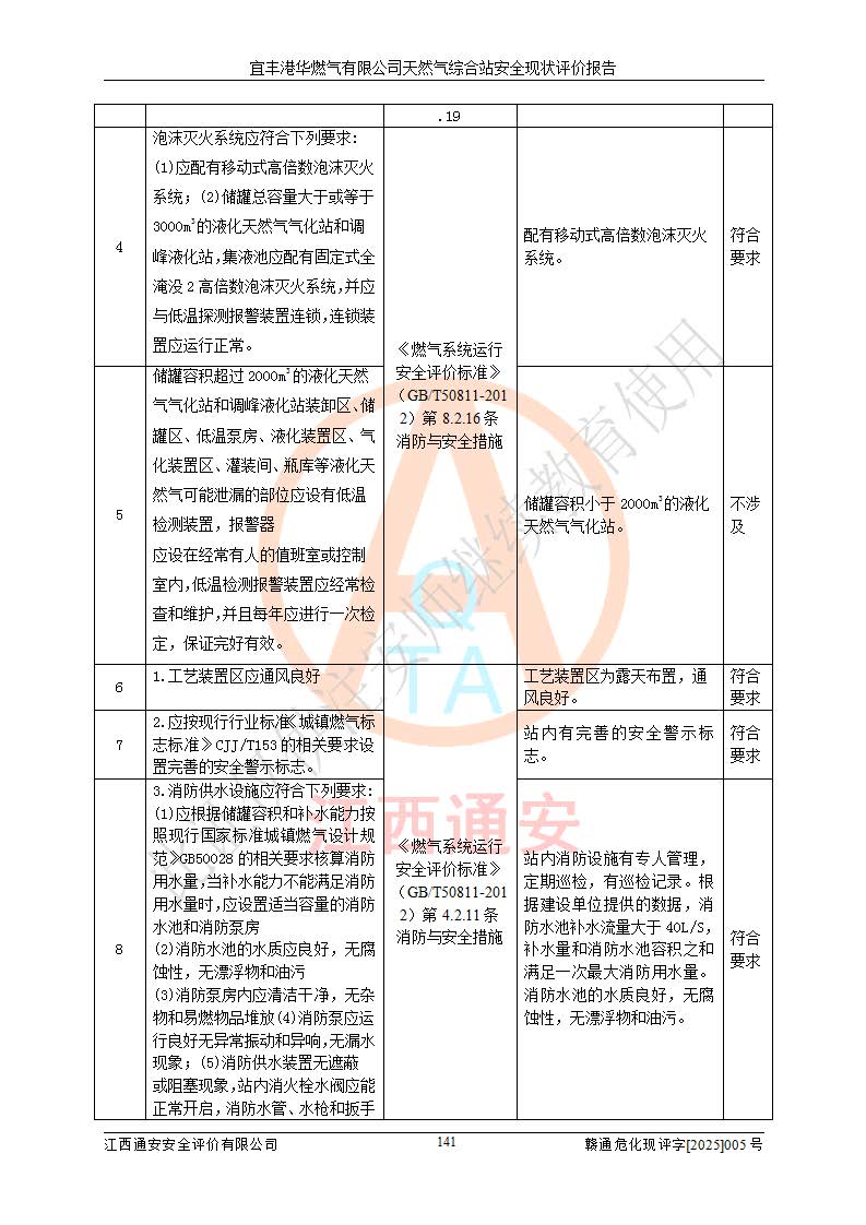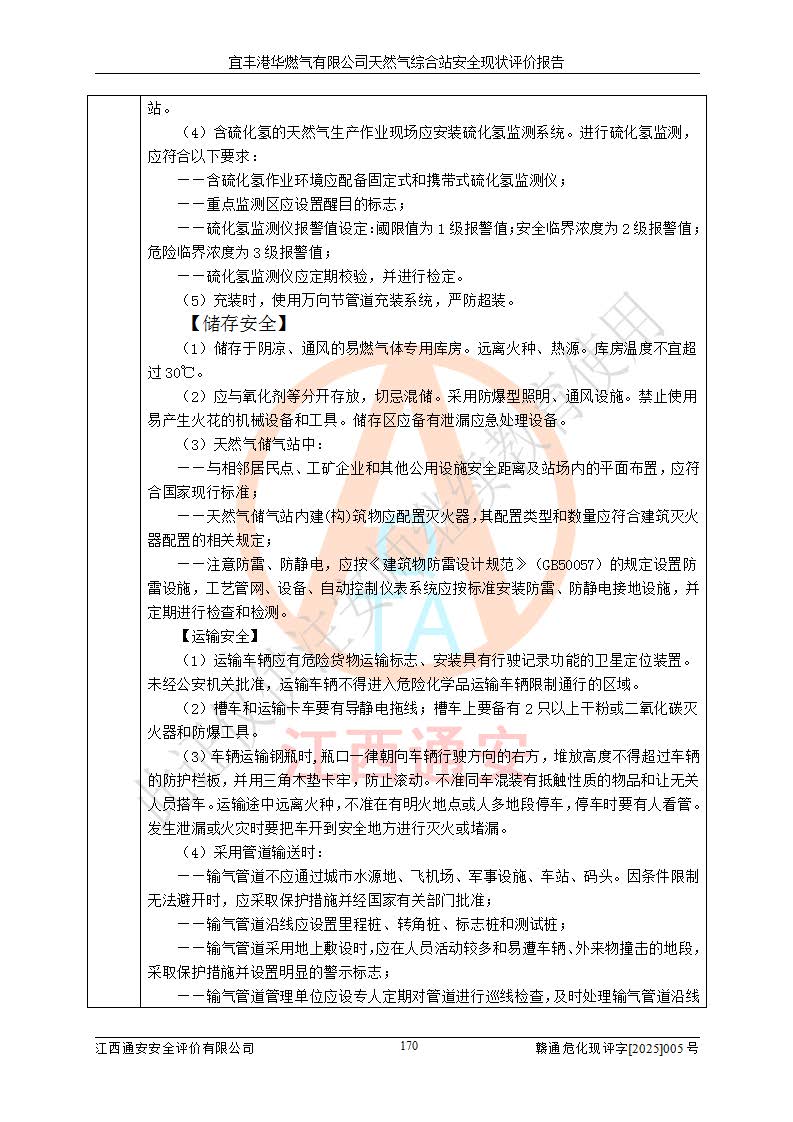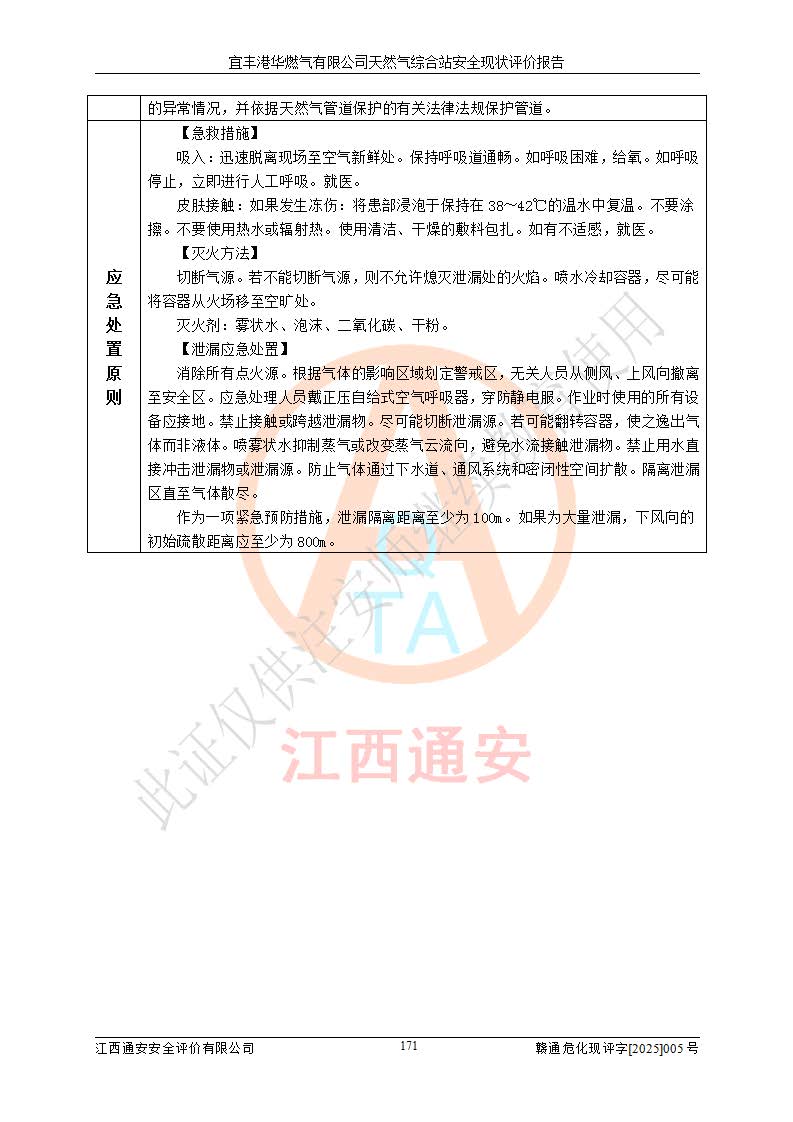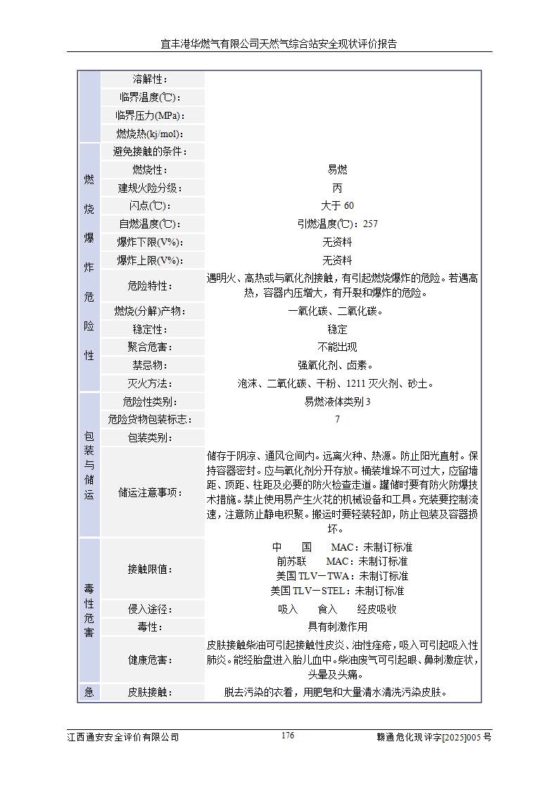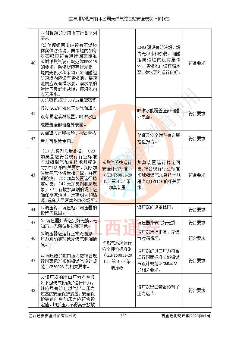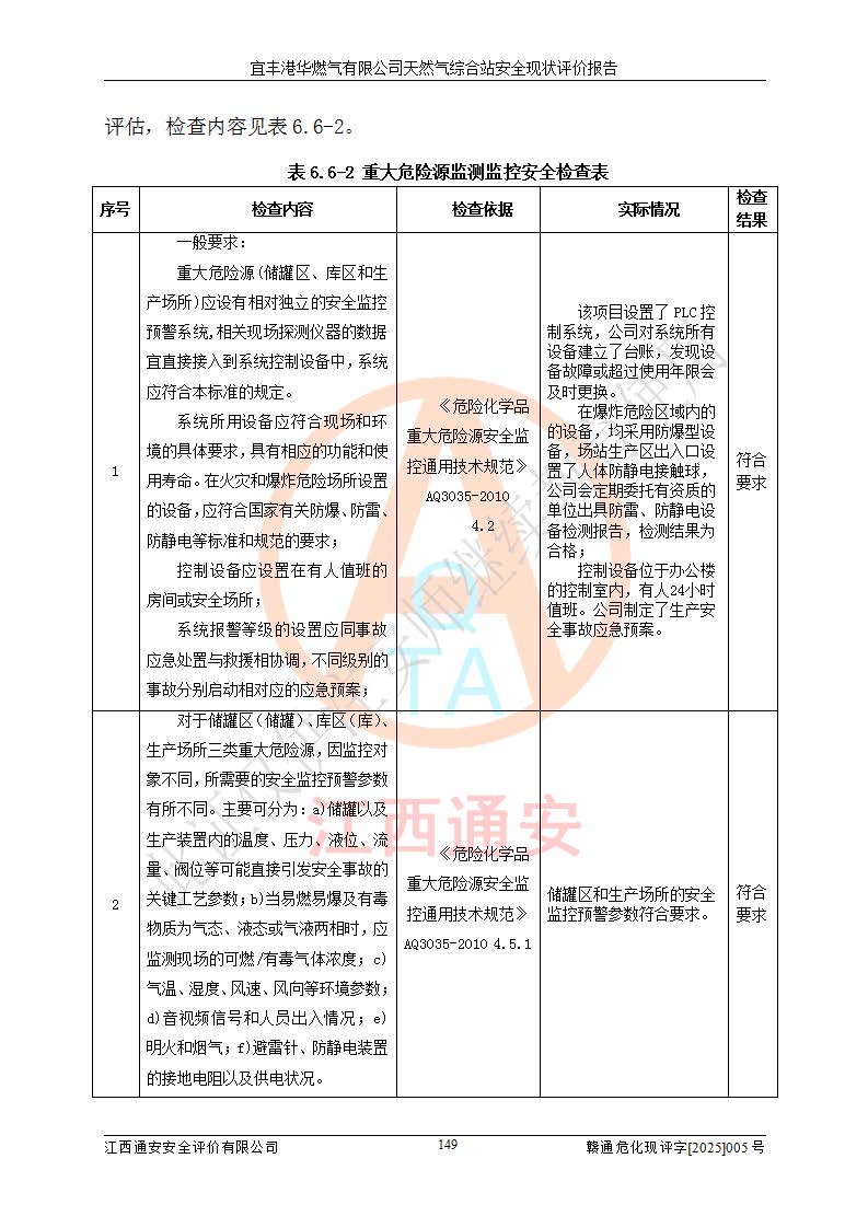 1、主要危險、危害因素辨識結(jié)果 宜豐港華燃氣有限公司天然氣綜合站在生產(chǎn)經(jīng)營過程中存在的主要危險有:火災(zāi)與爆炸、中毒窒息、觸電、機械傷害、物體打擊、**傷害、高處墜落、灼燙、低溫凍傷、容器爆炸、淹溺等,存在的主要危害因素有:化學(xué)因素、物理因素(噪聲、高溫等)等,同時存在人為失誤和管理缺陷。應(yīng)重點防范的主要危險為火災(zāi)與爆炸、容器爆炸。 2、危險化學(xué)品辨識結(jié)果 經(jīng)辨識,該儲配站涉及的天然氣、四氫噻吩及柴油屬于危險化學(xué)品,天然氣屬于重點監(jiān)管的危險化學(xué)品和特別管控危險化學(xué)品,不涉及監(jiān)控化學(xué)品、易制毒化學(xué)品、易制爆危險化學(xué)品、劇毒化學(xué)品和高毒物品等危險化學(xué)品。 3、危險化學(xué)品重大危險源辨識結(jié)果 根據(jù)《危險化學(xué)品重大危險源辨識》(GB18218-2018)和《危險化學(xué)品重大危險源監(jiān)督管理暫行規(guī)定》(2011)(40號令)(2015年 **安監(jiān)總局令第79號修訂)得出結(jié)論如下:該公司LNG儲罐區(qū)構(gòu)成三級重大危險源,其余生產(chǎn)單元及儲存單元不構(gòu)成危險化學(xué)品重大危險源。 4、重點監(jiān)管危險化工工藝辨識結(jié)果 根據(jù)《**安全監(jiān)管總局關(guān)于公布首批重點監(jiān)管的危險化學(xué)品名錄的通知》安監(jiān)總管三[2011]95號、《**安全監(jiān)管總局關(guān)于公布第二批重點監(jiān)管危險化學(xué)品名錄的通知》安監(jiān)總管三[2013]12號進行辨識,該天然氣儲配站不涉及重點監(jiān)管的危險化工工藝。 5、作業(yè)條件危險性分析結(jié)果: 液化天然氣的儲罐區(qū)、調(diào)壓計量氣化加臭區(qū)、卸車區(qū)、變配電、廠內(nèi)運輸、消防水池作業(yè)等單元。等單元危險程度均為“一般危險,需要注意”或“稍有危險,可以接受”級別。作業(yè)條件相對安全。 6、危險度評價結(jié)果:工藝裝置區(qū)等級為Ⅱ級,危險程度為中度危險。LNG儲罐區(qū)等級為Ⅰ級,危險程度為**危險。 7、事故后果預(yù)測結(jié)果:本報告采用中國安全生產(chǎn)科學(xué)研究院研發(fā)的重大危險源區(qū)域定量風(fēng)險評價(CASST-QRA)軟件對可能發(fā)生的危險化學(xué)品事故進行預(yù)測,宜豐港華燃氣有限公司天然氣綜合站LNG儲罐容器整體破裂,發(fā)生BLEVE災(zāi)害模式后果*大,*大死亡半徑為181m,重傷半徑為243m,輕傷半徑為448m。 8、多米諾效應(yīng)分析結(jié)果:該公司LNG儲罐發(fā)生容器整體破裂引發(fā)的BLEVE事故的多米諾半徑*大,為141m。 9、采用安全檢查表評價法對該儲配站周邊環(huán)境、總平面布置、站內(nèi)建構(gòu)筑物防火間距、站內(nèi)交通、LNG卸車、儲罐、氣化裝置、加臭裝置、調(diào)壓裝置、安全附件、工藝設(shè)備、管道、自動化控制等供配電、給排水、消防設(shè)施、供熱裝置、安全管理、“兩重點一重大”安全措施及安全管理進行定性評價,不符合項共2項,其他均符合**法律、法規(guī)、標準、規(guī)范的要求。 (1)企業(yè)對不符合項整改完成后,安全條件符合燃氣儲存經(jīng)營的安全要求。 (2)該儲配站涉及“兩重點一重大”,采取了首批重點監(jiān)管的危險化學(xué)品安全措施和應(yīng)急處置措施,站內(nèi)LNG罐區(qū)構(gòu)成三級重大危險源,采取的重大危險源安全技術(shù)和監(jiān)控措施符合相關(guān)要求。 (3)根據(jù)《燃氣經(jīng)營許可管理辦法》(建城〔2014〕167號發(fā)布,建城規(guī)〔2019〕2號修改)制成安全檢查表對該單位的經(jīng)營條件逐一檢查,檢查結(jié)果符合要求。 (4)根據(jù)《住房城鄉(xiāng)建設(shè)部關(guān)于印發(fā)《城鎮(zhèn)燃氣經(jīng)營安全重大隱患判定標準》的通知》(建城規(guī)[2023]4號)要求,對該項目重大隱患情況進行檢查,該站LNG罐完成整改后不涉及重大隱患。 評價結(jié)論 綜上所述,宜豐港華燃氣有限公司天然氣綜合站選址和總平面布置合理,建構(gòu)筑物間的防火間距、耐火等級等符合標準規(guī)范的要求,LNG卸車、儲存、加臭、氣化調(diào)壓計量等裝置采用成熟的工藝和設(shè)備,本質(zhì)安全程度較高;公司制定了安全管理制度和操作規(guī)程,人員經(jīng)培訓(xùn)合格后上崗,主要負責(zé)人、安全管理人員及特種作業(yè)人員均取得了相應(yīng)的考核合格資格證書,能按照法律法規(guī)要求開展安全生產(chǎn)管理工作。公司對現(xiàn)場存在事故危險的設(shè)施和場所采取了合理可行的防護措施和科學(xué)的管理,使生產(chǎn)過程中的危險有害因素能得到**控制。該項目安全設(shè)施符合**現(xiàn)行有關(guān)法律、法規(guī)、標準的要求。企業(yè)對現(xiàn)場存在的安全問題進行了整改,主要的安全缺陷消除。 綜合結(jié)論:宜豐港華燃氣有限公司天然氣綜合站的安全條件符合燃氣安全運行要求。 |