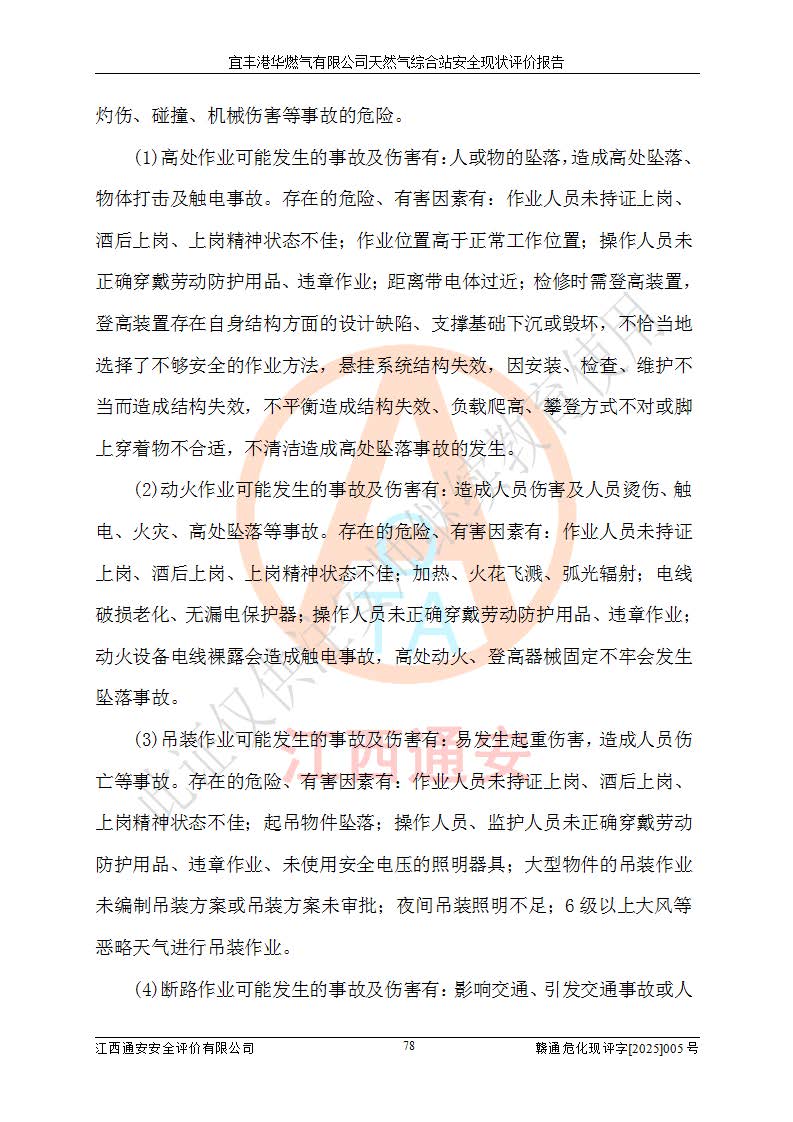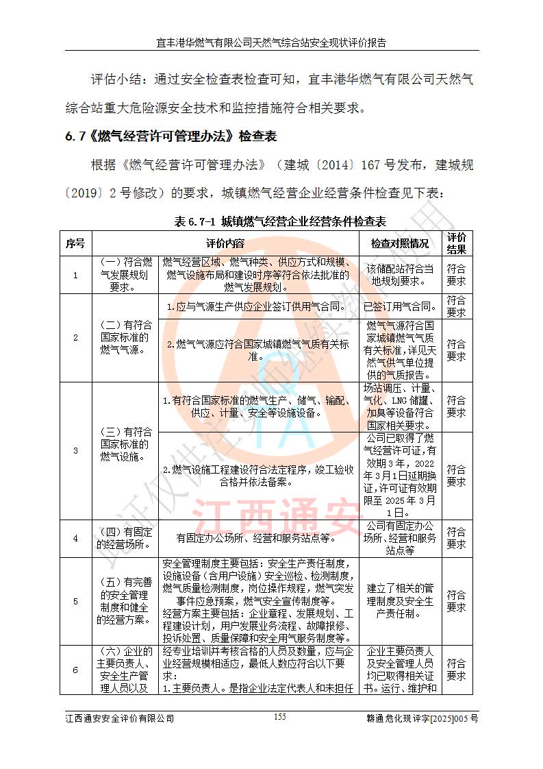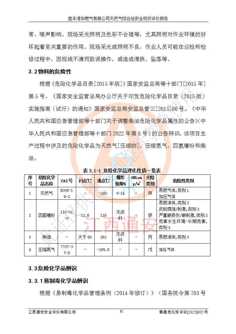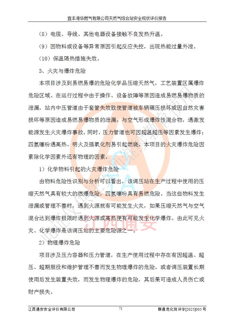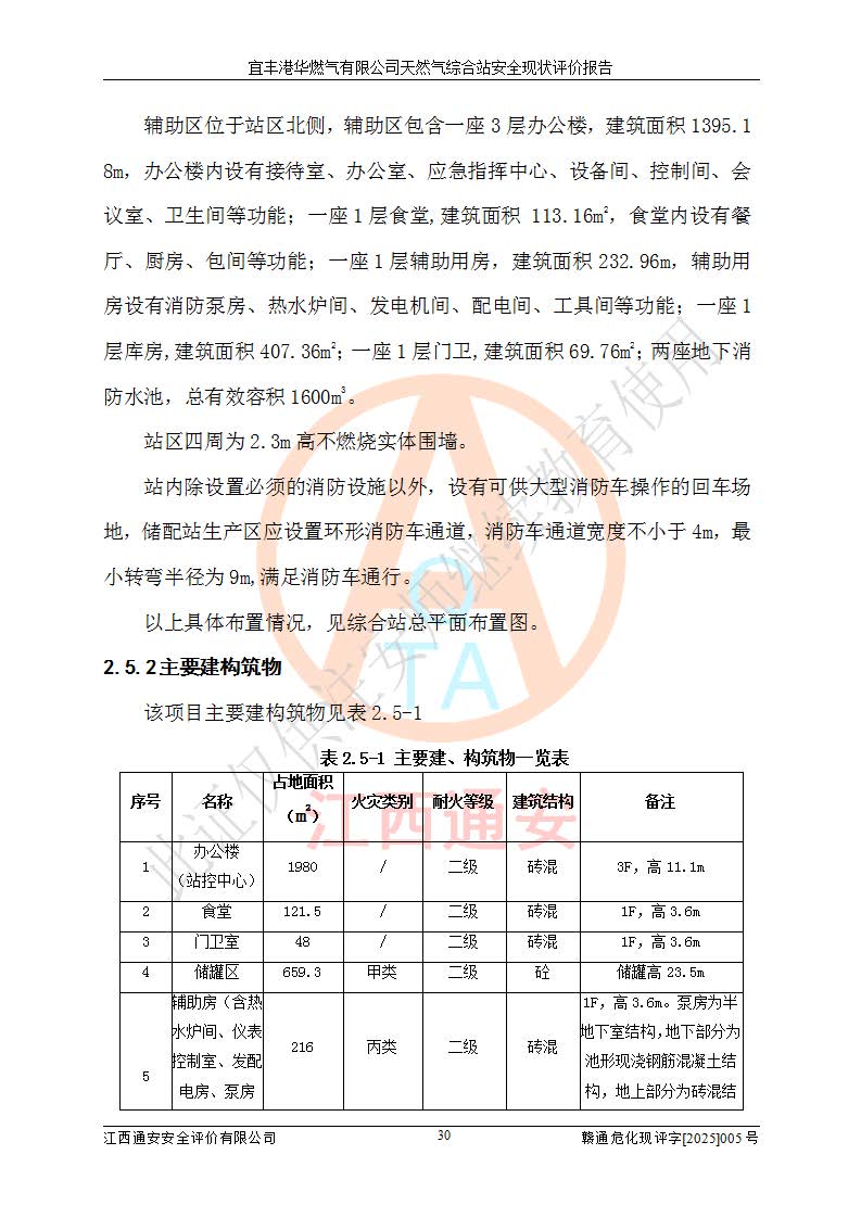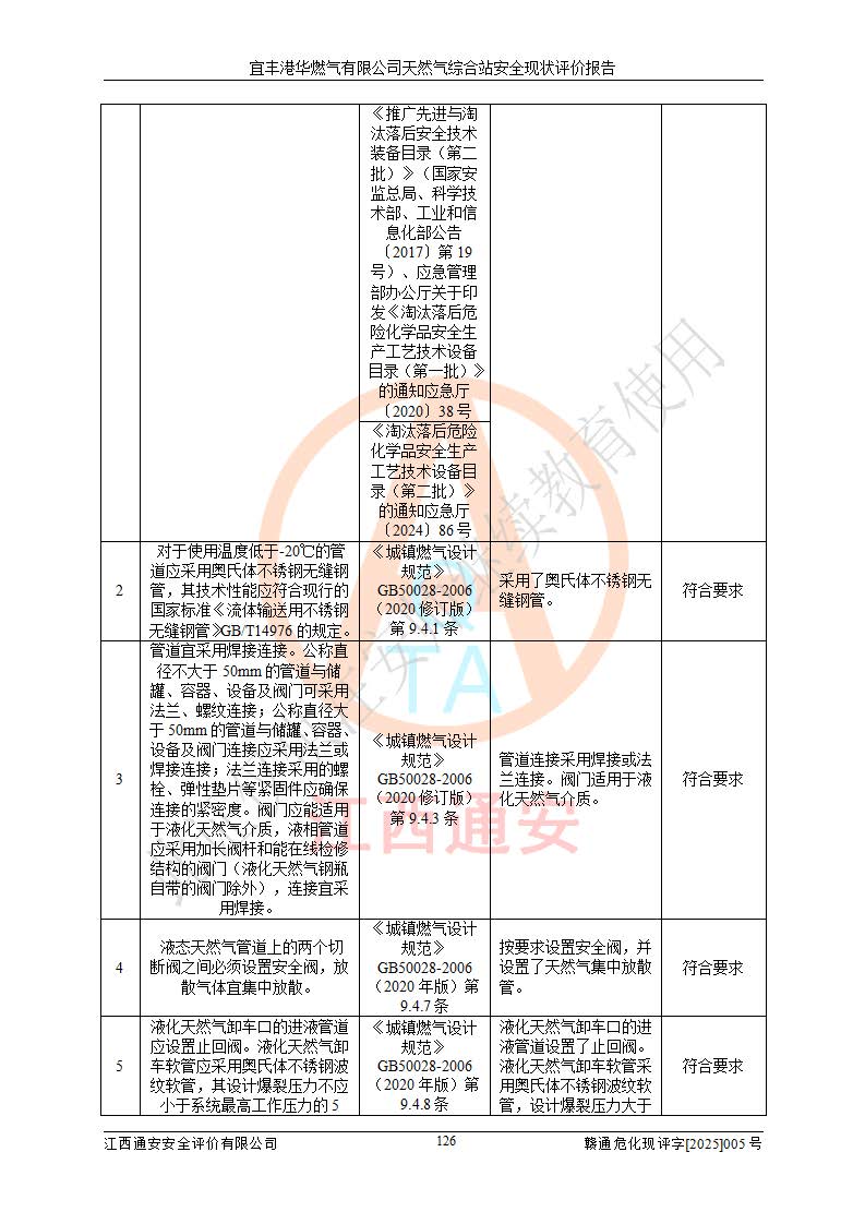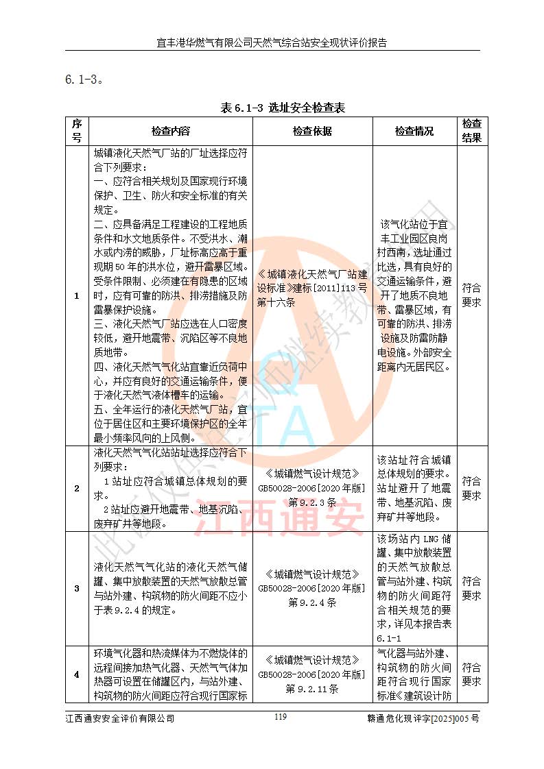 1、主要危險、危害因素辨識結(jié)果 宜豐港華燃氣有限公司天然氣綜合站在生產(chǎn)經(jīng)營過程中存在的主要危險有:火災(zāi)與爆炸、中毒窒息、觸電、機械傷害、物體打擊、**傷害、高處墜落、灼燙、低溫凍傷、容器爆炸、淹溺等,存在的主要危害因素有:化學(xué)因素、物理因素(噪聲、高溫等)等,同時存在人為失誤和管理缺陷。應(yīng)重點防范的主要危險為火災(zāi)與爆炸、容器爆炸。 2、危險化學(xué)品辨識結(jié)果 經(jīng)辨識,該儲配站涉及的天然氣、四氫噻吩及柴油屬于危險化學(xué)品,天然氣屬于重點監(jiān)管的危險化學(xué)品和特別管控危險化學(xué)品,不涉及監(jiān)控化學(xué)品、易制毒化學(xué)品、易制爆危險化學(xué)品、劇毒化學(xué)品和高毒物品等危險化學(xué)品。 3、危險化學(xué)品重大危險源辨識結(jié)果 根據(jù)《危險化學(xué)品重大危險源辨識》(GB18218-2018)和《危險化學(xué)品重大危險源監(jiān)督管理暫行規(guī)定》(2011)(40號令)(2015年 **安監(jiān)總局令第79號修訂)得出結(jié)論如下:該公司LNG儲罐區(qū)構(gòu)成三級重大危險源,其余生產(chǎn)單元及儲存單元不構(gòu)成危險化學(xué)品重大危險源。 4、重點監(jiān)管危險化工工藝辨識結(jié)果 根據(jù)《**安全監(jiān)管總局關(guān)于公布首批重點監(jiān)管的危險化學(xué)品名錄的通知》安監(jiān)總管三[2011]95號、《**安全監(jiān)管總局關(guān)于公布第二批重點監(jiān)管危險化學(xué)品名錄的通知》安監(jiān)總管三[2013]12號進行辨識,該天然氣儲配站不涉及重點監(jiān)管的危險化工工藝。 5、作業(yè)條件危險性分析結(jié)果: 液化天然氣的儲罐區(qū)、調(diào)壓計量氣化加臭區(qū)、卸車區(qū)、變配電、廠內(nèi)運輸、消防水池作業(yè)等單元。等單元危險程度均為“一般危險,需要注意”或“稍有危險,可以接受”級別。作業(yè)條件相對安全。 6、危險度評價結(jié)果:工藝裝置區(qū)等級為Ⅱ級,危險程度為中度危險。LNG儲罐區(qū)等級為Ⅰ級,危險程度為**危險。 7、事故后果預(yù)測結(jié)果:本報告采用中國安全生產(chǎn)科學(xué)研究院研發(fā)的重大危險源區(qū)域定量風(fēng)險評價(CASST-QRA)軟件對可能發(fā)生的危險化學(xué)品事故進行預(yù)測,宜豐港華燃氣有限公司天然氣綜合站LNG儲罐容器整體破裂,發(fā)生BLEVE災(zāi)害模式后果*大,*大死亡半徑為181m,重傷半徑為243m,輕傷半徑為448m。 8、多米諾效應(yīng)分析結(jié)果:該公司LNG儲罐發(fā)生容器整體破裂引發(fā)的BLEVE事故的多米諾半徑*大,為141m。 9、采用安全檢查表評價法對該儲配站周邊環(huán)境、總平面布置、站內(nèi)建構(gòu)筑物防火間距、站內(nèi)交通、LNG卸車、儲罐、氣化裝置、加臭裝置、調(diào)壓裝置、安全附件、工藝設(shè)備、管道、自動化控制等供配電、給排水、消防設(shè)施、供熱裝置、安全管理、“兩重點一重大”安全措施及安全管理進行定性評價,不符合項共2項,其他均符合**法律、法規(guī)、標準、規(guī)范的要求。 (1)企業(yè)對不符合項整改完成后,安全條件符合燃氣儲存經(jīng)營的安全要求。 (2)該儲配站涉及“兩重點一重大”,采取了首批重點監(jiān)管的危險化學(xué)品安全措施和應(yīng)急處置措施,站內(nèi)LNG罐區(qū)構(gòu)成三級重大危險源,采取的重大危險源安全技術(shù)和監(jiān)控措施符合相關(guān)要求。 (3)根據(jù)《燃氣經(jīng)營許可管理辦法》(建城〔2014〕167號發(fā)布,建城規(guī)〔2019〕2號修改)制成安全檢查表對該單位的經(jīng)營條件逐一檢查,檢查結(jié)果符合要求。 (4)根據(jù)《住房城鄉(xiāng)建設(shè)部關(guān)于印發(fā)《城鎮(zhèn)燃氣經(jīng)營安全重大隱患判定標準》的通知》(建城規(guī)[2023]4號)要求,對該項目重大隱患情況進行檢查,該站LNG罐完成整改后不涉及重大隱患。 評價結(jié)論 綜上所述,宜豐港華燃氣有限公司天然氣綜合站選址和總平面布置合理,建構(gòu)筑物間的防火間距、耐火等級等符合標準規(guī)范的要求,LNG卸車、儲存、加臭、氣化調(diào)壓計量等裝置采用成熟的工藝和設(shè)備,本質(zhì)安全程度較高;公司制定了安全管理制度和操作規(guī)程,人員經(jīng)培訓(xùn)合格后上崗,主要負責(zé)人、安全管理人員及特種作業(yè)人員均取得了相應(yīng)的考核合格資格證書,能按照法律法規(guī)要求開展安全生產(chǎn)管理工作。公司對現(xiàn)場存在事故危險的設(shè)施和場所采取了合理可行的防護措施和科學(xué)的管理,使生產(chǎn)過程中的危險有害因素能得到**控制。該項目安全設(shè)施符合**現(xiàn)行有關(guān)法律、法規(guī)、標準的要求。企業(yè)對現(xiàn)場存在的安全問題進行了整改,主要的安全缺陷消除。 綜合結(jié)論:宜豐港華燃氣有限公司天然氣綜合站的安全條件符合燃氣安全運行要求。 |