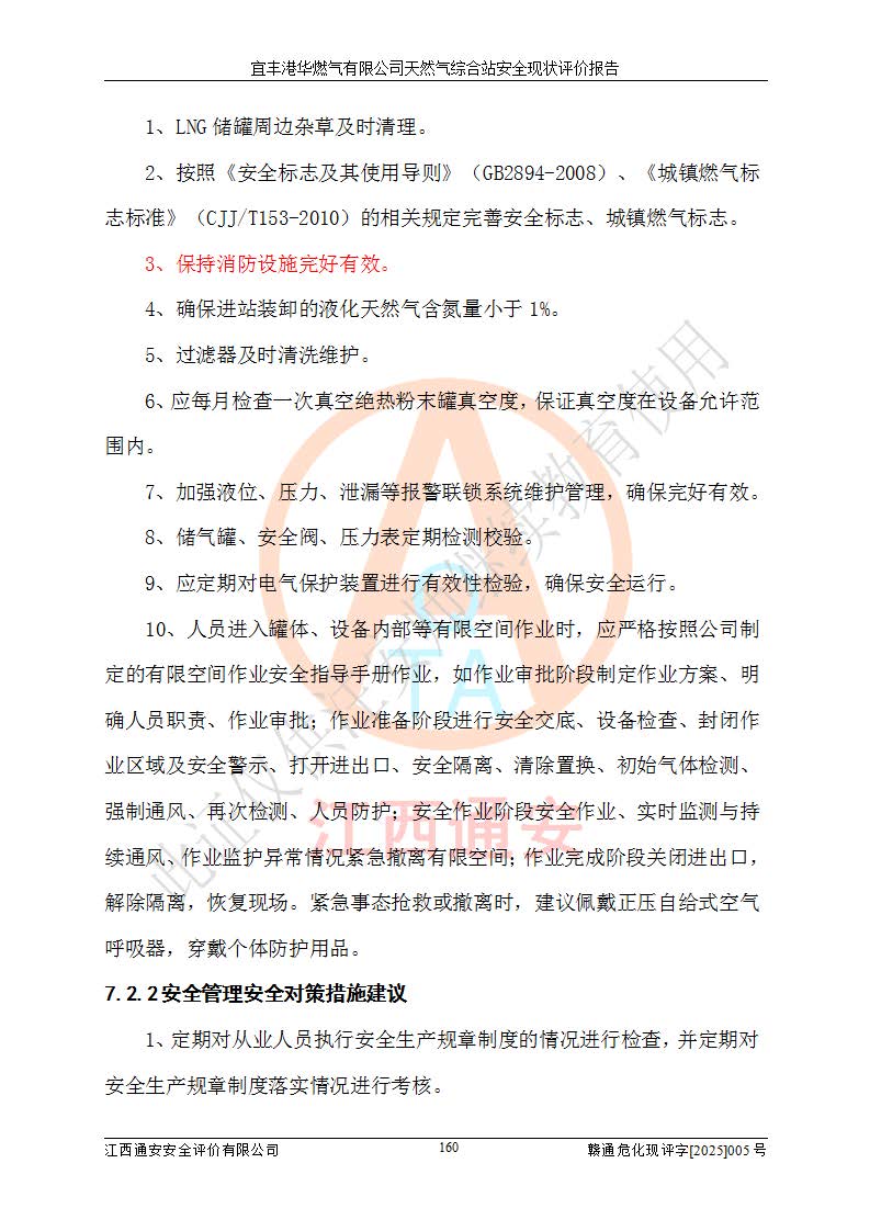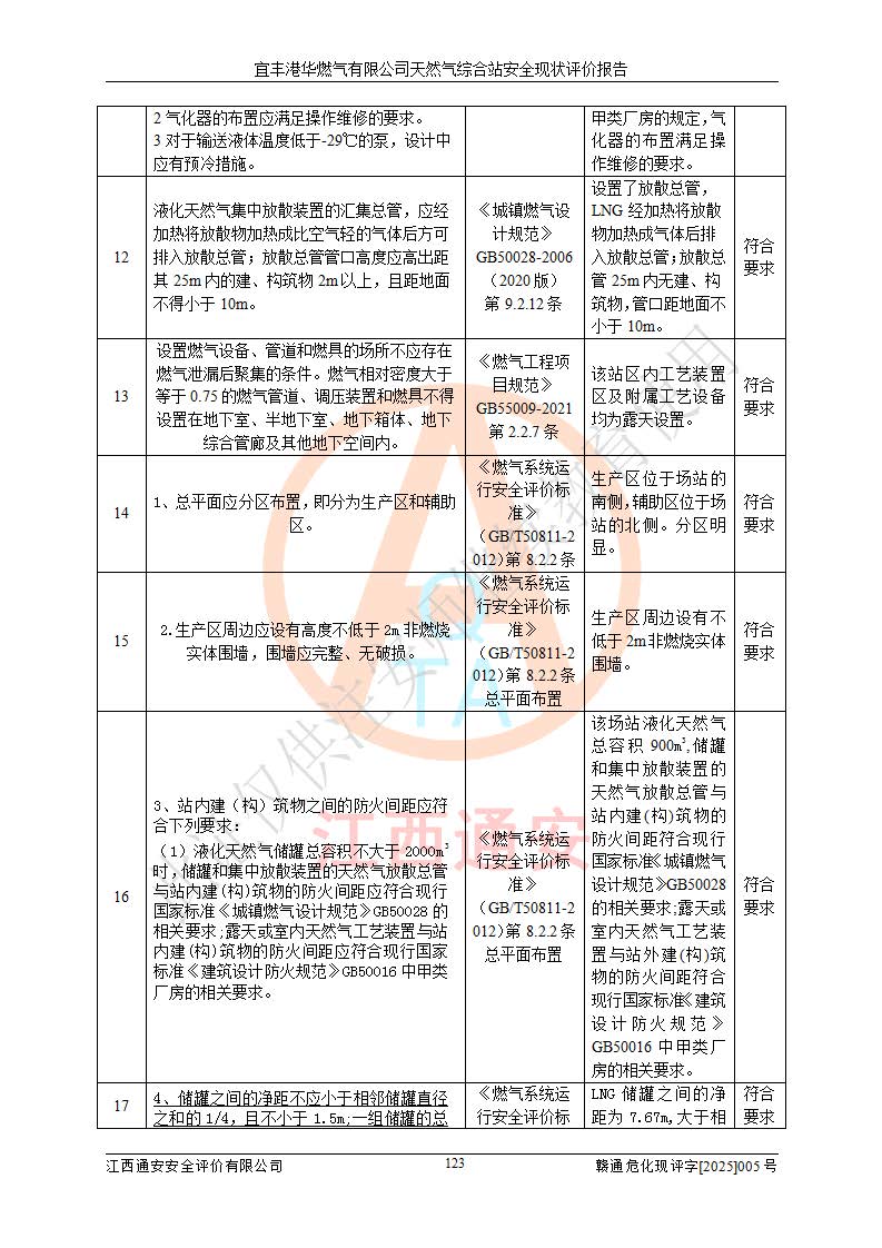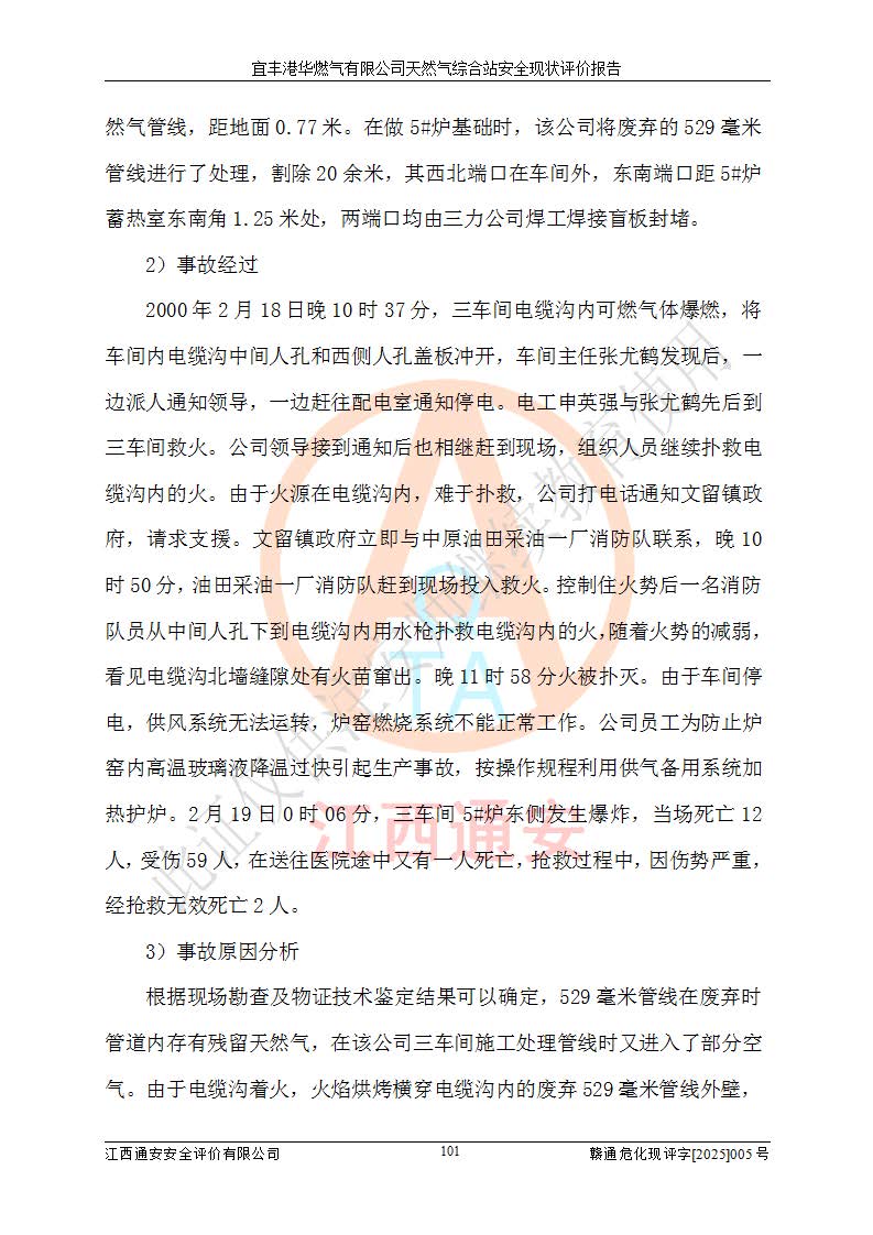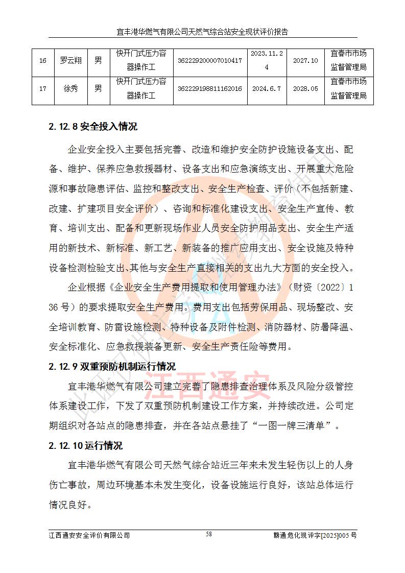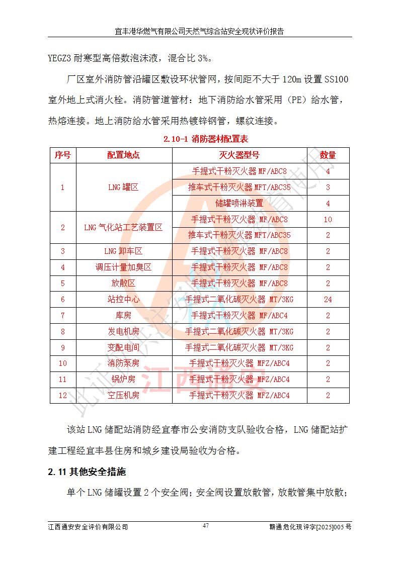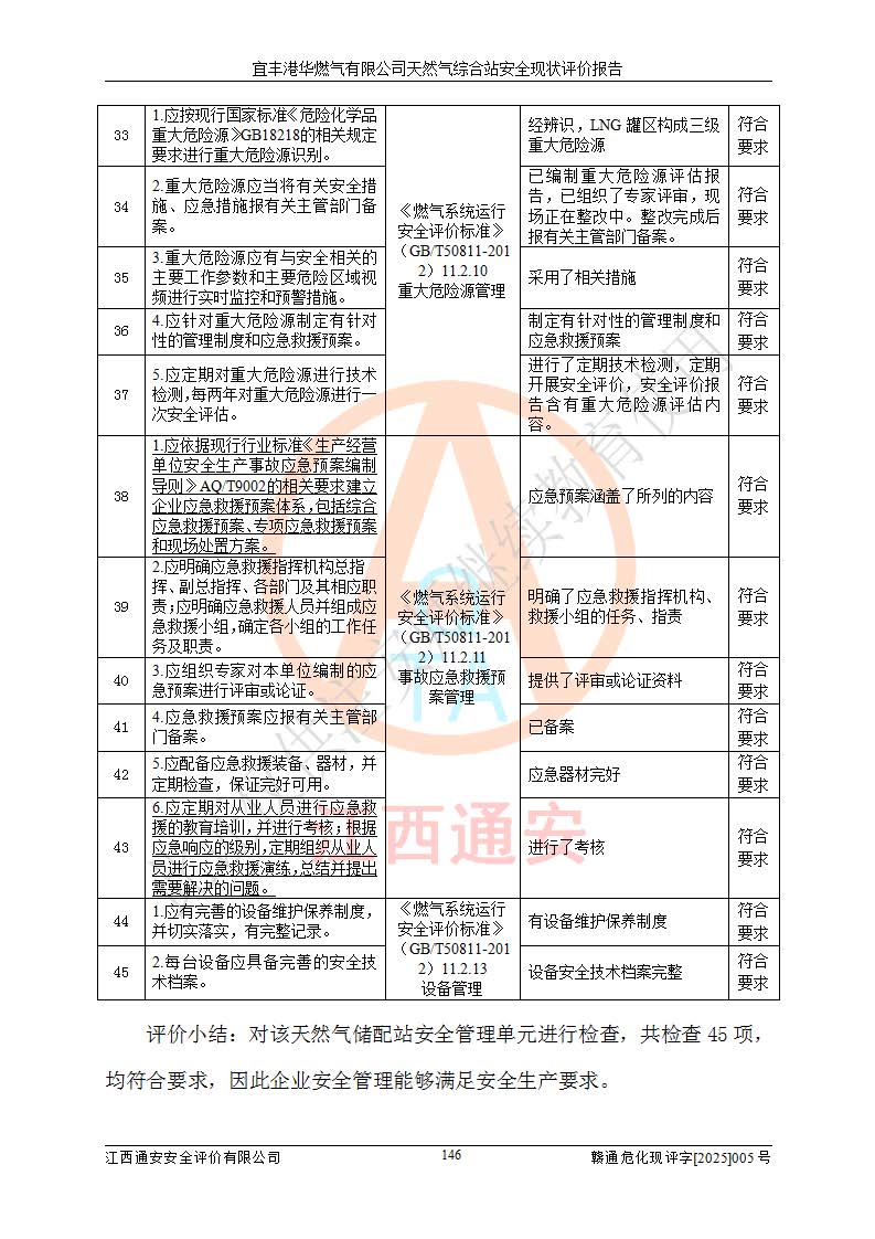 1、主要危險、危害因素辨識結(jié)果 宜豐港華燃氣有限公司天然氣綜合站在生產(chǎn)經(jīng)營過程中存在的主要危險有:火災(zāi)與爆炸、中毒窒息、觸電、機械傷害、物體打擊、**傷害、高處墜落、灼燙、低溫凍傷、容器爆炸、淹溺等,存在的主要危害因素有:化學(xué)因素、物理因素(噪聲、高溫等)等,同時存在人為失誤和管理缺陷。應(yīng)重點防范的主要危險為火災(zāi)與爆炸、容器爆炸。 2、危險化學(xué)品辨識結(jié)果 經(jīng)辨識,該儲配站涉及的天然氣、四氫噻吩及柴油屬于危險化學(xué)品,天然氣屬于重點監(jiān)管的危險化學(xué)品和特別管控危險化學(xué)品,不涉及監(jiān)控化學(xué)品、易制毒化學(xué)品、易制爆危險化學(xué)品、劇毒化學(xué)品和高毒物品等危險化學(xué)品。 3、危險化學(xué)品重大危險源辨識結(jié)果 根據(jù)《危險化學(xué)品重大危險源辨識》(GB18218-2018)和《危險化學(xué)品重大危險源監(jiān)督管理暫行規(guī)定》(2011)(40號令)(2015年 **安監(jiān)總局令第79號修訂)得出結(jié)論如下:該公司LNG儲罐區(qū)構(gòu)成三級重大危險源,其余生產(chǎn)單元及儲存單元不構(gòu)成危險化學(xué)品重大危險源。 4、重點監(jiān)管危險化工工藝辨識結(jié)果 根據(jù)《**安全監(jiān)管總局關(guān)于公布首批重點監(jiān)管的危險化學(xué)品名錄的通知》安監(jiān)總管三[2011]95號、《**安全監(jiān)管總局關(guān)于公布第二批重點監(jiān)管危險化學(xué)品名錄的通知》安監(jiān)總管三[2013]12號進行辨識,該天然氣儲配站不涉及重點監(jiān)管的危險化工工藝。 5、作業(yè)條件危險性分析結(jié)果: 液化天然氣的儲罐區(qū)、調(diào)壓計量氣化加臭區(qū)、卸車區(qū)、變配電、廠內(nèi)運輸、消防水池作業(yè)等單元。等單元危險程度均為“一般危險,需要注意”或“稍有危險,可以接受”級別。作業(yè)條件相對安全。 6、危險度評價結(jié)果:工藝裝置區(qū)等級為Ⅱ級,危險程度為中度危險。LNG儲罐區(qū)等級為Ⅰ級,危險程度為**危險。 7、事故后果預(yù)測結(jié)果:本報告采用中國安全生產(chǎn)科學(xué)研究院研發(fā)的重大危險源區(qū)域定量風(fēng)險評價(CASST-QRA)軟件對可能發(fā)生的危險化學(xué)品事故進行預(yù)測,宜豐港華燃氣有限公司天然氣綜合站LNG儲罐容器整體破裂,發(fā)生BLEVE災(zāi)害模式后果*大,*大死亡半徑為181m,重傷半徑為243m,輕傷半徑為448m。 8、多米諾效應(yīng)分析結(jié)果:該公司LNG儲罐發(fā)生容器整體破裂引發(fā)的BLEVE事故的多米諾半徑*大,為141m。 9、采用安全檢查表評價法對該儲配站周邊環(huán)境、總平面布置、站內(nèi)建構(gòu)筑物防火間距、站內(nèi)交通、LNG卸車、儲罐、氣化裝置、加臭裝置、調(diào)壓裝置、安全附件、工藝設(shè)備、管道、自動化控制等供配電、給排水、消防設(shè)施、供熱裝置、安全管理、“兩重點一重大”安全措施及安全管理進行定性評價,不符合項共2項,其他均符合**法律、法規(guī)、標準、規(guī)范的要求。 (1)企業(yè)對不符合項整改完成后,安全條件符合燃氣儲存經(jīng)營的安全要求。 (2)該儲配站涉及“兩重點一重大”,采取了首批重點監(jiān)管的危險化學(xué)品安全措施和應(yīng)急處置措施,站內(nèi)LNG罐區(qū)構(gòu)成三級重大危險源,采取的重大危險源安全技術(shù)和監(jiān)控措施符合相關(guān)要求。 (3)根據(jù)《燃氣經(jīng)營許可管理辦法》(建城〔2014〕167號發(fā)布,建城規(guī)〔2019〕2號修改)制成安全檢查表對該單位的經(jīng)營條件逐一檢查,檢查結(jié)果符合要求。 (4)根據(jù)《住房城鄉(xiāng)建設(shè)部關(guān)于印發(fā)《城鎮(zhèn)燃氣經(jīng)營安全重大隱患判定標準》的通知》(建城規(guī)[2023]4號)要求,對該項目重大隱患情況進行檢查,該站LNG罐完成整改后不涉及重大隱患。 評價結(jié)論 綜上所述,宜豐港華燃氣有限公司天然氣綜合站選址和總平面布置合理,建構(gòu)筑物間的防火間距、耐火等級等符合標準規(guī)范的要求,LNG卸車、儲存、加臭、氣化調(diào)壓計量等裝置采用成熟的工藝和設(shè)備,本質(zhì)安全程度較高;公司制定了安全管理制度和操作規(guī)程,人員經(jīng)培訓(xùn)合格后上崗,主要負責(zé)人、安全管理人員及特種作業(yè)人員均取得了相應(yīng)的考核合格資格證書,能按照法律法規(guī)要求開展安全生產(chǎn)管理工作。公司對現(xiàn)場存在事故危險的設(shè)施和場所采取了合理可行的防護措施和科學(xué)的管理,使生產(chǎn)過程中的危險有害因素能得到**控制。該項目安全設(shè)施符合**現(xiàn)行有關(guān)法律、法規(guī)、標準的要求。企業(yè)對現(xiàn)場存在的安全問題進行了整改,主要的安全缺陷消除。 綜合結(jié)論:宜豐港華燃氣有限公司天然氣綜合站的安全條件符合燃氣安全運行要求。 |