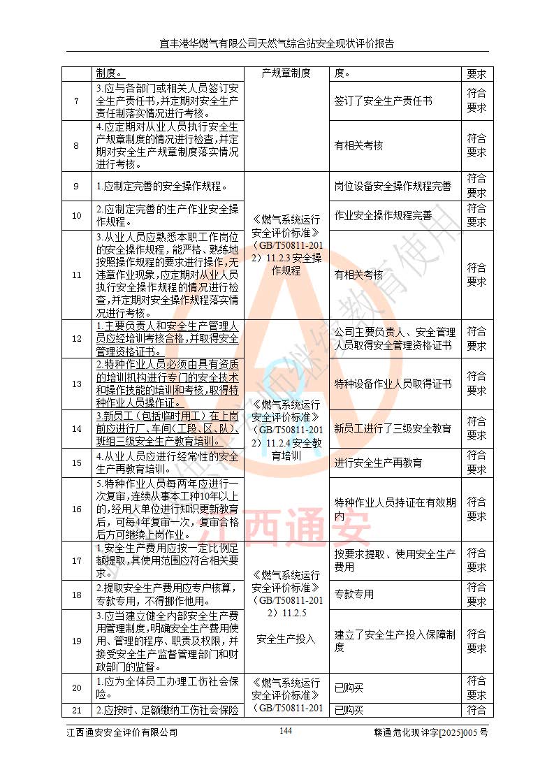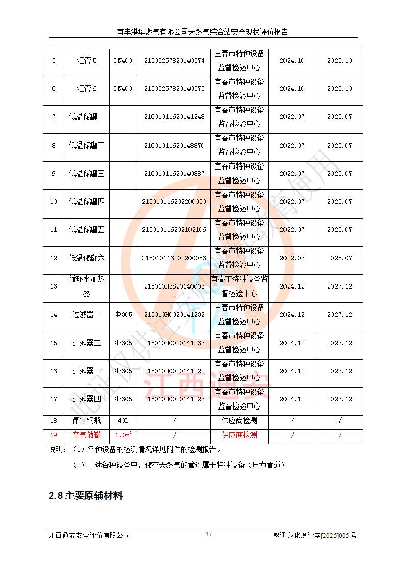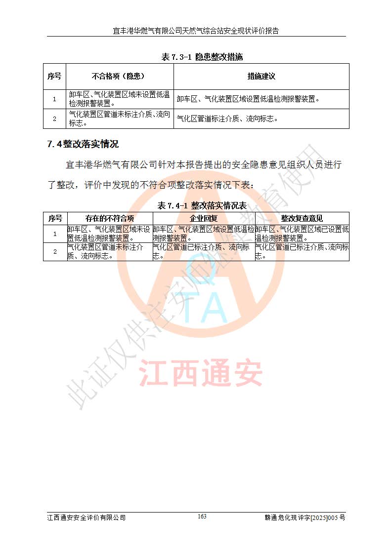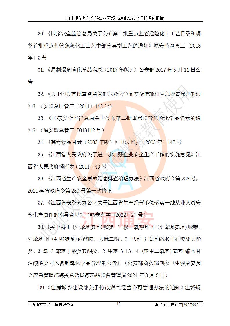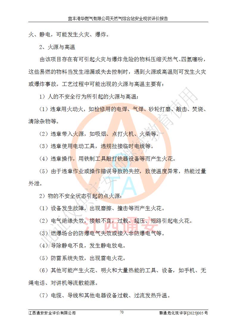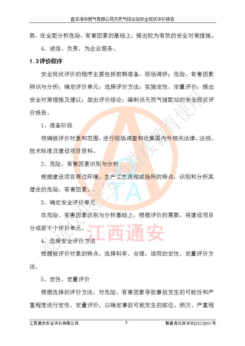 1、主要危險、危害因素辨識結(jié)果 宜豐港華燃氣有限公司天然氣綜合站在生產(chǎn)經(jīng)營過程中存在的主要危險有:火災(zāi)與爆炸、中毒窒息、觸電、機械傷害、物體打擊、**傷害、高處墜落、灼燙、低溫凍傷、容器爆炸、淹溺等,存在的主要危害因素有:化學(xué)因素、物理因素(噪聲、高溫等)等,同時存在人為失誤和管理缺陷。應(yīng)重點防范的主要危險為火災(zāi)與爆炸、容器爆炸。 2、危險化學(xué)品辨識結(jié)果 經(jīng)辨識,該儲配站涉及的天然氣、四氫噻吩及柴油屬于危險化學(xué)品,天然氣屬于重點監(jiān)管的危險化學(xué)品和特別管控危險化學(xué)品,不涉及監(jiān)控化學(xué)品、易制毒化學(xué)品、易制爆危險化學(xué)品、劇毒化學(xué)品和高毒物品等危險化學(xué)品。 3、危險化學(xué)品重大危險源辨識結(jié)果 根據(jù)《危險化學(xué)品重大危險源辨識》(GB18218-2018)和《危險化學(xué)品重大危險源監(jiān)督管理暫行規(guī)定》(2011)(40號令)(2015年 **安監(jiān)總局令第79號修訂)得出結(jié)論如下:該公司LNG儲罐區(qū)構(gòu)成三級重大危險源,其余生產(chǎn)單元及儲存單元不構(gòu)成危險化學(xué)品重大危險源。 4、重點監(jiān)管危險化工工藝辨識結(jié)果 根據(jù)《**安全監(jiān)管總局關(guān)于公布首批重點監(jiān)管的危險化學(xué)品名錄的通知》安監(jiān)總管三[2011]95號、《**安全監(jiān)管總局關(guān)于公布第二批重點監(jiān)管危險化學(xué)品名錄的通知》安監(jiān)總管三[2013]12號進行辨識,該天然氣儲配站不涉及重點監(jiān)管的危險化工工藝。 5、作業(yè)條件危險性分析結(jié)果: 液化天然氣的儲罐區(qū)、調(diào)壓計量氣化加臭區(qū)、卸車區(qū)、變配電、廠內(nèi)運輸、消防水池作業(yè)等單元。等單元危險程度均為“一般危險,需要注意”或“稍有危險,可以接受”級別。作業(yè)條件相對安全。 6、危險度評價結(jié)果:工藝裝置區(qū)等級為Ⅱ級,危險程度為中度危險。LNG儲罐區(qū)等級為Ⅰ級,危險程度為**危險。 7、事故后果預(yù)測結(jié)果:本報告采用中國安全生產(chǎn)科學(xué)研究院研發(fā)的重大危險源區(qū)域定量風(fēng)險評價(CASST-QRA)軟件對可能發(fā)生的危險化學(xué)品事故進行預(yù)測,宜豐港華燃氣有限公司天然氣綜合站LNG儲罐容器整體破裂,發(fā)生BLEVE災(zāi)害模式后果*大,*大死亡半徑為181m,重傷半徑為243m,輕傷半徑為448m。 8、多米諾效應(yīng)分析結(jié)果:該公司LNG儲罐發(fā)生容器整體破裂引發(fā)的BLEVE事故的多米諾半徑*大,為141m。 9、采用安全檢查表評價法對該儲配站周邊環(huán)境、總平面布置、站內(nèi)建構(gòu)筑物防火間距、站內(nèi)交通、LNG卸車、儲罐、氣化裝置、加臭裝置、調(diào)壓裝置、安全附件、工藝設(shè)備、管道、自動化控制等供配電、給排水、消防設(shè)施、供熱裝置、安全管理、“兩重點一重大”安全措施及安全管理進行定性評價,不符合項共2項,其他均符合**法律、法規(guī)、標準、規(guī)范的要求。 (1)企業(yè)對不符合項整改完成后,安全條件符合燃氣儲存經(jīng)營的安全要求。 (2)該儲配站涉及“兩重點一重大”,采取了首批重點監(jiān)管的危險化學(xué)品安全措施和應(yīng)急處置措施,站內(nèi)LNG罐區(qū)構(gòu)成三級重大危險源,采取的重大危險源安全技術(shù)和監(jiān)控措施符合相關(guān)要求。 (3)根據(jù)《燃氣經(jīng)營許可管理辦法》(建城〔2014〕167號發(fā)布,建城規(guī)〔2019〕2號修改)制成安全檢查表對該單位的經(jīng)營條件逐一檢查,檢查結(jié)果符合要求。 (4)根據(jù)《住房城鄉(xiāng)建設(shè)部關(guān)于印發(fā)《城鎮(zhèn)燃氣經(jīng)營安全重大隱患判定標準》的通知》(建城規(guī)[2023]4號)要求,對該項目重大隱患情況進行檢查,該站LNG罐完成整改后不涉及重大隱患。 評價結(jié)論 綜上所述,宜豐港華燃氣有限公司天然氣綜合站選址和總平面布置合理,建構(gòu)筑物間的防火間距、耐火等級等符合標準規(guī)范的要求,LNG卸車、儲存、加臭、氣化調(diào)壓計量等裝置采用成熟的工藝和設(shè)備,本質(zhì)安全程度較高;公司制定了安全管理制度和操作規(guī)程,人員經(jīng)培訓(xùn)合格后上崗,主要負責(zé)人、安全管理人員及特種作業(yè)人員均取得了相應(yīng)的考核合格資格證書,能按照法律法規(guī)要求開展安全生產(chǎn)管理工作。公司對現(xiàn)場存在事故危險的設(shè)施和場所采取了合理可行的防護措施和科學(xué)的管理,使生產(chǎn)過程中的危險有害因素能得到**控制。該項目安全設(shè)施符合**現(xiàn)行有關(guān)法律、法規(guī)、標準的要求。企業(yè)對現(xiàn)場存在的安全問題進行了整改,主要的安全缺陷消除。 綜合結(jié)論:宜豐港華燃氣有限公司天然氣綜合站的安全條件符合燃氣安全運行要求。 |