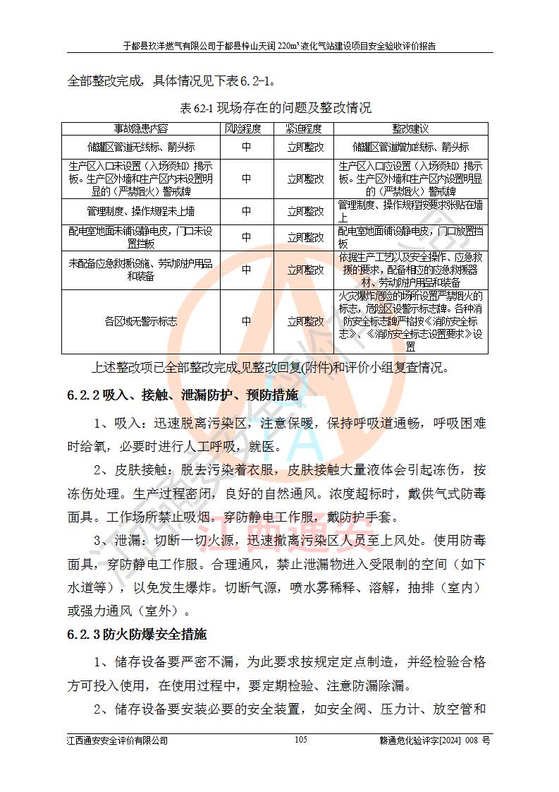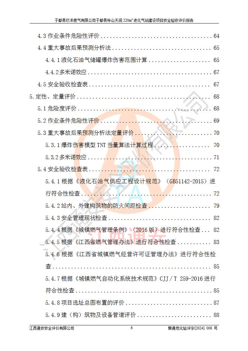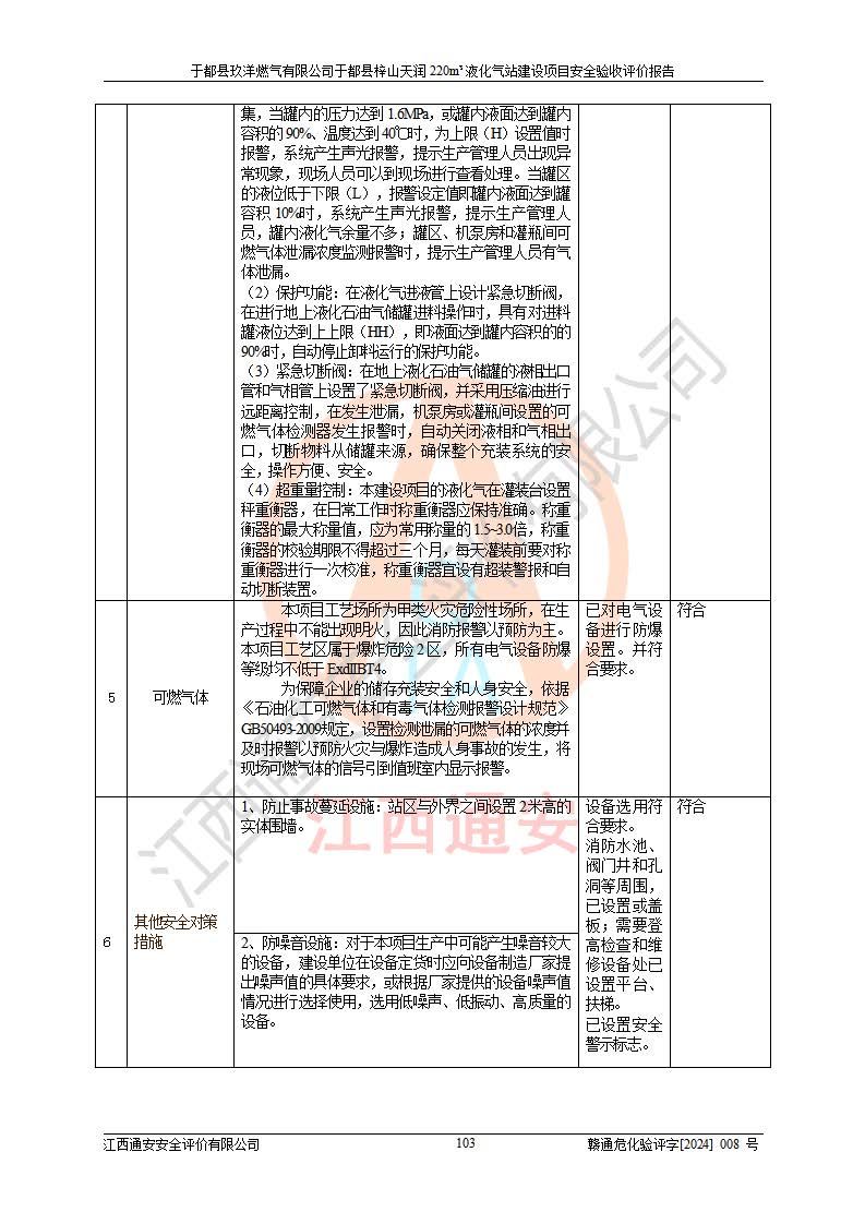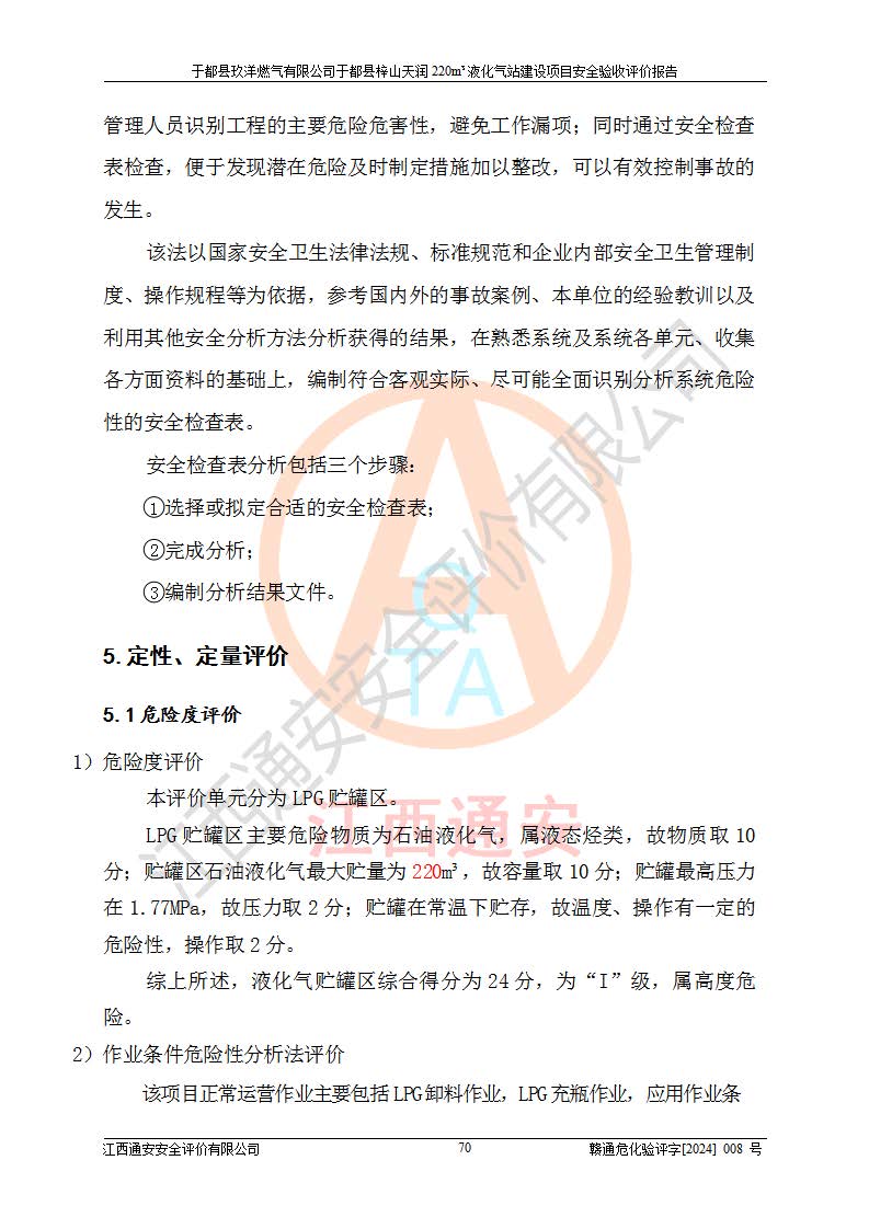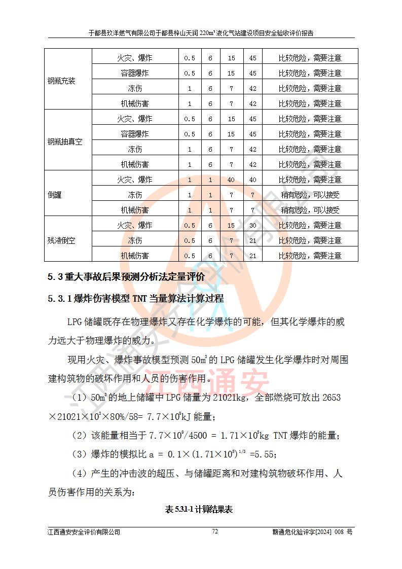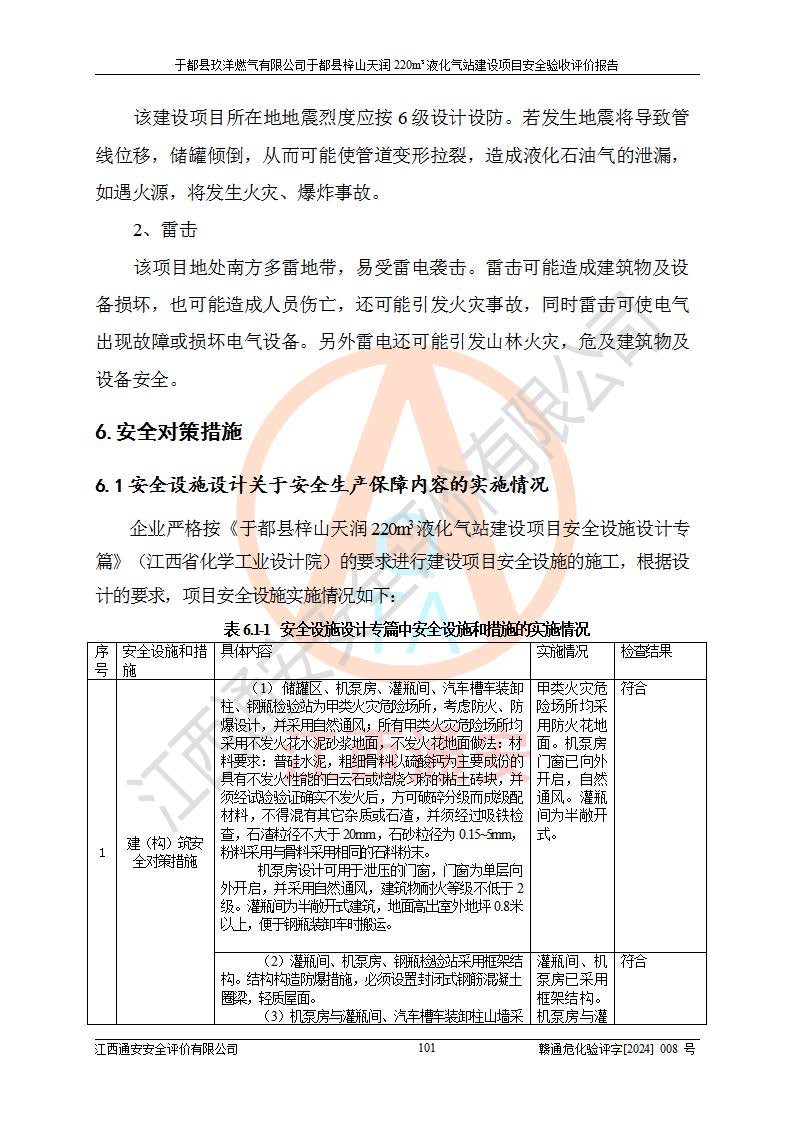 其它 | 根據(jù)**有關(guān)城市燃?xì)夤芾矸煞ㄒ?guī)、規(guī)章、標(biāo)準(zhǔn)、規(guī)范及于都縣玖洋燃?xì)庥邢薰咎峁┑挠嘘P(guān)資料,通過對該液化氣站的現(xiàn)場勘察,對液化氣站的主要危險(xiǎn)危害因素的分析,采用危險(xiǎn)度評價(jià)法、作業(yè)條件危險(xiǎn)性分析法等評價(jià)方法,對該液化氣站進(jìn)行安全驗(yàn)收評價(jià),總結(jié)如下: ⑴于都縣梓山天潤220m3液化氣站周邊100m范圍內(nèi)無公共設(shè)施、學(xué)校、醫(yī)院及文物保護(hù)單位。該液化氣站選址和平面布置經(jīng)實(shí)測對照《液化石油氣供應(yīng)工程設(shè)計(jì)規(guī)范》(GB51142-2015)的要求,符合**和行業(yè)相關(guān)標(biāo)準(zhǔn)。 ⑵該液化氣站的主要危險(xiǎn)、有害因素是火災(zāi)、爆炸,容器爆炸,其次是觸電、機(jī)械傷害、物體打擊、高處墜落、**傷害、凍傷、中毒等。 ⑶該液化氣站儲(chǔ)存的LPG構(gòu)成了重大危險(xiǎn)源。LPG是易燃易爆的甲類氣體。制定的應(yīng)急救援預(yù)案應(yīng)加強(qiáng)演練,不斷完善應(yīng)急救援預(yù)案內(nèi)容。 ⑷危險(xiǎn)度評價(jià)中液化氣儲(chǔ)罐區(qū)為“I”級(jí),屬**危險(xiǎn);作業(yè)條件危險(xiǎn)性評價(jià)中LPG卸料單元為“比較危險(xiǎn),需要注意”、鋼瓶充裝單元為“比較危險(xiǎn),需要注意”;現(xiàn)場檢查表中,有應(yīng)急救援預(yù)案, 有應(yīng)急演練圖片記錄,符合《液化石油氣供應(yīng)工程設(shè)計(jì)規(guī)范》(GB51142-2015)的安全要求。 ⑸該液化氣站對儲(chǔ)罐、管道等設(shè)備等設(shè)施都進(jìn)行了檢驗(yàn)檢測;消防、安全設(shè)施已完善,進(jìn)一步提高了設(shè)備和設(shè)施的完好性、可靠性。 ⑹該液化氣站有比較健全的安全管理制度、安全操作規(guī)程;有關(guān)人員經(jīng)過有關(guān)**主管部門培訓(xùn),設(shè)立了專職安全負(fù)責(zé)人,從組織機(jī)構(gòu)、安全生產(chǎn)管理上**了安全措施的基本落實(shí)。 綜上所述,本評價(jià)認(rèn)為于都縣玖洋燃?xì)庥邢薰居诙伎h梓山天潤220m3液化氣站符合**有關(guān)城市燃?xì)夤芾矸煞ㄒ?guī)、規(guī)章、標(biāo)準(zhǔn)、規(guī)范的安全要求,滿足安全生產(chǎn)的需要。 該公司針對主要危險(xiǎn)、危害因素在設(shè)計(jì)和實(shí)施過程中采取了相應(yīng)的安全設(shè)施和技術(shù)措施,并做到了與主體工程同時(shí)設(shè)計(jì)、同時(shí)建設(shè)、同時(shí)投入使用。項(xiàng)目建立了安全生產(chǎn)管理體系以及各項(xiàng)安全生產(chǎn)管理制度,安全設(shè)施齊備并**,安全生產(chǎn)狀況良好,現(xiàn)場與設(shè)計(jì)圖紙一致,人員配置符合要求,特種作業(yè)人員持證上崗,隱患排查治理及時(shí),未發(fā)生人員傷亡及設(shè)備事故。該項(xiàng)目安全條件符合相關(guān)的安全法律、法規(guī)和標(biāo)準(zhǔn)規(guī)范的要求,滿足安全生產(chǎn)條件,符合安全經(jīng)營要求。 | ||||