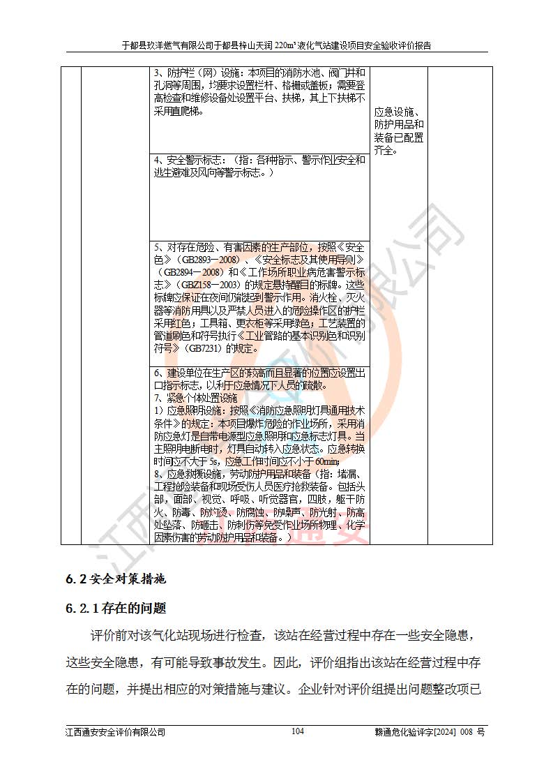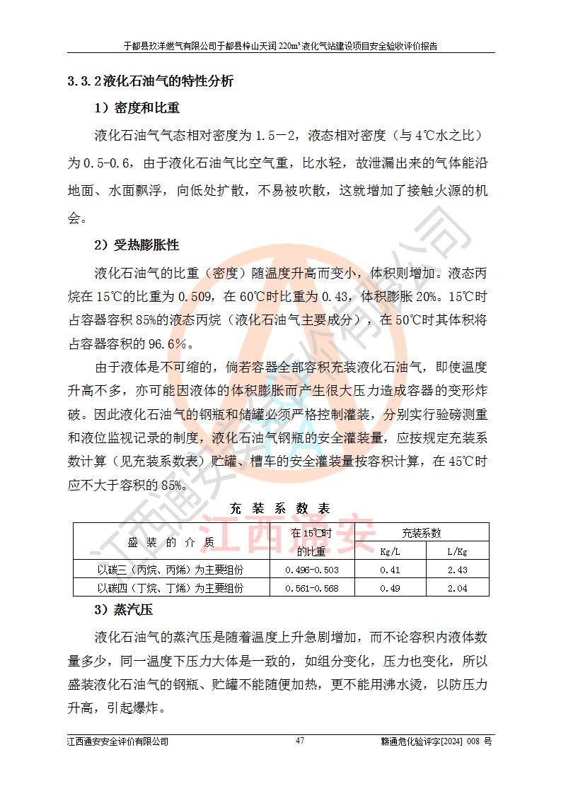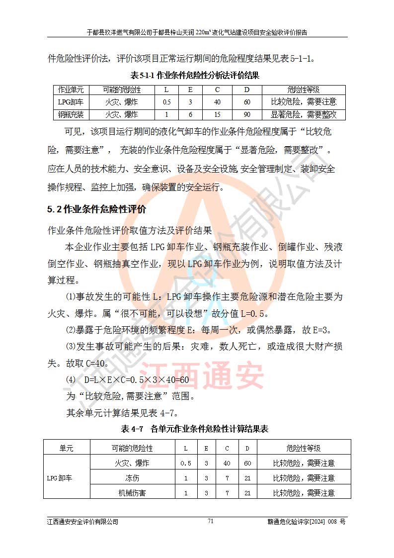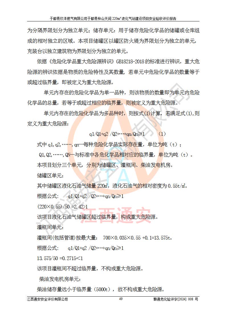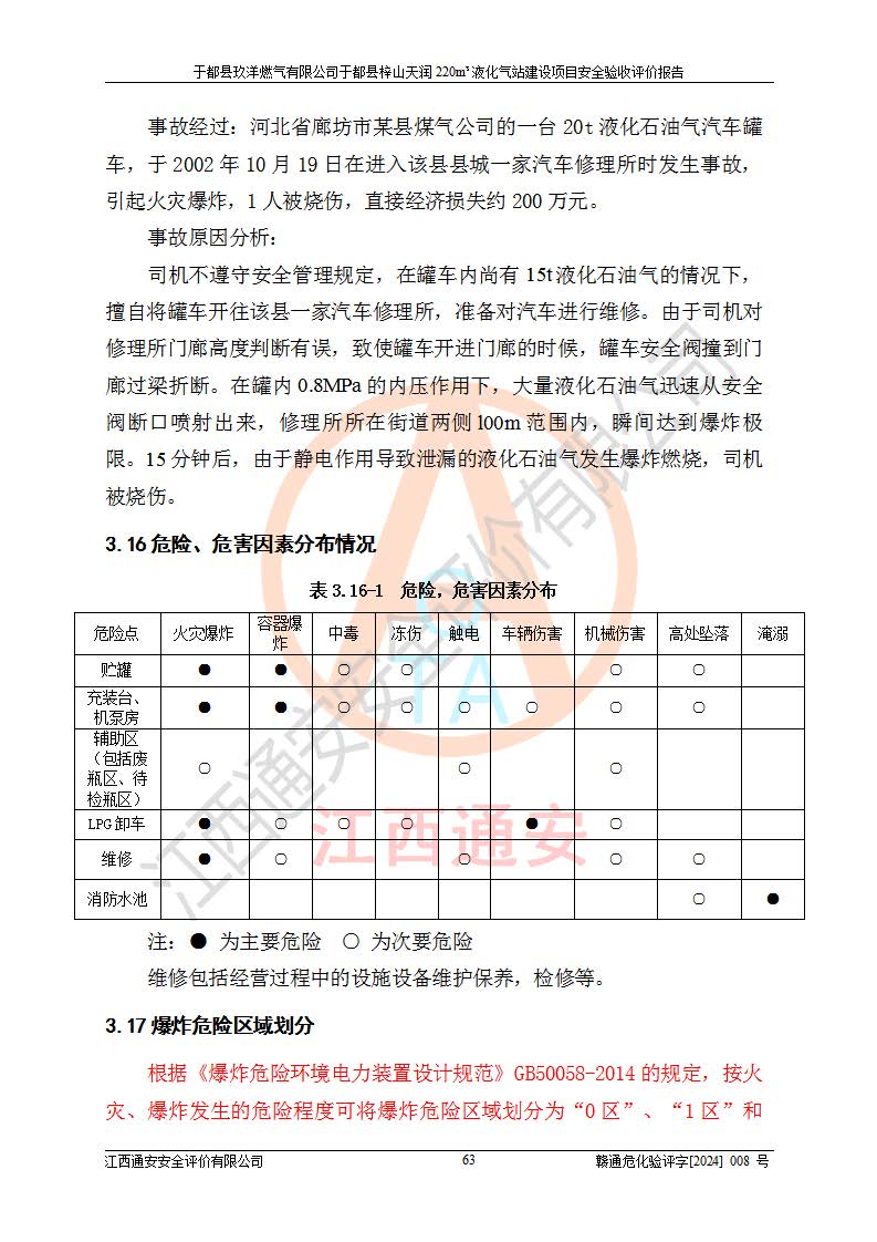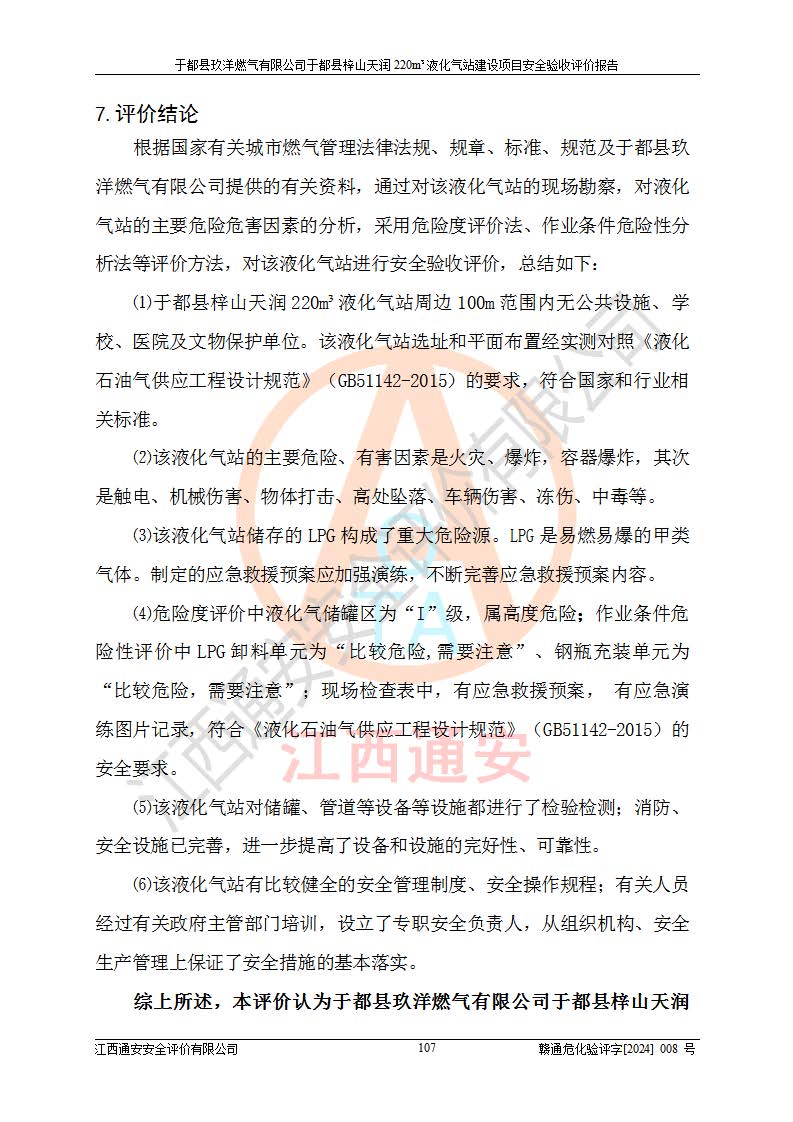 其它 | 根據(jù)**有關(guān)城市燃?xì)夤芾矸煞ㄒ?guī)、規(guī)章、標(biāo)準(zhǔn)、規(guī)范及于都縣玖洋燃?xì)庥邢薰咎峁┑挠嘘P(guān)資料,通過對該液化氣站的現(xiàn)場勘察,對液化氣站的主要危險(xiǎn)危害因素的分析,采用危險(xiǎn)度評價(jià)法、作業(yè)條件危險(xiǎn)性分析法等評價(jià)方法,對該液化氣站進(jìn)行安全驗(yàn)收評價(jià),總結(jié)如下: ⑴于都縣梓山天潤220m3液化氣站周邊100m范圍內(nèi)無公共設(shè)施、學(xué)校、醫(yī)院及文物保護(hù)單位。該液化氣站選址和平面布置經(jīng)實(shí)測對照《液化石油氣供應(yīng)工程設(shè)計(jì)規(guī)范》(GB51142-2015)的要求,符合**和行業(yè)相關(guān)標(biāo)準(zhǔn)。 ⑵該液化氣站的主要危險(xiǎn)、有害因素是火災(zāi)、爆炸,容器爆炸,其次是觸電、機(jī)械傷害、物體打擊、高處墜落、**傷害、凍傷、中毒等。 ⑶該液化氣站儲(chǔ)存的LPG構(gòu)成了重大危險(xiǎn)源。LPG是易燃易爆的甲類氣體。制定的應(yīng)急救援預(yù)案應(yīng)加強(qiáng)演練,不斷完善應(yīng)急救援預(yù)案內(nèi)容。 ⑷危險(xiǎn)度評價(jià)中液化氣儲(chǔ)罐區(qū)為“I”級(jí),屬**危險(xiǎn);作業(yè)條件危險(xiǎn)性評價(jià)中LPG卸料單元為“比較危險(xiǎn),需要注意”、鋼瓶充裝單元為“比較危險(xiǎn),需要注意”;現(xiàn)場檢查表中,有應(yīng)急救援預(yù)案, 有應(yīng)急演練圖片記錄,符合《液化石油氣供應(yīng)工程設(shè)計(jì)規(guī)范》(GB51142-2015)的安全要求。 ⑸該液化氣站對儲(chǔ)罐、管道等設(shè)備等設(shè)施都進(jìn)行了檢驗(yàn)檢測;消防、安全設(shè)施已完善,進(jìn)一步提高了設(shè)備和設(shè)施的完好性、可靠性。 ⑹該液化氣站有比較健全的安全管理制度、安全操作規(guī)程;有關(guān)人員經(jīng)過有關(guān)**主管部門培訓(xùn),設(shè)立了專職安全負(fù)責(zé)人,從組織機(jī)構(gòu)、安全生產(chǎn)管理上**了安全措施的基本落實(shí)。 綜上所述,本評價(jià)認(rèn)為于都縣玖洋燃?xì)庥邢薰居诙伎h梓山天潤220m3液化氣站符合**有關(guān)城市燃?xì)夤芾矸煞ㄒ?guī)、規(guī)章、標(biāo)準(zhǔn)、規(guī)范的安全要求,滿足安全生產(chǎn)的需要。 該公司針對主要危險(xiǎn)、危害因素在設(shè)計(jì)和實(shí)施過程中采取了相應(yīng)的安全設(shè)施和技術(shù)措施,并做到了與主體工程同時(shí)設(shè)計(jì)、同時(shí)建設(shè)、同時(shí)投入使用。項(xiàng)目建立了安全生產(chǎn)管理體系以及各項(xiàng)安全生產(chǎn)管理制度,安全設(shè)施齊備并**,安全生產(chǎn)狀況良好,現(xiàn)場與設(shè)計(jì)圖紙一致,人員配置符合要求,特種作業(yè)人員持證上崗,隱患排查治理及時(shí),未發(fā)生人員傷亡及設(shè)備事故。該項(xiàng)目安全條件符合相關(guān)的安全法律、法規(guī)和標(biāo)準(zhǔn)規(guī)范的要求,滿足安全生產(chǎn)條件,符合安全經(jīng)營要求。 | ||||