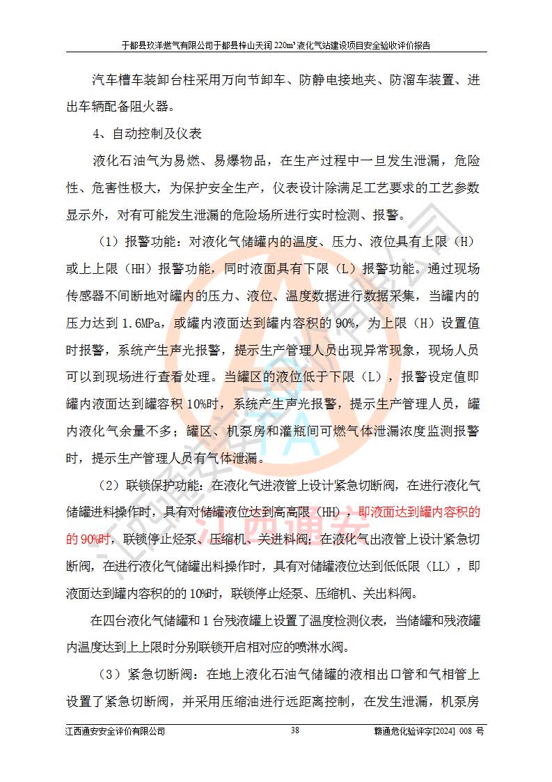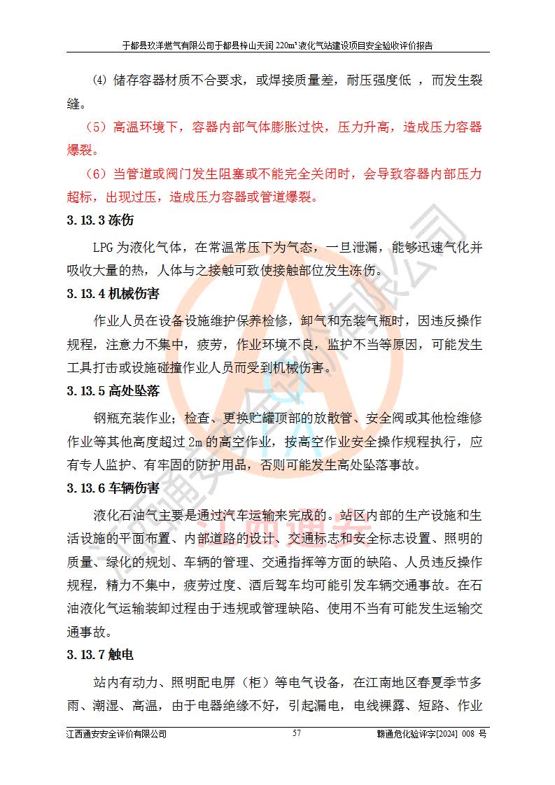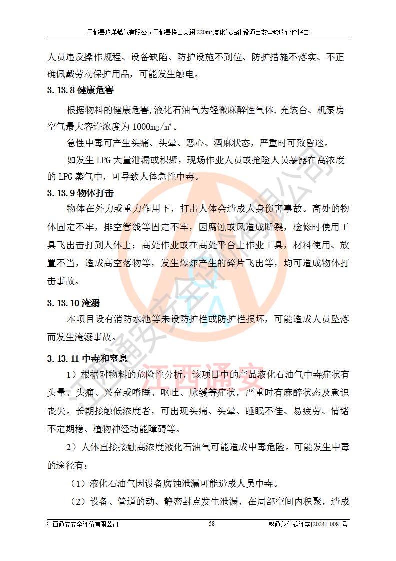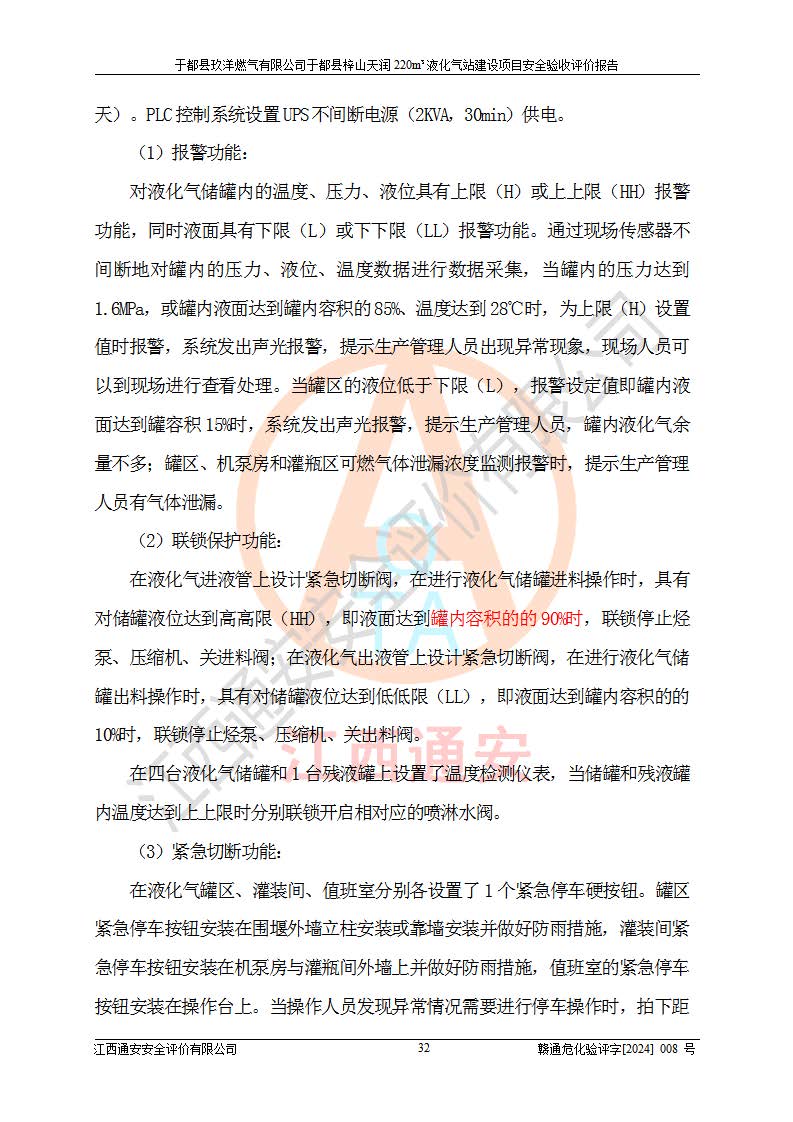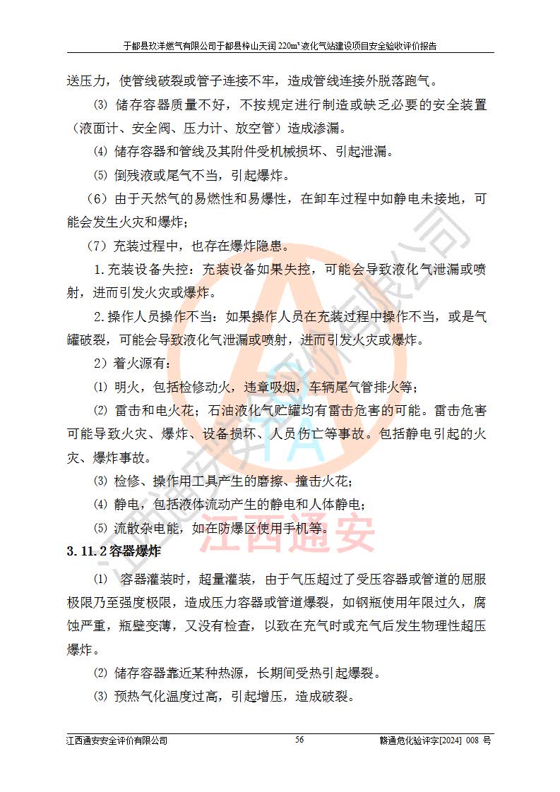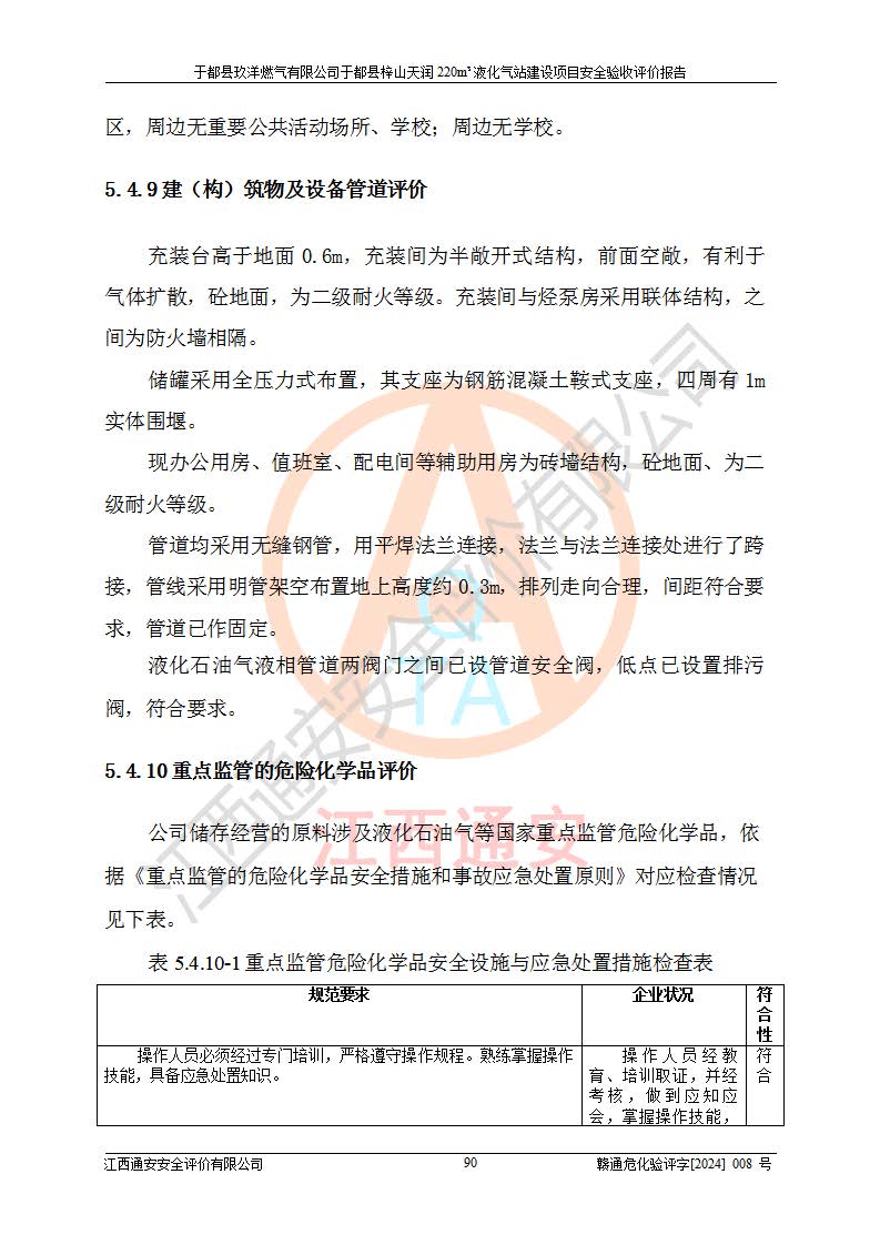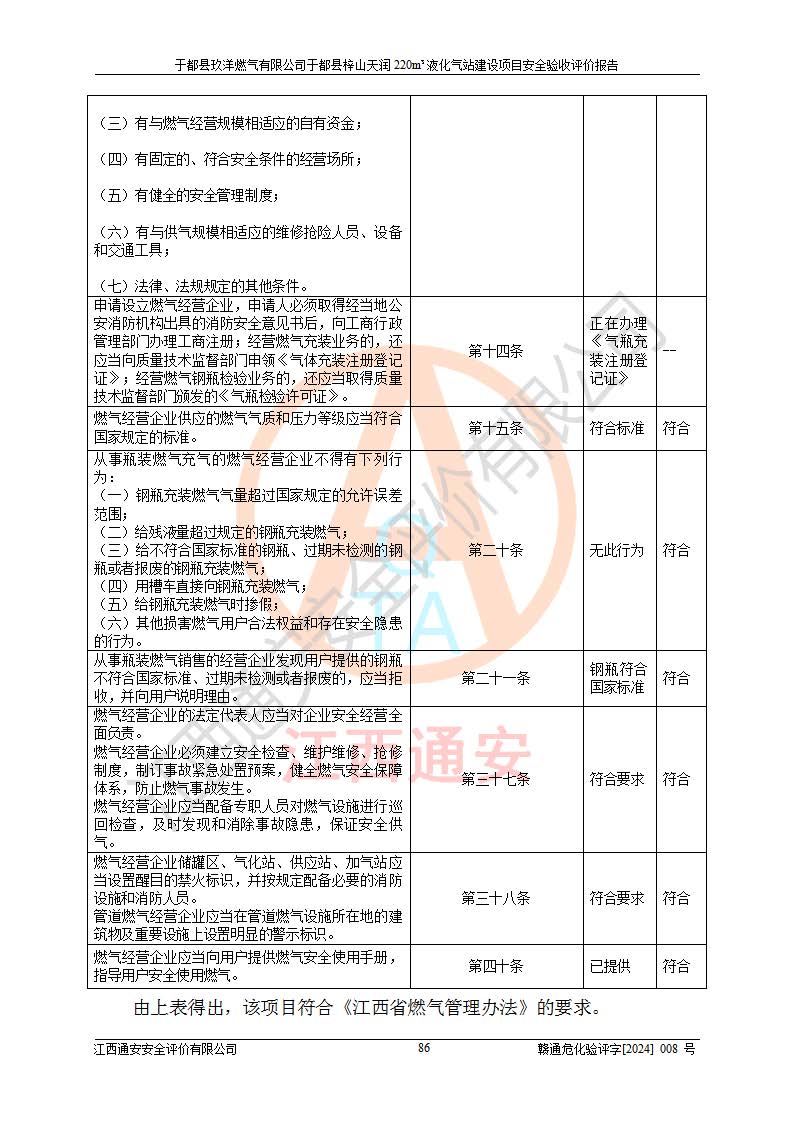 其它 | 根據(jù)**有關(guān)城市燃?xì)夤芾矸煞ㄒ?guī)、規(guī)章、標(biāo)準(zhǔn)、規(guī)范及于都縣玖洋燃?xì)庥邢薰咎峁┑挠嘘P(guān)資料,通過對該液化氣站的現(xiàn)場勘察,對液化氣站的主要危險(xiǎn)危害因素的分析,采用危險(xiǎn)度評價(jià)法、作業(yè)條件危險(xiǎn)性分析法等評價(jià)方法,對該液化氣站進(jìn)行安全驗(yàn)收評價(jià),總結(jié)如下: ⑴于都縣梓山天潤220m3液化氣站周邊100m范圍內(nèi)無公共設(shè)施、學(xué)校、醫(yī)院及文物保護(hù)單位。該液化氣站選址和平面布置經(jīng)實(shí)測對照《液化石油氣供應(yīng)工程設(shè)計(jì)規(guī)范》(GB51142-2015)的要求,符合**和行業(yè)相關(guān)標(biāo)準(zhǔn)。 ⑵該液化氣站的主要危險(xiǎn)、有害因素是火災(zāi)、爆炸,容器爆炸,其次是觸電、機(jī)械傷害、物體打擊、高處墜落、**傷害、凍傷、中毒等。 ⑶該液化氣站儲(chǔ)存的LPG構(gòu)成了重大危險(xiǎn)源。LPG是易燃易爆的甲類氣體。制定的應(yīng)急救援預(yù)案應(yīng)加強(qiáng)演練,不斷完善應(yīng)急救援預(yù)案內(nèi)容。 ⑷危險(xiǎn)度評價(jià)中液化氣儲(chǔ)罐區(qū)為“I”級(jí),屬**危險(xiǎn);作業(yè)條件危險(xiǎn)性評價(jià)中LPG卸料單元為“比較危險(xiǎn),需要注意”、鋼瓶充裝單元為“比較危險(xiǎn),需要注意”;現(xiàn)場檢查表中,有應(yīng)急救援預(yù)案, 有應(yīng)急演練圖片記錄,符合《液化石油氣供應(yīng)工程設(shè)計(jì)規(guī)范》(GB51142-2015)的安全要求。 ⑸該液化氣站對儲(chǔ)罐、管道等設(shè)備等設(shè)施都進(jìn)行了檢驗(yàn)檢測;消防、安全設(shè)施已完善,進(jìn)一步提高了設(shè)備和設(shè)施的完好性、可靠性。 ⑹該液化氣站有比較健全的安全管理制度、安全操作規(guī)程;有關(guān)人員經(jīng)過有關(guān)**主管部門培訓(xùn),設(shè)立了專職安全負(fù)責(zé)人,從組織機(jī)構(gòu)、安全生產(chǎn)管理上**了安全措施的基本落實(shí)。 綜上所述,本評價(jià)認(rèn)為于都縣玖洋燃?xì)庥邢薰居诙伎h梓山天潤220m3液化氣站符合**有關(guān)城市燃?xì)夤芾矸煞ㄒ?guī)、規(guī)章、標(biāo)準(zhǔn)、規(guī)范的安全要求,滿足安全生產(chǎn)的需要。 該公司針對主要危險(xiǎn)、危害因素在設(shè)計(jì)和實(shí)施過程中采取了相應(yīng)的安全設(shè)施和技術(shù)措施,并做到了與主體工程同時(shí)設(shè)計(jì)、同時(shí)建設(shè)、同時(shí)投入使用。項(xiàng)目建立了安全生產(chǎn)管理體系以及各項(xiàng)安全生產(chǎn)管理制度,安全設(shè)施齊備并**,安全生產(chǎn)狀況良好,現(xiàn)場與設(shè)計(jì)圖紙一致,人員配置符合要求,特種作業(yè)人員持證上崗,隱患排查治理及時(shí),未發(fā)生人員傷亡及設(shè)備事故。該項(xiàng)目安全條件符合相關(guān)的安全法律、法規(guī)和標(biāo)準(zhǔn)規(guī)范的要求,滿足安全生產(chǎn)條件,符合安全經(jīng)營要求。 | ||||