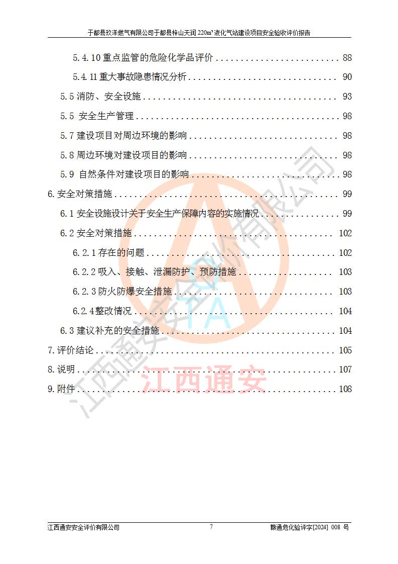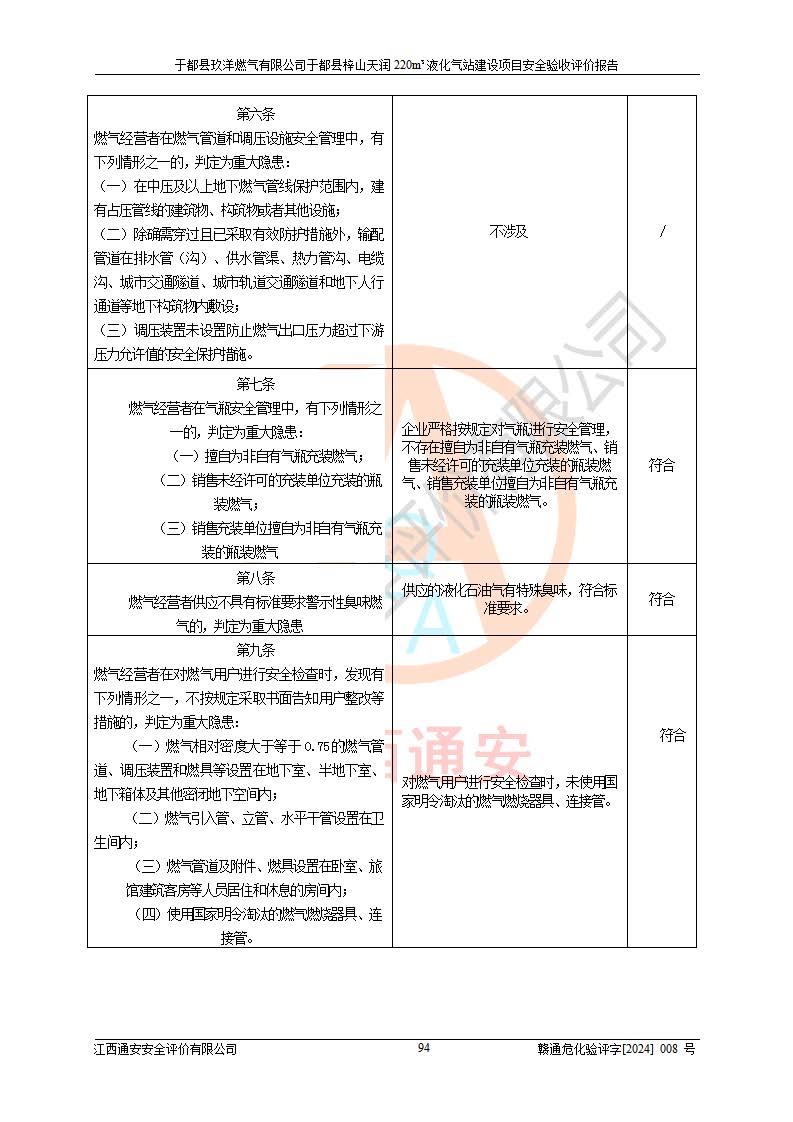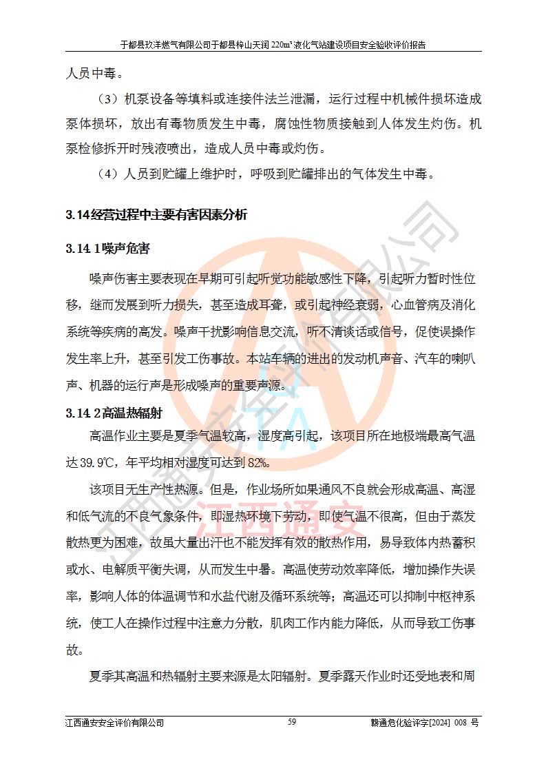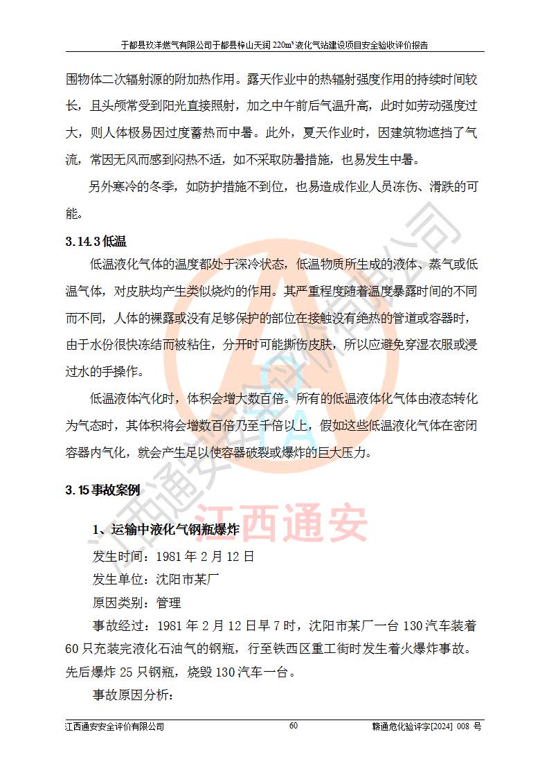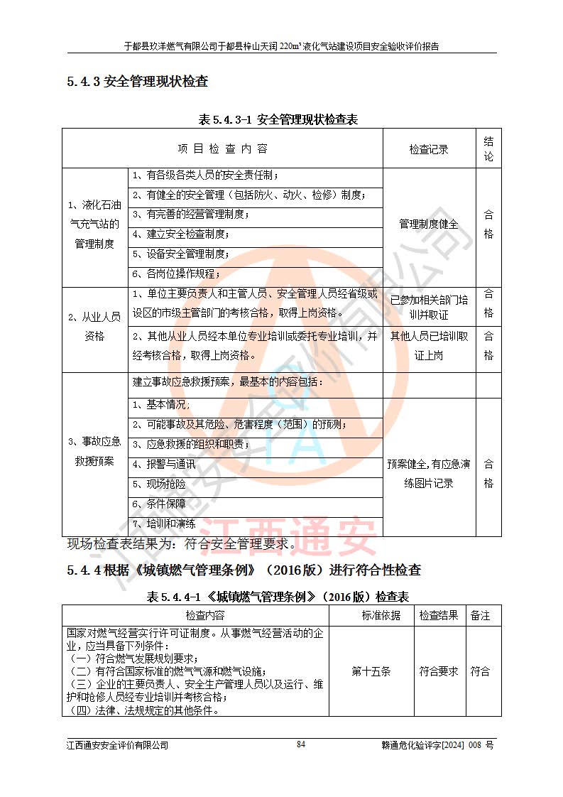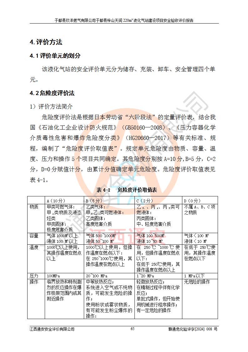 其它 | 根據(jù)**有關(guān)城市燃?xì)夤芾矸煞ㄒ?guī)、規(guī)章、標(biāo)準(zhǔn)、規(guī)范及于都縣玖洋燃?xì)庥邢薰咎峁┑挠嘘P(guān)資料,通過對該液化氣站的現(xiàn)場勘察,對液化氣站的主要危險(xiǎn)危害因素的分析,采用危險(xiǎn)度評價(jià)法、作業(yè)條件危險(xiǎn)性分析法等評價(jià)方法,對該液化氣站進(jìn)行安全驗(yàn)收評價(jià),總結(jié)如下: ⑴于都縣梓山天潤220m3液化氣站周邊100m范圍內(nèi)無公共設(shè)施、學(xué)校、醫(yī)院及文物保護(hù)單位。該液化氣站選址和平面布置經(jīng)實(shí)測對照《液化石油氣供應(yīng)工程設(shè)計(jì)規(guī)范》(GB51142-2015)的要求,符合**和行業(yè)相關(guān)標(biāo)準(zhǔn)。 ⑵該液化氣站的主要危險(xiǎn)、有害因素是火災(zāi)、爆炸,容器爆炸,其次是觸電、機(jī)械傷害、物體打擊、高處墜落、**傷害、凍傷、中毒等。 ⑶該液化氣站儲(chǔ)存的LPG構(gòu)成了重大危險(xiǎn)源。LPG是易燃易爆的甲類氣體。制定的應(yīng)急救援預(yù)案應(yīng)加強(qiáng)演練,不斷完善應(yīng)急救援預(yù)案內(nèi)容。 ⑷危險(xiǎn)度評價(jià)中液化氣儲(chǔ)罐區(qū)為“I”級(jí),屬**危險(xiǎn);作業(yè)條件危險(xiǎn)性評價(jià)中LPG卸料單元為“比較危險(xiǎn),需要注意”、鋼瓶充裝單元為“比較危險(xiǎn),需要注意”;現(xiàn)場檢查表中,有應(yīng)急救援預(yù)案, 有應(yīng)急演練圖片記錄,符合《液化石油氣供應(yīng)工程設(shè)計(jì)規(guī)范》(GB51142-2015)的安全要求。 ⑸該液化氣站對儲(chǔ)罐、管道等設(shè)備等設(shè)施都進(jìn)行了檢驗(yàn)檢測;消防、安全設(shè)施已完善,進(jìn)一步提高了設(shè)備和設(shè)施的完好性、可靠性。 ⑹該液化氣站有比較健全的安全管理制度、安全操作規(guī)程;有關(guān)人員經(jīng)過有關(guān)**主管部門培訓(xùn),設(shè)立了專職安全負(fù)責(zé)人,從組織機(jī)構(gòu)、安全生產(chǎn)管理上**了安全措施的基本落實(shí)。 綜上所述,本評價(jià)認(rèn)為于都縣玖洋燃?xì)庥邢薰居诙伎h梓山天潤220m3液化氣站符合**有關(guān)城市燃?xì)夤芾矸煞ㄒ?guī)、規(guī)章、標(biāo)準(zhǔn)、規(guī)范的安全要求,滿足安全生產(chǎn)的需要。 該公司針對主要危險(xiǎn)、危害因素在設(shè)計(jì)和實(shí)施過程中采取了相應(yīng)的安全設(shè)施和技術(shù)措施,并做到了與主體工程同時(shí)設(shè)計(jì)、同時(shí)建設(shè)、同時(shí)投入使用。項(xiàng)目建立了安全生產(chǎn)管理體系以及各項(xiàng)安全生產(chǎn)管理制度,安全設(shè)施齊備并**,安全生產(chǎn)狀況良好,現(xiàn)場與設(shè)計(jì)圖紙一致,人員配置符合要求,特種作業(yè)人員持證上崗,隱患排查治理及時(shí),未發(fā)生人員傷亡及設(shè)備事故。該項(xiàng)目安全條件符合相關(guān)的安全法律、法規(guī)和標(biāo)準(zhǔn)規(guī)范的要求,滿足安全生產(chǎn)條件,符合安全經(jīng)營要求。 | ||||