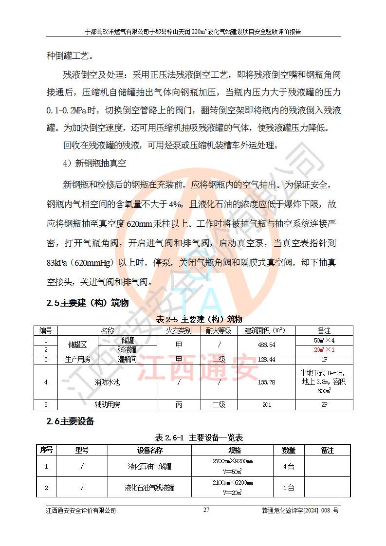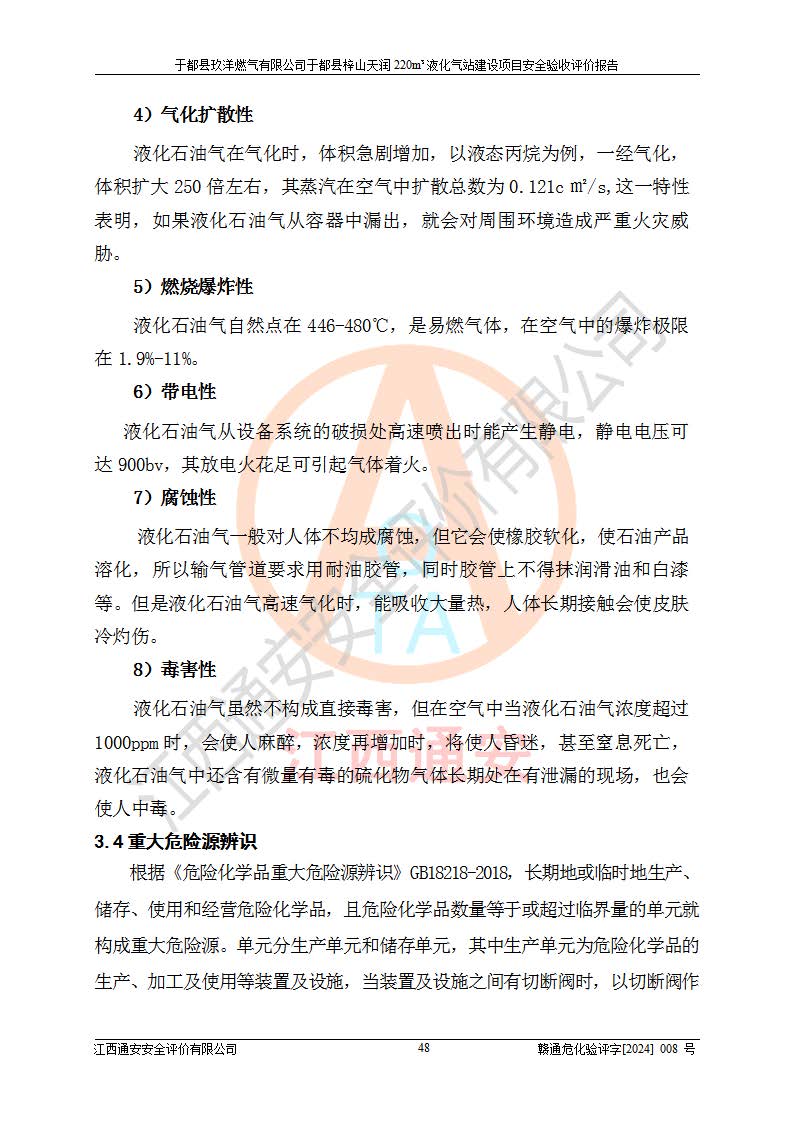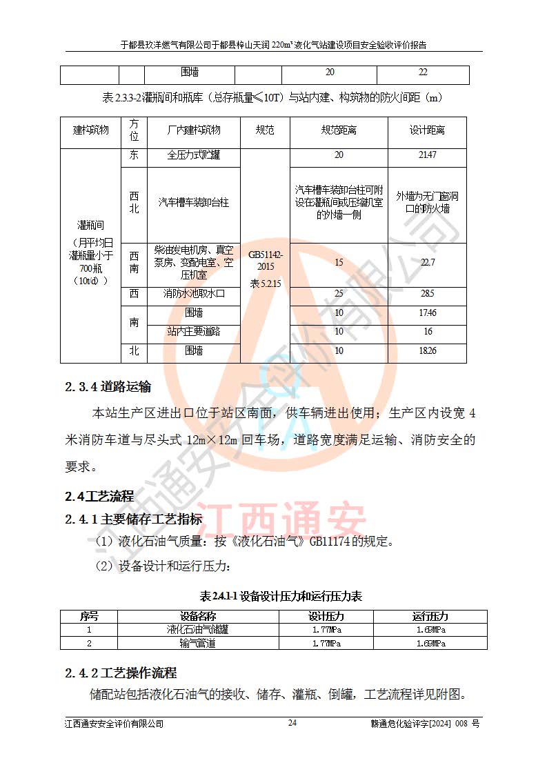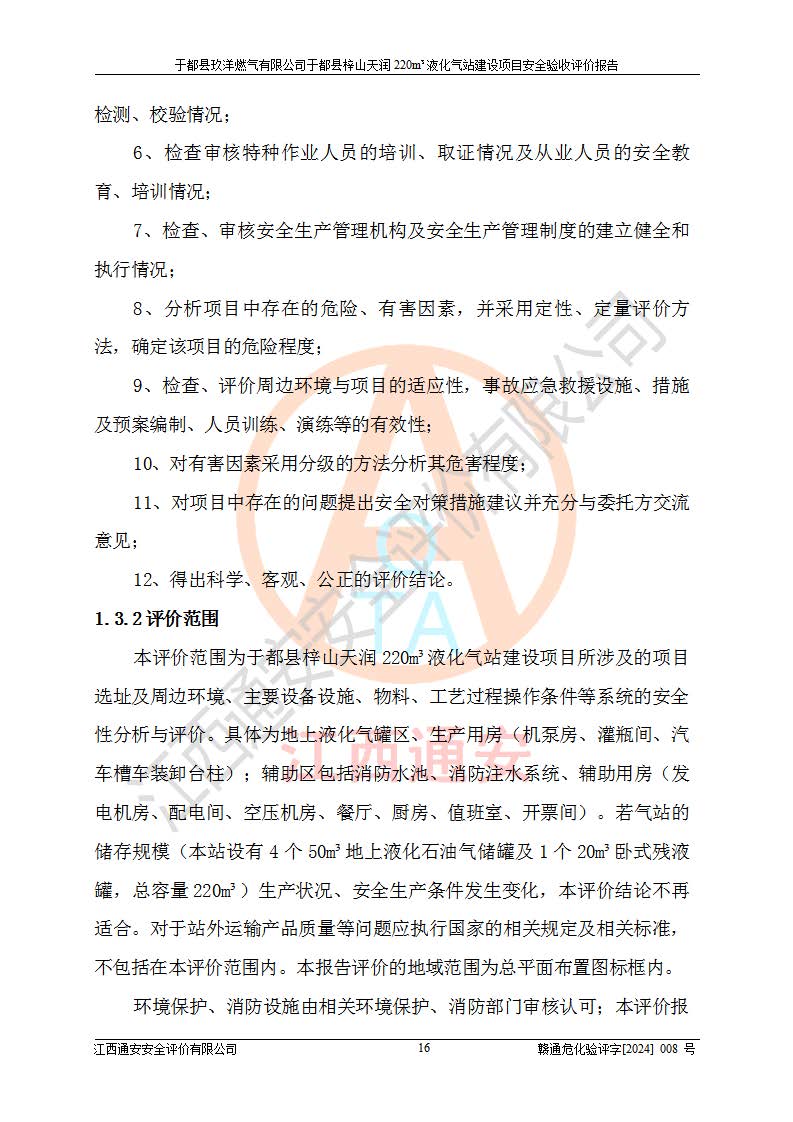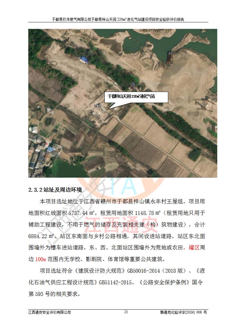 項(xiàng)目簡介 | 于都縣玖洋燃?xì)庥邢薰臼浅闪⒂?/span>2022年03月04日,是從事燃?xì)饨?jīng)營(憑**燃?xì)饨?jīng)營許可證經(jīng)營)、燃?xì)馄骶呒芭浼N售的自然人獨(dú)資的有限責(zé)任公司。于都縣玖洋燃?xì)庥邢薰居诙伎h梓山天潤220m3液化氣站位于江西省贛州市于都縣梓山鎮(zhèn)永豐村王屋組。用地面積為6884.2㎡(項(xiàng)目用地面積紅線面積5737.44㎡,租賃用地面積1148.78㎡,租賃用地只用于輔助工程建設(shè),不用于燃?xì)獾膬?chǔ)存及充裝相關(guān)建(構(gòu))筑物建設(shè))。該站設(shè)有4個(gè)50m3地上液化石油氣儲(chǔ)罐及1個(gè)20m3臥式殘液罐,總?cè)萘?/span>220m3,根據(jù)《液化石油氣供應(yīng)工程設(shè)計(jì)規(guī)范》GB51142-2015表 3.0.12對液化石油氣供應(yīng)站等級(jí)的劃分,該站為六級(jí)液化石油氣供應(yīng)站。主要經(jīng)營的鋼瓶液化氣供應(yīng)于都縣附近居民,月平均日灌瓶量小于700瓶(10t/d)。 于都縣玖洋燃?xì)庥邢薰居诙伎h梓山天潤220m3液化氣站位于江西省贛州市于都縣梓山鎮(zhèn)永豐村王屋組,法人**為藍(lán)建強(qiáng),注冊資本貳**元整,成立時(shí)間2022年03月04日,許可項(xiàng)目:燃?xì)饨?jīng)營,于2022年08月30日已取得贛州市行政審批局出具的《關(guān)于核準(zhǔn)于都縣梓山天潤220m3液化氣站建設(shè)項(xiàng)目的批復(fù)》(項(xiàng)目代碼為:2208-360700-04-01-805994)。項(xiàng)目于2023年7月已委托江西省化學(xué)工業(yè)設(shè)計(jì)院出具的《安全設(shè)施設(shè)計(jì)》,于2023年9月8 日完成土建施工以及設(shè)備安裝,《氣瓶充裝許可證》已與2024年01月16日取得,由江西省市場監(jiān)督管理局發(fā)證。編號(hào)為TS4236291-2028,《燃?xì)饨?jīng)營許可證》待驗(yàn)收達(dá)標(biāo)后方可辦理。 根據(jù)《中華人民共和國安全生產(chǎn)法》(中華人民共和國主席令第13號(hào),第88號(hào)修改[2021修訂])、《城鎮(zhèn)燃?xì)夤芾項(xiàng)l例》(***令第583號(hào))、《江西省城鎮(zhèn)燃?xì)饨?jīng)營許可證管理辦法》( 2003年8月31日江西省人民**令第123號(hào)公布 2014年1月30日江西省人民**令第210號(hào)**次修正 2019年11月27日江西省人民**令第242號(hào)第二次修正)及《建設(shè)項(xiàng)目安全設(shè)施“三同時(shí)”監(jiān)督管理辦法》(**安監(jiān)總局令第36號(hào),77號(hào)令修訂)的要求,新建、改建、遷建、擴(kuò)建的城鎮(zhèn)燃?xì)饨ㄔO(shè)項(xiàng)目應(yīng)當(dāng)進(jìn)行進(jìn)行安全評價(jià)。 受于都縣玖洋燃?xì)庥邢薰镜奈?/span>, 江西通安安全評價(jià)有限公司承擔(dān)于都縣玖洋燃?xì)庥邢薰居诙伎h梓山天潤220m3液化氣站建設(shè)項(xiàng)目的安全驗(yàn)收評價(jià)工作,于2023年11月13日,組成評價(jià)小組到于都縣梓山天潤220m3液化氣站進(jìn)行了現(xiàn)場檢查。本次安全評價(jià),主要針對相關(guān)液化氣儲(chǔ)存、充裝項(xiàng)目進(jìn)行了類比調(diào)研后,依據(jù)**法律法規(guī)、標(biāo)準(zhǔn)規(guī)范及相關(guān)文件進(jìn)行安全驗(yàn)收評價(jià)。依據(jù)《安全評價(jià)通則》(AQ8001-2007)和《安全驗(yàn)收評價(jià)導(dǎo)則》(AQ8003-2007)編制本《安全驗(yàn)收評價(jià)報(bào)告》,并于形成評價(jià)報(bào)告,供建設(shè)單位、**部門參考。 | ||||