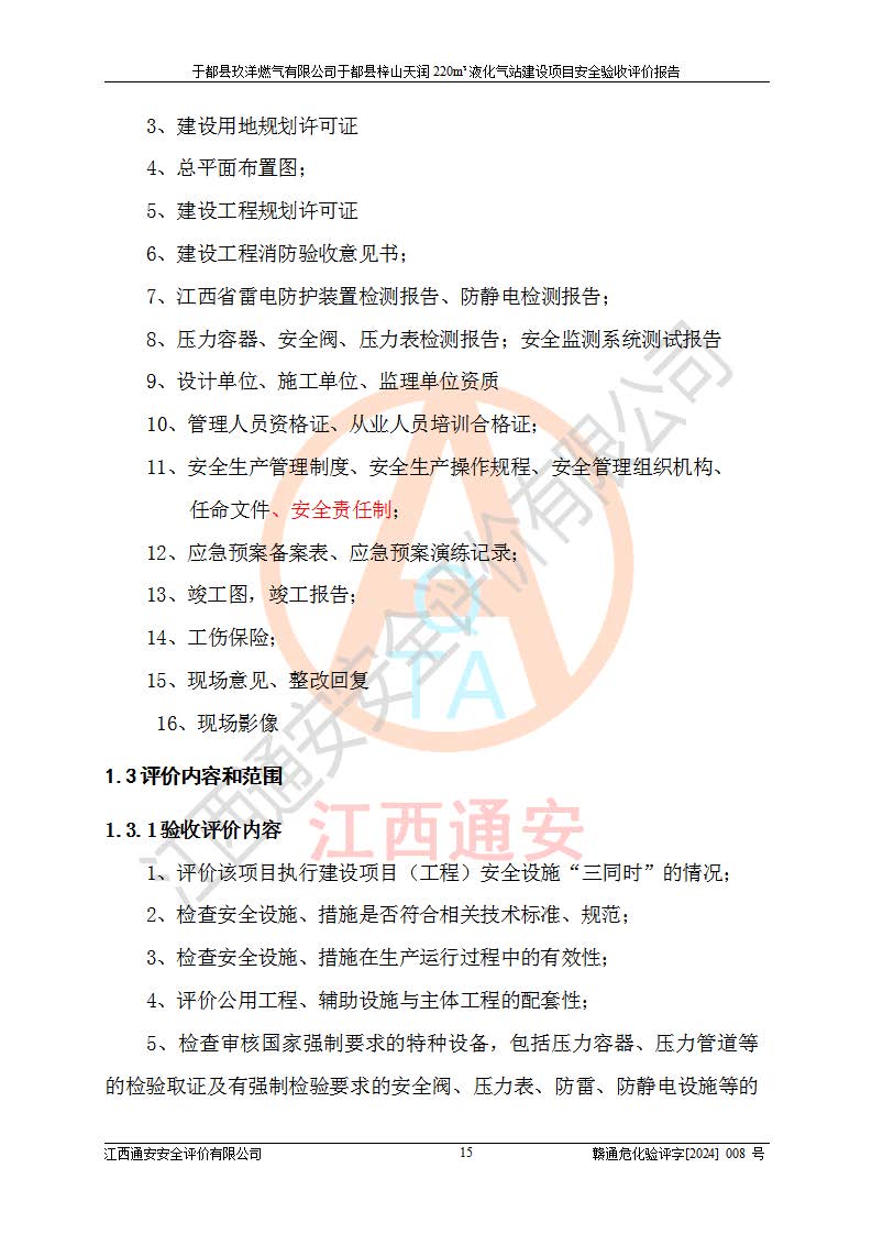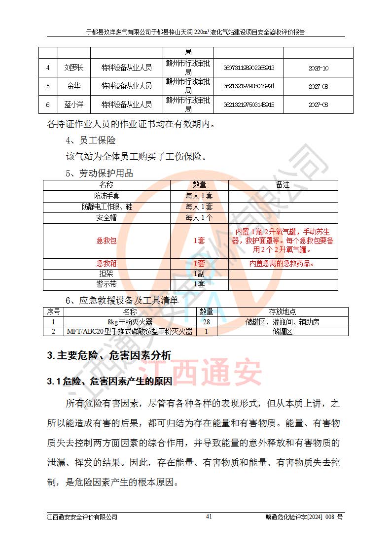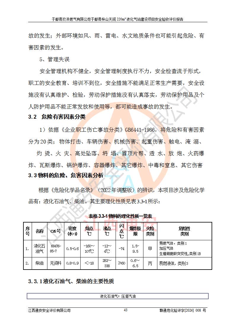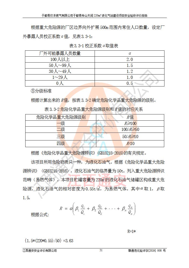 項(xiàng)目簡介 | 于都縣玖洋燃?xì)庥邢薰臼浅闪⒂?/span>2022年03月04日,是從事燃?xì)饨?jīng)營(憑**燃?xì)饨?jīng)營許可證經(jīng)營)、燃?xì)馄骶呒芭浼N售的自然人獨(dú)資的有限責(zé)任公司。于都縣玖洋燃?xì)庥邢薰居诙伎h梓山天潤220m3液化氣站位于江西省贛州市于都縣梓山鎮(zhèn)永豐村王屋組。用地面積為6884.2㎡(項(xiàng)目用地面積紅線面積5737.44㎡,租賃用地面積1148.78㎡,租賃用地只用于輔助工程建設(shè),不用于燃?xì)獾膬?chǔ)存及充裝相關(guān)建(構(gòu))筑物建設(shè))。該站設(shè)有4個(gè)50m3地上液化石油氣儲(chǔ)罐及1個(gè)20m3臥式殘液罐,總?cè)萘?/span>220m3,根據(jù)《液化石油氣供應(yīng)工程設(shè)計(jì)規(guī)范》GB51142-2015表 3.0.12對液化石油氣供應(yīng)站等級(jí)的劃分,該站為六級(jí)液化石油氣供應(yīng)站。主要經(jīng)營的鋼瓶液化氣供應(yīng)于都縣附近居民,月平均日灌瓶量小于700瓶(10t/d)。 于都縣玖洋燃?xì)庥邢薰居诙伎h梓山天潤220m3液化氣站位于江西省贛州市于都縣梓山鎮(zhèn)永豐村王屋組,法人**為藍(lán)建強(qiáng),注冊資本貳**元整,成立時(shí)間2022年03月04日,許可項(xiàng)目:燃?xì)饨?jīng)營,于2022年08月30日已取得贛州市行政審批局出具的《關(guān)于核準(zhǔn)于都縣梓山天潤220m3液化氣站建設(shè)項(xiàng)目的批復(fù)》(項(xiàng)目代碼為:2208-360700-04-01-805994)。項(xiàng)目于2023年7月已委托江西省化學(xué)工業(yè)設(shè)計(jì)院出具的《安全設(shè)施設(shè)計(jì)》,于2023年9月8 日完成土建施工以及設(shè)備安裝,《氣瓶充裝許可證》已與2024年01月16日取得,由江西省市場監(jiān)督管理局發(fā)證。編號(hào)為TS4236291-2028,《燃?xì)饨?jīng)營許可證》待驗(yàn)收達(dá)標(biāo)后方可辦理。 根據(jù)《中華人民共和國安全生產(chǎn)法》(中華人民共和國主席令第13號(hào),第88號(hào)修改[2021修訂])、《城鎮(zhèn)燃?xì)夤芾項(xiàng)l例》(***令第583號(hào))、《江西省城鎮(zhèn)燃?xì)饨?jīng)營許可證管理辦法》( 2003年8月31日江西省人民**令第123號(hào)公布 2014年1月30日江西省人民**令第210號(hào)**次修正 2019年11月27日江西省人民**令第242號(hào)第二次修正)及《建設(shè)項(xiàng)目安全設(shè)施“三同時(shí)”監(jiān)督管理辦法》(**安監(jiān)總局令第36號(hào),77號(hào)令修訂)的要求,新建、改建、遷建、擴(kuò)建的城鎮(zhèn)燃?xì)饨ㄔO(shè)項(xiàng)目應(yīng)當(dāng)進(jìn)行進(jìn)行安全評價(jià)。 受于都縣玖洋燃?xì)庥邢薰镜奈?/span>, 江西通安安全評價(jià)有限公司承擔(dān)于都縣玖洋燃?xì)庥邢薰居诙伎h梓山天潤220m3液化氣站建設(shè)項(xiàng)目的安全驗(yàn)收評價(jià)工作,于2023年11月13日,組成評價(jià)小組到于都縣梓山天潤220m3液化氣站進(jìn)行了現(xiàn)場檢查。本次安全評價(jià),主要針對相關(guān)液化氣儲(chǔ)存、充裝項(xiàng)目進(jìn)行了類比調(diào)研后,依據(jù)**法律法規(guī)、標(biāo)準(zhǔn)規(guī)范及相關(guān)文件進(jìn)行安全驗(yàn)收評價(jià)。依據(jù)《安全評價(jià)通則》(AQ8001-2007)和《安全驗(yàn)收評價(jià)導(dǎo)則》(AQ8003-2007)編制本《安全驗(yàn)收評價(jià)報(bào)告》,并于形成評價(jià)報(bào)告,供建設(shè)單位、**部門參考。 | ||||