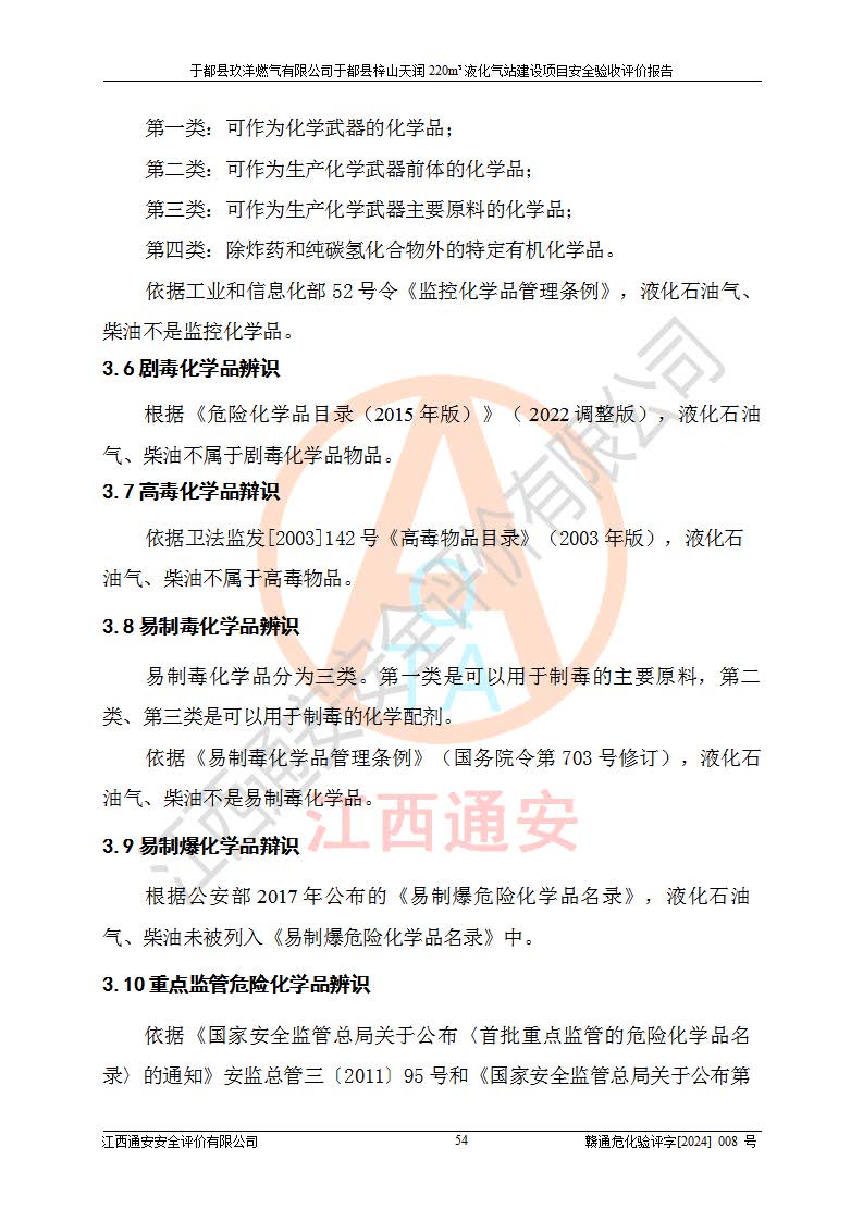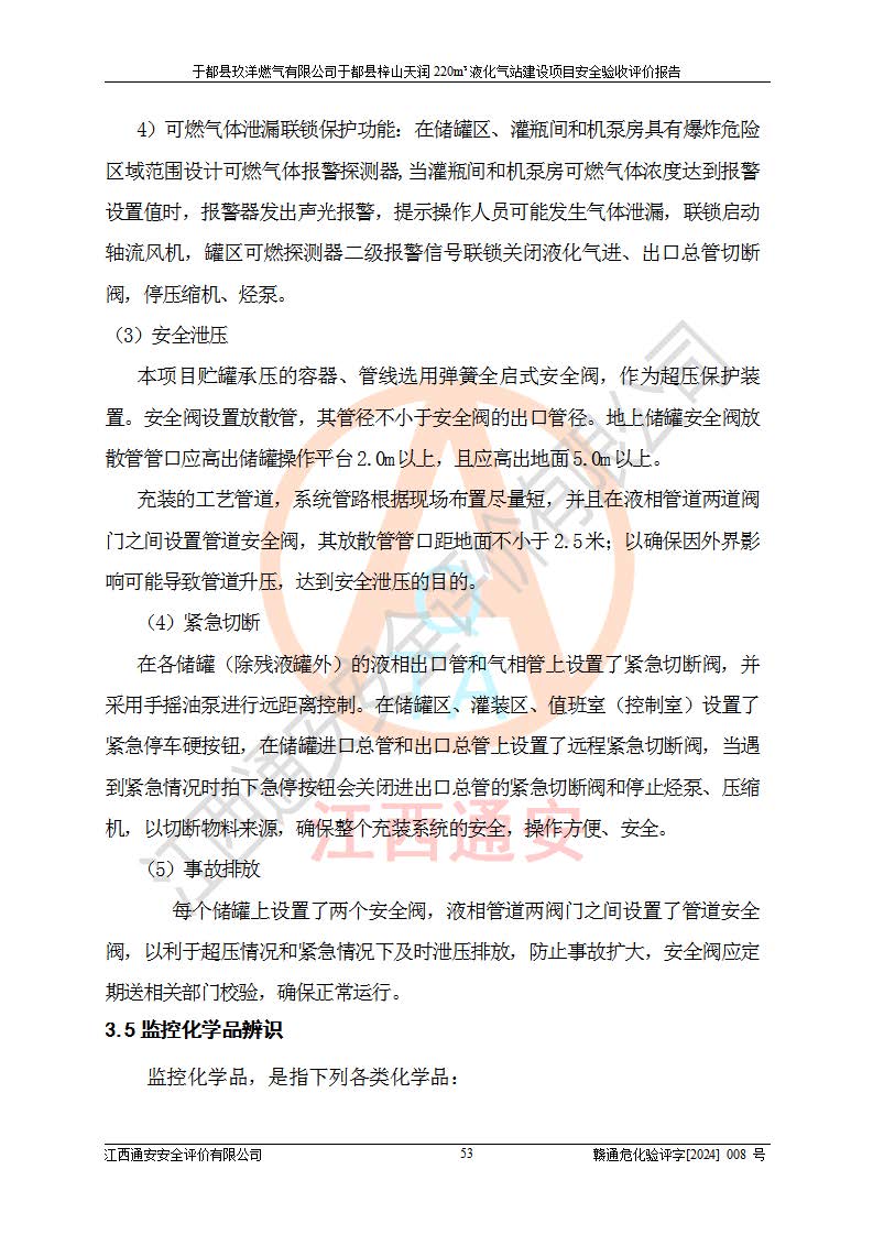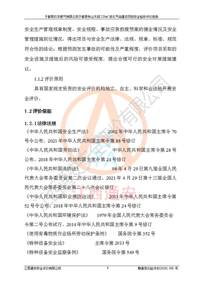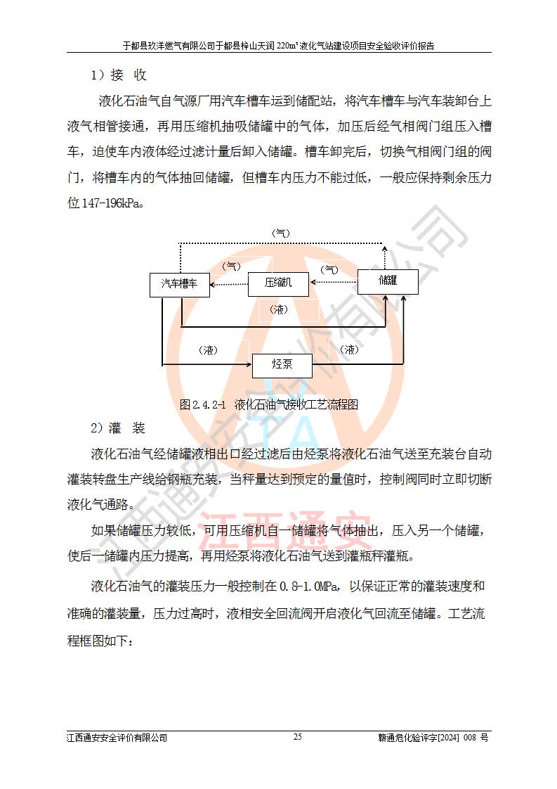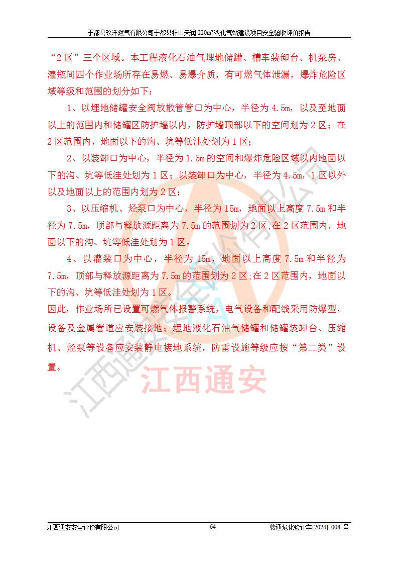 項(xiàng)目簡介 | 于都縣玖洋燃?xì)庥邢薰臼浅闪⒂?/span>2022年03月04日,是從事燃?xì)饨?jīng)營(憑**燃?xì)饨?jīng)營許可證經(jīng)營)、燃?xì)馄骶呒芭浼N售的自然人獨(dú)資的有限責(zé)任公司。于都縣玖洋燃?xì)庥邢薰居诙伎h梓山天潤220m3液化氣站位于江西省贛州市于都縣梓山鎮(zhèn)永豐村王屋組。用地面積為6884.2㎡(項(xiàng)目用地面積紅線面積5737.44㎡,租賃用地面積1148.78㎡,租賃用地只用于輔助工程建設(shè),不用于燃?xì)獾膬?chǔ)存及充裝相關(guān)建(構(gòu))筑物建設(shè))。該站設(shè)有4個(gè)50m3地上液化石油氣儲(chǔ)罐及1個(gè)20m3臥式殘液罐,總?cè)萘?/span>220m3,根據(jù)《液化石油氣供應(yīng)工程設(shè)計(jì)規(guī)范》GB51142-2015表 3.0.12對液化石油氣供應(yīng)站等級(jí)的劃分,該站為六級(jí)液化石油氣供應(yīng)站。主要經(jīng)營的鋼瓶液化氣供應(yīng)于都縣附近居民,月平均日灌瓶量小于700瓶(10t/d)。 于都縣玖洋燃?xì)庥邢薰居诙伎h梓山天潤220m3液化氣站位于江西省贛州市于都縣梓山鎮(zhèn)永豐村王屋組,法人**為藍(lán)建強(qiáng),注冊資本貳**元整,成立時(shí)間2022年03月04日,許可項(xiàng)目:燃?xì)饨?jīng)營,于2022年08月30日已取得贛州市行政審批局出具的《關(guān)于核準(zhǔn)于都縣梓山天潤220m3液化氣站建設(shè)項(xiàng)目的批復(fù)》(項(xiàng)目代碼為:2208-360700-04-01-805994)。項(xiàng)目于2023年7月已委托江西省化學(xué)工業(yè)設(shè)計(jì)院出具的《安全設(shè)施設(shè)計(jì)》,于2023年9月8 日完成土建施工以及設(shè)備安裝,《氣瓶充裝許可證》已與2024年01月16日取得,由江西省市場監(jiān)督管理局發(fā)證。編號(hào)為TS4236291-2028,《燃?xì)饨?jīng)營許可證》待驗(yàn)收達(dá)標(biāo)后方可辦理。 根據(jù)《中華人民共和國安全生產(chǎn)法》(中華人民共和國主席令第13號(hào),第88號(hào)修改[2021修訂])、《城鎮(zhèn)燃?xì)夤芾項(xiàng)l例》(***令第583號(hào))、《江西省城鎮(zhèn)燃?xì)饨?jīng)營許可證管理辦法》( 2003年8月31日江西省人民**令第123號(hào)公布 2014年1月30日江西省人民**令第210號(hào)**次修正 2019年11月27日江西省人民**令第242號(hào)第二次修正)及《建設(shè)項(xiàng)目安全設(shè)施“三同時(shí)”監(jiān)督管理辦法》(**安監(jiān)總局令第36號(hào),77號(hào)令修訂)的要求,新建、改建、遷建、擴(kuò)建的城鎮(zhèn)燃?xì)饨ㄔO(shè)項(xiàng)目應(yīng)當(dāng)進(jìn)行進(jìn)行安全評價(jià)。 受于都縣玖洋燃?xì)庥邢薰镜奈?/span>, 江西通安安全評價(jià)有限公司承擔(dān)于都縣玖洋燃?xì)庥邢薰居诙伎h梓山天潤220m3液化氣站建設(shè)項(xiàng)目的安全驗(yàn)收評價(jià)工作,于2023年11月13日,組成評價(jià)小組到于都縣梓山天潤220m3液化氣站進(jìn)行了現(xiàn)場檢查。本次安全評價(jià),主要針對相關(guān)液化氣儲(chǔ)存、充裝項(xiàng)目進(jìn)行了類比調(diào)研后,依據(jù)**法律法規(guī)、標(biāo)準(zhǔn)規(guī)范及相關(guān)文件進(jìn)行安全驗(yàn)收評價(jià)。依據(jù)《安全評價(jià)通則》(AQ8001-2007)和《安全驗(yàn)收評價(jià)導(dǎo)則》(AQ8003-2007)編制本《安全驗(yàn)收評價(jià)報(bào)告》,并于形成評價(jià)報(bào)告,供建設(shè)單位、**部門參考。 | ||||