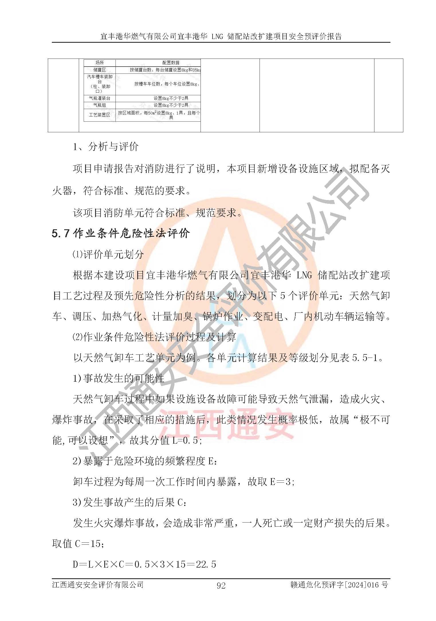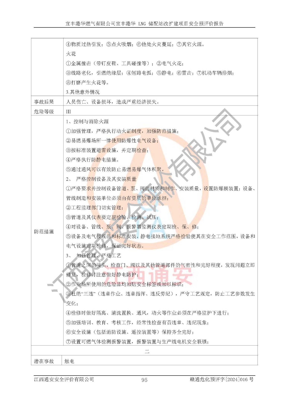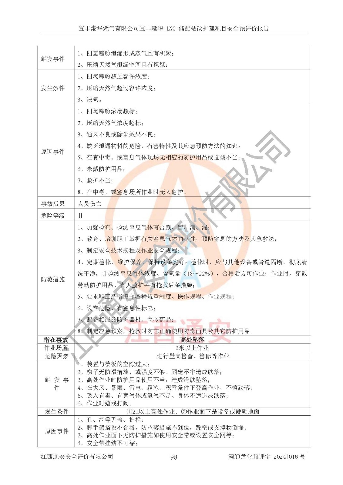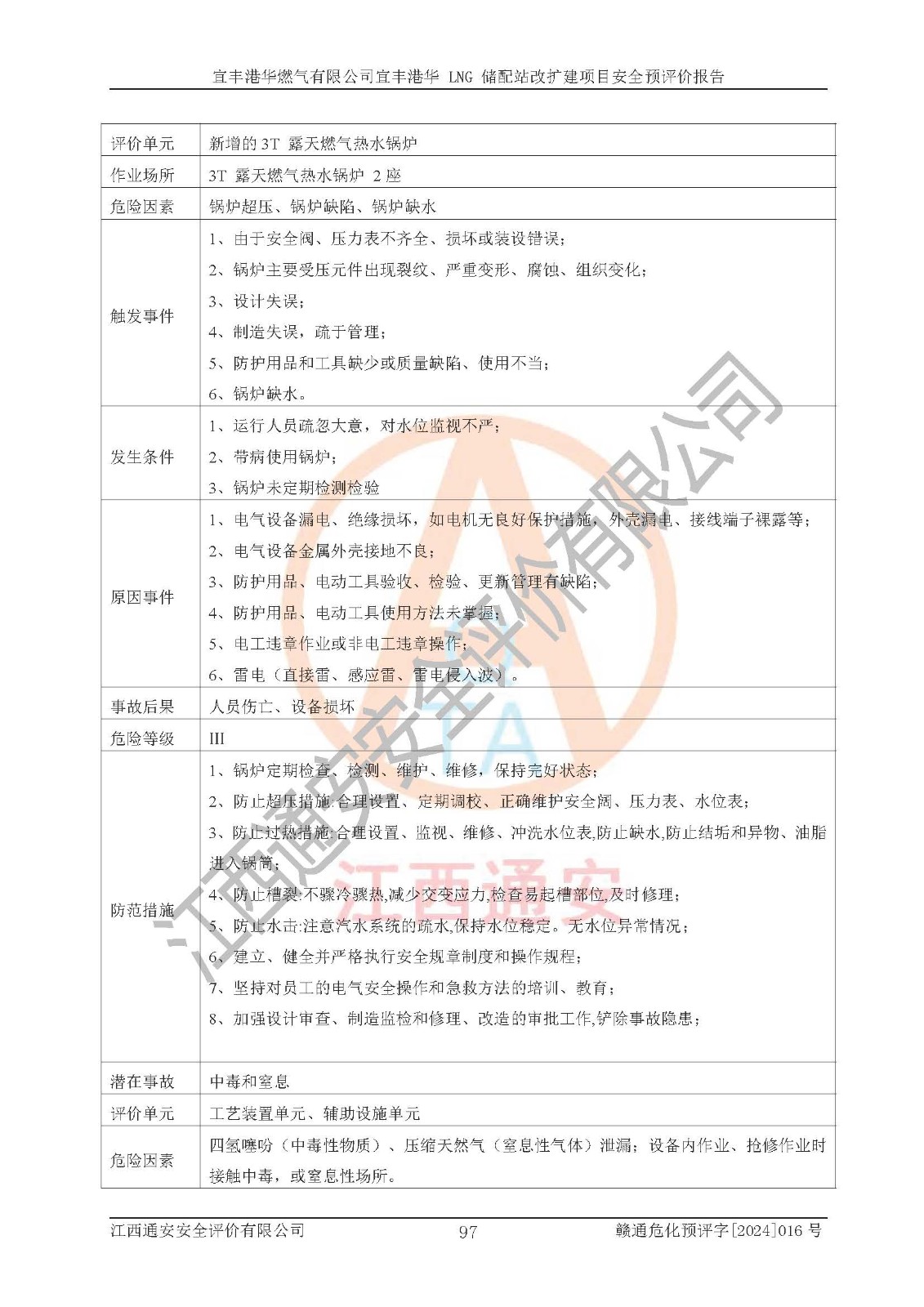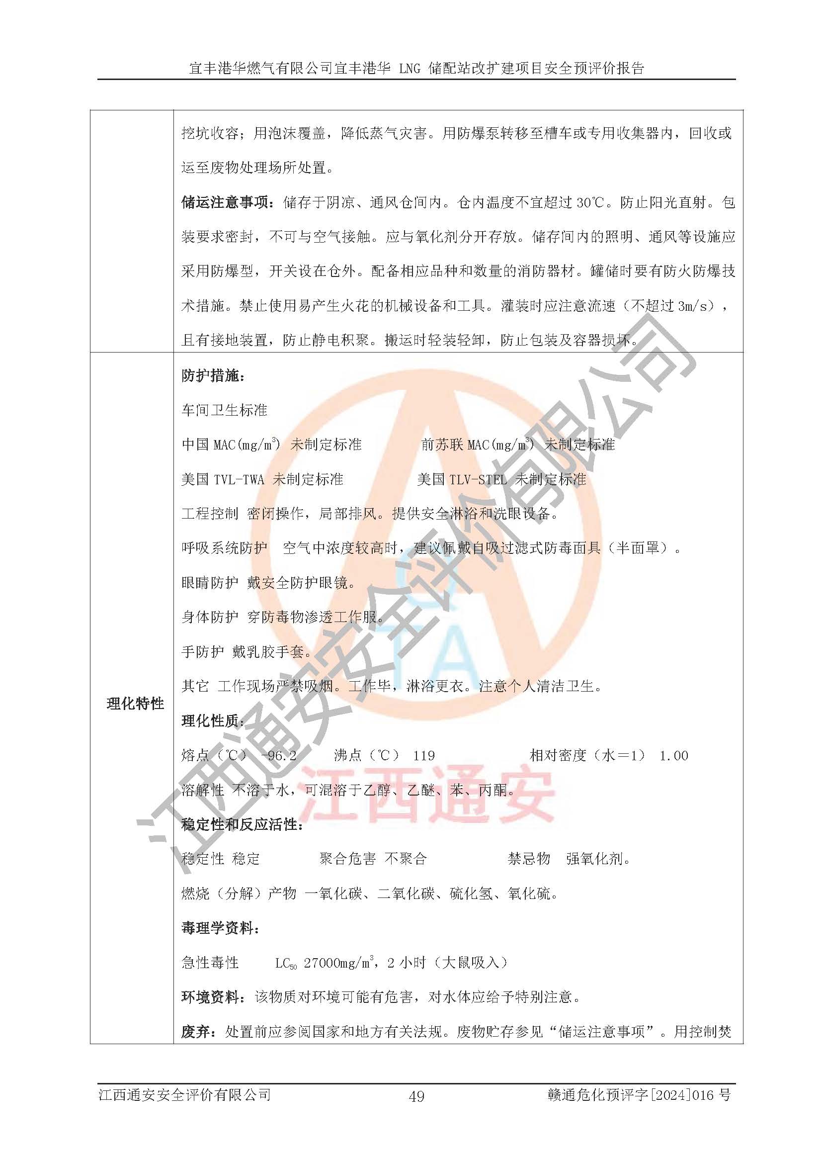 其它 | 1、該項(xiàng)目運(yùn)行過程中的主要危險(xiǎn)、有害物質(zhì)有天然氣、四氫噻吩(加臭劑)、柴油等。 2、本項(xiàng)目運(yùn)行過程存在的主要危險(xiǎn)因素為火災(zāi)、爆炸、鍋爐爆炸、中毒和窒息、觸電、灼燙、高處墜落、**傷害、物體打擊、機(jī)械傷害等;有害因素有有毒物質(zhì)、高溫、噪聲等。 3、該項(xiàng)目所在區(qū)域存在的自然危險(xiǎn)、有害因素有地震、雷擊、暴雨等。 4、按《危險(xiǎn)化學(xué)品重大危險(xiǎn)源辨識(shí)》(GB18218-2018)的規(guī)定,該項(xiàng)目不構(gòu)成危險(xiǎn)化學(xué)品重大危險(xiǎn)源。 5、經(jīng)辨識(shí),該項(xiàng)目涉及的天然氣屬于重點(diǎn)監(jiān)管的危險(xiǎn)化學(xué)品,不涉及劇毒化學(xué)品、易制毒化學(xué)品、監(jiān)控化學(xué)品和易制爆化學(xué)品 9、該項(xiàng)目站場(chǎng)周邊環(huán)境防火間距符合標(biāo)準(zhǔn)、規(guī)范要求,選址符合法律法規(guī)等的規(guī)定和要求。 10、該項(xiàng)目總平面布置、工藝裝置區(qū)、自動(dòng)控制等符合標(biāo)準(zhǔn)、規(guī)范的要求。 11、預(yù)先危險(xiǎn)性分析表明火災(zāi)、爆炸、鍋爐爆炸的危險(xiǎn)等級(jí)為Ⅲ級(jí),觸電、中毒與窒息等危險(xiǎn)有害因素的危險(xiǎn)等級(jí)均為Ⅱ級(jí)。 12、危險(xiǎn)度評(píng)價(jià)結(jié)果:工藝裝置區(qū)得分為14分,等級(jí)為Ⅱ級(jí),危險(xiǎn)程度為中度危險(xiǎn)。 該項(xiàng)目按照《安全生產(chǎn)法》、《城鎮(zhèn)燃?xì)夤芾項(xiàng)l例》、《建設(shè)項(xiàng)目安全設(shè)施“三同時(shí)”監(jiān)督管理辦法》等法律法規(guī)的規(guī)定和要求進(jìn)行安全預(yù)評(píng)價(jià),保障了建設(shè)項(xiàng)目安全設(shè)施與主體工程同時(shí)設(shè)計(jì)、同時(shí)施工、同時(shí)投入生產(chǎn)和使用的“三同時(shí)”的要求。 該項(xiàng)目在下一步的設(shè)計(jì)、施工中,建設(shè)單位應(yīng)認(rèn)真執(zhí)行**的有關(guān)法律、法規(guī)、標(biāo)準(zhǔn)、規(guī)范,將本報(bào)告提出的安全措施落實(shí)到位;完善各項(xiàng)安全規(guī)章制度、事故應(yīng)急預(yù)案,并認(rèn)真的學(xué)習(xí)和演練;在生產(chǎn)運(yùn)行過程中,保障各項(xiàng)安全設(shè)施可靠,**;操作人員嚴(yán)格執(zhí)行安全操作規(guī)程,該項(xiàng)目的危險(xiǎn)是可以得到**控制的,項(xiàng)目建成后的安全運(yùn)行是有保障的。 結(jié)論:宜豐港華燃?xì)庥邢薰疽素S港華 LNG 儲(chǔ)配站改擴(kuò)建項(xiàng)目的危險(xiǎn)、有害因素可得到**控制,風(fēng)險(xiǎn)在可接受范圍內(nèi),本建設(shè)項(xiàng)目從安全方面分析可行,風(fēng)險(xiǎn)程度在可以接受范圍內(nèi)。