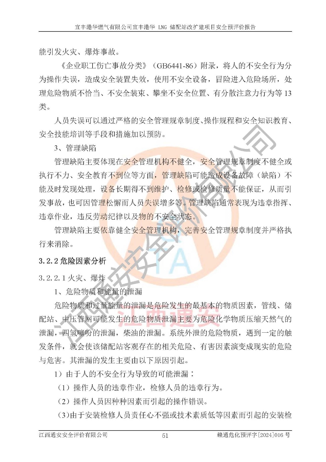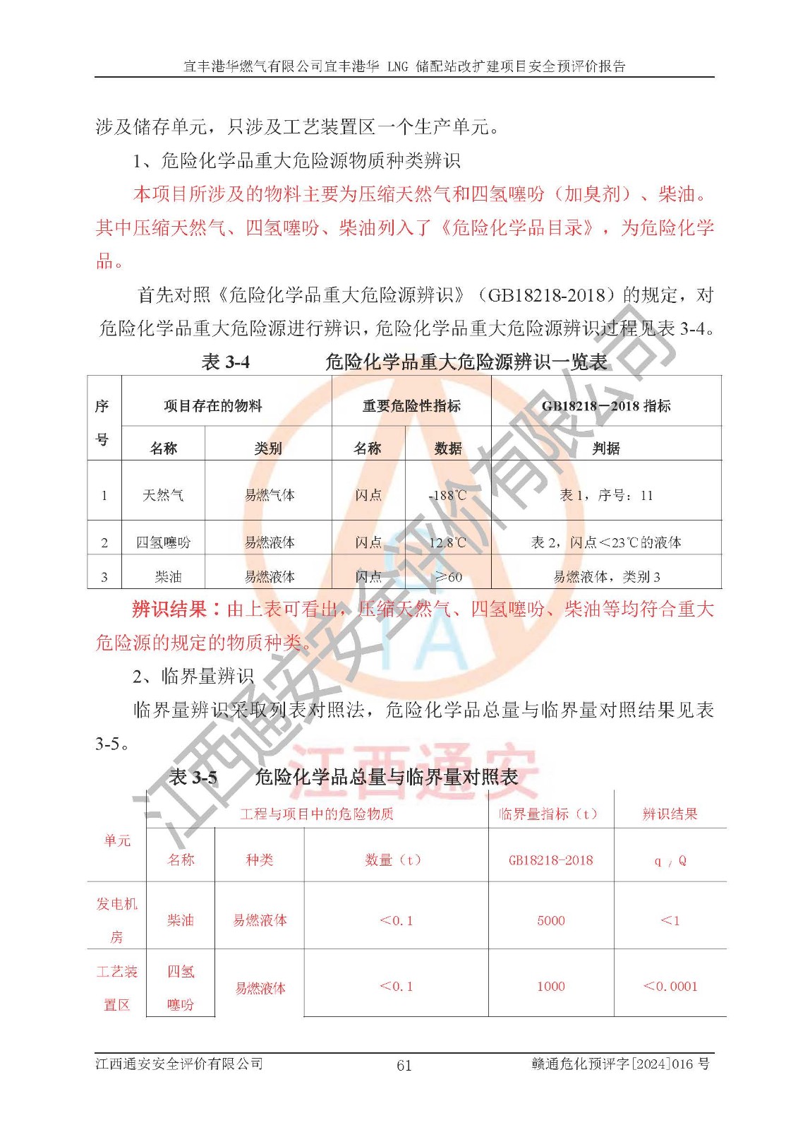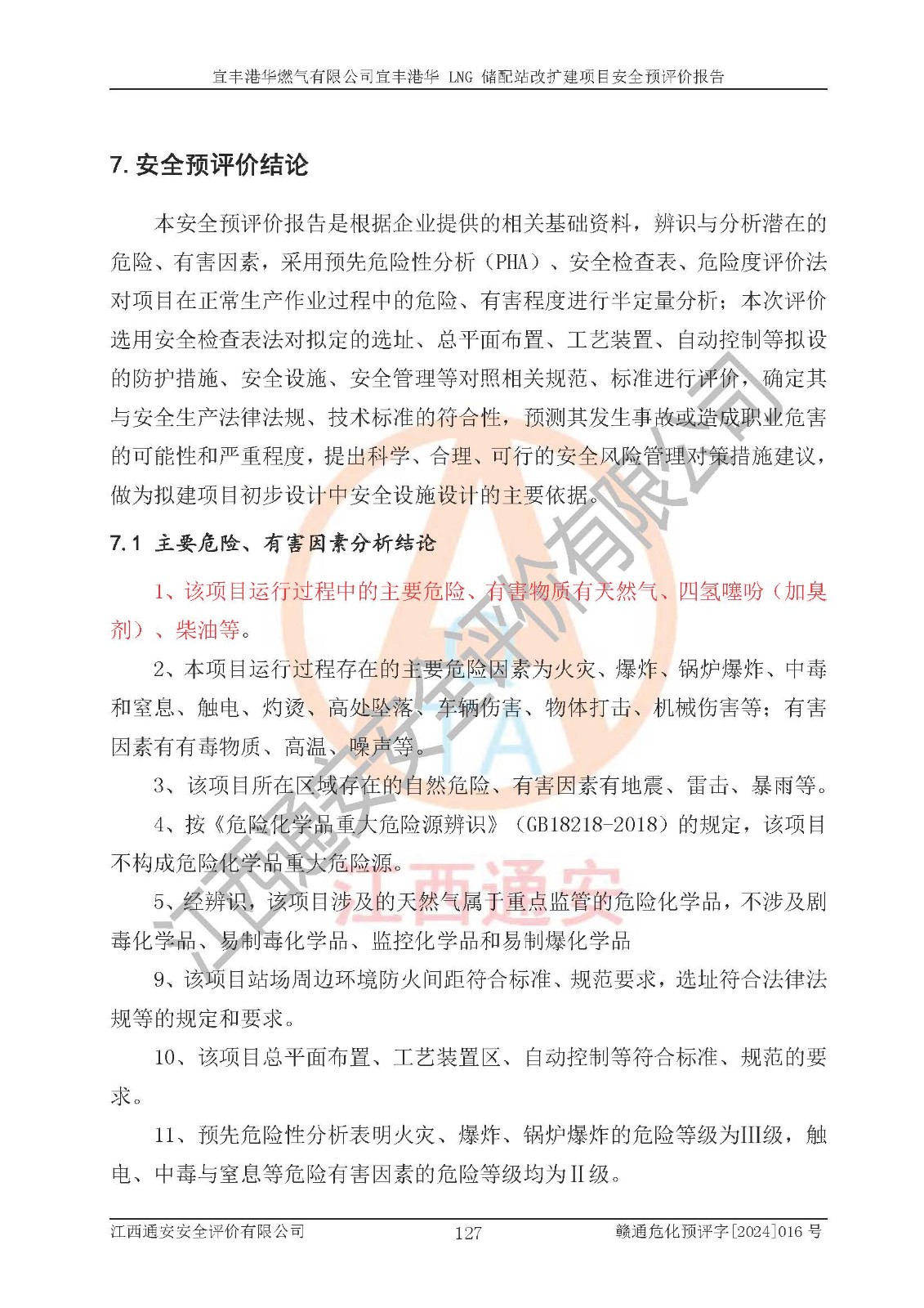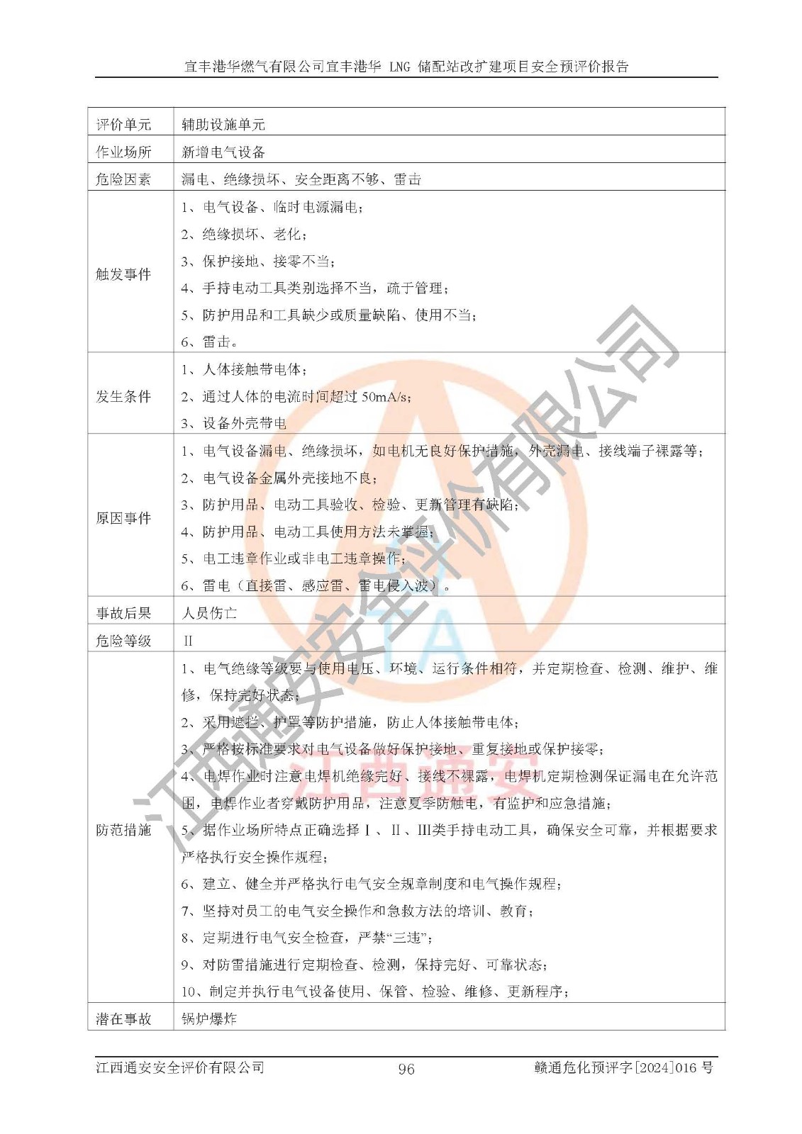其它 | 1、該項(xiàng)目運(yùn)行過程中的主要危險(xiǎn)、有害物質(zhì)有天然氣、四氫噻吩(加臭劑)、柴油等。 2、本項(xiàng)目運(yùn)行過程存在的主要危險(xiǎn)因素為火災(zāi)、爆炸、鍋爐爆炸、中毒和窒息、觸電、灼燙、高處墜落、**傷害、物體打擊、機(jī)械傷害等;有害因素有有毒物質(zhì)、高溫、噪聲等。 3、該項(xiàng)目所在區(qū)域存在的自然危險(xiǎn)、有害因素有地震、雷擊、暴雨等。 4、按《危險(xiǎn)化學(xué)品重大危險(xiǎn)源辨識(shí)》(GB18218-2018)的規(guī)定,該項(xiàng)目不構(gòu)成危險(xiǎn)化學(xué)品重大危險(xiǎn)源。 5、經(jīng)辨識(shí),該項(xiàng)目涉及的天然氣屬于重點(diǎn)監(jiān)管的危險(xiǎn)化學(xué)品,不涉及劇毒化學(xué)品、易制毒化學(xué)品、監(jiān)控化學(xué)品和易制爆化學(xué)品 9、該項(xiàng)目站場(chǎng)周邊環(huán)境防火間距符合標(biāo)準(zhǔn)、規(guī)范要求,選址符合法律法規(guī)等的規(guī)定和要求。 10、該項(xiàng)目總平面布置、工藝裝置區(qū)、自動(dòng)控制等符合標(biāo)準(zhǔn)、規(guī)范的要求。 11、預(yù)先危險(xiǎn)性分析表明火災(zāi)、爆炸、鍋爐爆炸的危險(xiǎn)等級(jí)為Ⅲ級(jí),觸電、中毒與窒息等危險(xiǎn)有害因素的危險(xiǎn)等級(jí)均為Ⅱ級(jí)。 12、危險(xiǎn)度評(píng)價(jià)結(jié)果:工藝裝置區(qū)得分為14分,等級(jí)為Ⅱ級(jí),危險(xiǎn)程度為中度危險(xiǎn)。 該項(xiàng)目按照《安全生產(chǎn)法》、《城鎮(zhèn)燃?xì)夤芾項(xiàng)l例》、《建設(shè)項(xiàng)目安全設(shè)施“三同時(shí)”監(jiān)督管理辦法》等法律法規(guī)的規(guī)定和要求進(jìn)行安全預(yù)評(píng)價(jià),保障了建設(shè)項(xiàng)目安全設(shè)施與主體工程同時(shí)設(shè)計(jì)、同時(shí)施工、同時(shí)投入生產(chǎn)和使用的“三同時(shí)”的要求。 該項(xiàng)目在下一步的設(shè)計(jì)、施工中,建設(shè)單位應(yīng)認(rèn)真執(zhí)行**的有關(guān)法律、法規(guī)、標(biāo)準(zhǔn)、規(guī)范,將本報(bào)告提出的安全措施落實(shí)到位;完善各項(xiàng)安全規(guī)章制度、事故應(yīng)急預(yù)案,并認(rèn)真的學(xué)習(xí)和演練;在生產(chǎn)運(yùn)行過程中,保障各項(xiàng)安全設(shè)施可靠,**;操作人員嚴(yán)格執(zhí)行安全操作規(guī)程,該項(xiàng)目的危險(xiǎn)是可以得到**控制的,項(xiàng)目建成后的安全運(yùn)行是有保障的。 結(jié)論:宜豐港華燃?xì)庥邢薰疽素S港華 LNG 儲(chǔ)配站改擴(kuò)建項(xiàng)目的危險(xiǎn)、有害因素可得到**控制,風(fēng)險(xiǎn)在可接受范圍內(nèi),本建設(shè)項(xiàng)目從安全方面分析可行,風(fēng)險(xiǎn)程度在可以接受范圍內(nèi)。