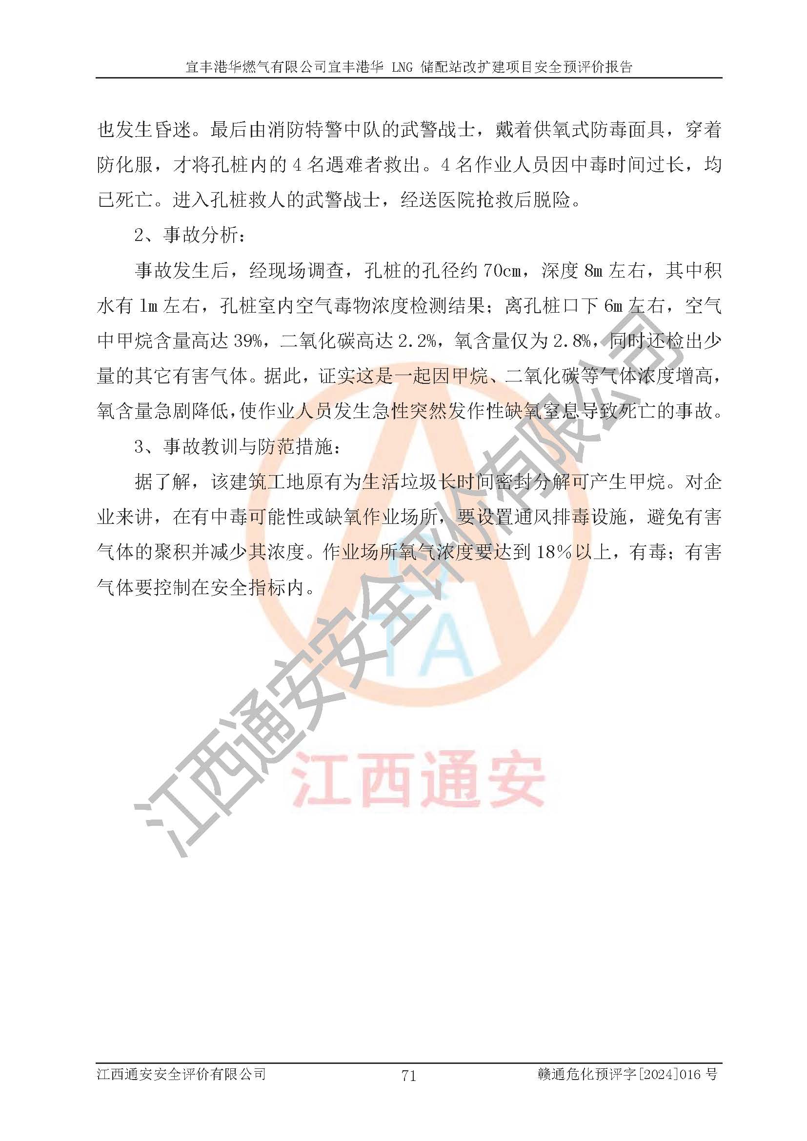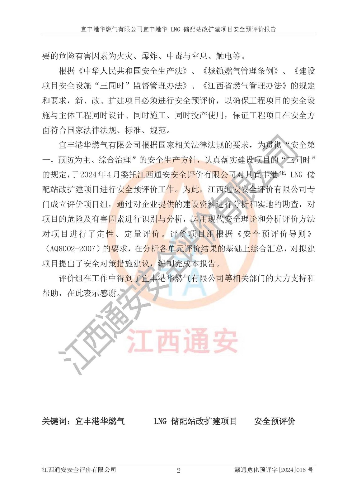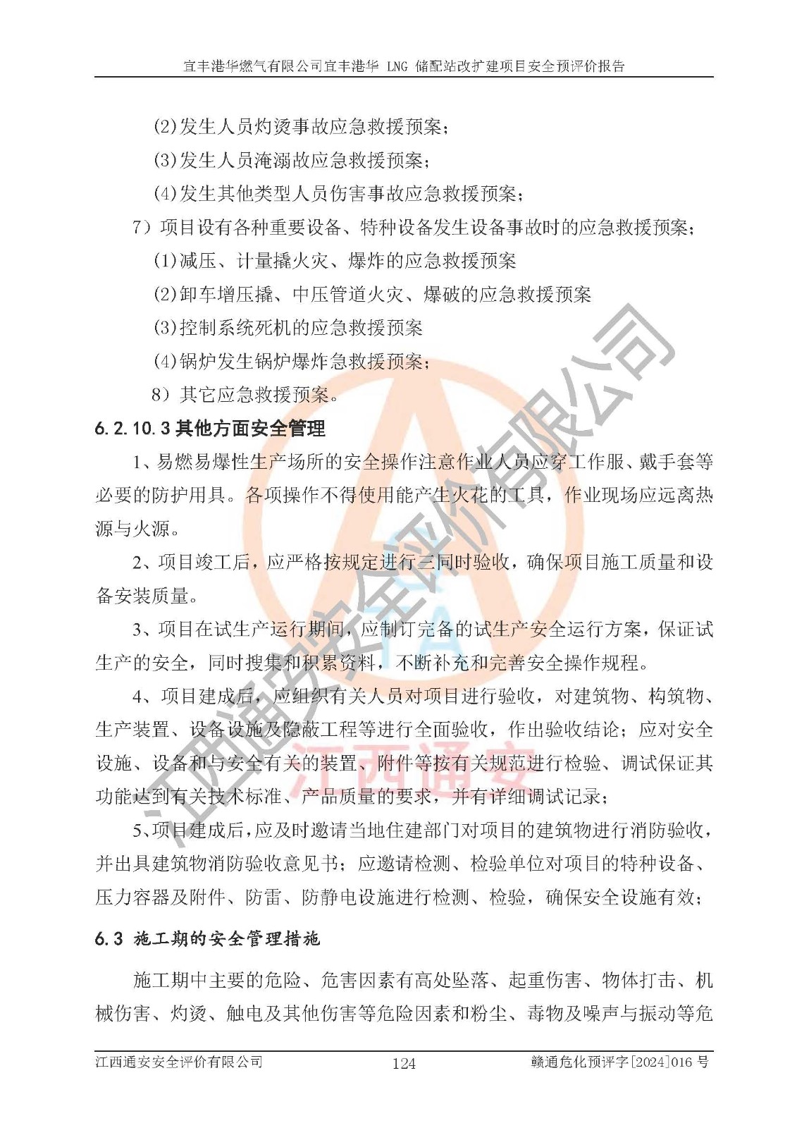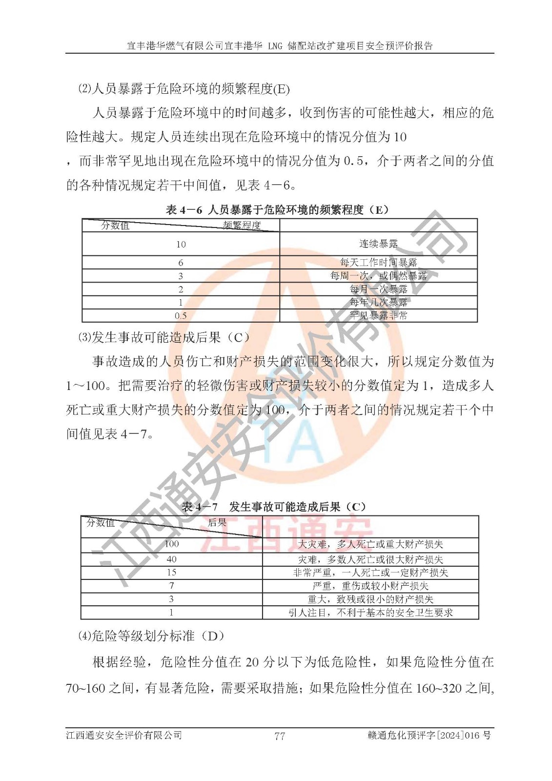 其它 | 1、該項(xiàng)目運(yùn)行過程中的主要危險(xiǎn)、有害物質(zhì)有天然氣、四氫噻吩(加臭劑)、柴油等。 2、本項(xiàng)目運(yùn)行過程存在的主要危險(xiǎn)因素為火災(zāi)、爆炸、鍋爐爆炸、中毒和窒息、觸電、灼燙、高處墜落、**傷害、物體打擊、機(jī)械傷害等;有害因素有有毒物質(zhì)、高溫、噪聲等。 3、該項(xiàng)目所在區(qū)域存在的自然危險(xiǎn)、有害因素有地震、雷擊、暴雨等。 4、按《危險(xiǎn)化學(xué)品重大危險(xiǎn)源辨識(shí)》(GB18218-2018)的規(guī)定,該項(xiàng)目不構(gòu)成危險(xiǎn)化學(xué)品重大危險(xiǎn)源。 5、經(jīng)辨識(shí),該項(xiàng)目涉及的天然氣屬于重點(diǎn)監(jiān)管的危險(xiǎn)化學(xué)品,不涉及劇毒化學(xué)品、易制毒化學(xué)品、監(jiān)控化學(xué)品和易制爆化學(xué)品 9、該項(xiàng)目站場(chǎng)周邊環(huán)境防火間距符合標(biāo)準(zhǔn)、規(guī)范要求,選址符合法律法規(guī)等的規(guī)定和要求。 10、該項(xiàng)目總平面布置、工藝裝置區(qū)、自動(dòng)控制等符合標(biāo)準(zhǔn)、規(guī)范的要求。 11、預(yù)先危險(xiǎn)性分析表明火災(zāi)、爆炸、鍋爐爆炸的危險(xiǎn)等級(jí)為Ⅲ級(jí),觸電、中毒與窒息等危險(xiǎn)有害因素的危險(xiǎn)等級(jí)均為Ⅱ級(jí)。 12、危險(xiǎn)度評(píng)價(jià)結(jié)果:工藝裝置區(qū)得分為14分,等級(jí)為Ⅱ級(jí),危險(xiǎn)程度為中度危險(xiǎn)。 該項(xiàng)目按照《安全生產(chǎn)法》、《城鎮(zhèn)燃?xì)夤芾項(xiàng)l例》、《建設(shè)項(xiàng)目安全設(shè)施“三同時(shí)”監(jiān)督管理辦法》等法律法規(guī)的規(guī)定和要求進(jìn)行安全預(yù)評(píng)價(jià),保障了建設(shè)項(xiàng)目安全設(shè)施與主體工程同時(shí)設(shè)計(jì)、同時(shí)施工、同時(shí)投入生產(chǎn)和使用的“三同時(shí)”的要求。 該項(xiàng)目在下一步的設(shè)計(jì)、施工中,建設(shè)單位應(yīng)認(rèn)真執(zhí)行**的有關(guān)法律、法規(guī)、標(biāo)準(zhǔn)、規(guī)范,將本報(bào)告提出的安全措施落實(shí)到位;完善各項(xiàng)安全規(guī)章制度、事故應(yīng)急預(yù)案,并認(rèn)真的學(xué)習(xí)和演練;在生產(chǎn)運(yùn)行過程中,保障各項(xiàng)安全設(shè)施可靠,**;操作人員嚴(yán)格執(zhí)行安全操作規(guī)程,該項(xiàng)目的危險(xiǎn)是可以得到**控制的,項(xiàng)目建成后的安全運(yùn)行是有保障的。 結(jié)論:宜豐港華燃?xì)庥邢薰疽素S港華 LNG 儲(chǔ)配站改擴(kuò)建項(xiàng)目的危險(xiǎn)、有害因素可得到**控制,風(fēng)險(xiǎn)在可接受范圍內(nèi),本建設(shè)項(xiàng)目從安全方面分析可行,風(fēng)險(xiǎn)程度在可以接受范圍內(nèi)。