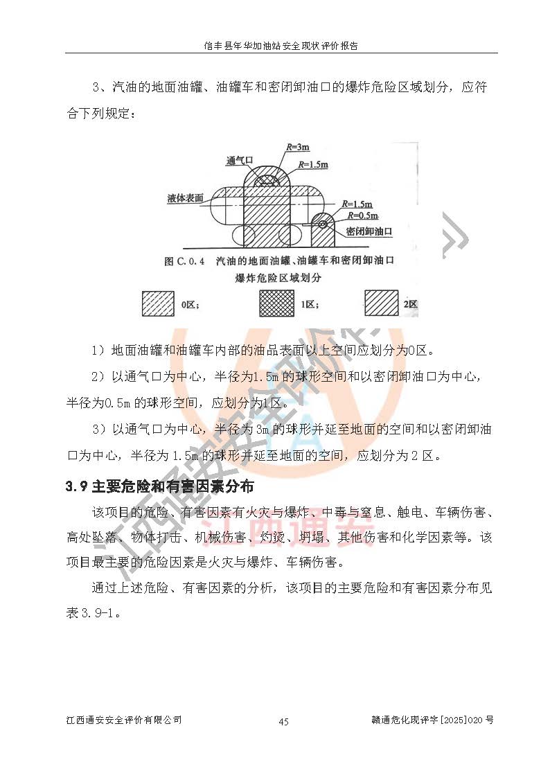 項(xiàng)目簡(jiǎn)介 | 信豐縣年華加油站位于贛州市信豐縣大阿鎮(zhèn)大阿圩,投資人為肖斌,現(xiàn)有員工4人,其中安全管理人員1人。該加油站2022年03月28日取得了危險(xiǎn)化學(xué)品經(jīng)營(yíng)許可證,登記編號(hào)為(贛)信行審危許字[2022]007號(hào),經(jīng)營(yíng)方式為零售,許可范圍為汽油、柴油,**期限為2022年05月15日至2025年05月14日。該加油站2022年04月02日取得了成品油零售經(jīng)營(yíng)批準(zhǔn)證書(shū),編號(hào)為油零售證書(shū)第虔0212號(hào),**期限為2022年03月21日至2027年03月20日。加油站設(shè)有3臺(tái)埋地油罐,分別為1臺(tái)50m30#柴油臥式隔倉(cāng)儲(chǔ)罐(分為20m3和30m3,其中20m3柴油為預(yù)留)、1臺(tái)50m392#汽油臥式油罐和1臺(tái)50m392#/95#汽油臥式油罐(其中20m392#汽油,30m395#汽油),總儲(chǔ)存能力為115m3(柴油折半),為二級(jí)加油站。加油區(qū)設(shè)有2臺(tái)雙槍加油機(jī)和1臺(tái)四槍加油機(jī)。該加油站目前運(yùn)行正常。 | |||