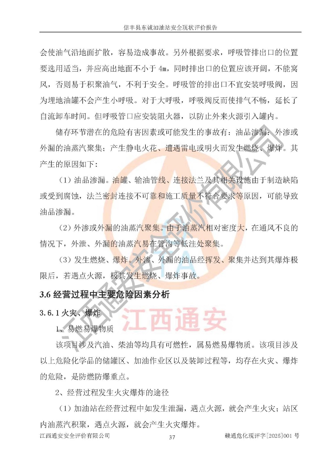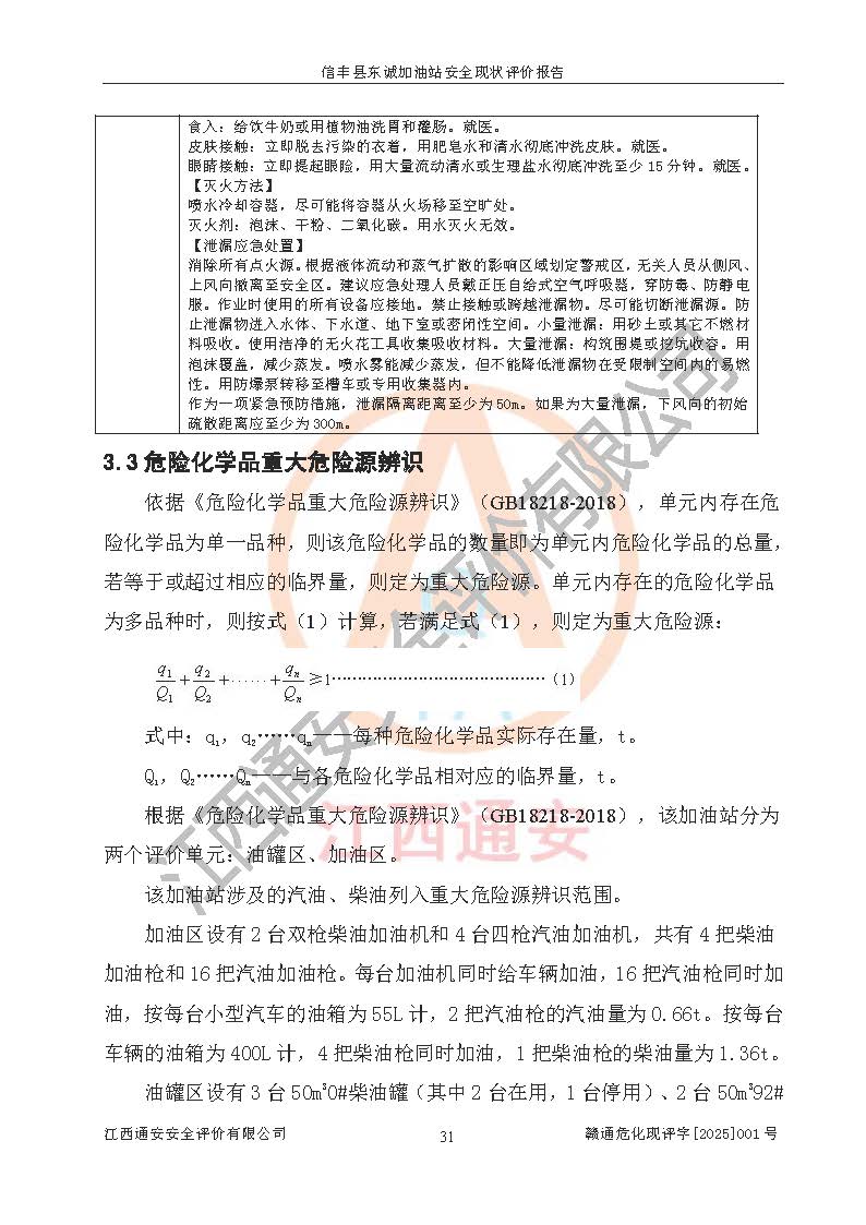 項(xiàng)目簡(jiǎn)介 | 信豐縣東誠(chéng)加油站位于贛州市信豐縣嘉定鎮(zhèn)黃家坑村,企業(yè)法定**人為李敏暉,現(xiàn)有員工8人,其中安全管理人員2人。該加油站2022年03月04日取得了危險(xiǎn)化學(xué)品經(jīng)營(yíng)許可證,登記編號(hào)為(贛)信行審危許字[2022]006號(hào),經(jīng)營(yíng)方式為零售(帶有儲(chǔ)存設(shè)施經(jīng)營(yíng)),許可范圍為汽油、柴油,**期限為2022年03月04日至2025年03月03日。該加油站2020年8月17日取得了成品油零售經(jīng)營(yíng)批準(zhǔn)證書,編號(hào)為油零售證書第虔0038號(hào),**期限為2020年06月23日至2025年06月22日。加油站設(shè)有6臺(tái)埋地油罐,其中停用1臺(tái)油罐,使用的油罐分別為2臺(tái)50m30#柴油臥式儲(chǔ)罐、2臺(tái)50m392#汽油臥式儲(chǔ)罐和1臺(tái)50m395#汽油臥式儲(chǔ)罐,總儲(chǔ)存能力為200m3(柴油折半),為一級(jí)加油站。加油區(qū)設(shè)有4臺(tái)四槍加油機(jī)和2臺(tái)雙槍加油站。該加油站目前運(yùn)行正常。 | |||