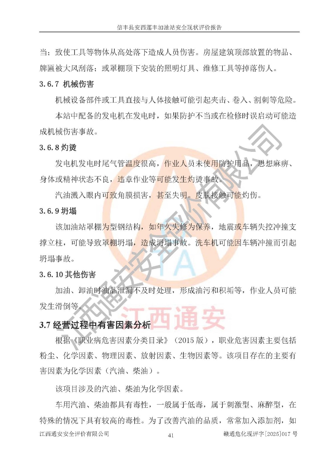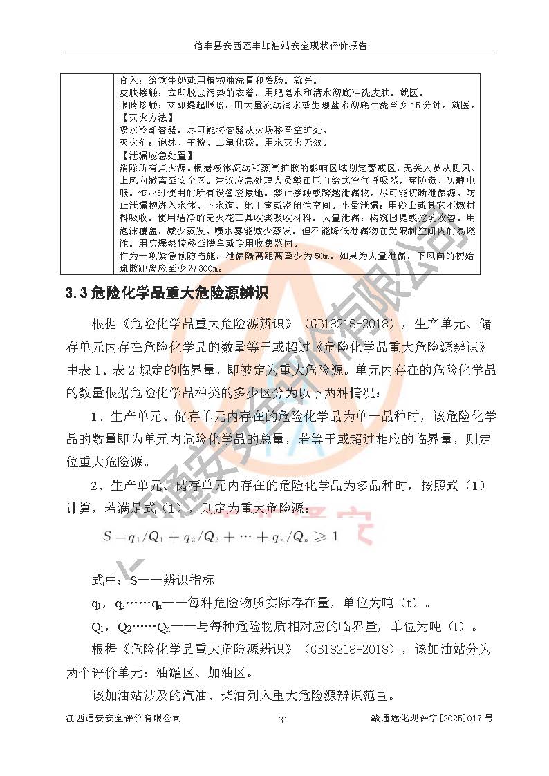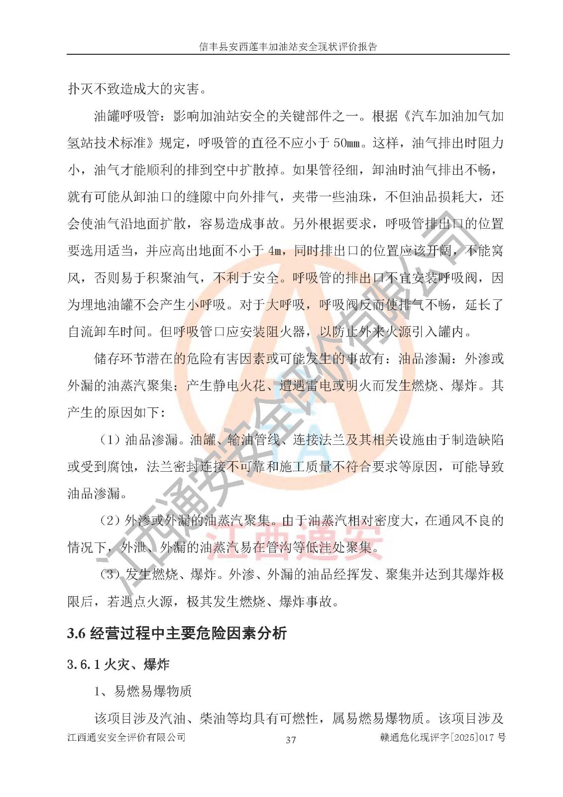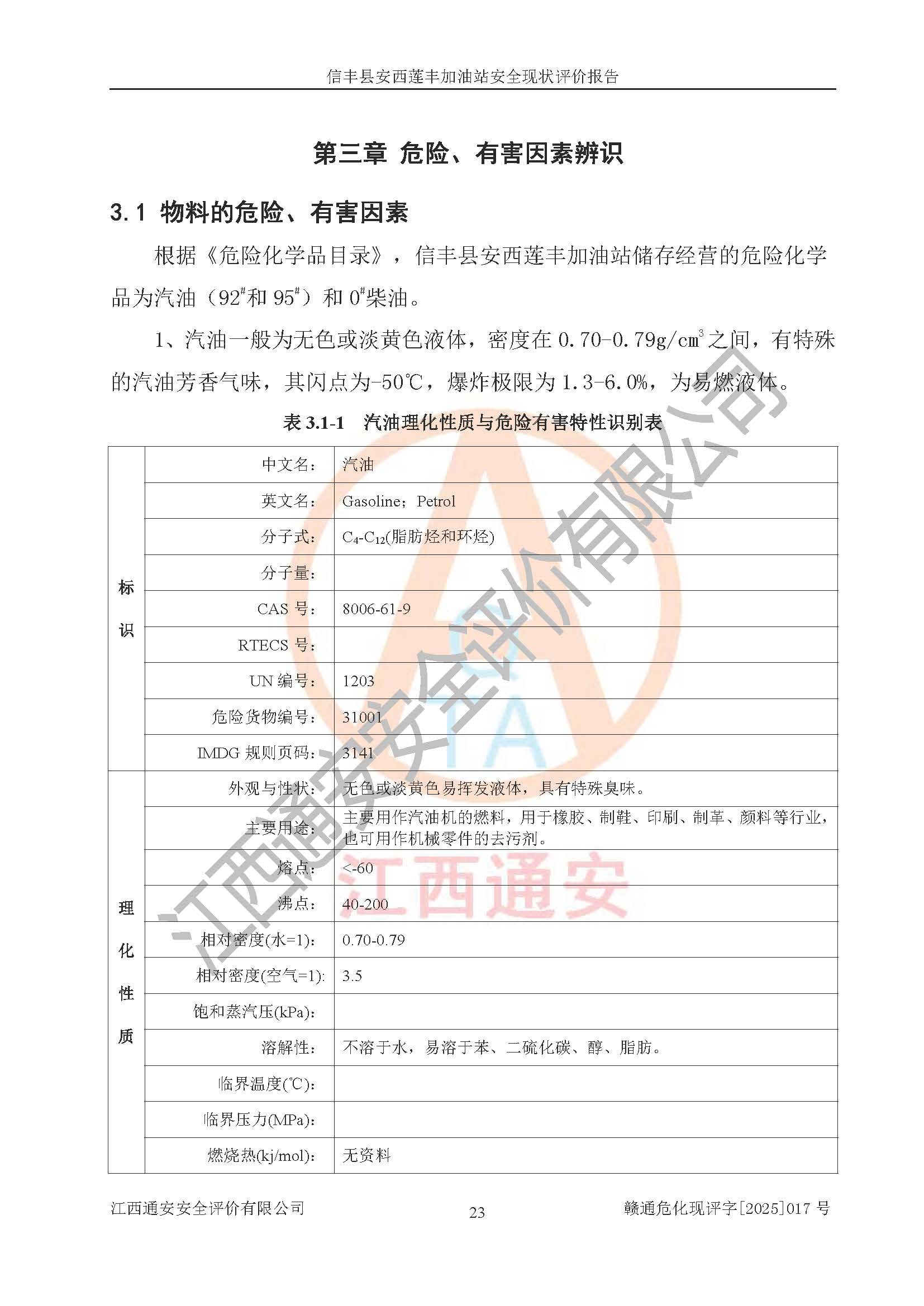 項目簡介 | 信豐縣安西蓮豐加油站位于贛州市信豐縣安西鎮(zhèn)大星村嶺排高,投資人為劉成勇,現(xiàn)有員工4人,其中安全管理人員1人。該加油站2022年05月26日取得了危險化學品經(jīng)營許可證,登記編號為(贛)信行審危許字[2022]016號,經(jīng)營方式為零售,許可范圍為汽油、柴油,**期限為2022年06月17日至2025年06月16日。該加油站2022年11月25日取得了成品油零售經(jīng)營批準證書,編號為油零售證書第虔0344號,**期限為2022年12月08日至2027年12月07日。加油站設有3臺埋地油罐,分別為1臺30m30#柴油臥式儲罐、1臺30m392#汽油臥式油罐和1臺30m395#汽油臥式油罐,總儲存能力為75m3(柴油折半),為三級加油站。加油區(qū)設有2臺雙槍加油機。該加油站目前運行正常。 | |||