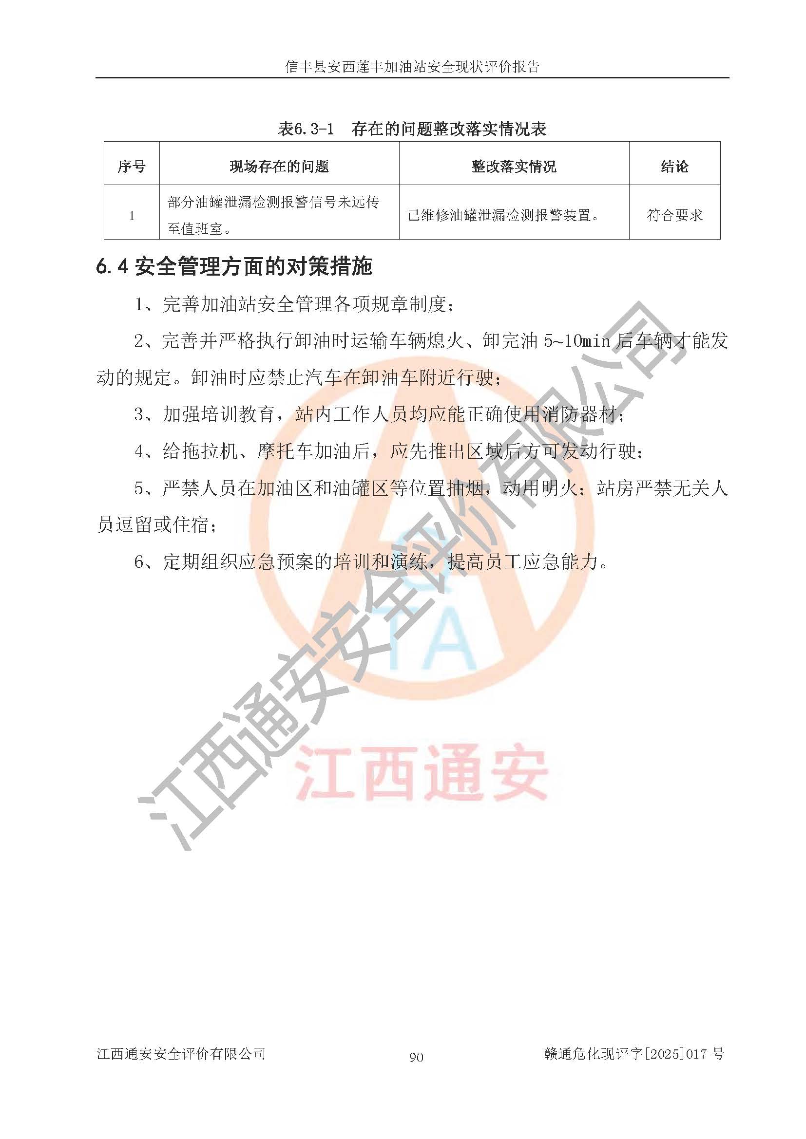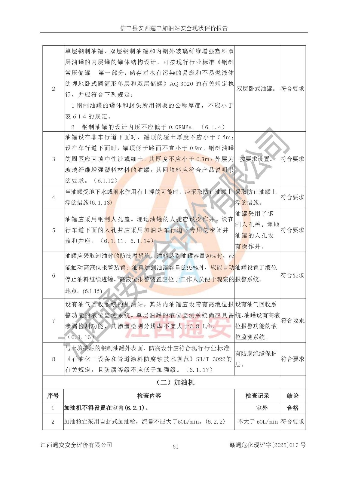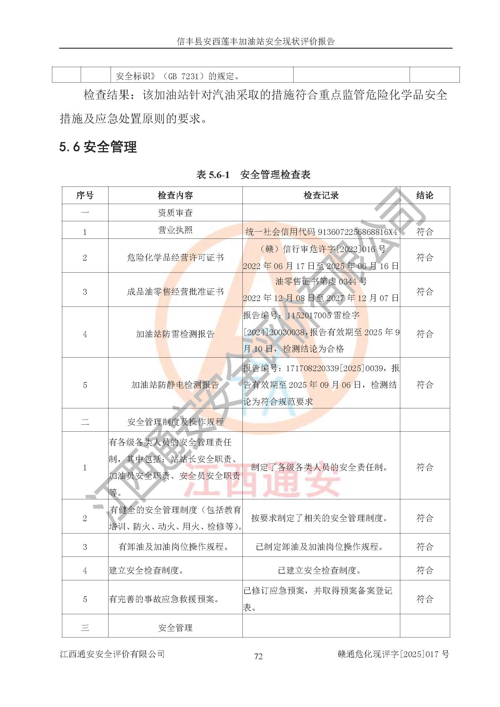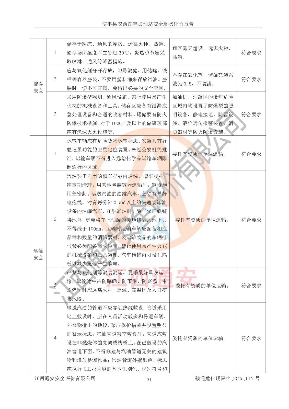 評價結論 | 信豐縣安西蓮豐加油站安全現(xiàn)狀符合危險化學品經(jīng)營安全條件。 | |||