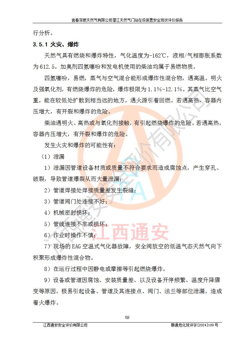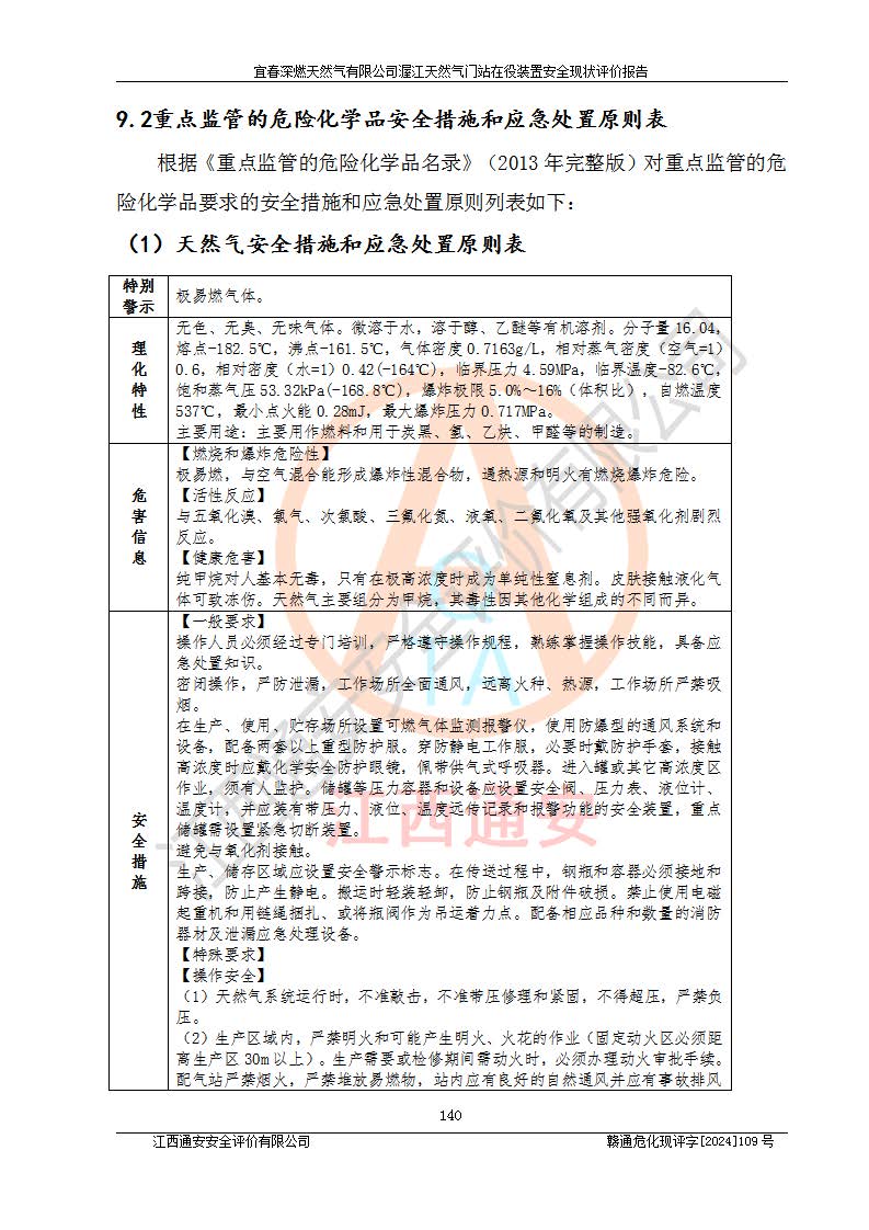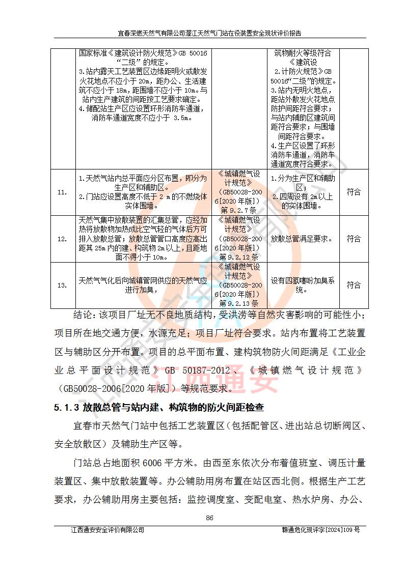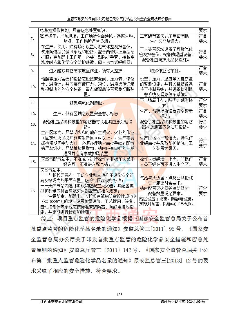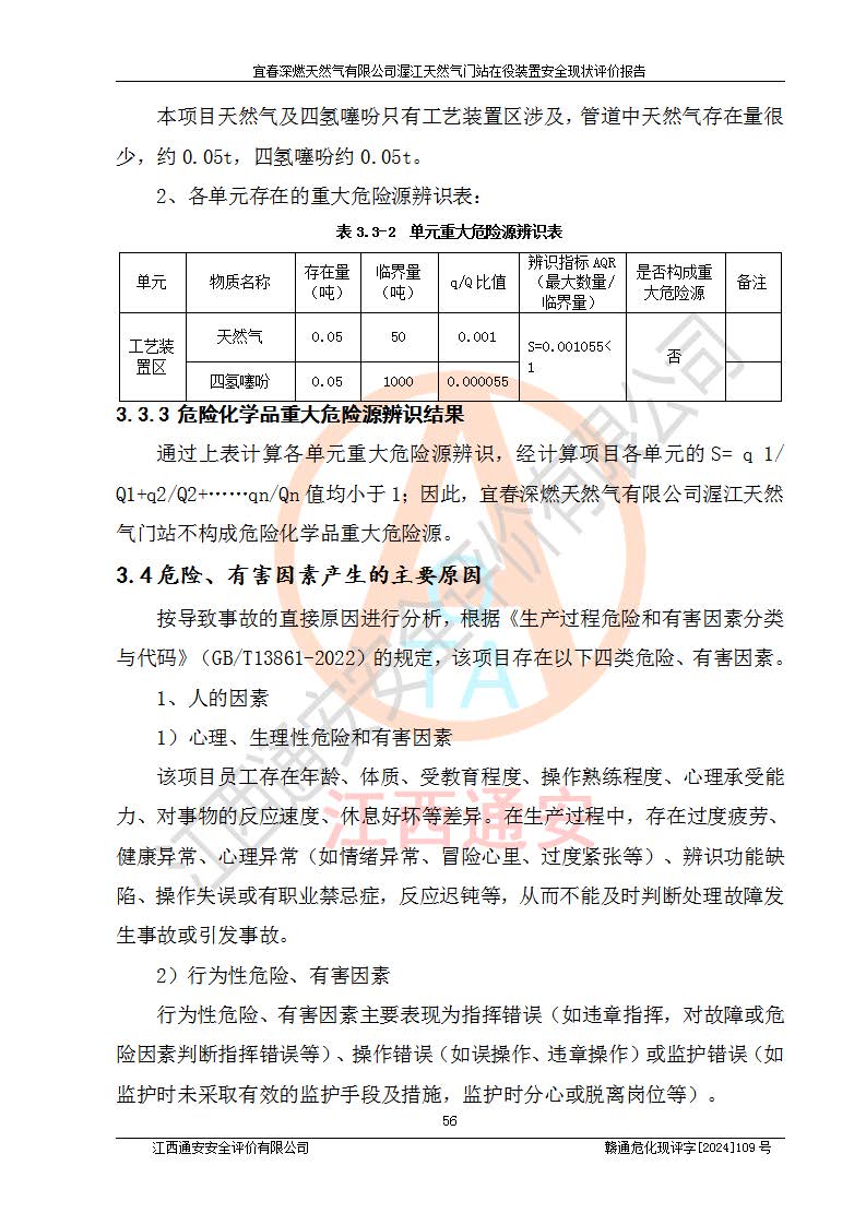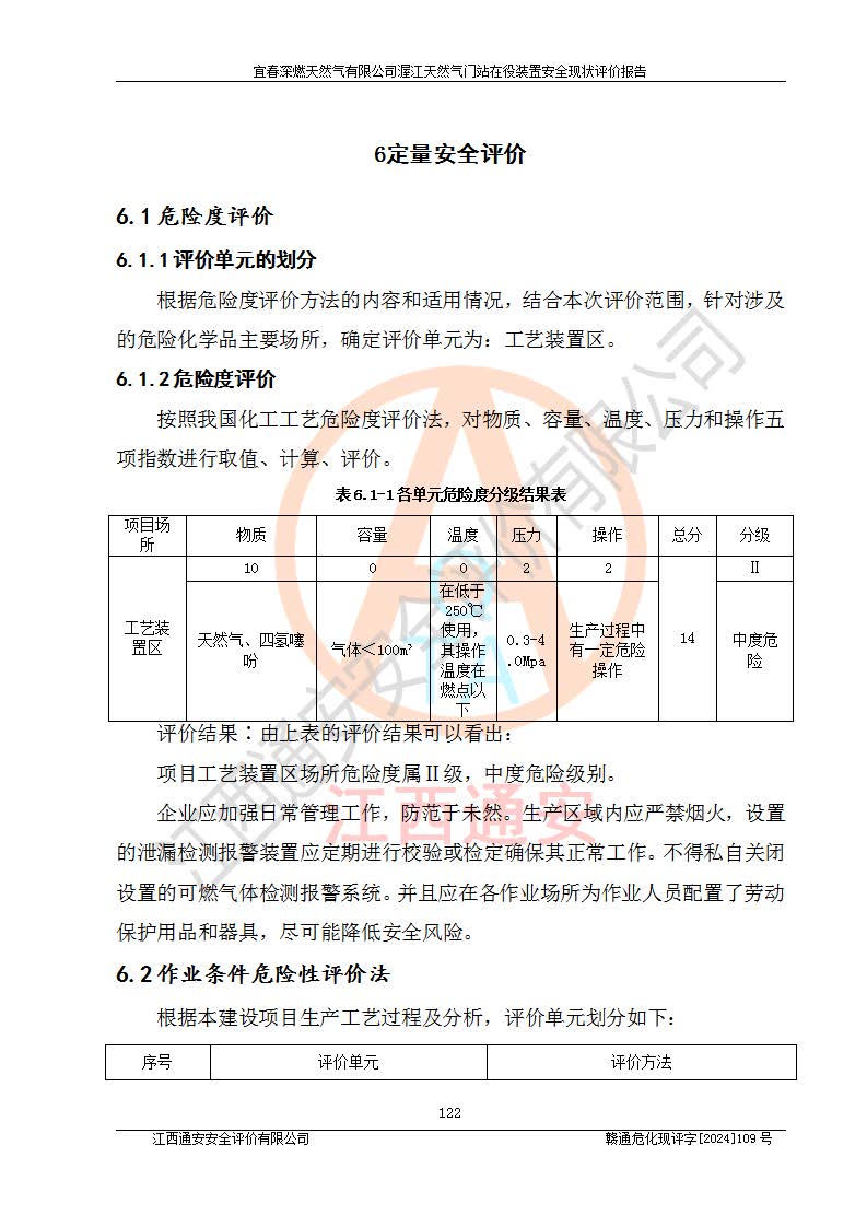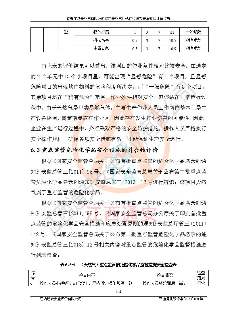其它 | 1、依據(jù)相關(guān)法律、法規(guī)、標準等的規(guī)定,該項目周邊環(huán)境、總平面布置、建筑結(jié)構(gòu)、工藝及設(shè)備、防火防爆安全設(shè)施、有毒有害因素控制等符合**相關(guān)標準規(guī)范的要求,能滿足安全生產(chǎn)的要求。 2、該項目涉及的危險化學(xué)品有:天然氣、四氫噻吩、柴油,其中天然氣屬于重點監(jiān)管的危險化學(xué)品,不涉及特別管控危險化學(xué)品。 3、該項目在生產(chǎn)過程中存在的主要危險有:火災(zāi)爆炸、中毒窒息、容器爆炸、觸電傷害、機械傷害、高處墜落、**傷害、灼燙等。其中火災(zāi)爆炸、中毒窒息、容器爆炸是*主要的危險因素。 4、該項目生產(chǎn)單元和儲存設(shè)施單元不構(gòu)成危險化學(xué)品重大危險源。 5、根據(jù)《**安全監(jiān)管總局關(guān)于公布首批重點監(jiān)管的危險化工工藝目錄的通知》(安監(jiān)總管三〔2009〕116號)和《**安全監(jiān)管總局關(guān)于公布第二批重點監(jiān)管危險化工工藝目錄和調(diào)整首批重點監(jiān)管危險化工工藝中部分典型工藝的通知》(安監(jiān)總管三〔2013〕3號)進行危險工藝辨識:該項目不涉及重點監(jiān)管的危險化工工藝。 6、作業(yè)條件危險性分析評價結(jié)果:該項目的作業(yè)條件相對比較安全。在選定的2個單元中13個小項目里,可能出現(xiàn)“顯著危險”有1個項目,且顯著危險項目的出現(xiàn)均由物料的危險程度所決定,而“一般危險”有8個項目,其余項目均在“稍有危險”范圍,作業(yè)條件相對安全。 7、危險度評價結(jié)果:項目工藝裝置區(qū)場所危險度屬Ⅱ級,中度危險級別。 企業(yè)應(yīng)加強日常管理工作,防范于未然。生產(chǎn)區(qū)域內(nèi)應(yīng)嚴禁煙火,設(shè)置的泄漏檢測報警裝置應(yīng)定期進行校驗或檢定**其正常工作。不得私自關(guān)閉設(shè)置的可燃氣體檢測報警系統(tǒng)。并且應(yīng)在各作業(yè)場所為作業(yè)人員配置了勞動保護用品和器具,盡可能降低安全風(fēng)險。 評價結(jié)論:本報告認為,宜春深燃天然氣有限公司渥江天然氣門站在役裝置現(xiàn)場自動化控制系統(tǒng)運行正常,有關(guān)從業(yè)人員資質(zhì)符合《城鎮(zhèn)燃氣管理條例》(2010年11月19日中華人民共和國***令第583號公布 根據(jù)2016年2月6日《***關(guān)于修改部分行政法規(guī)的決定》修訂)及《江西省燃氣管理辦法》(2003年8月31日江西省人民**令**23號公布 2014年1月30日江西省人民**令第210號**次修正 2019年11月27日江西省人民**令第242號第二次修正)要求,安全設(shè)施及安全管理符合**及有關(guān)部門關(guān)于安全生產(chǎn)法律、法規(guī)、標準的要求,安全風(fēng)險是可以控制的,其風(fēng)險程度是可以接受的,安全現(xiàn)狀符合安全生產(chǎn)條件,能夠滿足安全生產(chǎn)的要求。