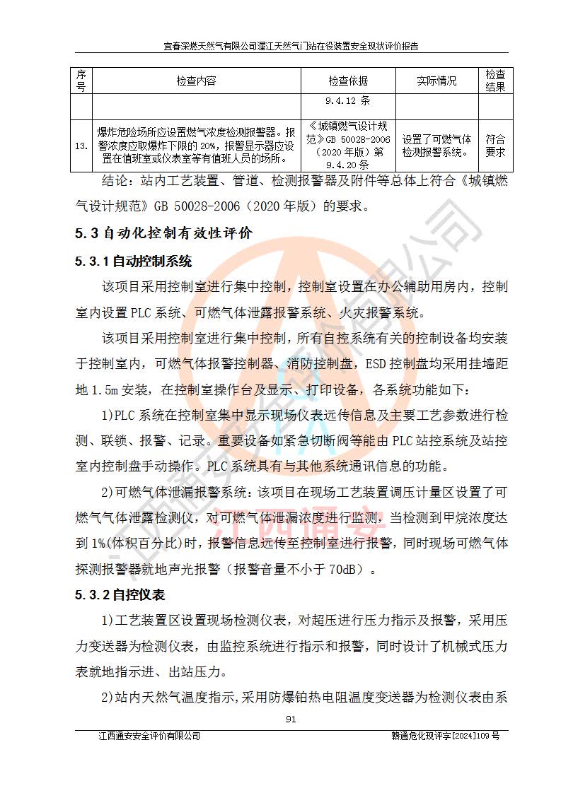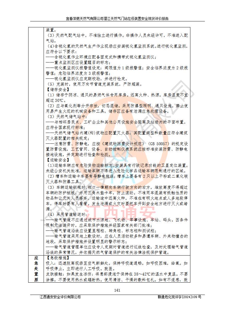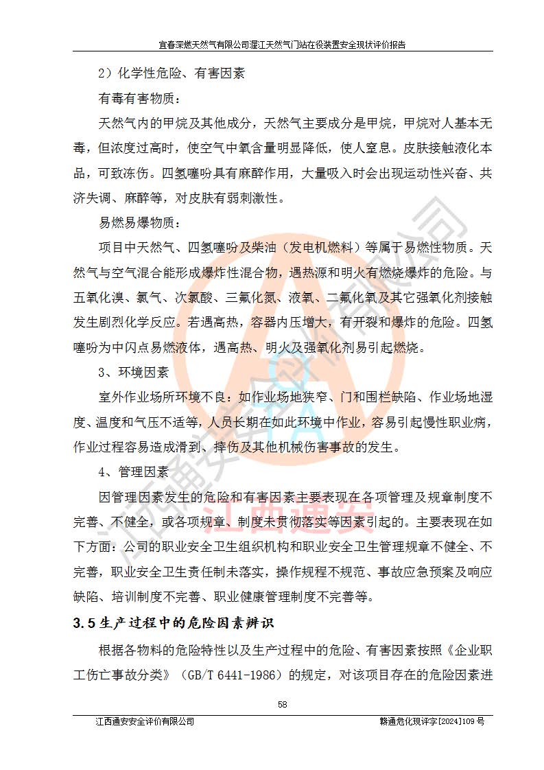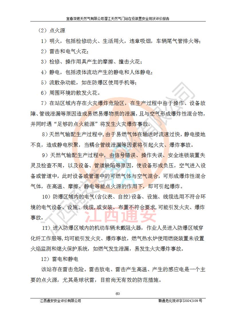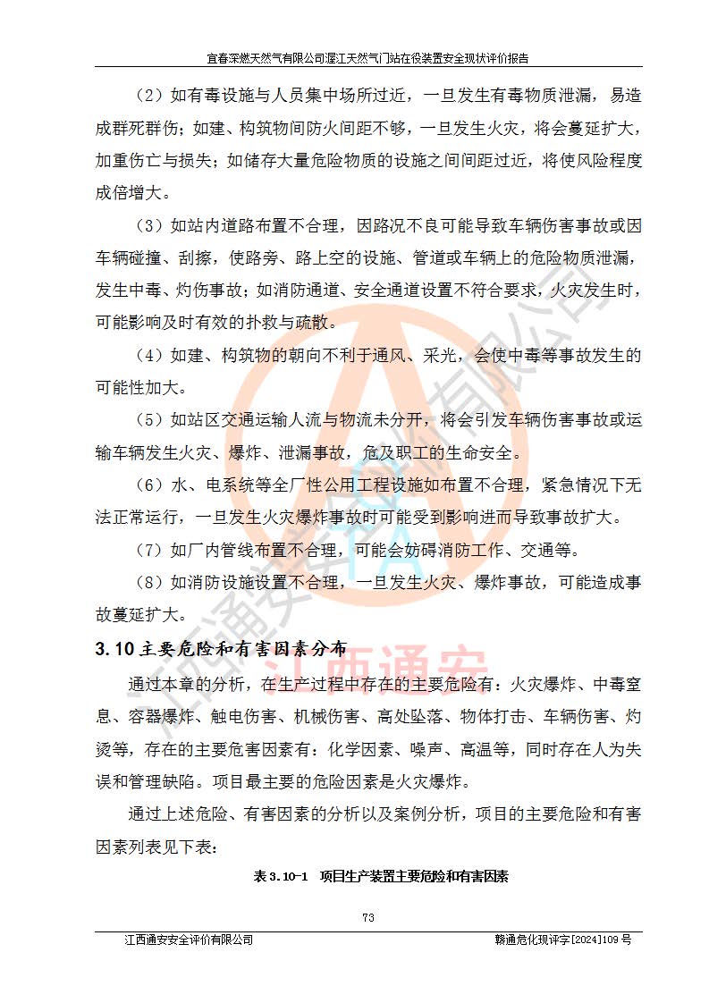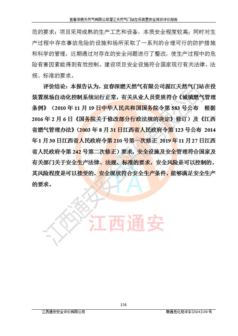 其它 | 1、依據(jù)相關(guān)法律、法規(guī)、標準等的規(guī)定,該項目周邊環(huán)境、總平面布置、建筑結(jié)構(gòu)、工藝及設(shè)備、防火防爆安全設(shè)施、有毒有害因素控制等符合**相關(guān)標準規(guī)范的要求,能滿足安全生產(chǎn)的要求。 2、該項目涉及的危險化學(xué)品有:天然氣、四氫噻吩、柴油,其中天然氣屬于重點監(jiān)管的危險化學(xué)品,不涉及特別管控危險化學(xué)品。 3、該項目在生產(chǎn)過程中存在的主要危險有:火災(zāi)爆炸、中毒窒息、容器爆炸、觸電傷害、機械傷害、高處墜落、**傷害、灼燙等。其中火災(zāi)爆炸、中毒窒息、容器爆炸是*主要的危險因素。 4、該項目生產(chǎn)單元和儲存設(shè)施單元不構(gòu)成危險化學(xué)品重大危險源。 5、根據(jù)《**安全監(jiān)管總局關(guān)于公布首批重點監(jiān)管的危險化工工藝目錄的通知》(安監(jiān)總管三〔2009〕116號)和《**安全監(jiān)管總局關(guān)于公布第二批重點監(jiān)管危險化工工藝目錄和調(diào)整首批重點監(jiān)管危險化工工藝中部分典型工藝的通知》(安監(jiān)總管三〔2013〕3號)進行危險工藝辨識:該項目不涉及重點監(jiān)管的危險化工工藝。 6、作業(yè)條件危險性分析評價結(jié)果:該項目的作業(yè)條件相對比較安全。在選定的2個單元中13個小項目里,可能出現(xiàn)“顯著危險”有1個項目,且顯著危險項目的出現(xiàn)均由物料的危險程度所決定,而“一般危險”有8個項目,其余項目均在“稍有危險”范圍,作業(yè)條件相對安全。 7、危險度評價結(jié)果:項目工藝裝置區(qū)場所危險度屬Ⅱ級,中度危險級別。 企業(yè)應(yīng)加強日常管理工作,防范于未然。生產(chǎn)區(qū)域內(nèi)應(yīng)嚴禁煙火,設(shè)置的泄漏檢測報警裝置應(yīng)定期進行校驗或檢定**其正常工作。不得私自關(guān)閉設(shè)置的可燃氣體檢測報警系統(tǒng)。并且應(yīng)在各作業(yè)場所為作業(yè)人員配置了勞動保護用品和器具,盡可能降低安全風(fēng)險。 評價結(jié)論:本報告認為,宜春深燃天然氣有限公司渥江天然氣門站在役裝置現(xiàn)場自動化控制系統(tǒng)運行正常,有關(guān)從業(yè)人員資質(zhì)符合《城鎮(zhèn)燃氣管理條例》(2010年11月19日中華人民共和國***令第583號公布 根據(jù)2016年2月6日《***關(guān)于修改部分行政法規(guī)的決定》修訂)及《江西省燃氣管理辦法》(2003年8月31日江西省人民**令**23號公布 2014年1月30日江西省人民**令第210號**次修正 2019年11月27日江西省人民**令第242號第二次修正)要求,安全設(shè)施及安全管理符合**及有關(guān)部門關(guān)于安全生產(chǎn)法律、法規(guī)、標準的要求,安全風(fēng)險是可以控制的,其風(fēng)險程度是可以接受的,安全現(xiàn)狀符合安全生產(chǎn)條件,能夠滿足安全生產(chǎn)的要求。