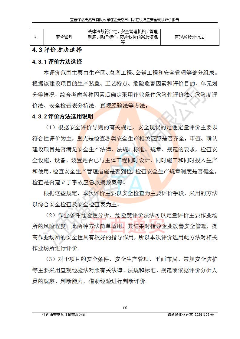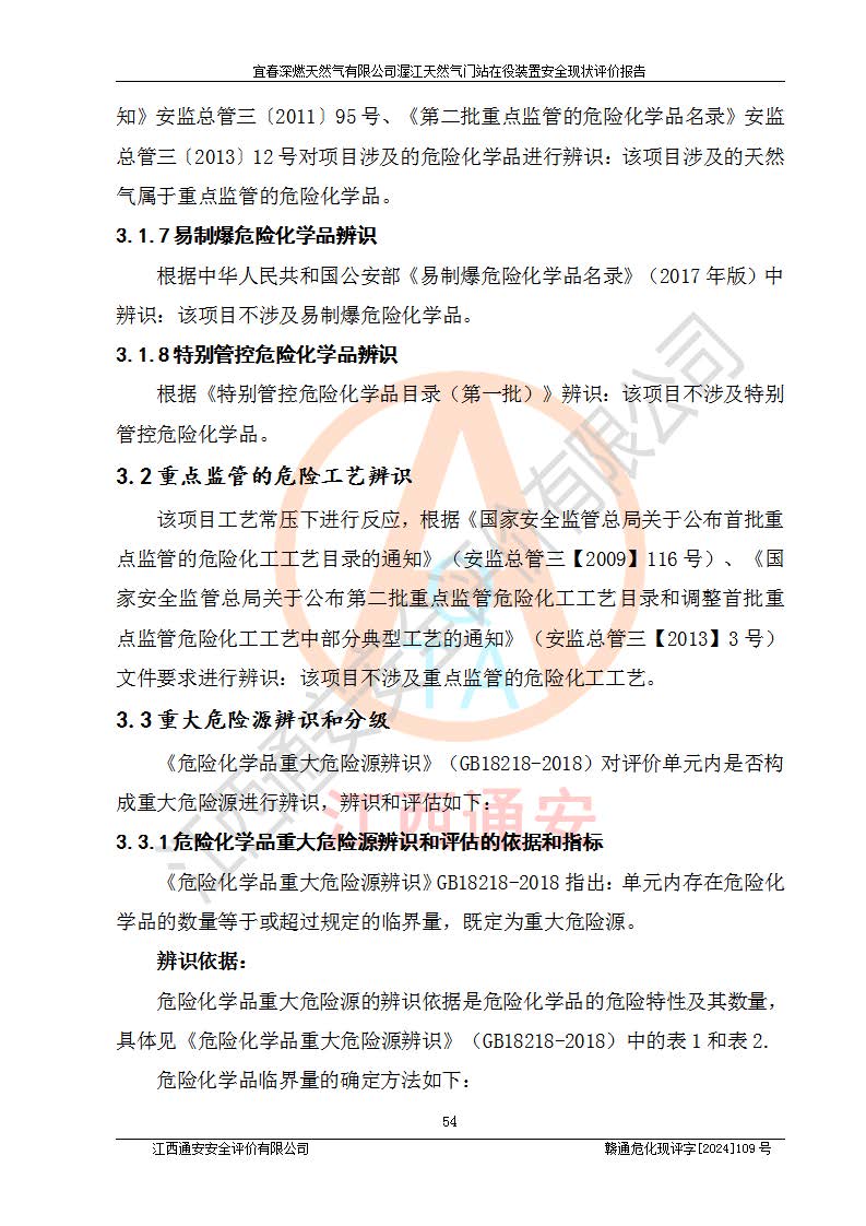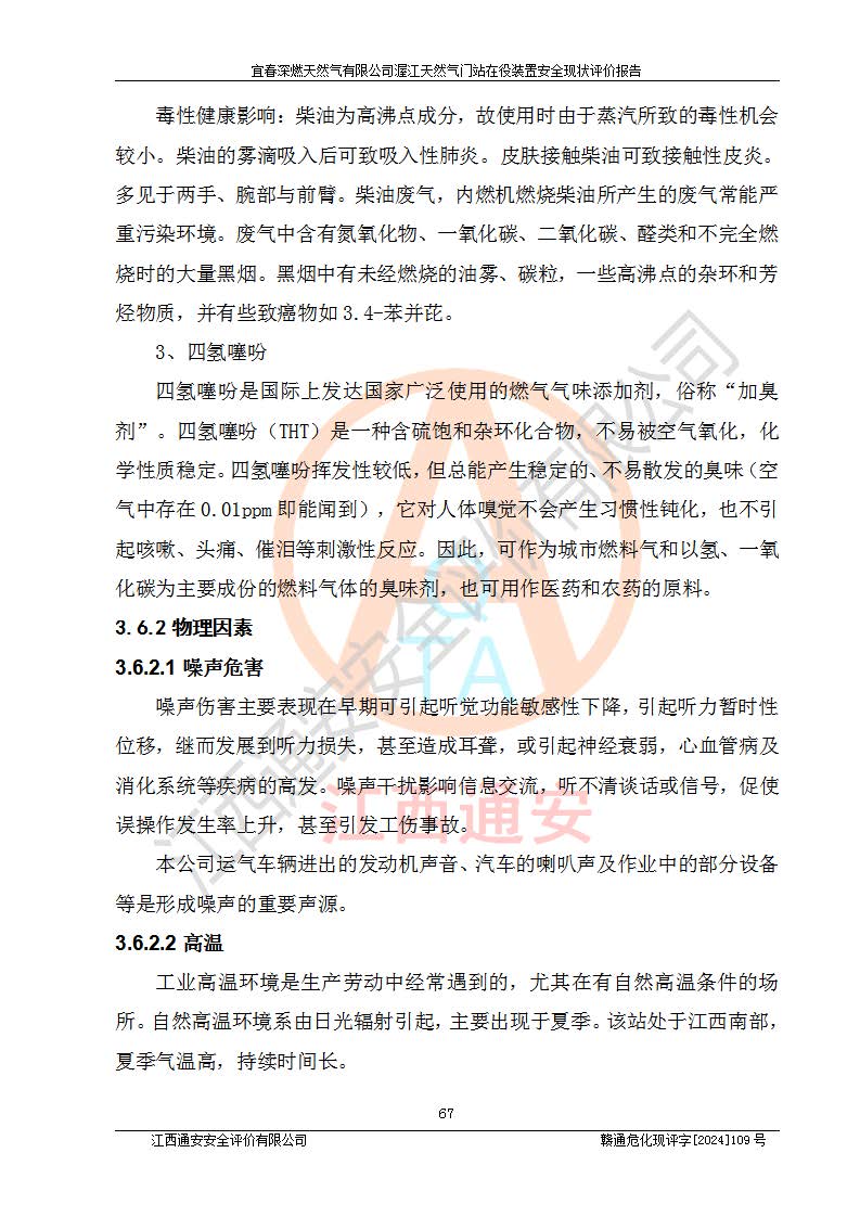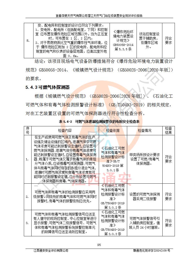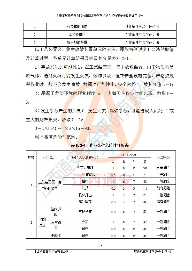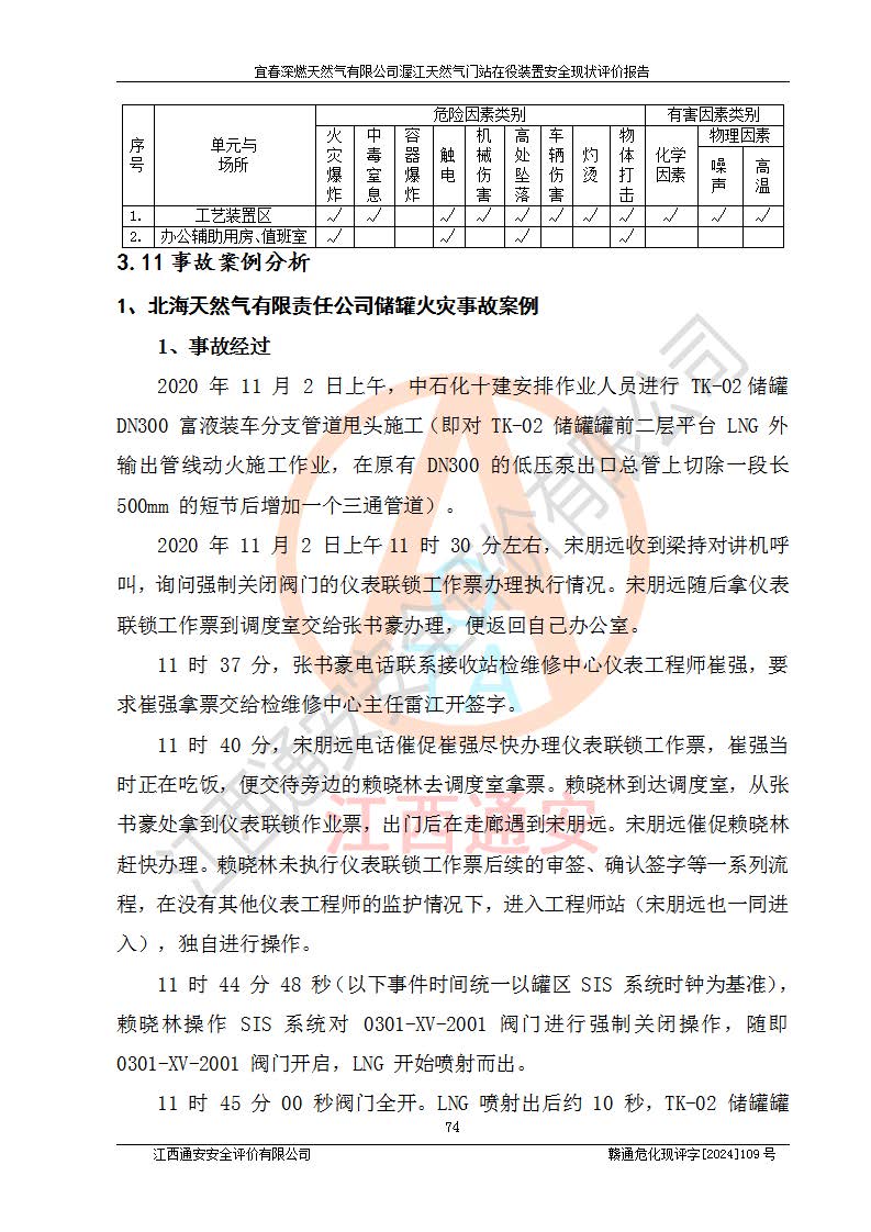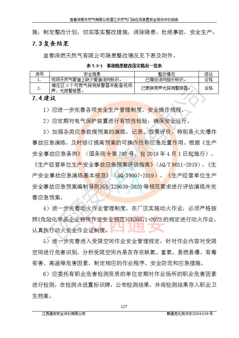 其它 | 1、依據(jù)相關(guān)法律、法規(guī)、標準等的規(guī)定,該項目周邊環(huán)境、總平面布置、建筑結(jié)構(gòu)、工藝及設(shè)備、防火防爆安全設(shè)施、有毒有害因素控制等符合**相關(guān)標準規(guī)范的要求,能滿足安全生產(chǎn)的要求。 2、該項目涉及的危險化學(xué)品有:天然氣、四氫噻吩、柴油,其中天然氣屬于重點監(jiān)管的危險化學(xué)品,不涉及特別管控危險化學(xué)品。 3、該項目在生產(chǎn)過程中存在的主要危險有:火災(zāi)爆炸、中毒窒息、容器爆炸、觸電傷害、機械傷害、高處墜落、**傷害、灼燙等。其中火災(zāi)爆炸、中毒窒息、容器爆炸是*主要的危險因素。 4、該項目生產(chǎn)單元和儲存設(shè)施單元不構(gòu)成危險化學(xué)品重大危險源。 5、根據(jù)《**安全監(jiān)管總局關(guān)于公布首批重點監(jiān)管的危險化工工藝目錄的通知》(安監(jiān)總管三〔2009〕116號)和《**安全監(jiān)管總局關(guān)于公布第二批重點監(jiān)管危險化工工藝目錄和調(diào)整首批重點監(jiān)管危險化工工藝中部分典型工藝的通知》(安監(jiān)總管三〔2013〕3號)進行危險工藝辨識:該項目不涉及重點監(jiān)管的危險化工工藝。 6、作業(yè)條件危險性分析評價結(jié)果:該項目的作業(yè)條件相對比較安全。在選定的2個單元中13個小項目里,可能出現(xiàn)“顯著危險”有1個項目,且顯著危險項目的出現(xiàn)均由物料的危險程度所決定,而“一般危險”有8個項目,其余項目均在“稍有危險”范圍,作業(yè)條件相對安全。 7、危險度評價結(jié)果:項目工藝裝置區(qū)場所危險度屬Ⅱ級,中度危險級別。 企業(yè)應(yīng)加強日常管理工作,防范于未然。生產(chǎn)區(qū)域內(nèi)應(yīng)嚴禁煙火,設(shè)置的泄漏檢測報警裝置應(yīng)定期進行校驗或檢定**其正常工作。不得私自關(guān)閉設(shè)置的可燃氣體檢測報警系統(tǒng)。并且應(yīng)在各作業(yè)場所為作業(yè)人員配置了勞動保護用品和器具,盡可能降低安全風(fēng)險。 評價結(jié)論:本報告認為,宜春深燃天然氣有限公司渥江天然氣門站在役裝置現(xiàn)場自動化控制系統(tǒng)運行正常,有關(guān)從業(yè)人員資質(zhì)符合《城鎮(zhèn)燃氣管理條例》(2010年11月19日中華人民共和國***令第583號公布 根據(jù)2016年2月6日《***關(guān)于修改部分行政法規(guī)的決定》修訂)及《江西省燃氣管理辦法》(2003年8月31日江西省人民**令**23號公布 2014年1月30日江西省人民**令第210號**次修正 2019年11月27日江西省人民**令第242號第二次修正)要求,安全設(shè)施及安全管理符合**及有關(guān)部門關(guān)于安全生產(chǎn)法律、法規(guī)、標準的要求,安全風(fēng)險是可以控制的,其風(fēng)險程度是可以接受的,安全現(xiàn)狀符合安全生產(chǎn)條件,能夠滿足安全生產(chǎn)的要求。