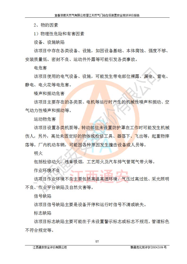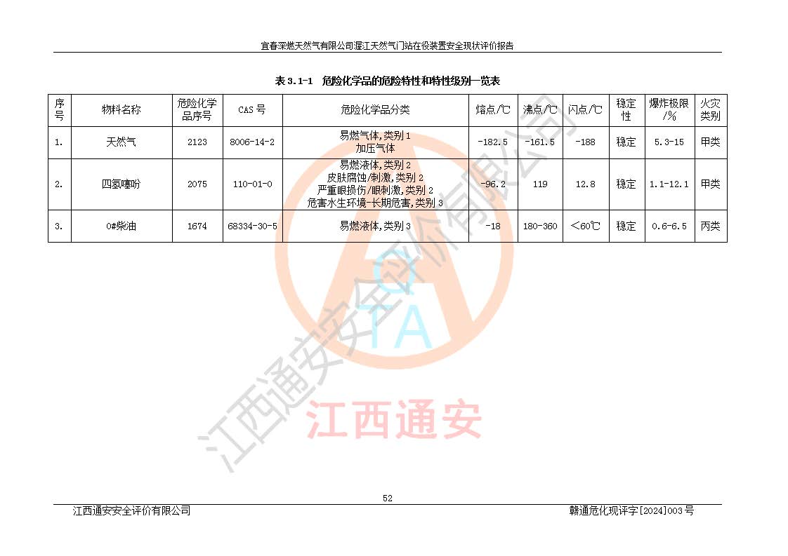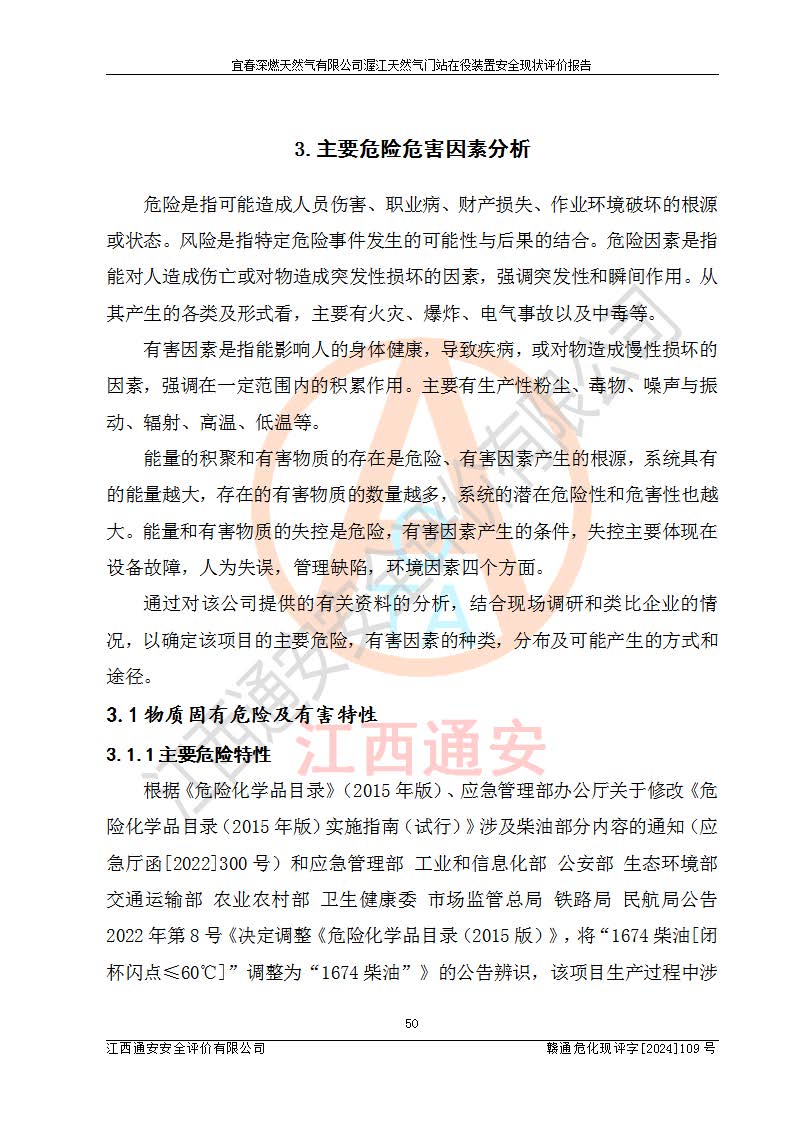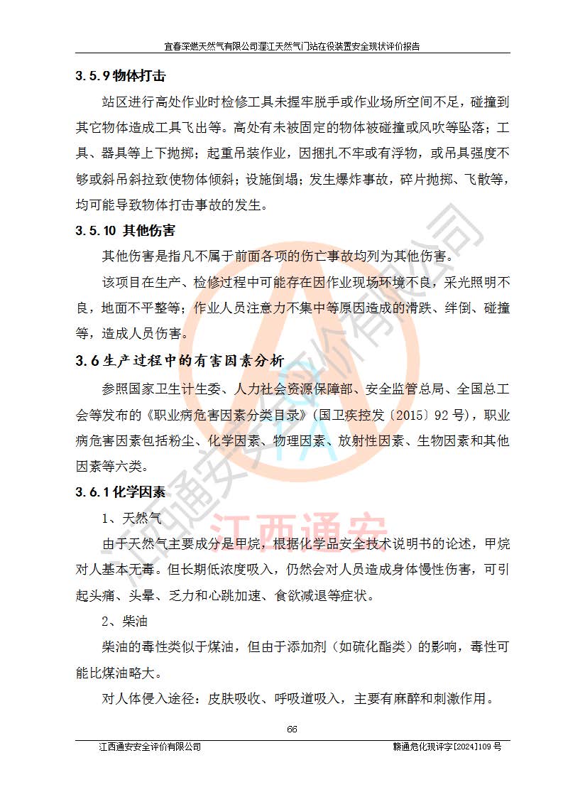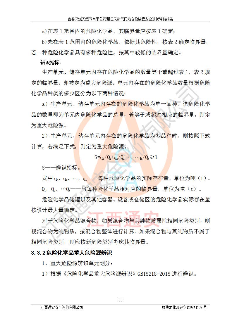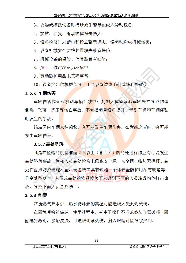 其它 | 1、依據(jù)相關(guān)法律、法規(guī)、標準等的規(guī)定,該項目周邊環(huán)境、總平面布置、建筑結(jié)構(gòu)、工藝及設(shè)備、防火防爆安全設(shè)施、有毒有害因素控制等符合**相關(guān)標準規(guī)范的要求,能滿足安全生產(chǎn)的要求。 2、該項目涉及的危險化學(xué)品有:天然氣、四氫噻吩、柴油,其中天然氣屬于重點監(jiān)管的危險化學(xué)品,不涉及特別管控危險化學(xué)品。 3、該項目在生產(chǎn)過程中存在的主要危險有:火災(zāi)爆炸、中毒窒息、容器爆炸、觸電傷害、機械傷害、高處墜落、**傷害、灼燙等。其中火災(zāi)爆炸、中毒窒息、容器爆炸是*主要的危險因素。 4、該項目生產(chǎn)單元和儲存設(shè)施單元不構(gòu)成危險化學(xué)品重大危險源。 5、根據(jù)《**安全監(jiān)管總局關(guān)于公布首批重點監(jiān)管的危險化工工藝目錄的通知》(安監(jiān)總管三〔2009〕116號)和《**安全監(jiān)管總局關(guān)于公布第二批重點監(jiān)管危險化工工藝目錄和調(diào)整首批重點監(jiān)管危險化工工藝中部分典型工藝的通知》(安監(jiān)總管三〔2013〕3號)進行危險工藝辨識:該項目不涉及重點監(jiān)管的危險化工工藝。 6、作業(yè)條件危險性分析評價結(jié)果:該項目的作業(yè)條件相對比較安全。在選定的2個單元中13個小項目里,可能出現(xiàn)“顯著危險”有1個項目,且顯著危險項目的出現(xiàn)均由物料的危險程度所決定,而“一般危險”有8個項目,其余項目均在“稍有危險”范圍,作業(yè)條件相對安全。 7、危險度評價結(jié)果:項目工藝裝置區(qū)場所危險度屬Ⅱ級,中度危險級別。 企業(yè)應(yīng)加強日常管理工作,防范于未然。生產(chǎn)區(qū)域內(nèi)應(yīng)嚴禁煙火,設(shè)置的泄漏檢測報警裝置應(yīng)定期進行校驗或檢定**其正常工作。不得私自關(guān)閉設(shè)置的可燃氣體檢測報警系統(tǒng)。并且應(yīng)在各作業(yè)場所為作業(yè)人員配置了勞動保護用品和器具,盡可能降低安全風(fēng)險。 評價結(jié)論:本報告認為,宜春深燃天然氣有限公司渥江天然氣門站在役裝置現(xiàn)場自動化控制系統(tǒng)運行正常,有關(guān)從業(yè)人員資質(zhì)符合《城鎮(zhèn)燃氣管理條例》(2010年11月19日中華人民共和國***令第583號公布 根據(jù)2016年2月6日《***關(guān)于修改部分行政法規(guī)的決定》修訂)及《江西省燃氣管理辦法》(2003年8月31日江西省人民**令**23號公布 2014年1月30日江西省人民**令第210號**次修正 2019年11月27日江西省人民**令第242號第二次修正)要求,安全設(shè)施及安全管理符合**及有關(guān)部門關(guān)于安全生產(chǎn)法律、法規(guī)、標準的要求,安全風(fēng)險是可以控制的,其風(fēng)險程度是可以接受的,安全現(xiàn)狀符合安全生產(chǎn)條件,能夠滿足安全生產(chǎn)的要求。