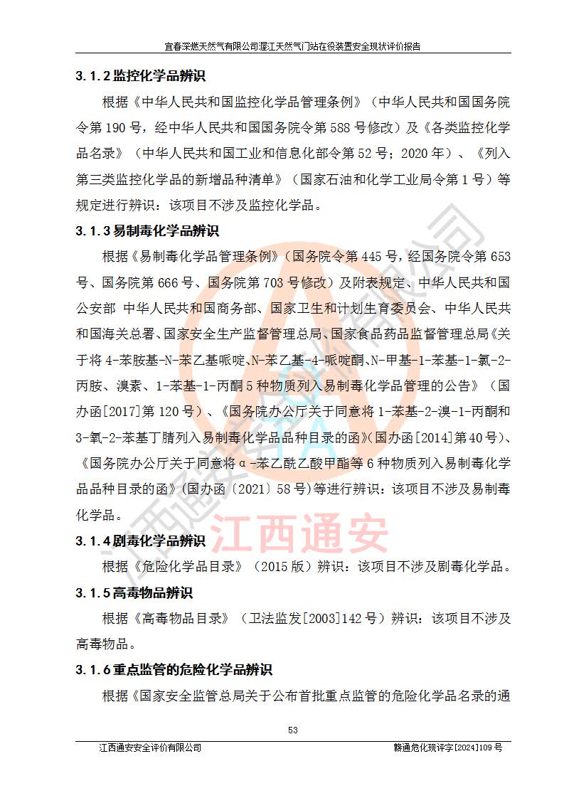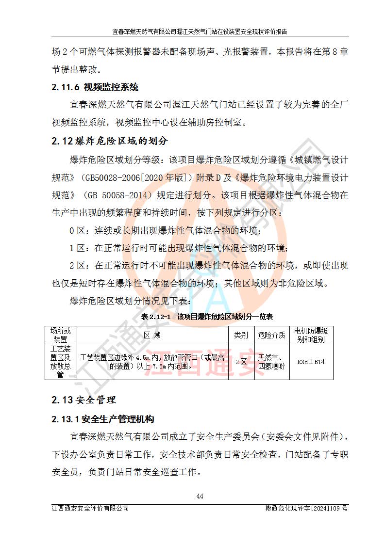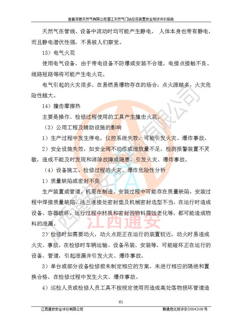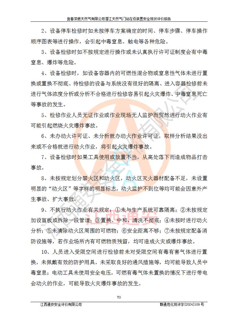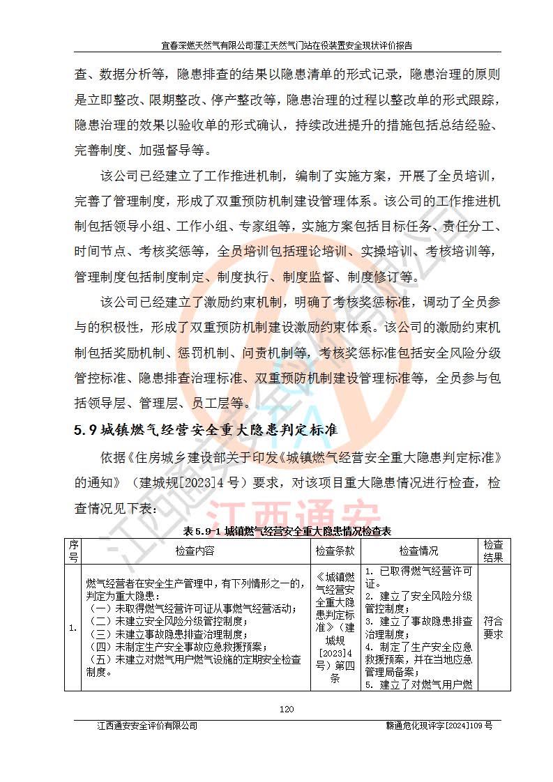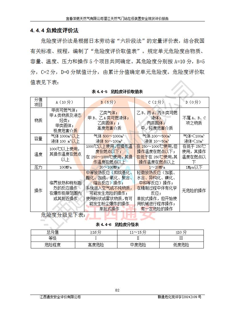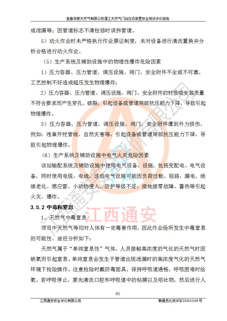 其它 | 1、依據(jù)相關(guān)法律、法規(guī)、標準等的規(guī)定,該項目周邊環(huán)境、總平面布置、建筑結(jié)構(gòu)、工藝及設(shè)備、防火防爆安全設(shè)施、有毒有害因素控制等符合**相關(guān)標準規(guī)范的要求,能滿足安全生產(chǎn)的要求。 2、該項目涉及的危險化學(xué)品有:天然氣、四氫噻吩、柴油,其中天然氣屬于重點監(jiān)管的危險化學(xué)品,不涉及特別管控危險化學(xué)品。 3、該項目在生產(chǎn)過程中存在的主要危險有:火災(zāi)爆炸、中毒窒息、容器爆炸、觸電傷害、機械傷害、高處墜落、**傷害、灼燙等。其中火災(zāi)爆炸、中毒窒息、容器爆炸是*主要的危險因素。 4、該項目生產(chǎn)單元和儲存設(shè)施單元不構(gòu)成危險化學(xué)品重大危險源。 5、根據(jù)《**安全監(jiān)管總局關(guān)于公布首批重點監(jiān)管的危險化工工藝目錄的通知》(安監(jiān)總管三〔2009〕116號)和《**安全監(jiān)管總局關(guān)于公布第二批重點監(jiān)管危險化工工藝目錄和調(diào)整首批重點監(jiān)管危險化工工藝中部分典型工藝的通知》(安監(jiān)總管三〔2013〕3號)進行危險工藝辨識:該項目不涉及重點監(jiān)管的危險化工工藝。 6、作業(yè)條件危險性分析評價結(jié)果:該項目的作業(yè)條件相對比較安全。在選定的2個單元中13個小項目里,可能出現(xiàn)“顯著危險”有1個項目,且顯著危險項目的出現(xiàn)均由物料的危險程度所決定,而“一般危險”有8個項目,其余項目均在“稍有危險”范圍,作業(yè)條件相對安全。 7、危險度評價結(jié)果:項目工藝裝置區(qū)場所危險度屬Ⅱ級,中度危險級別。 企業(yè)應(yīng)加強日常管理工作,防范于未然。生產(chǎn)區(qū)域內(nèi)應(yīng)嚴禁煙火,設(shè)置的泄漏檢測報警裝置應(yīng)定期進行校驗或檢定**其正常工作。不得私自關(guān)閉設(shè)置的可燃氣體檢測報警系統(tǒng)。并且應(yīng)在各作業(yè)場所為作業(yè)人員配置了勞動保護用品和器具,盡可能降低安全風(fēng)險。 評價結(jié)論:本報告認為,宜春深燃天然氣有限公司渥江天然氣門站在役裝置現(xiàn)場自動化控制系統(tǒng)運行正常,有關(guān)從業(yè)人員資質(zhì)符合《城鎮(zhèn)燃氣管理條例》(2010年11月19日中華人民共和國***令第583號公布 根據(jù)2016年2月6日《***關(guān)于修改部分行政法規(guī)的決定》修訂)及《江西省燃氣管理辦法》(2003年8月31日江西省人民**令**23號公布 2014年1月30日江西省人民**令第210號**次修正 2019年11月27日江西省人民**令第242號第二次修正)要求,安全設(shè)施及安全管理符合**及有關(guān)部門關(guān)于安全生產(chǎn)法律、法規(guī)、標準的要求,安全風(fēng)險是可以控制的,其風(fēng)險程度是可以接受的,安全現(xiàn)狀符合安全生產(chǎn)條件,能夠滿足安全生產(chǎn)的要求。