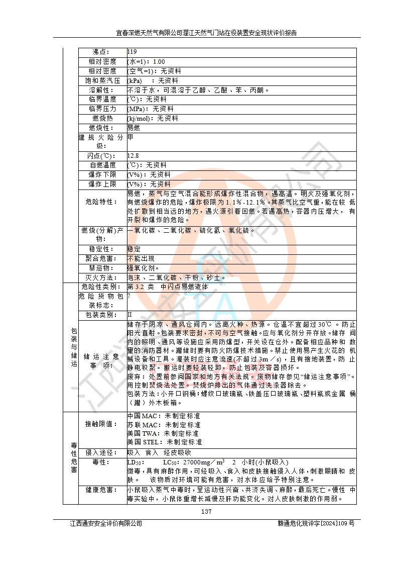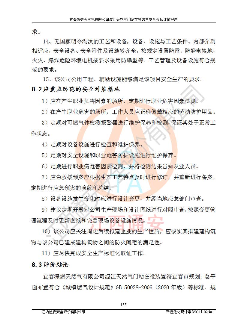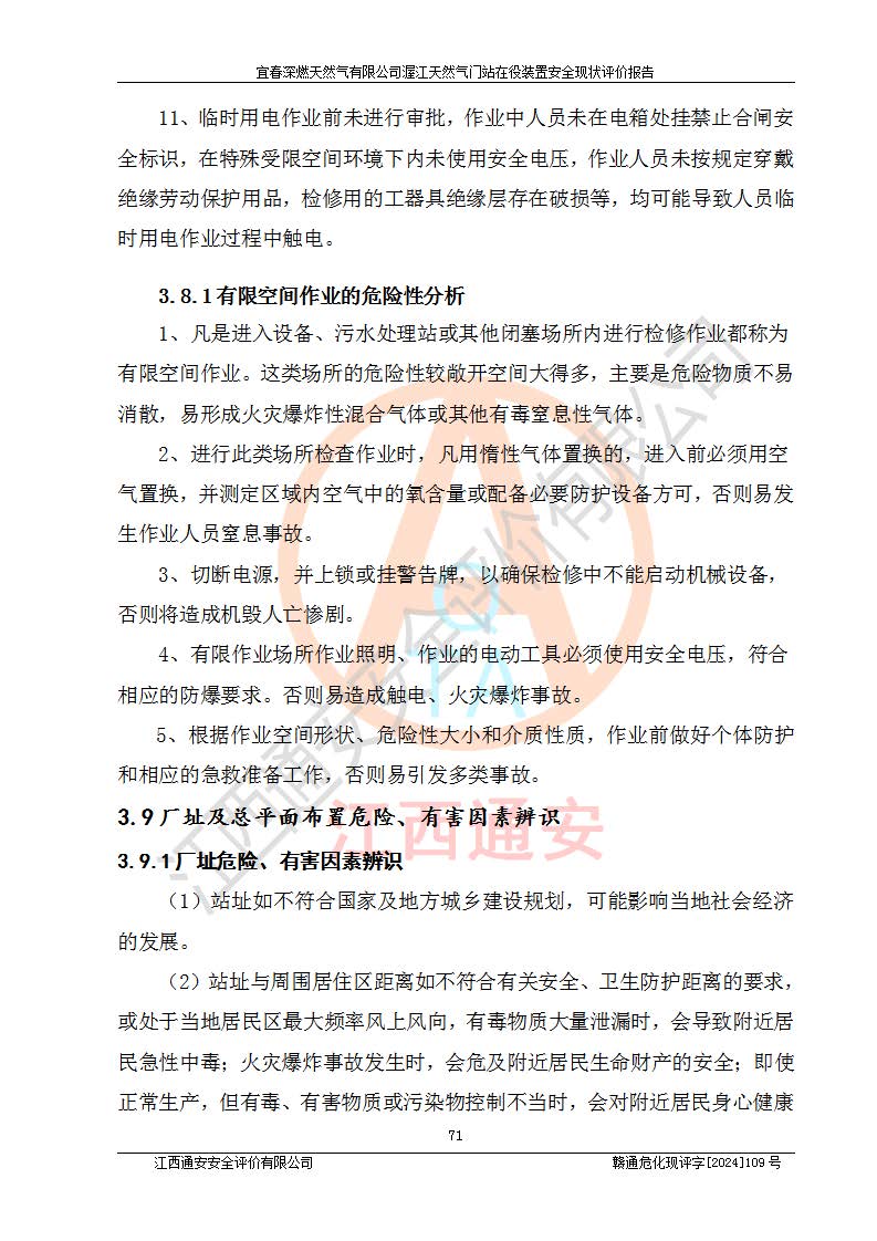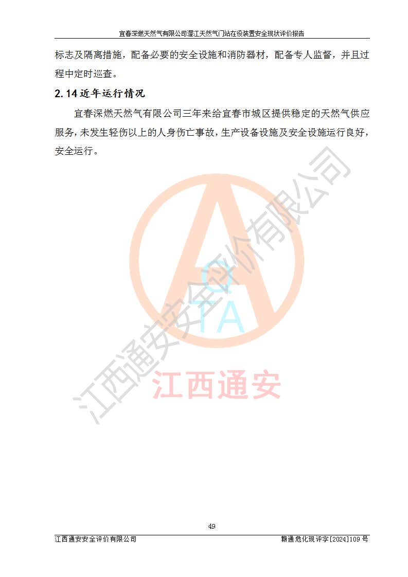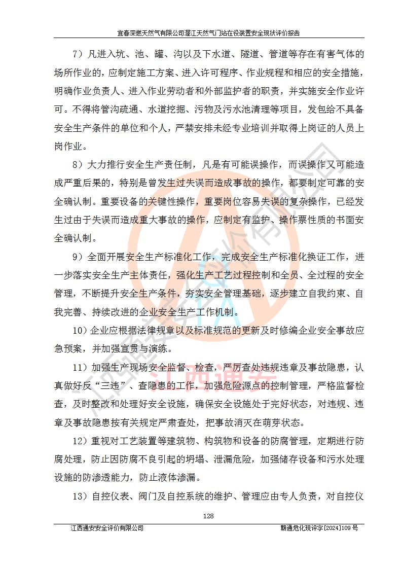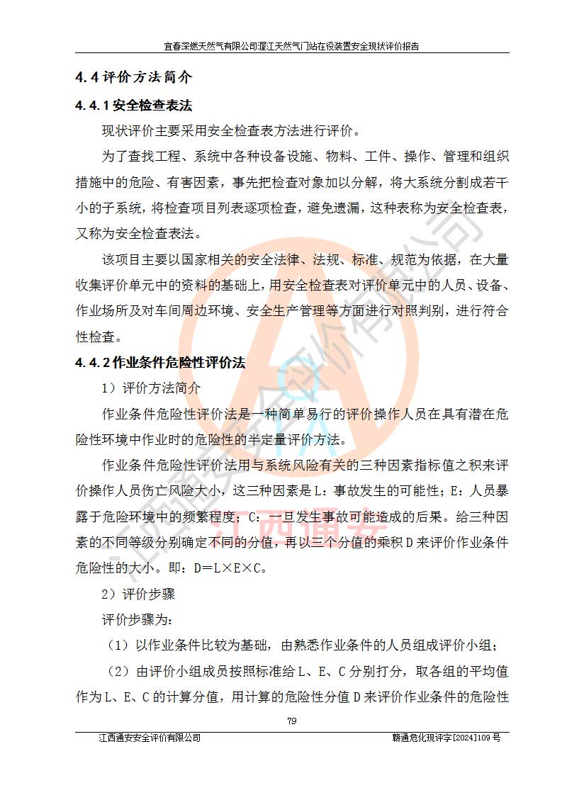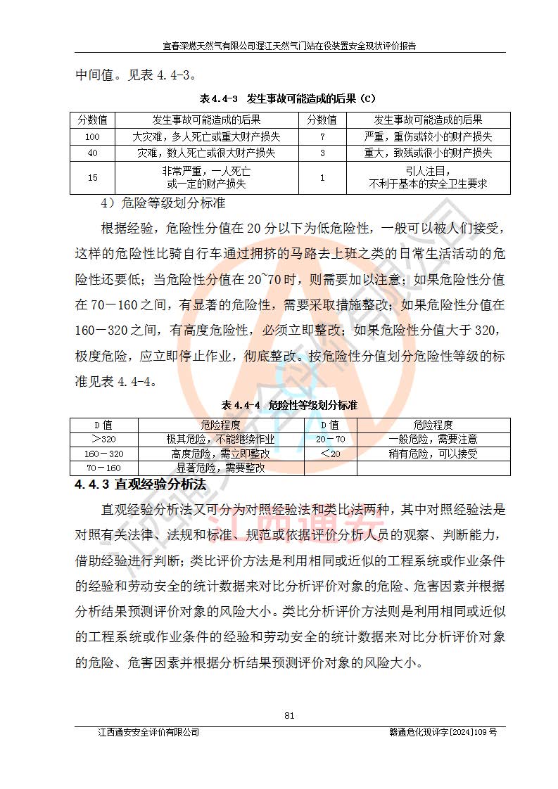 其它 | 1、依據(jù)相關(guān)法律、法規(guī)、標準等的規(guī)定,該項目周邊環(huán)境、總平面布置、建筑結(jié)構(gòu)、工藝及設(shè)備、防火防爆安全設(shè)施、有毒有害因素控制等符合**相關(guān)標準規(guī)范的要求,能滿足安全生產(chǎn)的要求。 2、該項目涉及的危險化學(xué)品有:天然氣、四氫噻吩、柴油,其中天然氣屬于重點監(jiān)管的危險化學(xué)品,不涉及特別管控危險化學(xué)品。 3、該項目在生產(chǎn)過程中存在的主要危險有:火災(zāi)爆炸、中毒窒息、容器爆炸、觸電傷害、機械傷害、高處墜落、**傷害、灼燙等。其中火災(zāi)爆炸、中毒窒息、容器爆炸是*主要的危險因素。 4、該項目生產(chǎn)單元和儲存設(shè)施單元不構(gòu)成危險化學(xué)品重大危險源。 5、根據(jù)《**安全監(jiān)管總局關(guān)于公布首批重點監(jiān)管的危險化工工藝目錄的通知》(安監(jiān)總管三〔2009〕116號)和《**安全監(jiān)管總局關(guān)于公布第二批重點監(jiān)管危險化工工藝目錄和調(diào)整首批重點監(jiān)管危險化工工藝中部分典型工藝的通知》(安監(jiān)總管三〔2013〕3號)進行危險工藝辨識:該項目不涉及重點監(jiān)管的危險化工工藝。 6、作業(yè)條件危險性分析評價結(jié)果:該項目的作業(yè)條件相對比較安全。在選定的2個單元中13個小項目里,可能出現(xiàn)“顯著危險”有1個項目,且顯著危險項目的出現(xiàn)均由物料的危險程度所決定,而“一般危險”有8個項目,其余項目均在“稍有危險”范圍,作業(yè)條件相對安全。 7、危險度評價結(jié)果:項目工藝裝置區(qū)場所危險度屬Ⅱ級,中度危險級別。 企業(yè)應(yīng)加強日常管理工作,防范于未然。生產(chǎn)區(qū)域內(nèi)應(yīng)嚴禁煙火,設(shè)置的泄漏檢測報警裝置應(yīng)定期進行校驗或檢定**其正常工作。不得私自關(guān)閉設(shè)置的可燃氣體檢測報警系統(tǒng)。并且應(yīng)在各作業(yè)場所為作業(yè)人員配置了勞動保護用品和器具,盡可能降低安全風(fēng)險。 評價結(jié)論:本報告認為,宜春深燃天然氣有限公司渥江天然氣門站在役裝置現(xiàn)場自動化控制系統(tǒng)運行正常,有關(guān)從業(yè)人員資質(zhì)符合《城鎮(zhèn)燃氣管理條例》(2010年11月19日中華人民共和國***令第583號公布 根據(jù)2016年2月6日《***關(guān)于修改部分行政法規(guī)的決定》修訂)及《江西省燃氣管理辦法》(2003年8月31日江西省人民**令**23號公布 2014年1月30日江西省人民**令第210號**次修正 2019年11月27日江西省人民**令第242號第二次修正)要求,安全設(shè)施及安全管理符合**及有關(guān)部門關(guān)于安全生產(chǎn)法律、法規(guī)、標準的要求,安全風(fēng)險是可以控制的,其風(fēng)險程度是可以接受的,安全現(xiàn)狀符合安全生產(chǎn)條件,能夠滿足安全生產(chǎn)的要求。