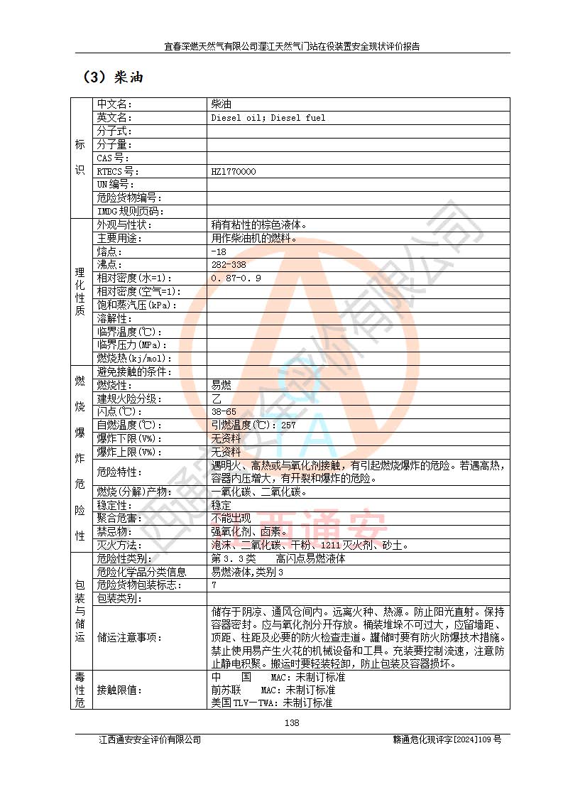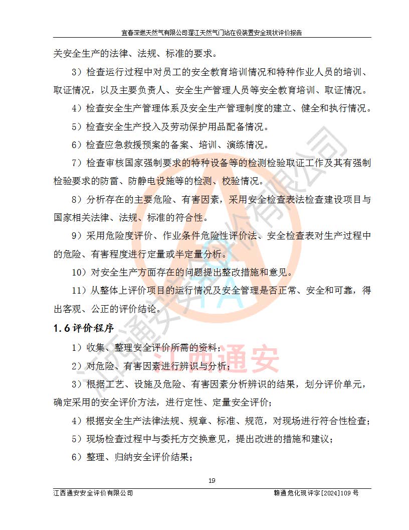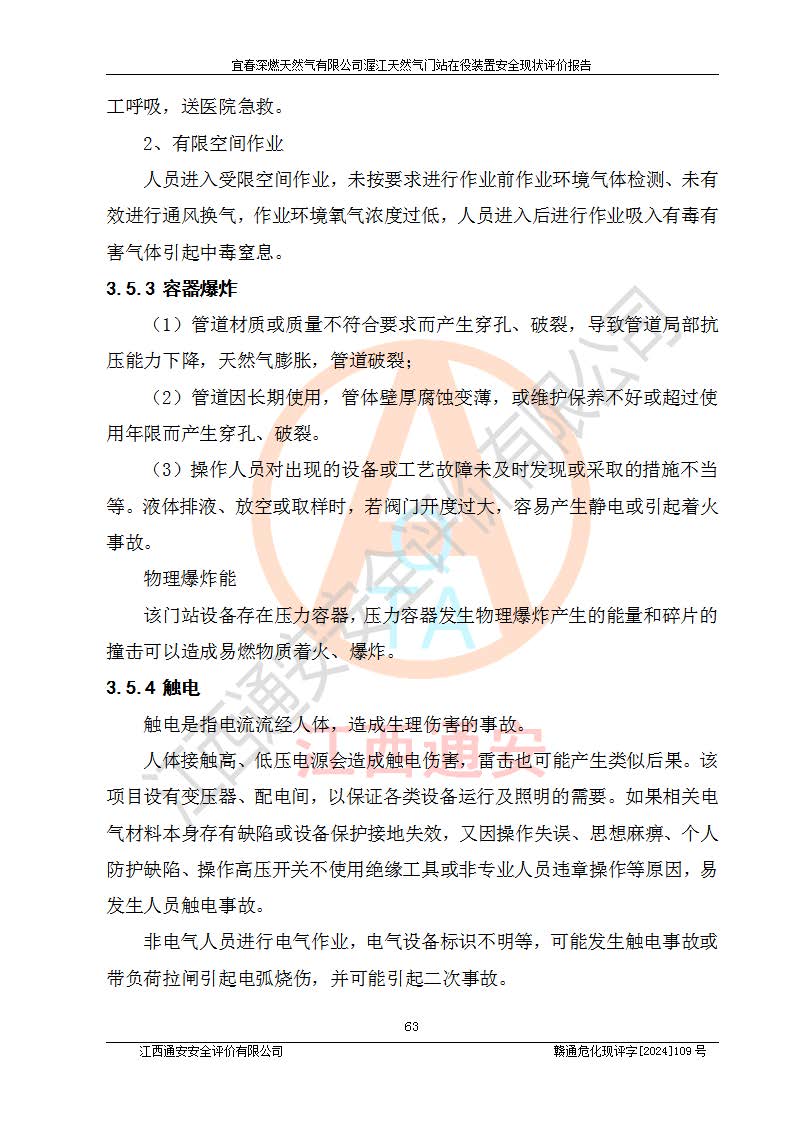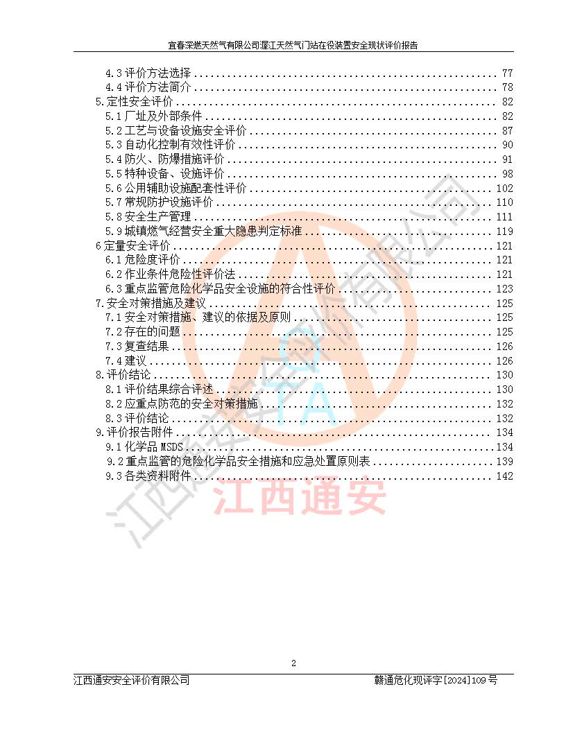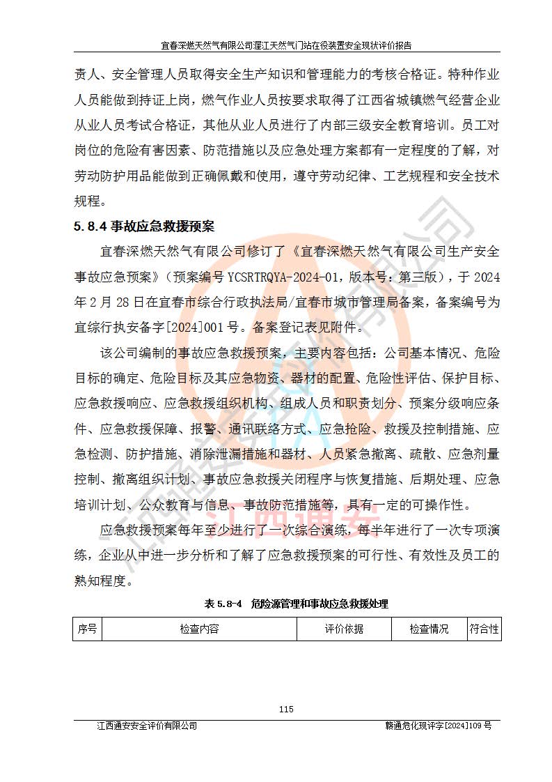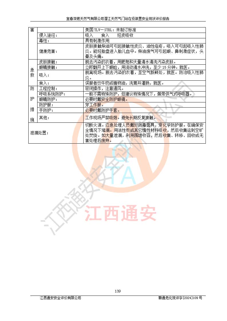 其它 | 1、依據(jù)相關(guān)法律、法規(guī)、標準等的規(guī)定,該項目周邊環(huán)境、總平面布置、建筑結(jié)構(gòu)、工藝及設(shè)備、防火防爆安全設(shè)施、有毒有害因素控制等符合**相關(guān)標準規(guī)范的要求,能滿足安全生產(chǎn)的要求。 2、該項目涉及的危險化學(xué)品有:天然氣、四氫噻吩、柴油,其中天然氣屬于重點監(jiān)管的危險化學(xué)品,不涉及特別管控危險化學(xué)品。 3、該項目在生產(chǎn)過程中存在的主要危險有:火災(zāi)爆炸、中毒窒息、容器爆炸、觸電傷害、機械傷害、高處墜落、**傷害、灼燙等。其中火災(zāi)爆炸、中毒窒息、容器爆炸是*主要的危險因素。 4、該項目生產(chǎn)單元和儲存設(shè)施單元不構(gòu)成危險化學(xué)品重大危險源。 5、根據(jù)《**安全監(jiān)管總局關(guān)于公布首批重點監(jiān)管的危險化工工藝目錄的通知》(安監(jiān)總管三〔2009〕116號)和《**安全監(jiān)管總局關(guān)于公布第二批重點監(jiān)管危險化工工藝目錄和調(diào)整首批重點監(jiān)管危險化工工藝中部分典型工藝的通知》(安監(jiān)總管三〔2013〕3號)進行危險工藝辨識:該項目不涉及重點監(jiān)管的危險化工工藝。 6、作業(yè)條件危險性分析評價結(jié)果:該項目的作業(yè)條件相對比較安全。在選定的2個單元中13個小項目里,可能出現(xiàn)“顯著危險”有1個項目,且顯著危險項目的出現(xiàn)均由物料的危險程度所決定,而“一般危險”有8個項目,其余項目均在“稍有危險”范圍,作業(yè)條件相對安全。 7、危險度評價結(jié)果:項目工藝裝置區(qū)場所危險度屬Ⅱ級,中度危險級別。 企業(yè)應(yīng)加強日常管理工作,防范于未然。生產(chǎn)區(qū)域內(nèi)應(yīng)嚴禁煙火,設(shè)置的泄漏檢測報警裝置應(yīng)定期進行校驗或檢定**其正常工作。不得私自關(guān)閉設(shè)置的可燃氣體檢測報警系統(tǒng)。并且應(yīng)在各作業(yè)場所為作業(yè)人員配置了勞動保護用品和器具,盡可能降低安全風(fēng)險。 評價結(jié)論:本報告認為,宜春深燃天然氣有限公司渥江天然氣門站在役裝置現(xiàn)場自動化控制系統(tǒng)運行正常,有關(guān)從業(yè)人員資質(zhì)符合《城鎮(zhèn)燃氣管理條例》(2010年11月19日中華人民共和國***令第583號公布 根據(jù)2016年2月6日《***關(guān)于修改部分行政法規(guī)的決定》修訂)及《江西省燃氣管理辦法》(2003年8月31日江西省人民**令**23號公布 2014年1月30日江西省人民**令第210號**次修正 2019年11月27日江西省人民**令第242號第二次修正)要求,安全設(shè)施及安全管理符合**及有關(guān)部門關(guān)于安全生產(chǎn)法律、法規(guī)、標準的要求,安全風(fēng)險是可以控制的,其風(fēng)險程度是可以接受的,安全現(xiàn)狀符合安全生產(chǎn)條件,能夠滿足安全生產(chǎn)的要求。