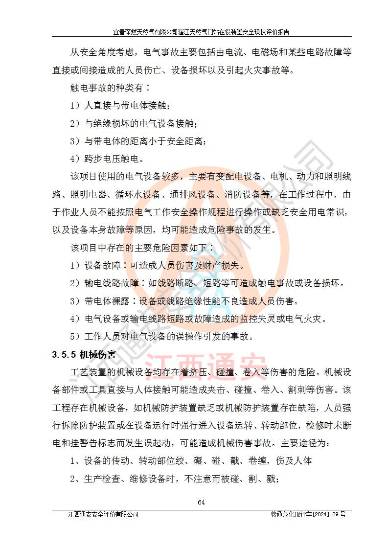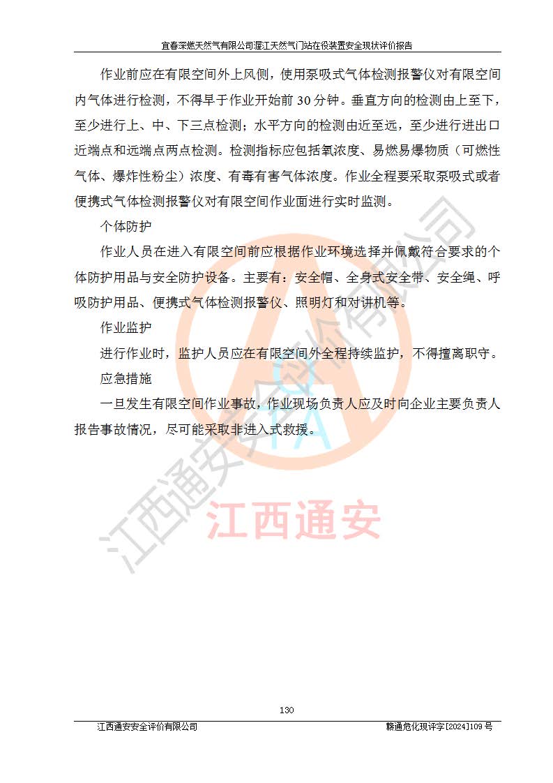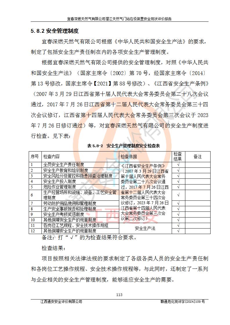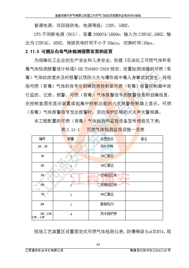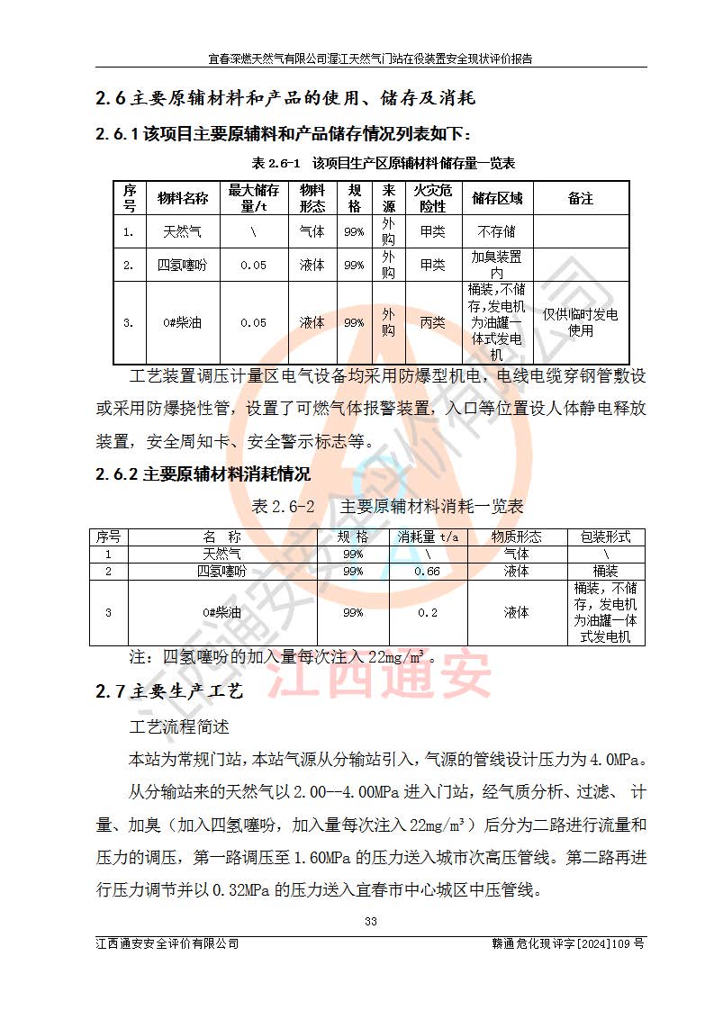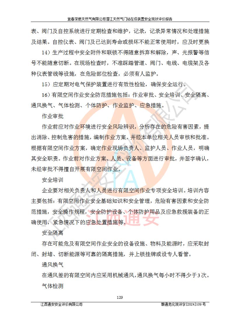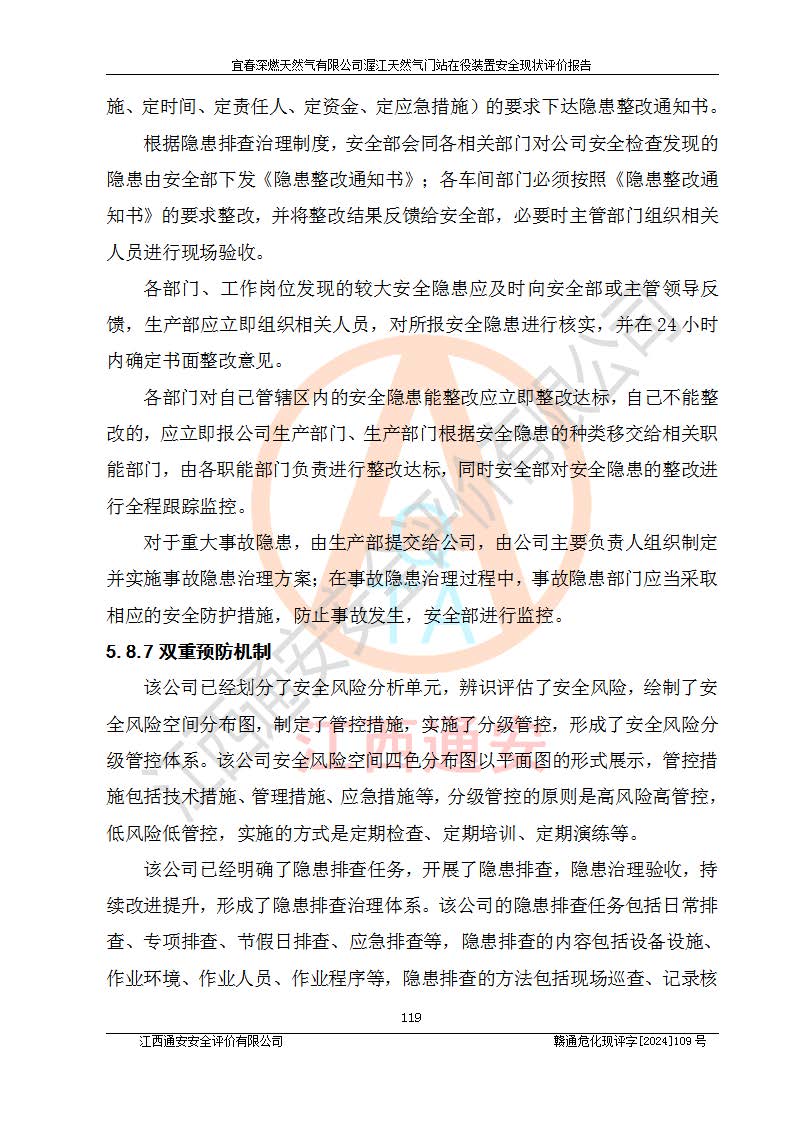 其它 | 1、依據(jù)相關(guān)法律、法規(guī)、標準等的規(guī)定,該項目周邊環(huán)境、總平面布置、建筑結(jié)構(gòu)、工藝及設(shè)備、防火防爆安全設(shè)施、有毒有害因素控制等符合**相關(guān)標準規(guī)范的要求,能滿足安全生產(chǎn)的要求。 2、該項目涉及的危險化學(xué)品有:天然氣、四氫噻吩、柴油,其中天然氣屬于重點監(jiān)管的危險化學(xué)品,不涉及特別管控危險化學(xué)品。 3、該項目在生產(chǎn)過程中存在的主要危險有:火災(zāi)爆炸、中毒窒息、容器爆炸、觸電傷害、機械傷害、高處墜落、**傷害、灼燙等。其中火災(zāi)爆炸、中毒窒息、容器爆炸是*主要的危險因素。 4、該項目生產(chǎn)單元和儲存設(shè)施單元不構(gòu)成危險化學(xué)品重大危險源。 5、根據(jù)《**安全監(jiān)管總局關(guān)于公布首批重點監(jiān)管的危險化工工藝目錄的通知》(安監(jiān)總管三〔2009〕116號)和《**安全監(jiān)管總局關(guān)于公布第二批重點監(jiān)管危險化工工藝目錄和調(diào)整首批重點監(jiān)管危險化工工藝中部分典型工藝的通知》(安監(jiān)總管三〔2013〕3號)進行危險工藝辨識:該項目不涉及重點監(jiān)管的危險化工工藝。 6、作業(yè)條件危險性分析評價結(jié)果:該項目的作業(yè)條件相對比較安全。在選定的2個單元中13個小項目里,可能出現(xiàn)“顯著危險”有1個項目,且顯著危險項目的出現(xiàn)均由物料的危險程度所決定,而“一般危險”有8個項目,其余項目均在“稍有危險”范圍,作業(yè)條件相對安全。 7、危險度評價結(jié)果:項目工藝裝置區(qū)場所危險度屬Ⅱ級,中度危險級別。 企業(yè)應(yīng)加強日常管理工作,防范于未然。生產(chǎn)區(qū)域內(nèi)應(yīng)嚴禁煙火,設(shè)置的泄漏檢測報警裝置應(yīng)定期進行校驗或檢定**其正常工作。不得私自關(guān)閉設(shè)置的可燃氣體檢測報警系統(tǒng)。并且應(yīng)在各作業(yè)場所為作業(yè)人員配置了勞動保護用品和器具,盡可能降低安全風(fēng)險。 評價結(jié)論:本報告認為,宜春深燃天然氣有限公司渥江天然氣門站在役裝置現(xiàn)場自動化控制系統(tǒng)運行正常,有關(guān)從業(yè)人員資質(zhì)符合《城鎮(zhèn)燃氣管理條例》(2010年11月19日中華人民共和國***令第583號公布 根據(jù)2016年2月6日《***關(guān)于修改部分行政法規(guī)的決定》修訂)及《江西省燃氣管理辦法》(2003年8月31日江西省人民**令**23號公布 2014年1月30日江西省人民**令第210號**次修正 2019年11月27日江西省人民**令第242號第二次修正)要求,安全設(shè)施及安全管理符合**及有關(guān)部門關(guān)于安全生產(chǎn)法律、法規(guī)、標準的要求,安全風(fēng)險是可以控制的,其風(fēng)險程度是可以接受的,安全現(xiàn)狀符合安全生產(chǎn)條件,能夠滿足安全生產(chǎn)的要求。
