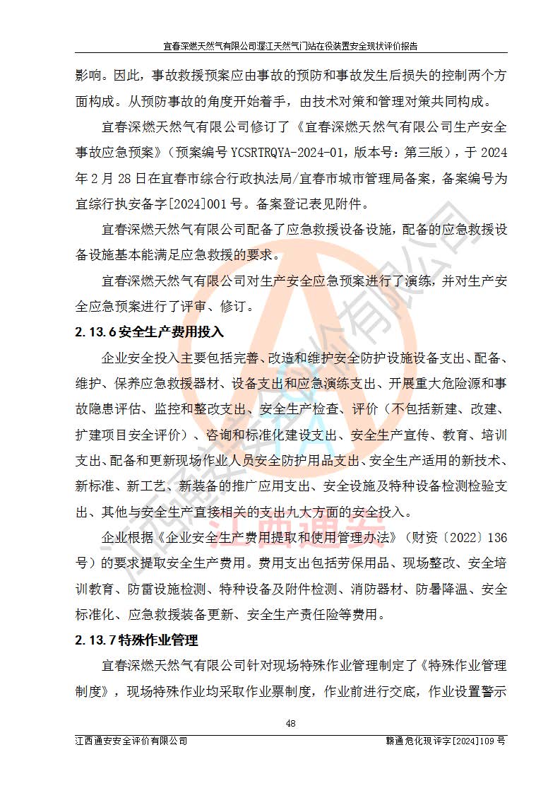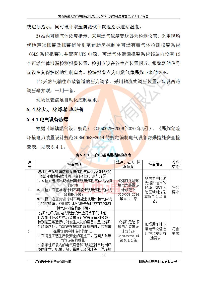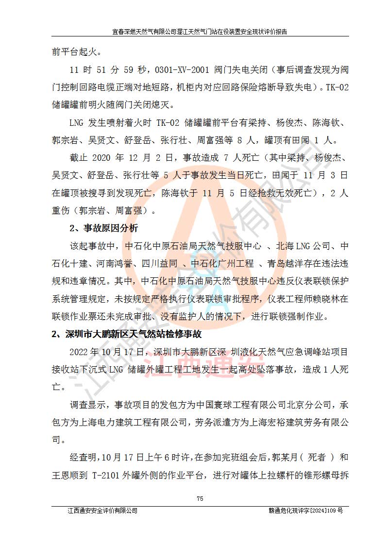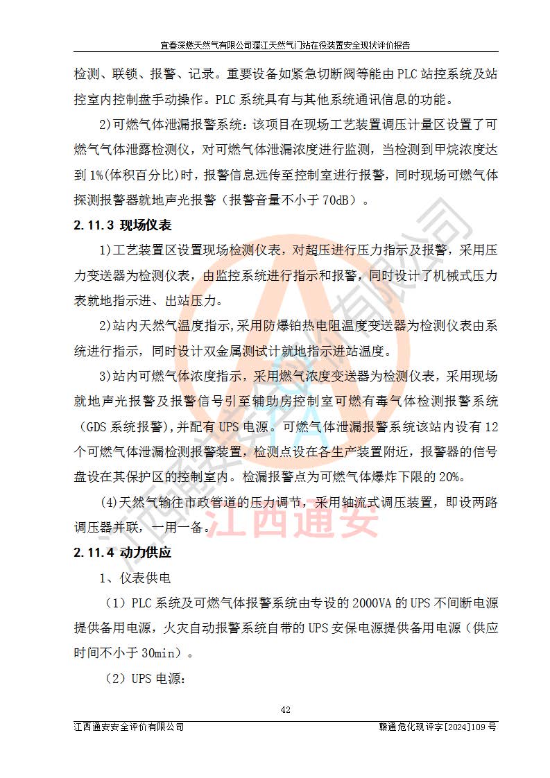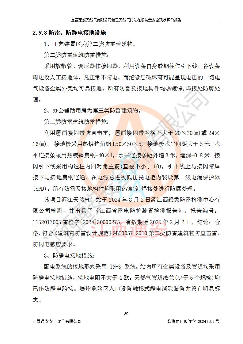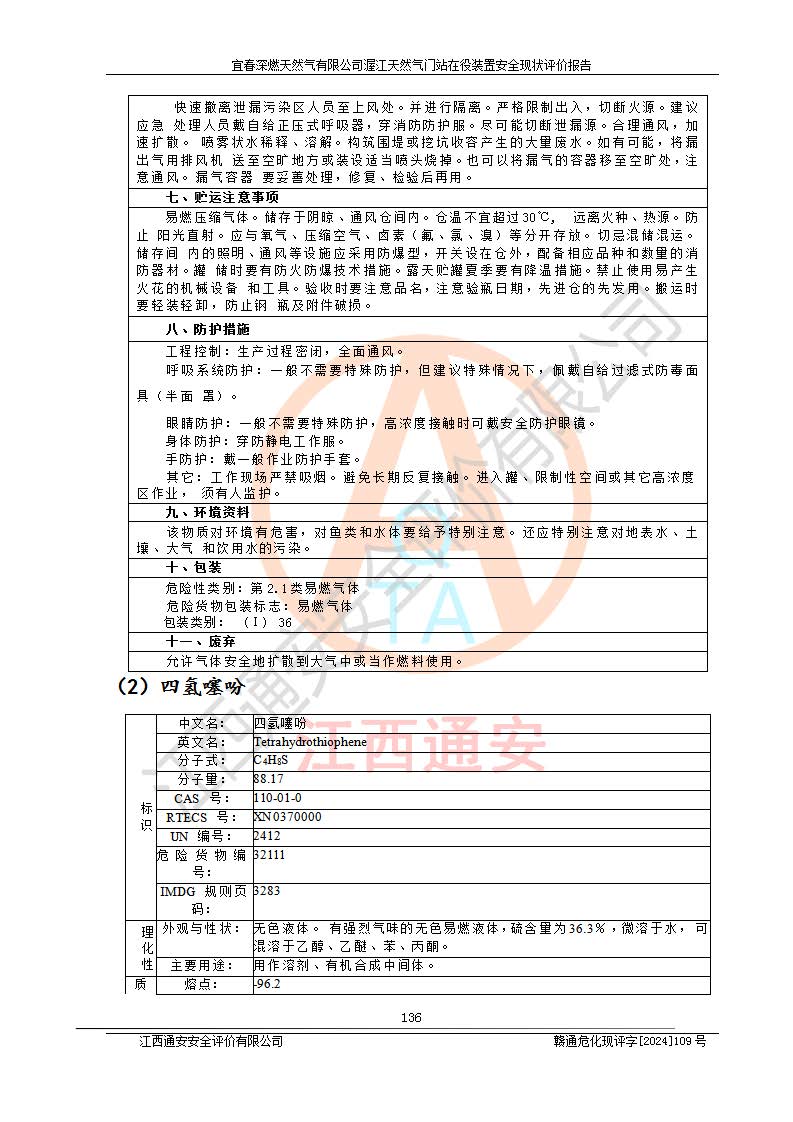 其它 | 1、依據(jù)相關(guān)法律、法規(guī)、標準等的規(guī)定,該項目周邊環(huán)境、總平面布置、建筑結(jié)構(gòu)、工藝及設(shè)備、防火防爆安全設(shè)施、有毒有害因素控制等符合**相關(guān)標準規(guī)范的要求,能滿足安全生產(chǎn)的要求。 2、該項目涉及的危險化學(xué)品有:天然氣、四氫噻吩、柴油,其中天然氣屬于重點監(jiān)管的危險化學(xué)品,不涉及特別管控危險化學(xué)品。 3、該項目在生產(chǎn)過程中存在的主要危險有:火災(zāi)爆炸、中毒窒息、容器爆炸、觸電傷害、機械傷害、高處墜落、**傷害、灼燙等。其中火災(zāi)爆炸、中毒窒息、容器爆炸是*主要的危險因素。 4、該項目生產(chǎn)單元和儲存設(shè)施單元不構(gòu)成危險化學(xué)品重大危險源。 5、根據(jù)《**安全監(jiān)管總局關(guān)于公布首批重點監(jiān)管的危險化工工藝目錄的通知》(安監(jiān)總管三〔2009〕116號)和《**安全監(jiān)管總局關(guān)于公布第二批重點監(jiān)管危險化工工藝目錄和調(diào)整首批重點監(jiān)管危險化工工藝中部分典型工藝的通知》(安監(jiān)總管三〔2013〕3號)進行危險工藝辨識:該項目不涉及重點監(jiān)管的危險化工工藝。 6、作業(yè)條件危險性分析評價結(jié)果:該項目的作業(yè)條件相對比較安全。在選定的2個單元中13個小項目里,可能出現(xiàn)“顯著危險”有1個項目,且顯著危險項目的出現(xiàn)均由物料的危險程度所決定,而“一般危險”有8個項目,其余項目均在“稍有危險”范圍,作業(yè)條件相對安全。 7、危險度評價結(jié)果:項目工藝裝置區(qū)場所危險度屬Ⅱ級,中度危險級別。 企業(yè)應(yīng)加強日常管理工作,防范于未然。生產(chǎn)區(qū)域內(nèi)應(yīng)嚴禁煙火,設(shè)置的泄漏檢測報警裝置應(yīng)定期進行校驗或檢定**其正常工作。不得私自關(guān)閉設(shè)置的可燃氣體檢測報警系統(tǒng)。并且應(yīng)在各作業(yè)場所為作業(yè)人員配置了勞動保護用品和器具,盡可能降低安全風(fēng)險。 評價結(jié)論:本報告認為,宜春深燃天然氣有限公司渥江天然氣門站在役裝置現(xiàn)場自動化控制系統(tǒng)運行正常,有關(guān)從業(yè)人員資質(zhì)符合《城鎮(zhèn)燃氣管理條例》(2010年11月19日中華人民共和國***令第583號公布 根據(jù)2016年2月6日《***關(guān)于修改部分行政法規(guī)的決定》修訂)及《江西省燃氣管理辦法》(2003年8月31日江西省人民**令**23號公布 2014年1月30日江西省人民**令第210號**次修正 2019年11月27日江西省人民**令第242號第二次修正)要求,安全設(shè)施及安全管理符合**及有關(guān)部門關(guān)于安全生產(chǎn)法律、法規(guī)、標準的要求,安全風(fēng)險是可以控制的,其風(fēng)險程度是可以接受的,安全現(xiàn)狀符合安全生產(chǎn)條件,能夠滿足安全生產(chǎn)的要求。