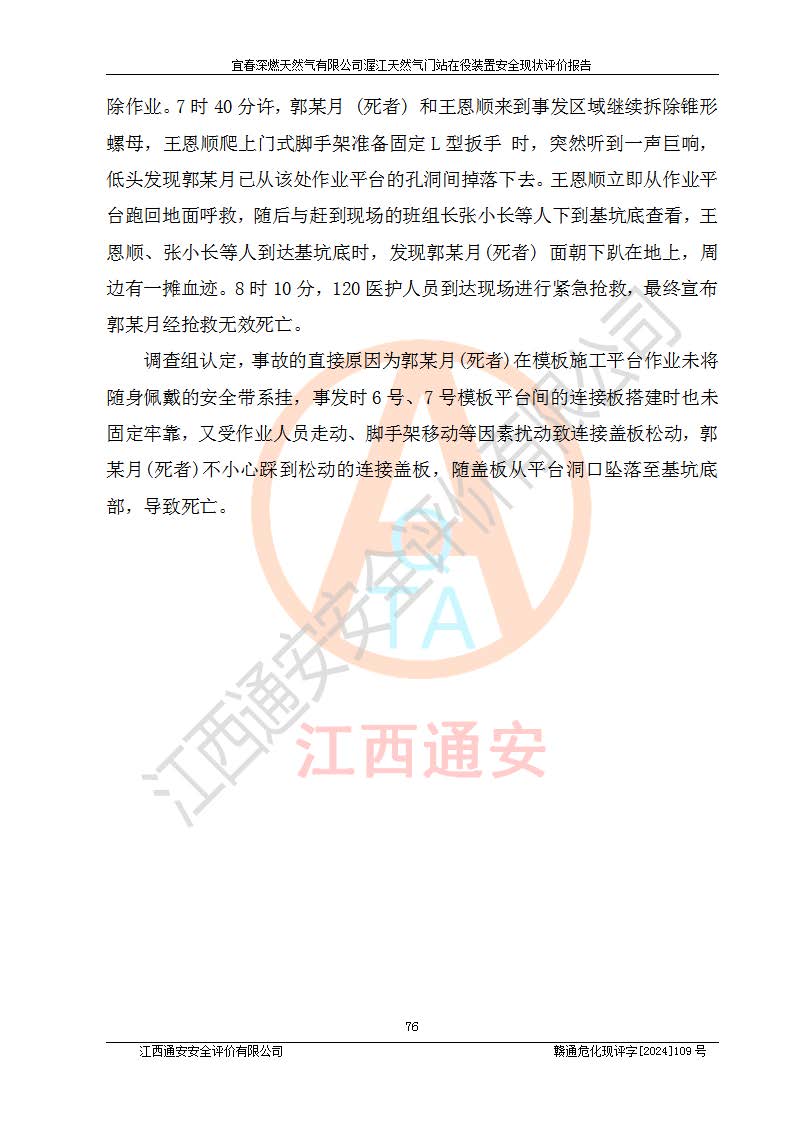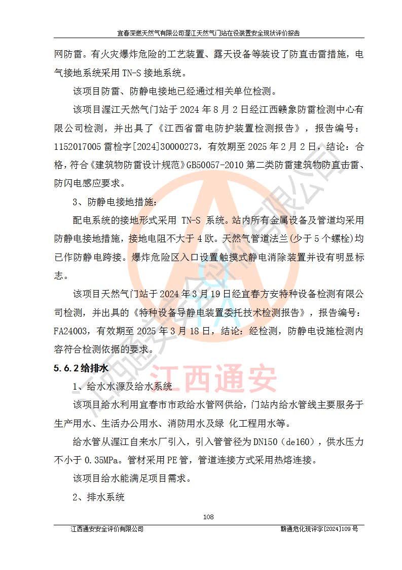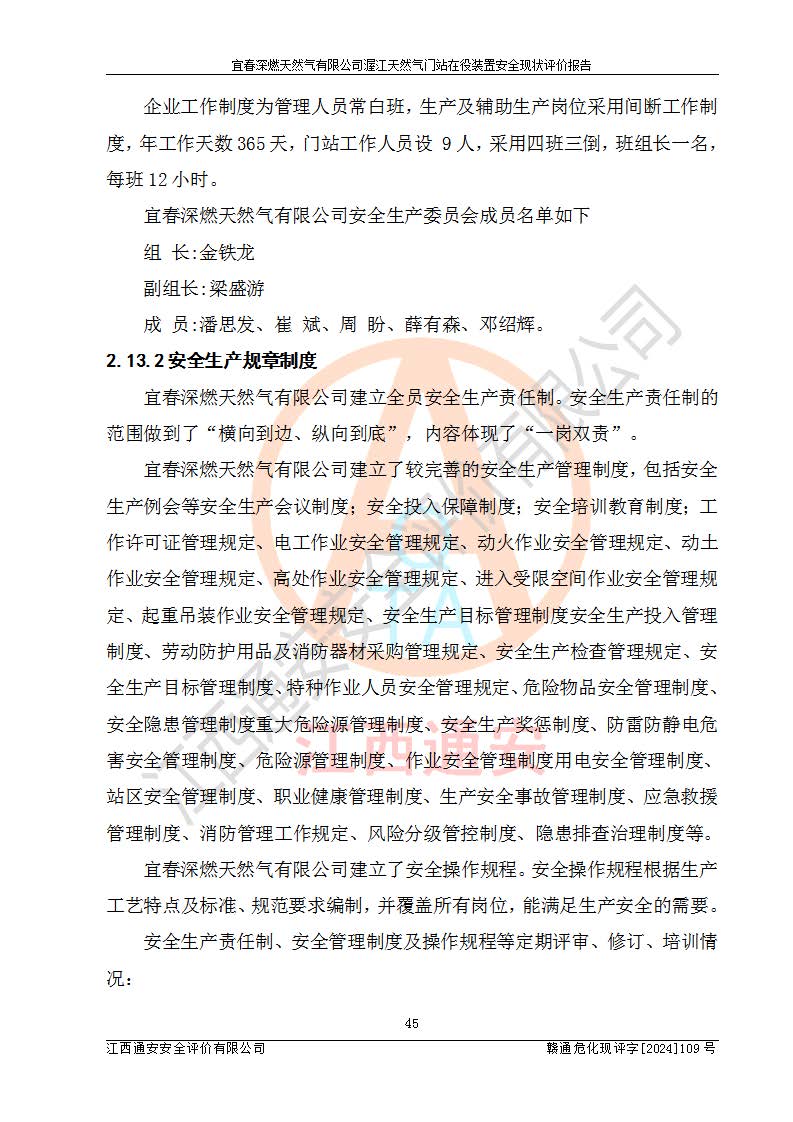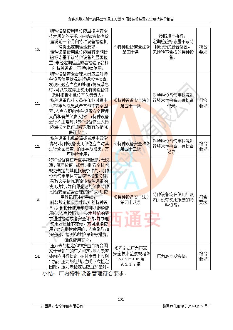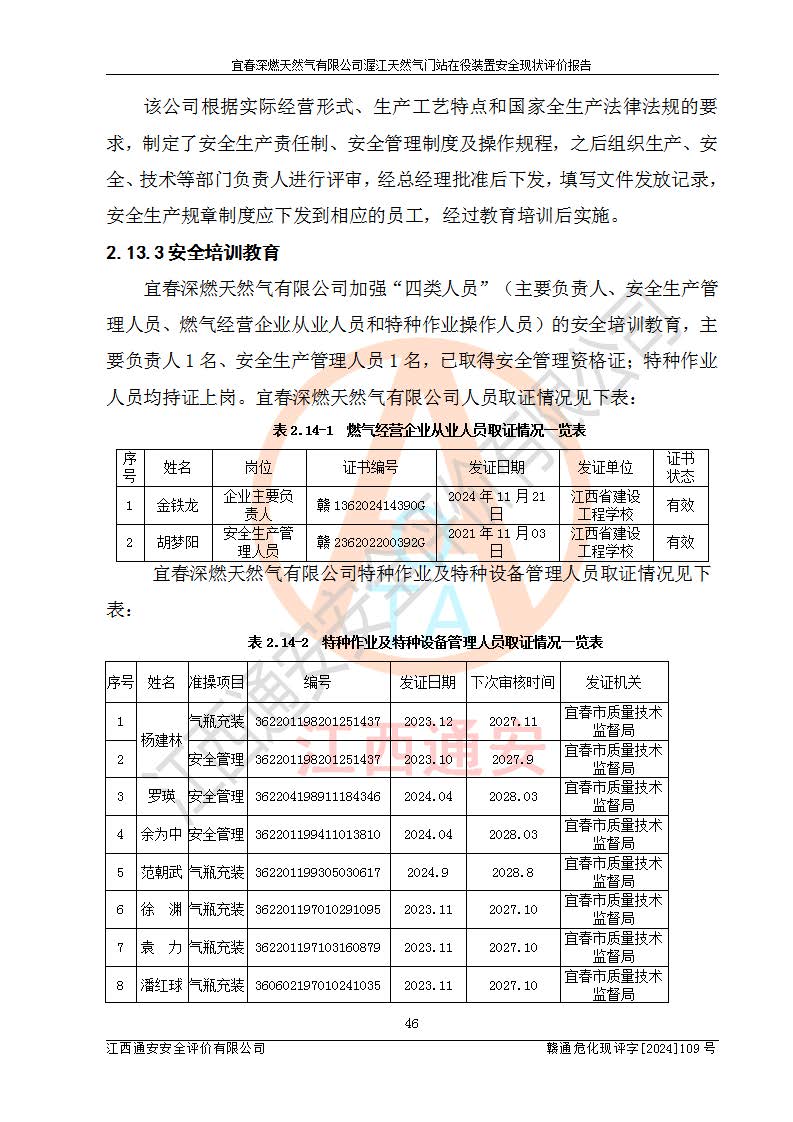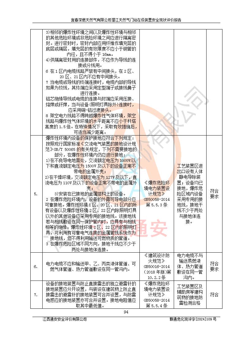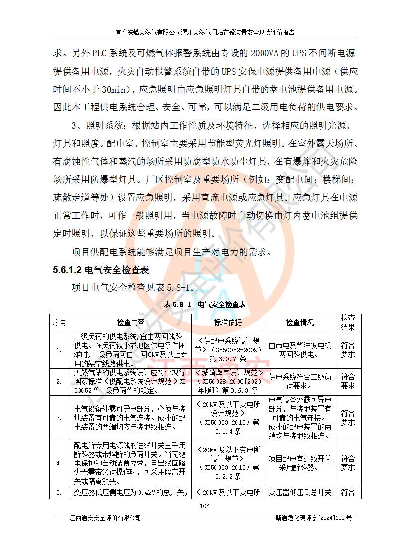 其它 | 1、依據(jù)相關(guān)法律、法規(guī)、標準等的規(guī)定,該項目周邊環(huán)境、總平面布置、建筑結(jié)構(gòu)、工藝及設(shè)備、防火防爆安全設(shè)施、有毒有害因素控制等符合**相關(guān)標準規(guī)范的要求,能滿足安全生產(chǎn)的要求。 2、該項目涉及的危險化學(xué)品有:天然氣、四氫噻吩、柴油,其中天然氣屬于重點監(jiān)管的危險化學(xué)品,不涉及特別管控危險化學(xué)品。 3、該項目在生產(chǎn)過程中存在的主要危險有:火災(zāi)爆炸、中毒窒息、容器爆炸、觸電傷害、機械傷害、高處墜落、**傷害、灼燙等。其中火災(zāi)爆炸、中毒窒息、容器爆炸是*主要的危險因素。 4、該項目生產(chǎn)單元和儲存設(shè)施單元不構(gòu)成危險化學(xué)品重大危險源。 5、根據(jù)《**安全監(jiān)管總局關(guān)于公布首批重點監(jiān)管的危險化工工藝目錄的通知》(安監(jiān)總管三〔2009〕116號)和《**安全監(jiān)管總局關(guān)于公布第二批重點監(jiān)管危險化工工藝目錄和調(diào)整首批重點監(jiān)管危險化工工藝中部分典型工藝的通知》(安監(jiān)總管三〔2013〕3號)進行危險工藝辨識:該項目不涉及重點監(jiān)管的危險化工工藝。 6、作業(yè)條件危險性分析評價結(jié)果:該項目的作業(yè)條件相對比較安全。在選定的2個單元中13個小項目里,可能出現(xiàn)“顯著危險”有1個項目,且顯著危險項目的出現(xiàn)均由物料的危險程度所決定,而“一般危險”有8個項目,其余項目均在“稍有危險”范圍,作業(yè)條件相對安全。 7、危險度評價結(jié)果:項目工藝裝置區(qū)場所危險度屬Ⅱ級,中度危險級別。 企業(yè)應(yīng)加強日常管理工作,防范于未然。生產(chǎn)區(qū)域內(nèi)應(yīng)嚴禁煙火,設(shè)置的泄漏檢測報警裝置應(yīng)定期進行校驗或檢定**其正常工作。不得私自關(guān)閉設(shè)置的可燃氣體檢測報警系統(tǒng)。并且應(yīng)在各作業(yè)場所為作業(yè)人員配置了勞動保護用品和器具,盡可能降低安全風(fēng)險。 評價結(jié)論:本報告認為,宜春深燃天然氣有限公司渥江天然氣門站在役裝置現(xiàn)場自動化控制系統(tǒng)運行正常,有關(guān)從業(yè)人員資質(zhì)符合《城鎮(zhèn)燃氣管理條例》(2010年11月19日中華人民共和國***令第583號公布 根據(jù)2016年2月6日《***關(guān)于修改部分行政法規(guī)的決定》修訂)及《江西省燃氣管理辦法》(2003年8月31日江西省人民**令**23號公布 2014年1月30日江西省人民**令第210號**次修正 2019年11月27日江西省人民**令第242號第二次修正)要求,安全設(shè)施及安全管理符合**及有關(guān)部門關(guān)于安全生產(chǎn)法律、法規(guī)、標準的要求,安全風(fēng)險是可以控制的,其風(fēng)險程度是可以接受的,安全現(xiàn)狀符合安全生產(chǎn)條件,能夠滿足安全生產(chǎn)的要求。
